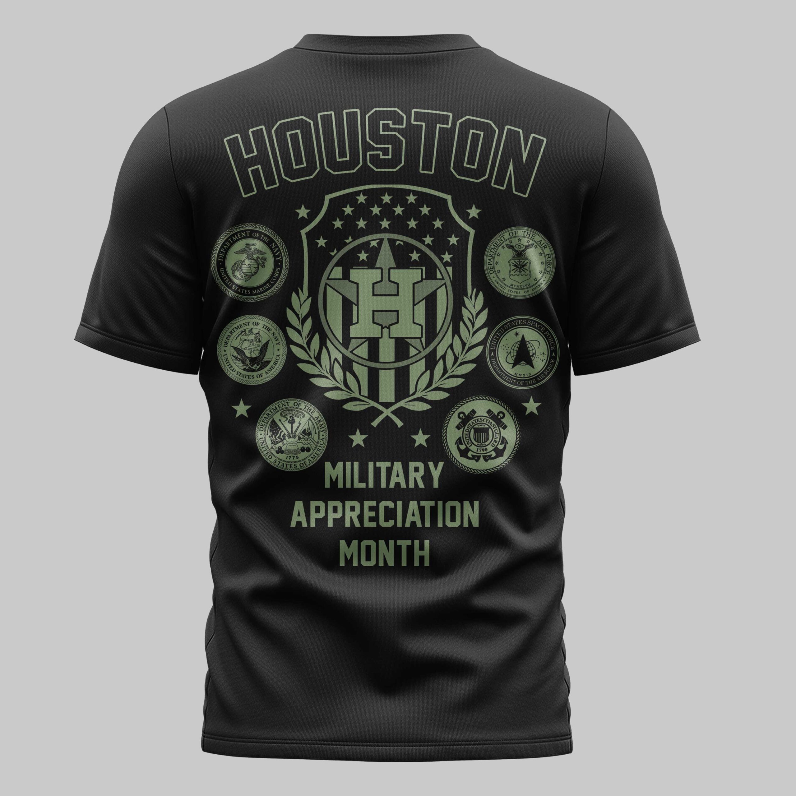 Houston Astros USA 250 Independence Baseball Fan T-Shirt Elevate your fan gear with a look that honors both the Houston Astros and the U.S. military. This striking black and olive green tee is designed for fans who carry their team spirit and patriotic pride wherever they go. It’s a powerful tribute that merges Space City baseball with deep respect for our nation’s heroes. The front showcases the legendary Astros script and iconic star logo, while the back features an impressive tactical-style display. A central shield is flanked by the official seals of the Army, Navy, Air Force, Marines, Coast Guard, and Space Force. The bold MILITARY APPRECIATION text makes your loyalties clear to everyone at the stadium. This shirt is the ultimate choice for game day at the ballpark, holiday festivities, or everyday wear. It’s a must-have for Houston fans who want to show their appreciation for the armed forces while cheering the Astros to victory.