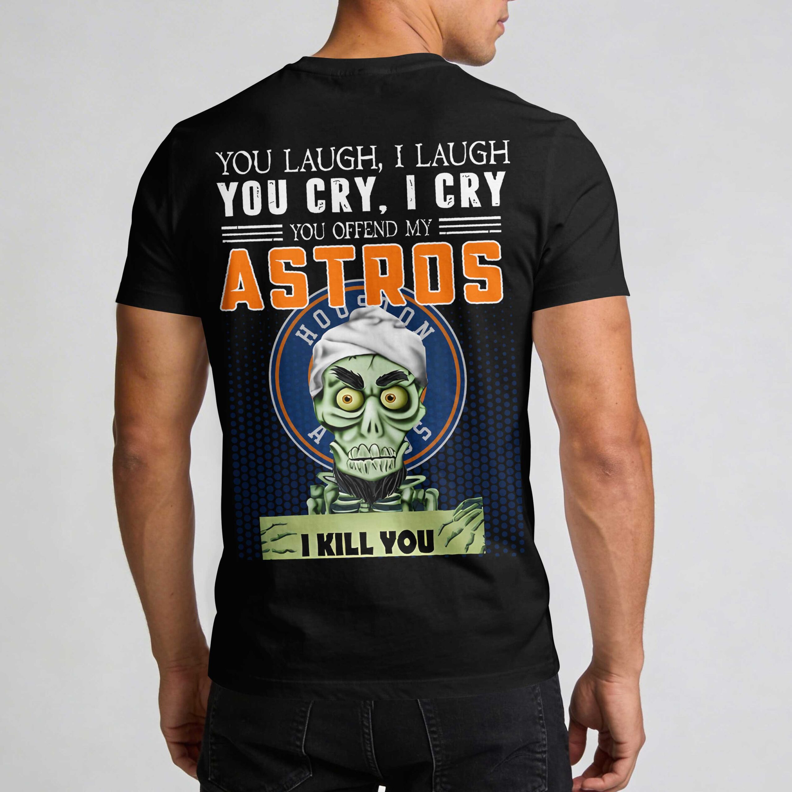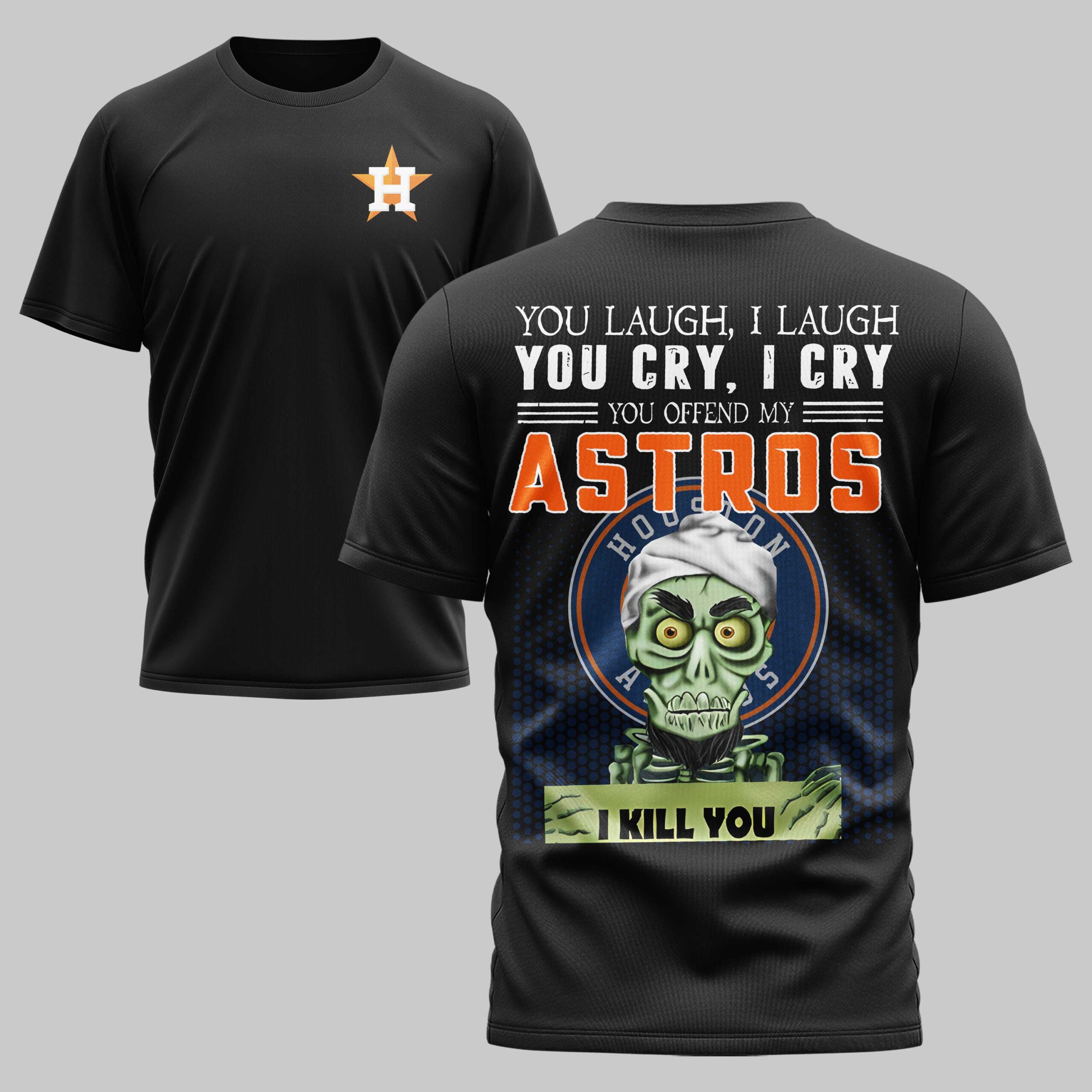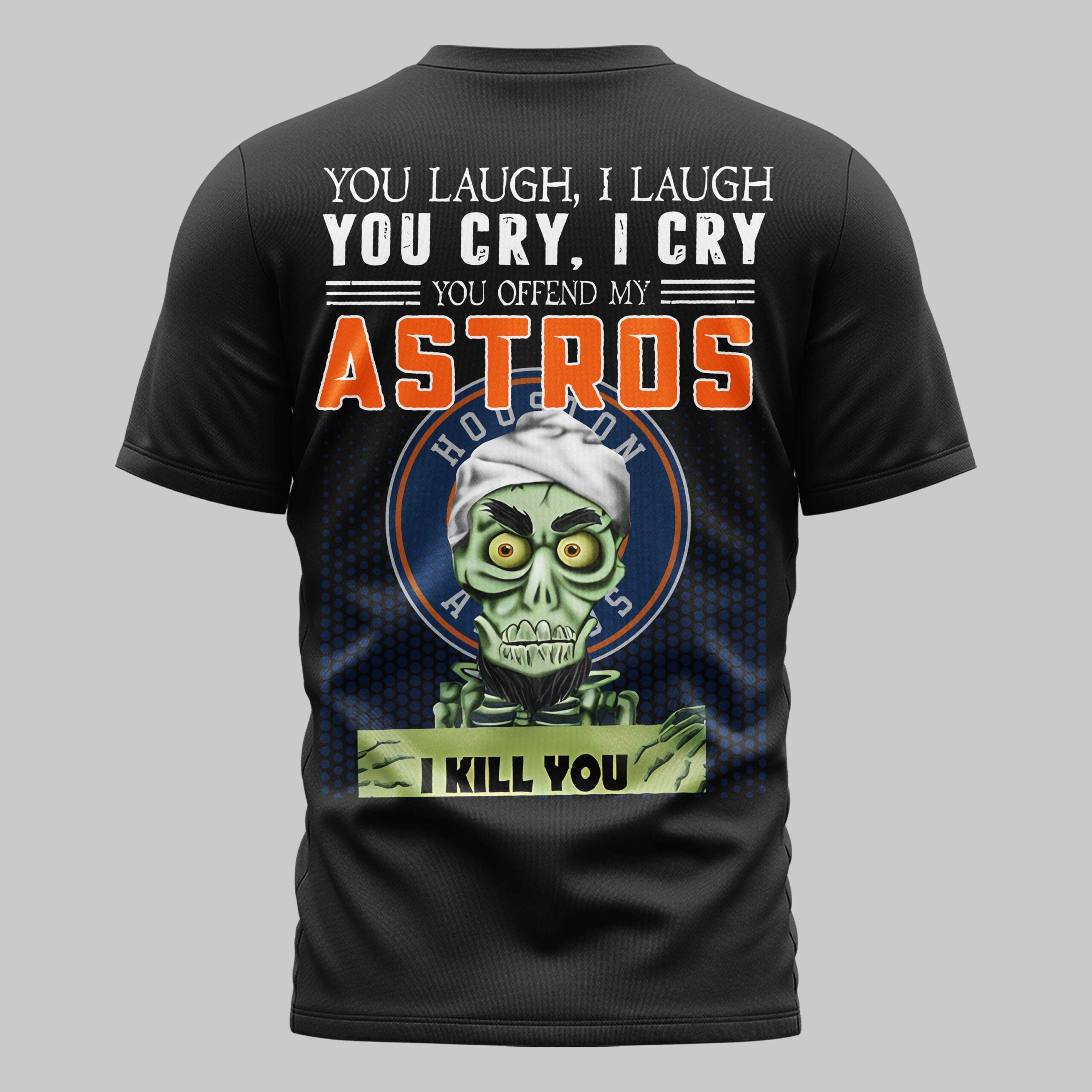 Show your unwavering support for the Houston Astros with a twist of humor! This tee is for the ultimate fan who stands by their team through every pitch, a bold declaration of loyalty and a fun statement to the competition. The front features the classic orange H star logo on the left chest. The back showcases a mischievous zombie-like character in a white bandana, with bold text above declaring, YOU LAUGH, I LAUGH, YOU CRY, I CRY, YOU OFFEND MY ASTROS, and the character holding a sign that humorously warns, I KILL YOU. Perfect for Minute Maid Park, your local sports bar, or any casual outing. This shirt will spark conversations and knowing smiles among fellow fans, making it an essential piece for cheering on Houston. Represent your team with serious, yet playful, dedication!