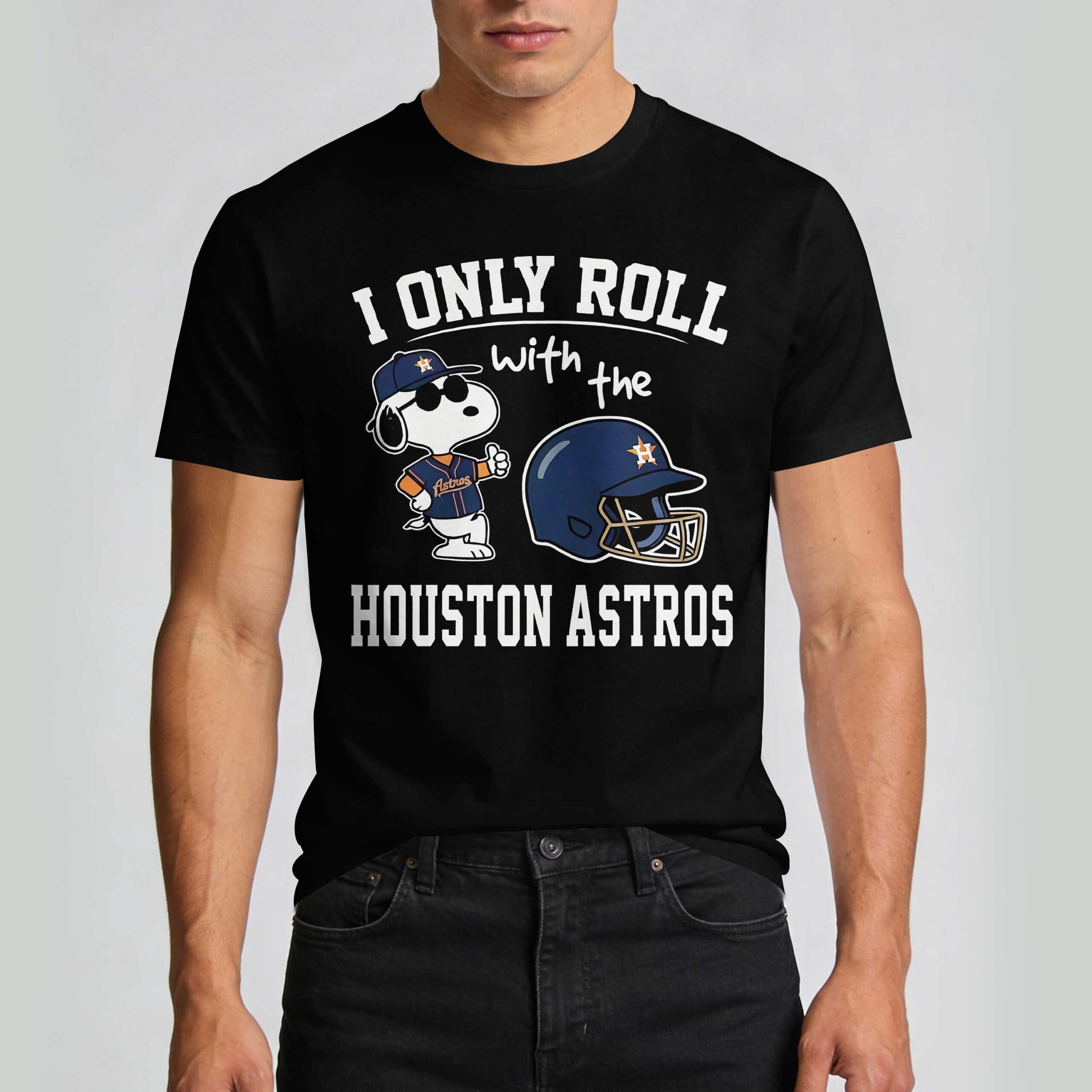 Show off your H-Town pride with a shirt that captures the fun and competitive spirit of Houston baseball. This piece is perfect for fans who want to showcase their loyalty while celebrating American traditions. It’s a standout choice for those who live and breathe every inning, offering a bold way to represent the Astros during major national holidays or any day at the ballpark. The design features the iconic Snoopy in his coolest attire, sporting a Houston jersey and cap while giving a thumbs up. Beside him, a detailed Astros batting helmet takes center stage, all framed by the confident statement: I Only Roll With The Houston Astros. The black backdrop makes the team colors and white typography pop, while the back is left blank for a clean, modern aesthetic. This shirt is ideal for game days, summer celebrations, or casual outings with fellow fans. Whether you’re cheering from the stands or enjoying an Independence Day party, it’s the ultimate gear for anyone proud to be part of the Houston fan base.