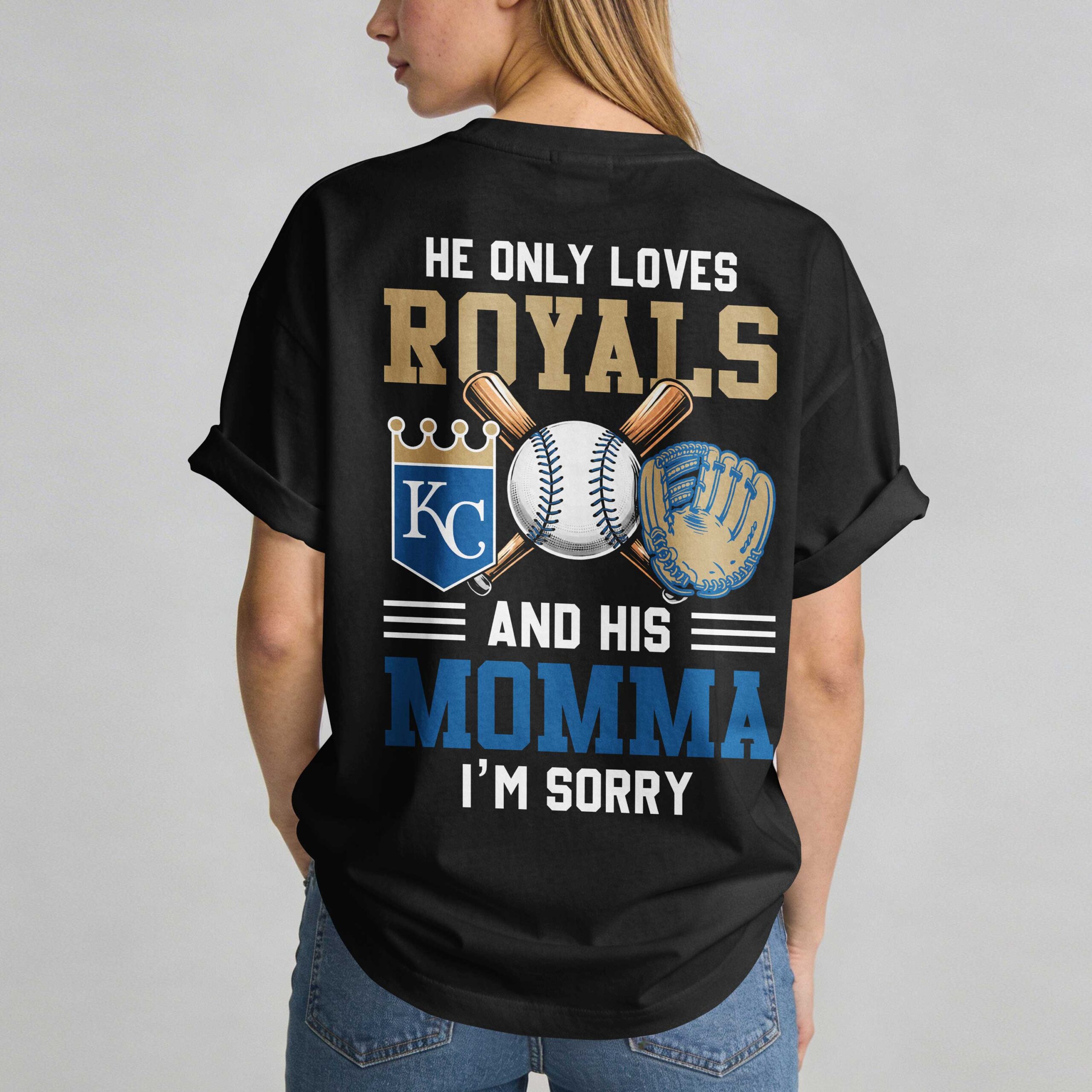 Show off your unwavering loyalty to Kansas City with a shirt that perfectly captures your priorities. This bold design celebrates the crown of the American League, blending classic team pride with a spirited message that every true fan can relate to. Whether you are cheering at the ballpark or watching from home, this tee is built for those who live and breathe Royals baseball. The front of the shirt features the iconic Kansas City Royals wordmark set against a stylized baseball and home plate backdrop, anchored by the classic KC crown logo. Turn it around to reveal a high-impact graphic that declares, He only loves Royals and his Momma, I’m sorry. The back is packed with authentic details, including crossed wooden bats, a detailed baseball, a classic glove, and the signature blue and gold team colors. It is the ultimate choice for game day at the stadium, family tailgates, or celebrating during Independence Day festivities. Wear it proudly as your go-to everyday fan gear to let everyone know where your heart truly lies.