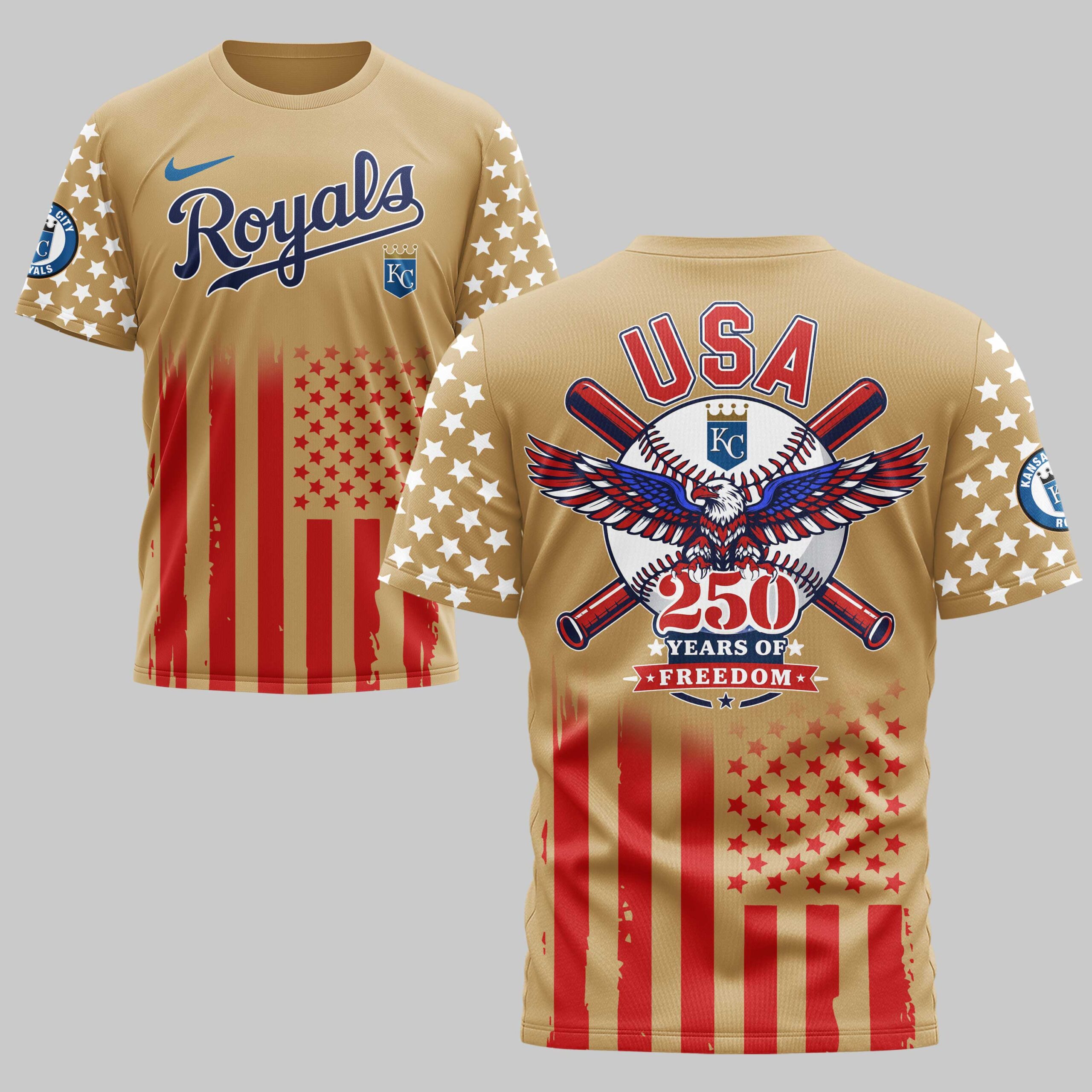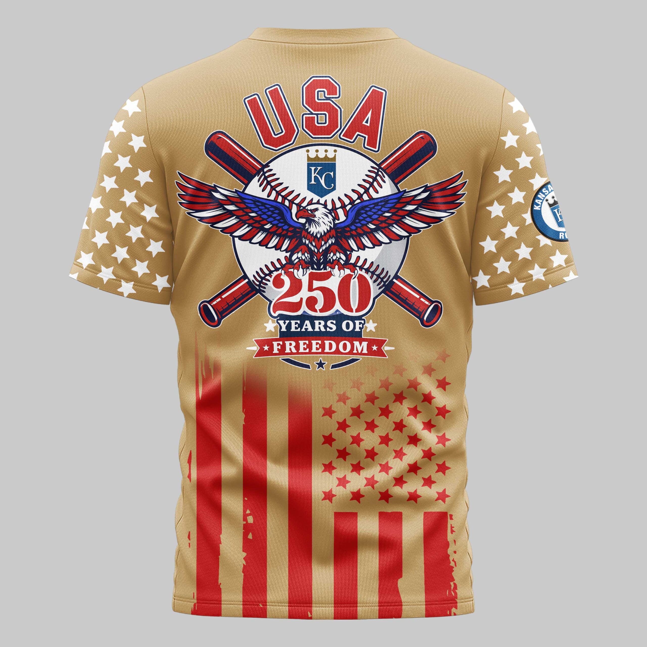 Kansas City Royals USA 250 Independence Baseball Fan T-Shirt Show off your team spirit and national pride with this striking Kansas City Royals fan t-shirt. Celebrating 250 years of freedom, this gear honors the intersection of America’s favorite pastime and the nation’s heritage. It’s a bold statement piece for fans looking to blend their love for the Royals with patriotic flair. The front features the iconic Royals script and KC logo against star-spangled sleeves and flag-inspired stripes. The back showcases a powerful graphic of a majestic bald eagle over a baseball and crossed bats. With USA and 250 Years of Freedom prominently displayed, the design captures the essence of American tradition in every detail. This shirt is perfect for game day at the ballpark, Independence Day celebrations, or everyday wear. Whether you’re at the stadium or a holiday barbecue, you’ll stand out as a proud fan who honors both their team and their country.