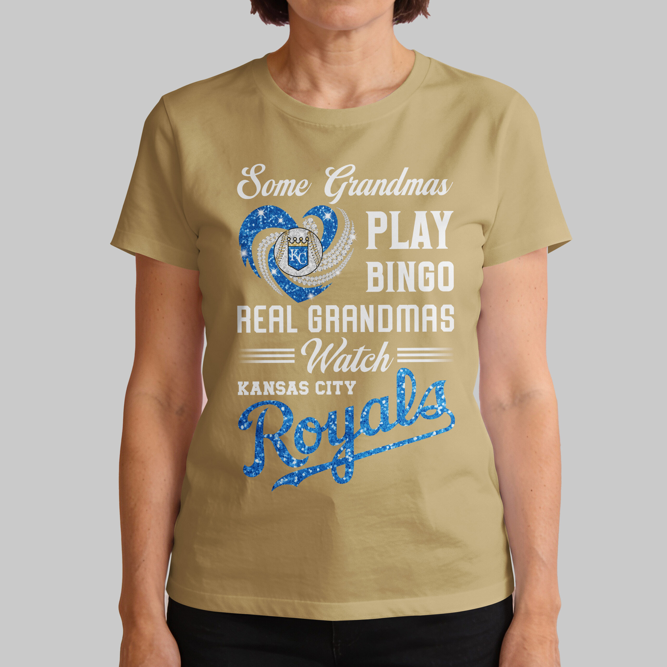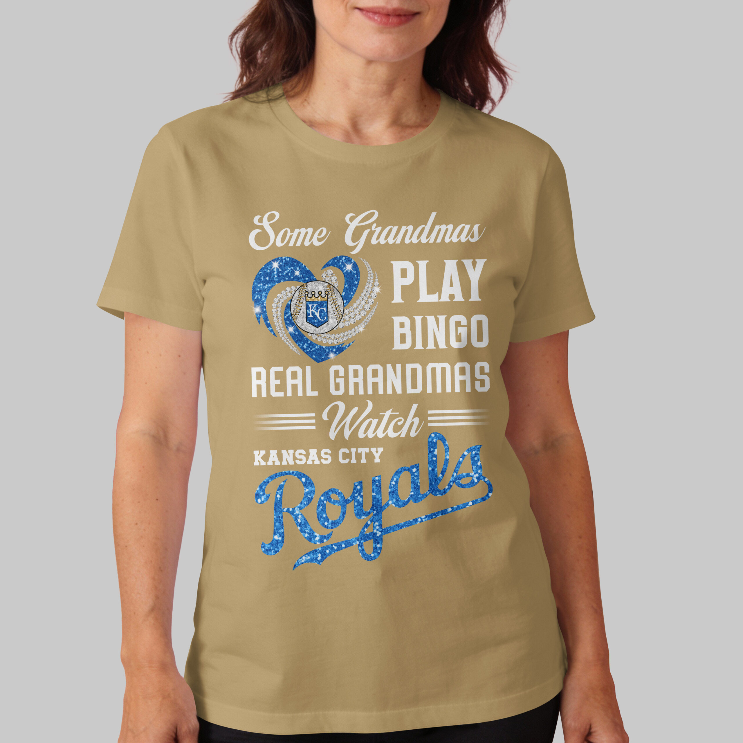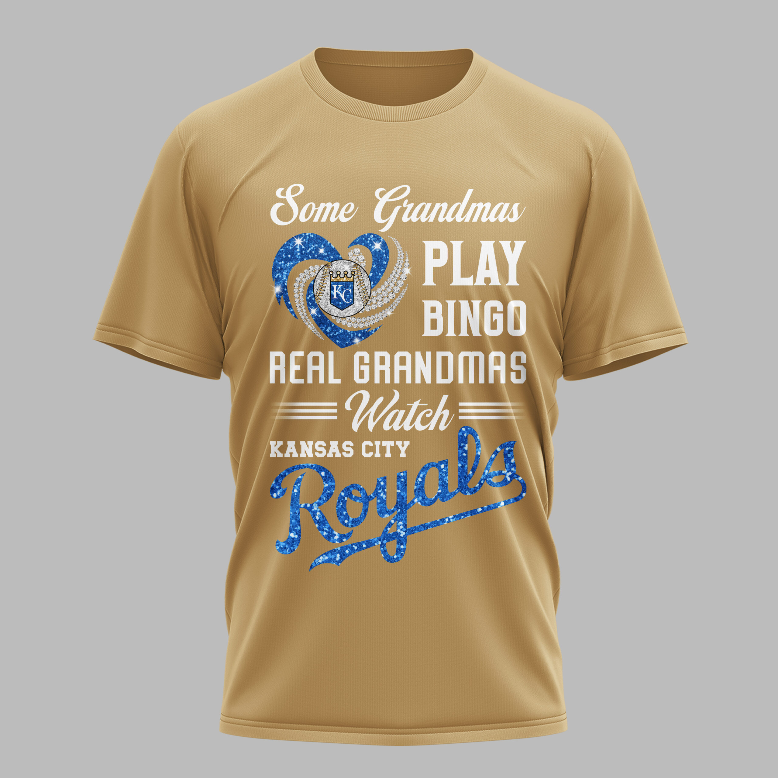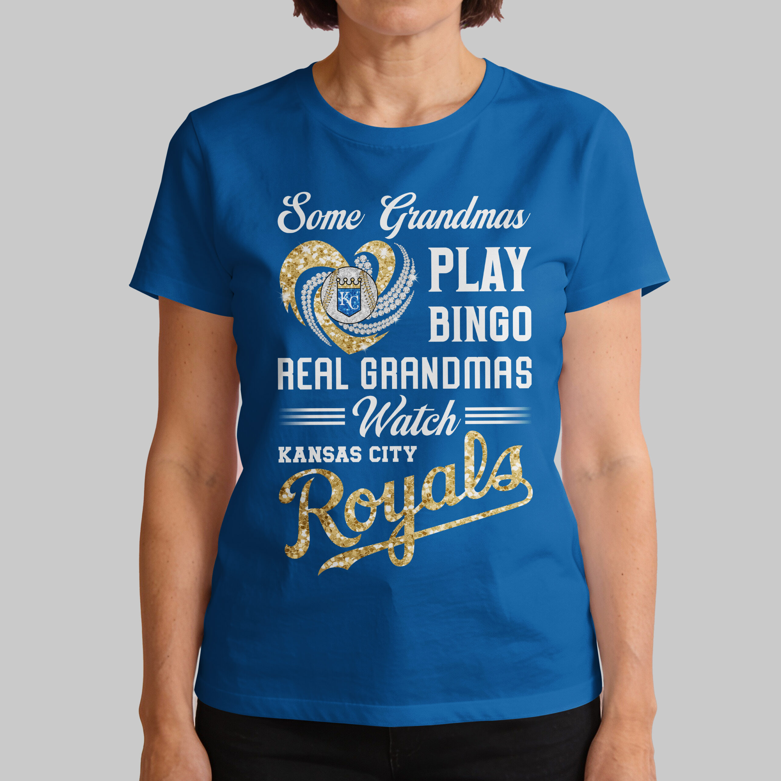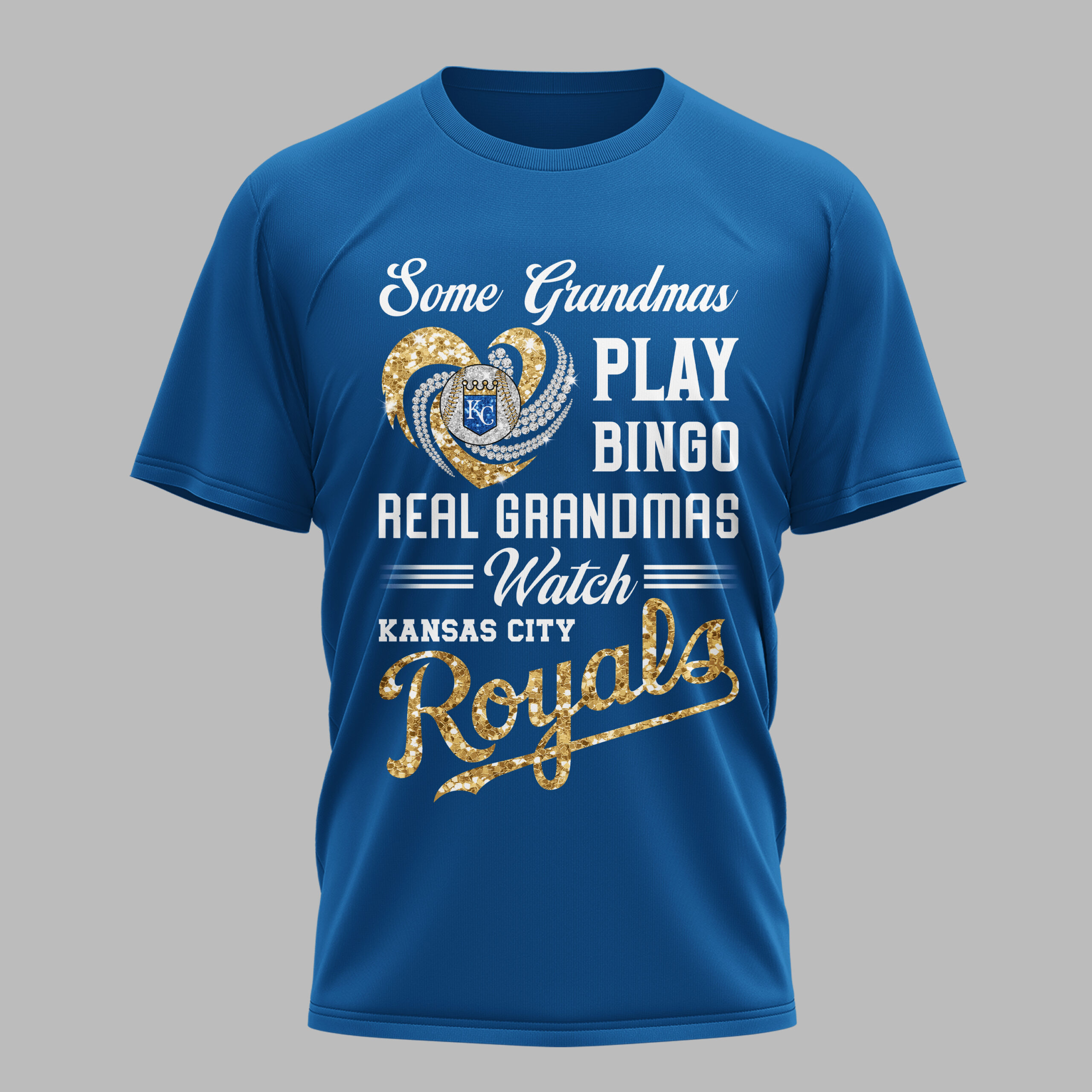 Display your Kansas City Royals spirit with this vibrant tee, designed for the ultimate baseball grandma! It celebrates grandmas who know true passion, proudly dedicating themselves to cheering on their favorite team. It’s the perfect blend of family pride and unwavering Royals fandom. The captivating front design features a sparkling heart – one side dazzling gold glitter, the other brilliant diamond-like accents – framing a detailed baseball and the iconic KC crown logo. Bold white text humorously states, Some Grandmas PLAY BINGO REAL GRANDMAS Watch KANSAS CITY Royals, with Royals in glittering gold script. Perfect for game days, watch parties, or showcasing loyalty. This spirited top suits any grandma ready to passionately root for the Royals. Wear it with pride and let your deep love for Kansas City baseball shine!