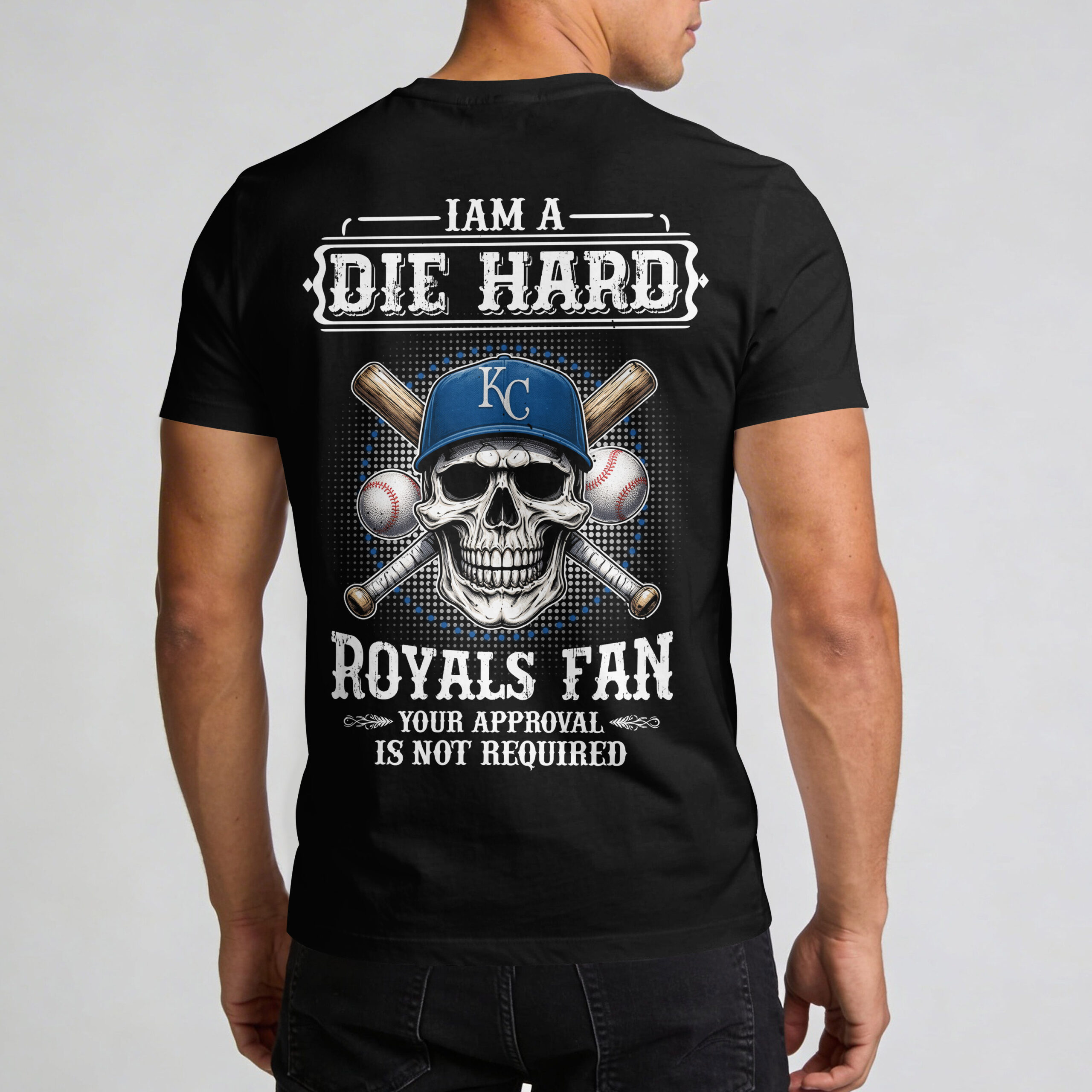 Showcase your unwavering loyalty to Kansas City with this bold fan gear. Combining fierce team pride with a celebratory American spirit, this shirt is built for the most dedicated supporters. Whether you’re at the stadium or out for the holiday, this piece makes a clear statement about your allegiance. The design features a striking skull in a blue KC cap, set against crossed bats and baseballs. A small version sits on the front chest, while the back commands attention with a large-scale graphic and the unapologetic text, I AM A DIE HARD ROYALS FAN. YOUR APPROVAL IS NOT REQUIRED. The gritty typography adds a tough, vintage edge to the visual. Perfect for game day at the ballpark, Independence Day celebrations, or everyday wear, this shirt is a must-have for the Kansas City faithful. Stand tall and show the world that your team spirit is here to stay.