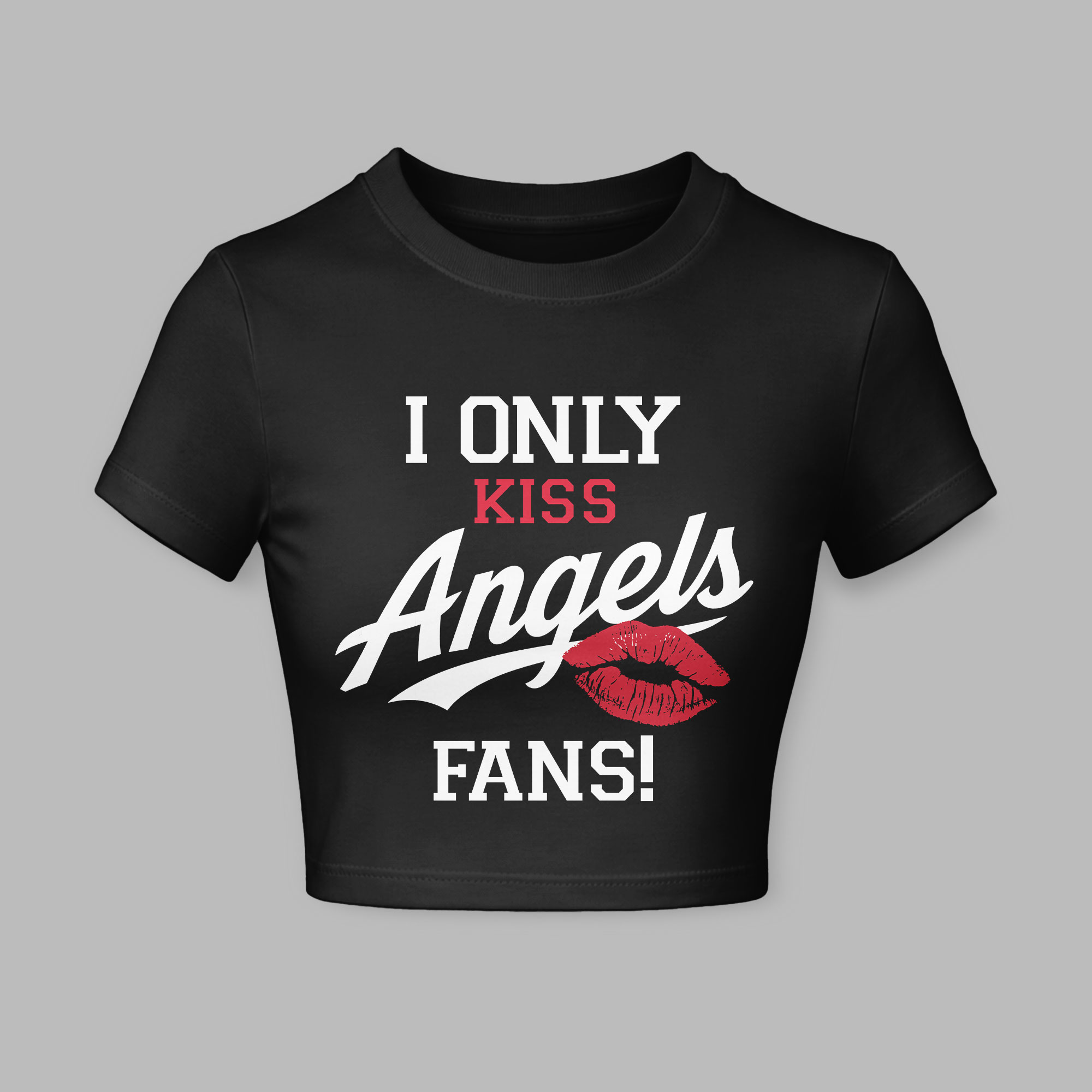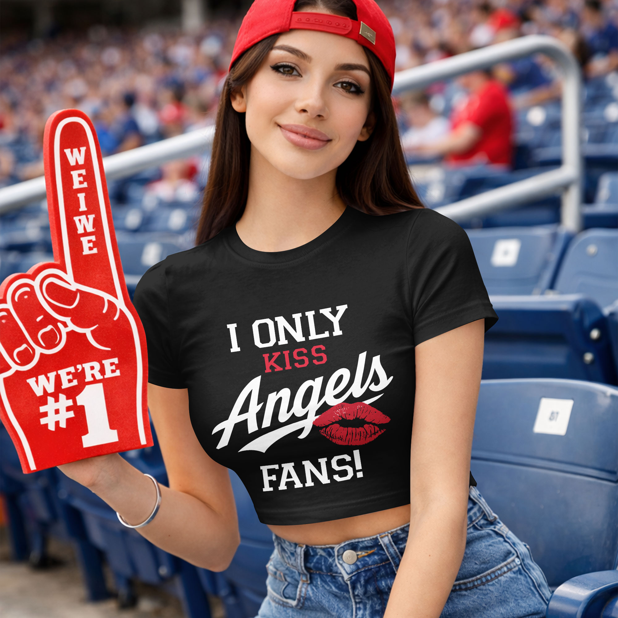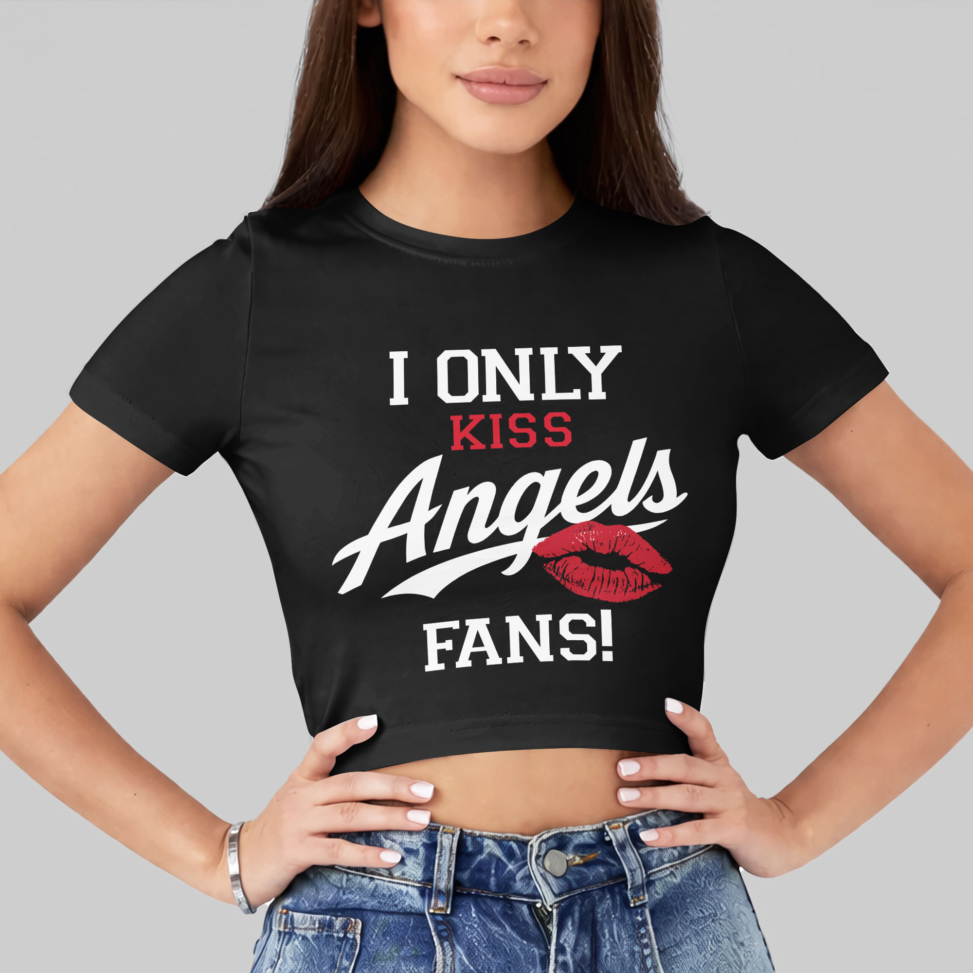 Declare your Los Angeles Angels pride with a fun and flirty twist! This crop top is perfect for dedicated fans ready to show their allegiance with a playful statement, connecting with fellow supporters. The front of this stylish black crop top boldly declares I ONLY KISS in white, followed by Angels in a dynamic white script with a vibrant red KISS graphic over the ‘i’ and a striking red lip print on the ‘s’. On the back, just below the neckline, you’ll find the authentic Major League Baseball (MLB) logo, adding an official touch to your game day look. Wear this eye-catching crop top to the ballpark, a watch party with friends, or any casual outing where you want to showcase your team spirit and playful personality. It’s perfect for summer games or simply flaunting your Angels devotion.
