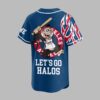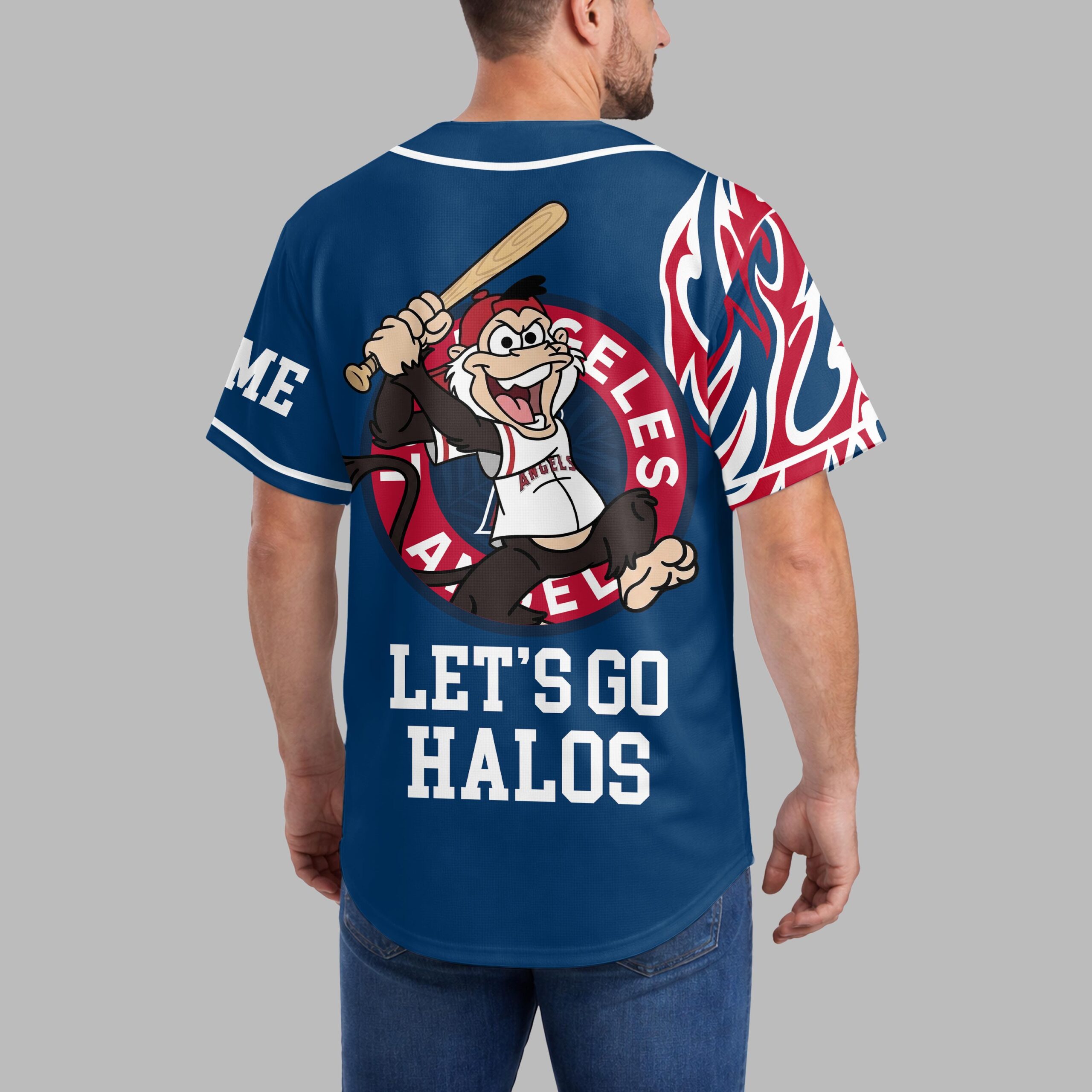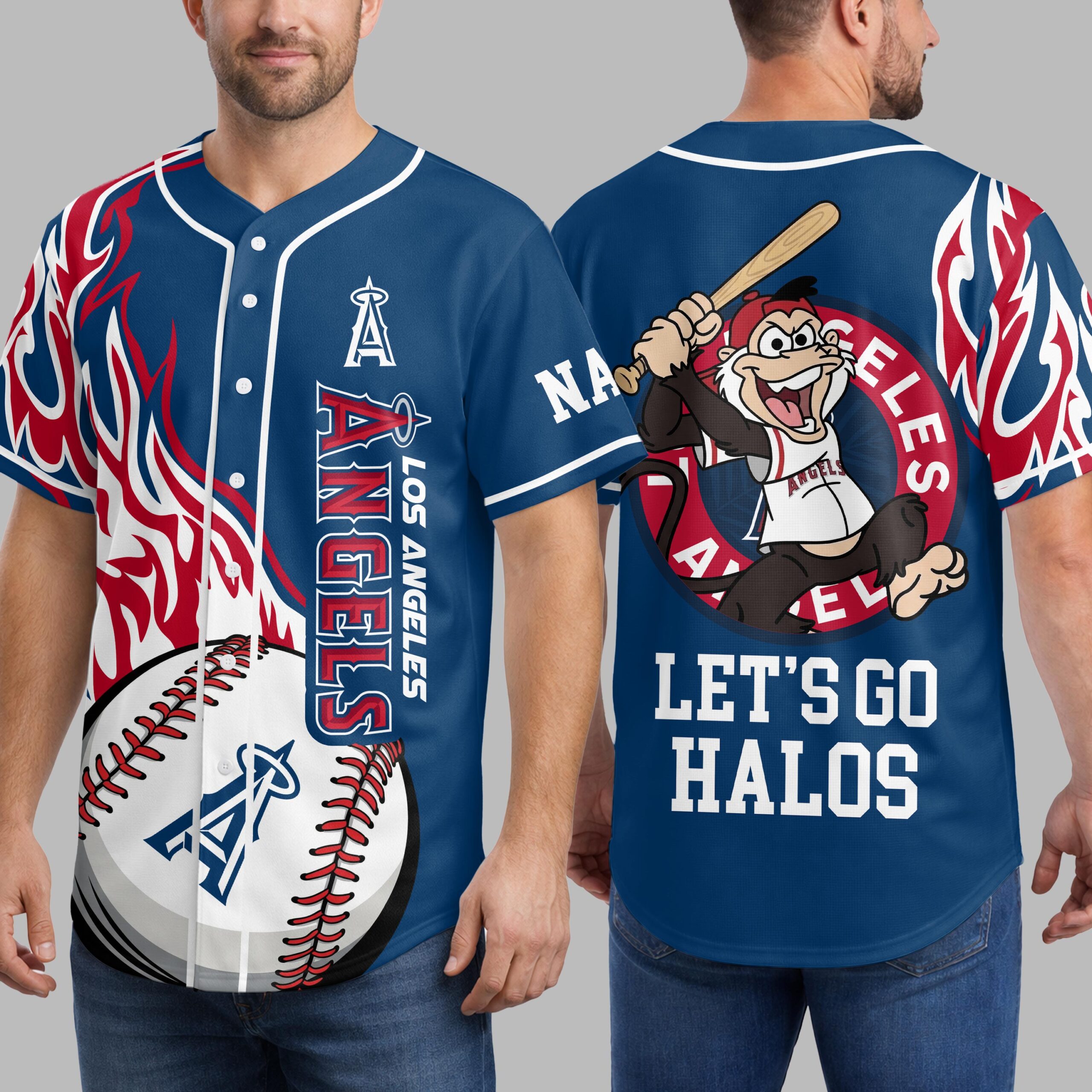 Ignite your Angels pride with this dynamic baseball jersey, perfect for showing off your team spirit! This shirt captures the thrilling energy of game day, making it an essential addition for any dedicated Los Angeles Angels fan. The front features the iconic LOS ANGELES ANGELS text running vertically alongside the buttons, highlighted by a bold A halo logo and vibrant red and white flame graphics. The design continues to the back, where a spirited cartoon monkey character, ready to bat, is encircled by ANGELS text. Below, the rallying cry LET’S GO HALOS proudly declares your allegiance. Whether you’re cheering from the stands at Angel Stadium, hosting a watch party, or simply out and about, this jersey is designed to make a statement. It’s the ultimate way to celebrate every home run and unforgettable moment with fellow Angels fans, embodying the passion of the game.
