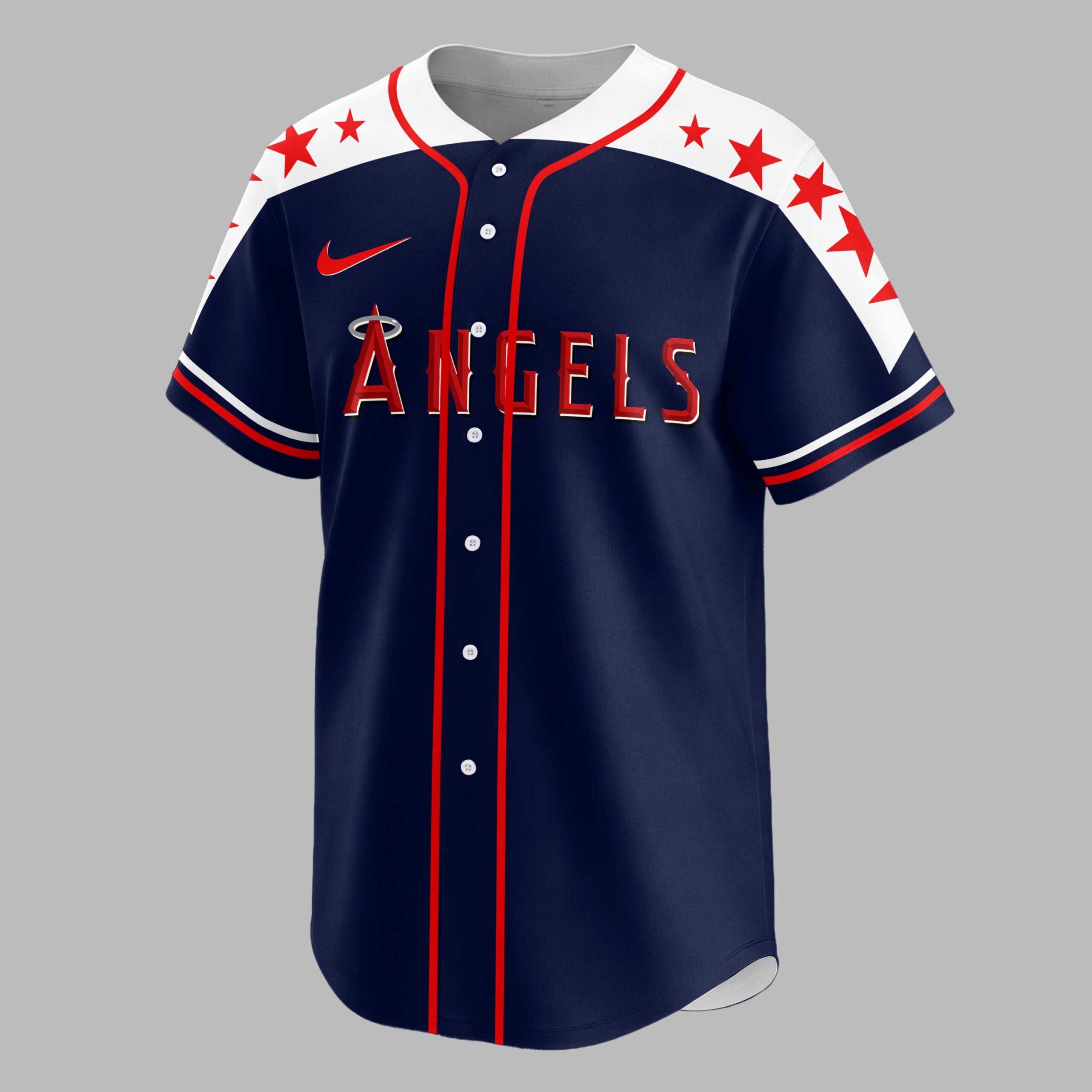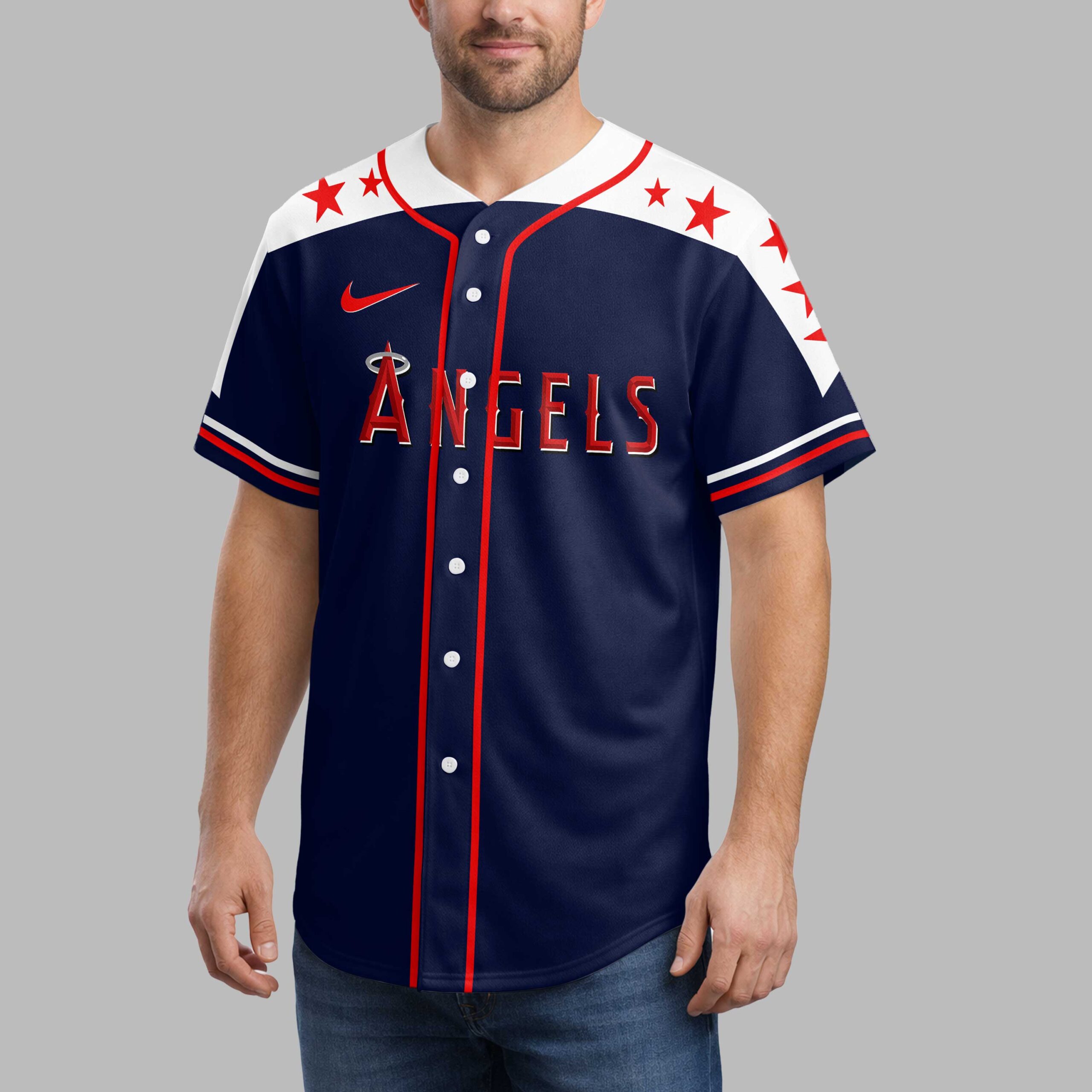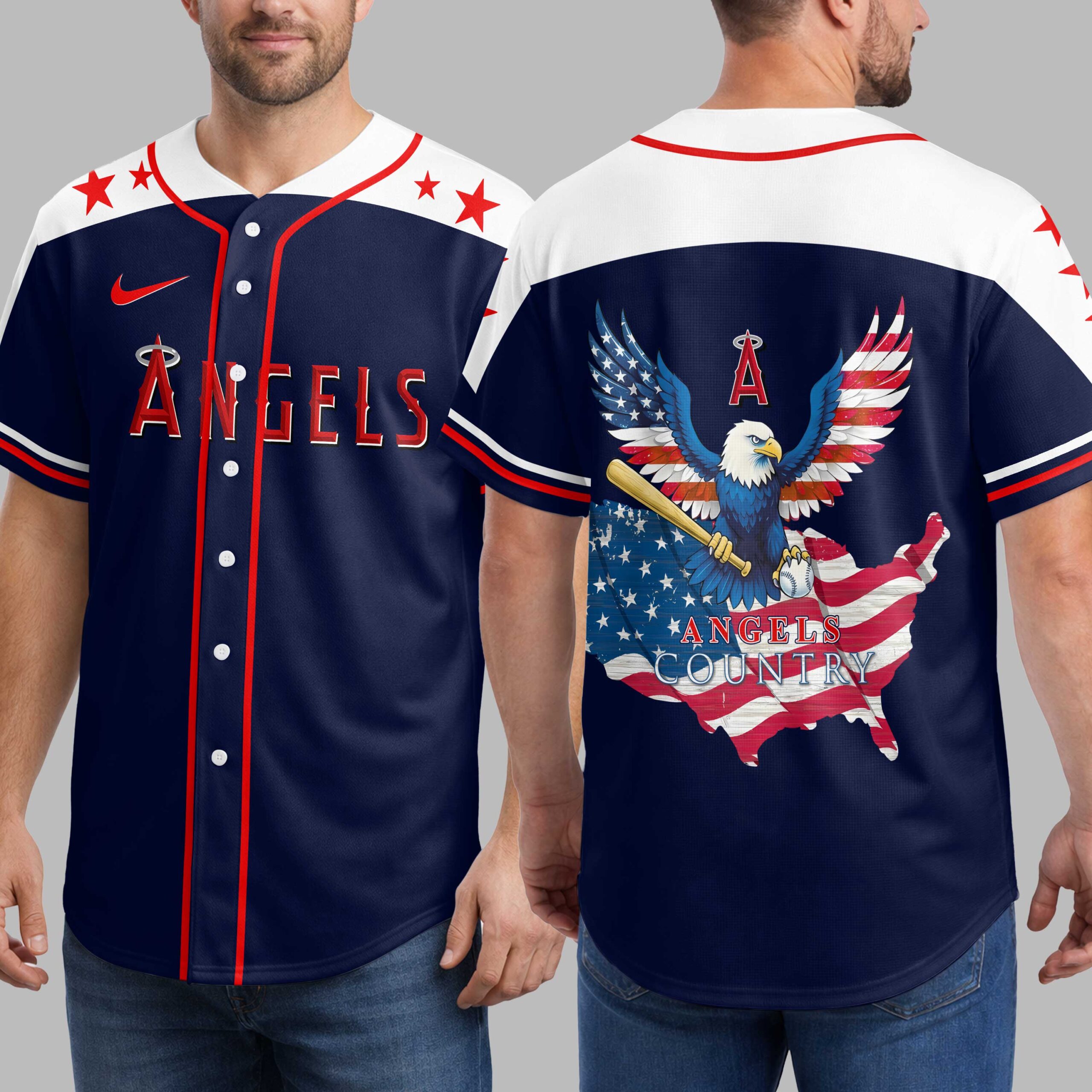 Rally behind your favorite team with our exclusive Angels Country Patriotic Baseball Jersey! This striking design perfectly blends your passion for baseball with unwavering American pride, making it the ultimate statement piece for any dedicated fan. The front proudly displays ANGELS across the chest in bold red lettering, accented with an iconic halo and a subtle Nike swoosh. The shoulders feature crisp white panels adorned with vibrant red stars, continuing the patriotic theme. Turn heads with the back design, showcasing a majestic bald eagle with wings detailed like the American flag, clutching a baseball bat. This powerful symbol rests atop a distressed U.S. map, also patterned with the stars and stripes, alongside the declaration ANGELS COUNTRY. Perfect for game day at the ballpark, Fourth of July celebrations, or any event where you want to display your Angels loyalty and American spirit. Wear it to show your pride, whether you’re cheering from the stands or enjoying a casual outing with fellow fans.