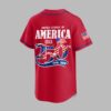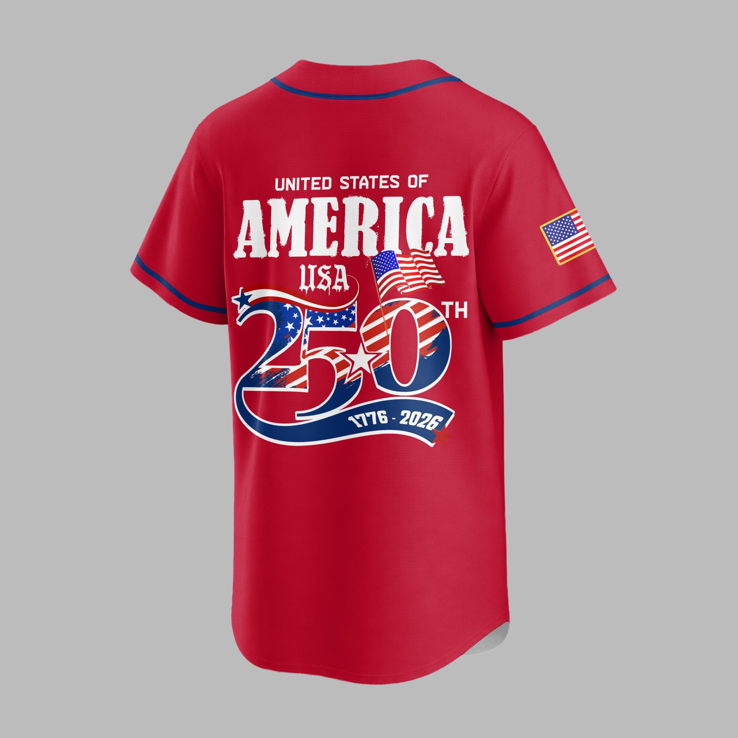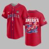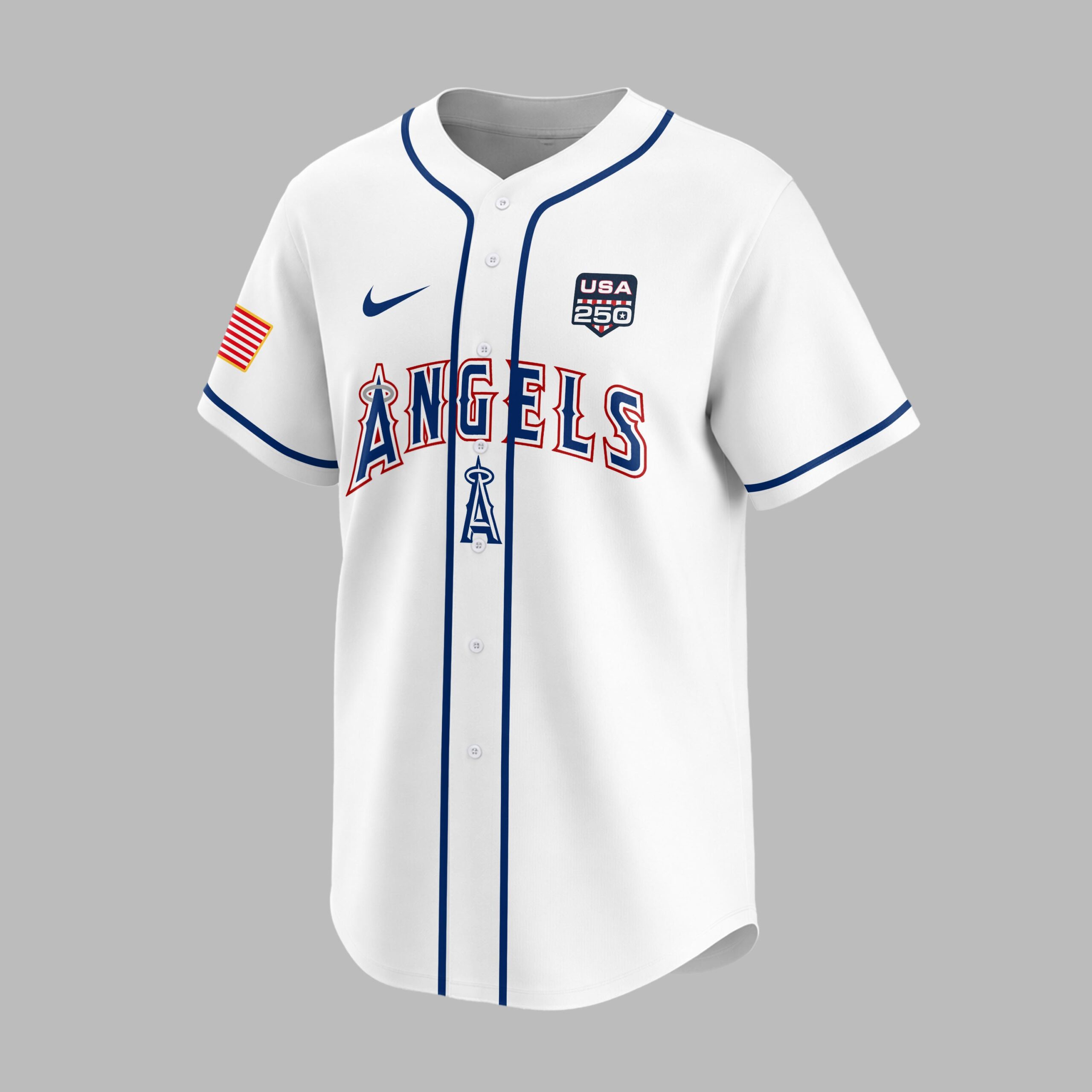 Unite your passion for the Angels and American pride with this commemorative baseball jersey! Celebrate a historic milestone and cheer on your favorite team in style. This vibrant red jersey is a powerful statement of loyalty, perfect for fans who embrace both national heritage and baseball spirit. The front proudly displays ‘ANGELS’ in bold white lettering with a blue outline, featuring the iconic halo above the ‘A’. A special ‘USA 250’ patch, adorned with the Stars and Stripes, rests on the chest, complemented by an American flag on the sleeve. The back dramatically showcases ‘UNITED STATES OF AMERICA’ above a striking ‘250TH’ design, artfully integrated with flag motifs. Below, waving American flags and the ‘1776 – 2026’ banner mark the significant anniversary. Whether you’re at the ballpark, celebrating the Fourth of July, or simply showing off your patriotic spirit, this jersey is designed for memorable occasions. It’s the ultimate way to honor the nation’s journey while rooting for the Angels, making every game day or national holiday a true celebration.