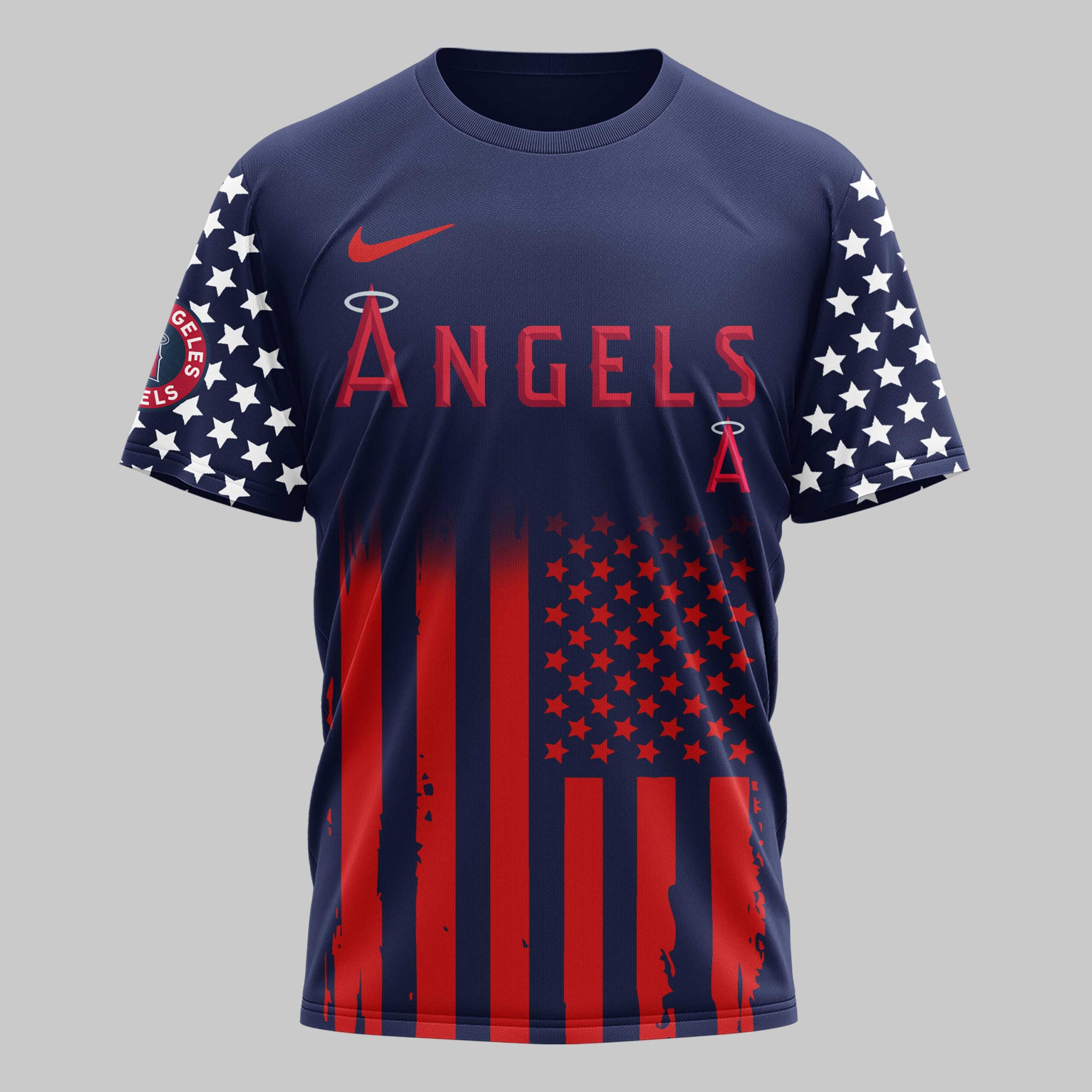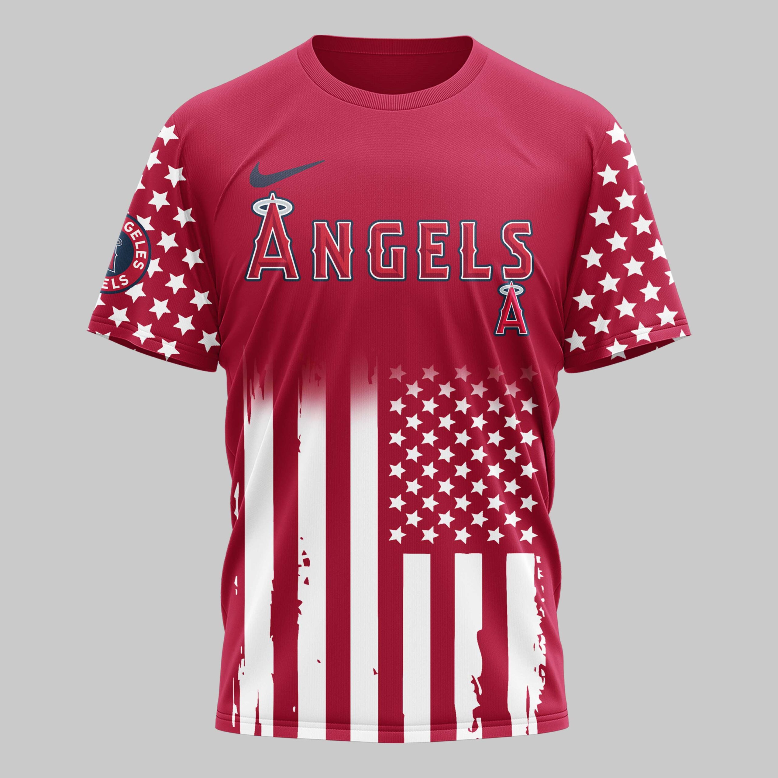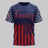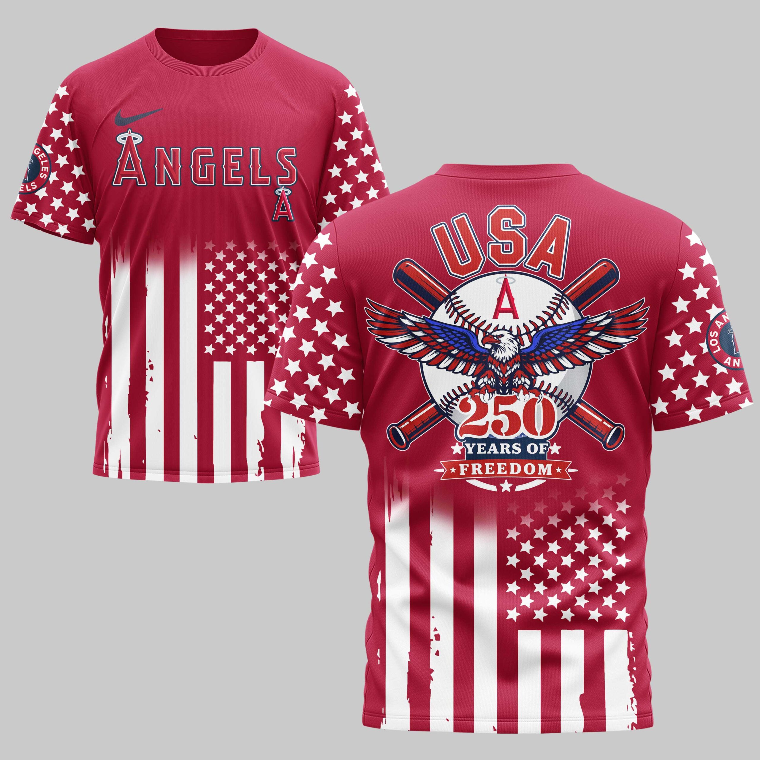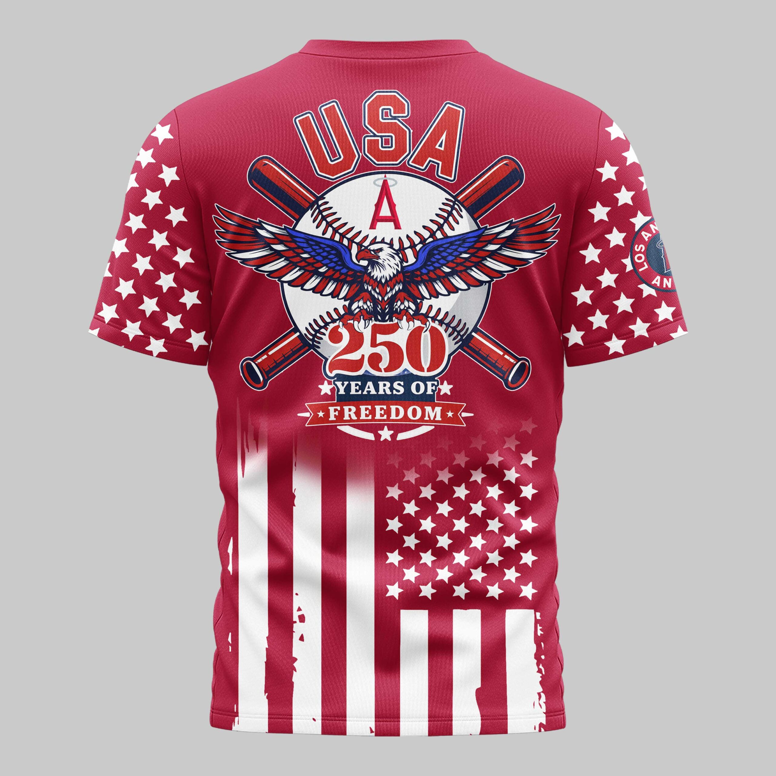 Show your passion for the game and your country with this striking Los Angeles Angels commemorative tee. Designed for fans who carry both team spirit and patriotic pride, this shirt honors a historic milestone in American freedom. It’s the ultimate way to represent the red, white, and blue while supporting your favorite Halos. The design features ANGELS across the chest, paired with star-spangled sleeves and a stylized American flag motif. The back showcases a powerful bald eagle over a baseball with crossed bats and bold USA lettering. The 250 Years of Freedom graphic makes this a standout piece for any collector, blending classic baseball imagery with iconic national symbols. This shirt is perfect for game days at the stadium, Independence Day celebrations, or everyday fan wear. It’s a bold choice for any devoted Angels fan looking to make a patriotic statement all season long.