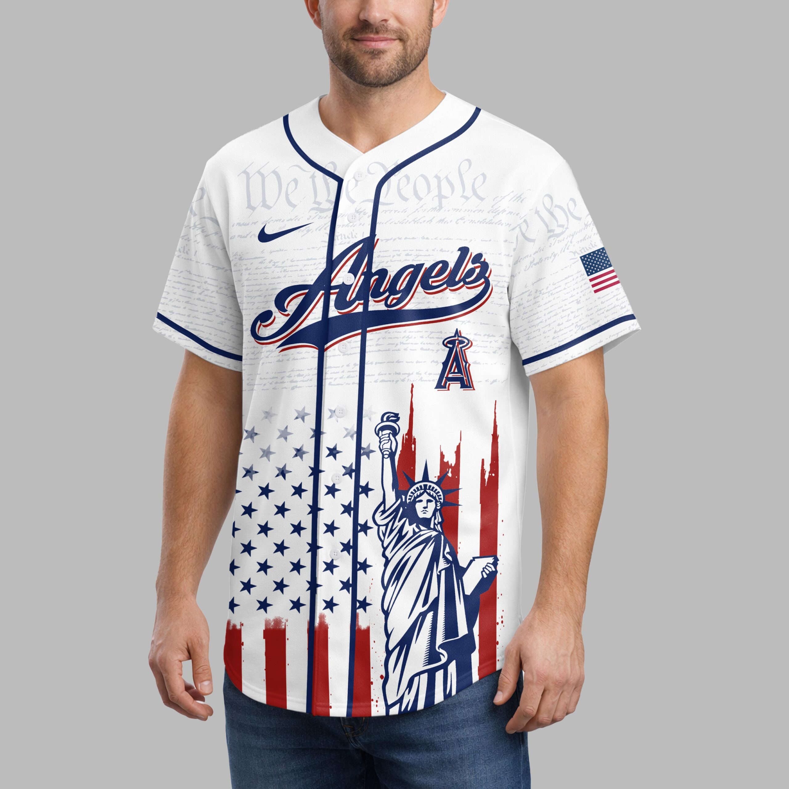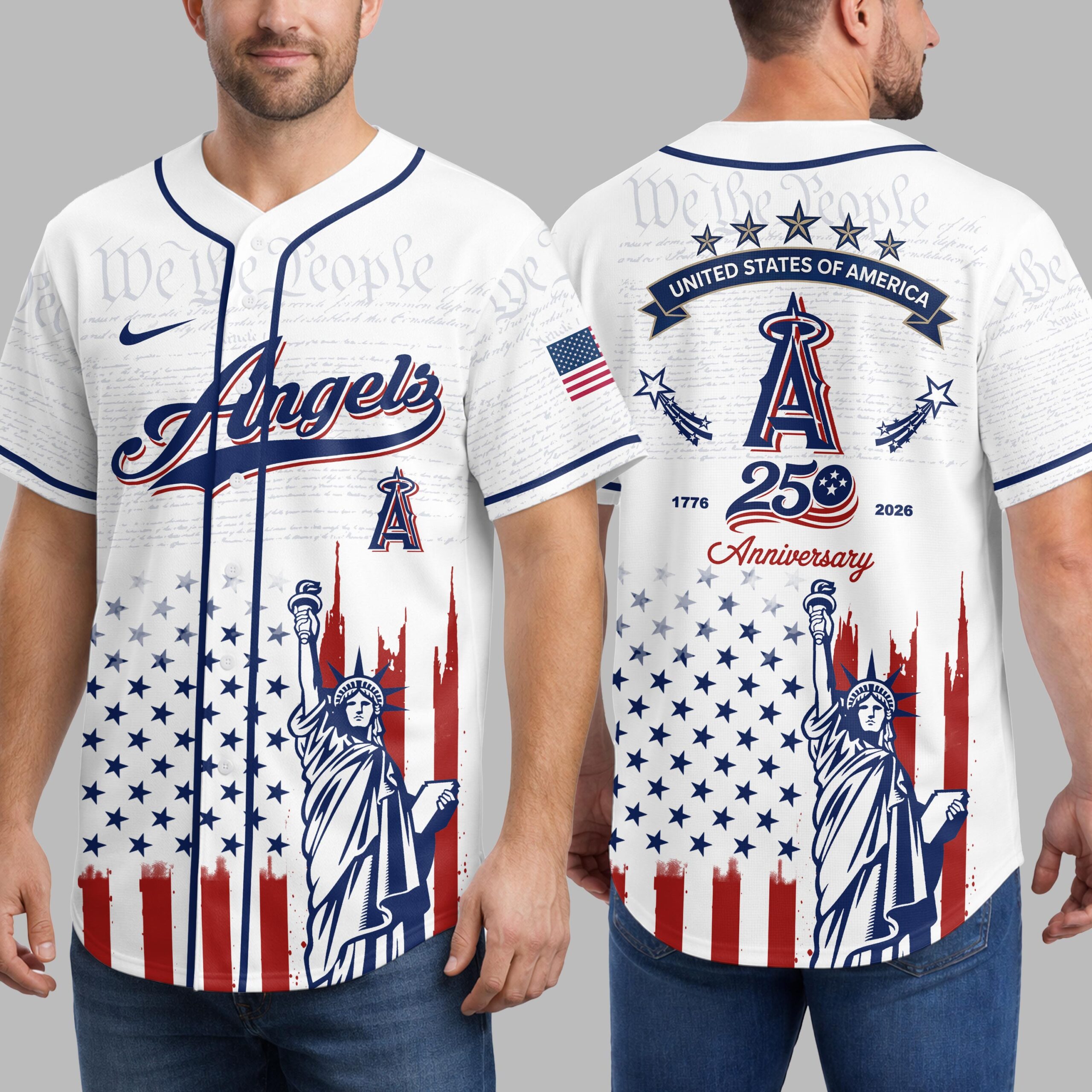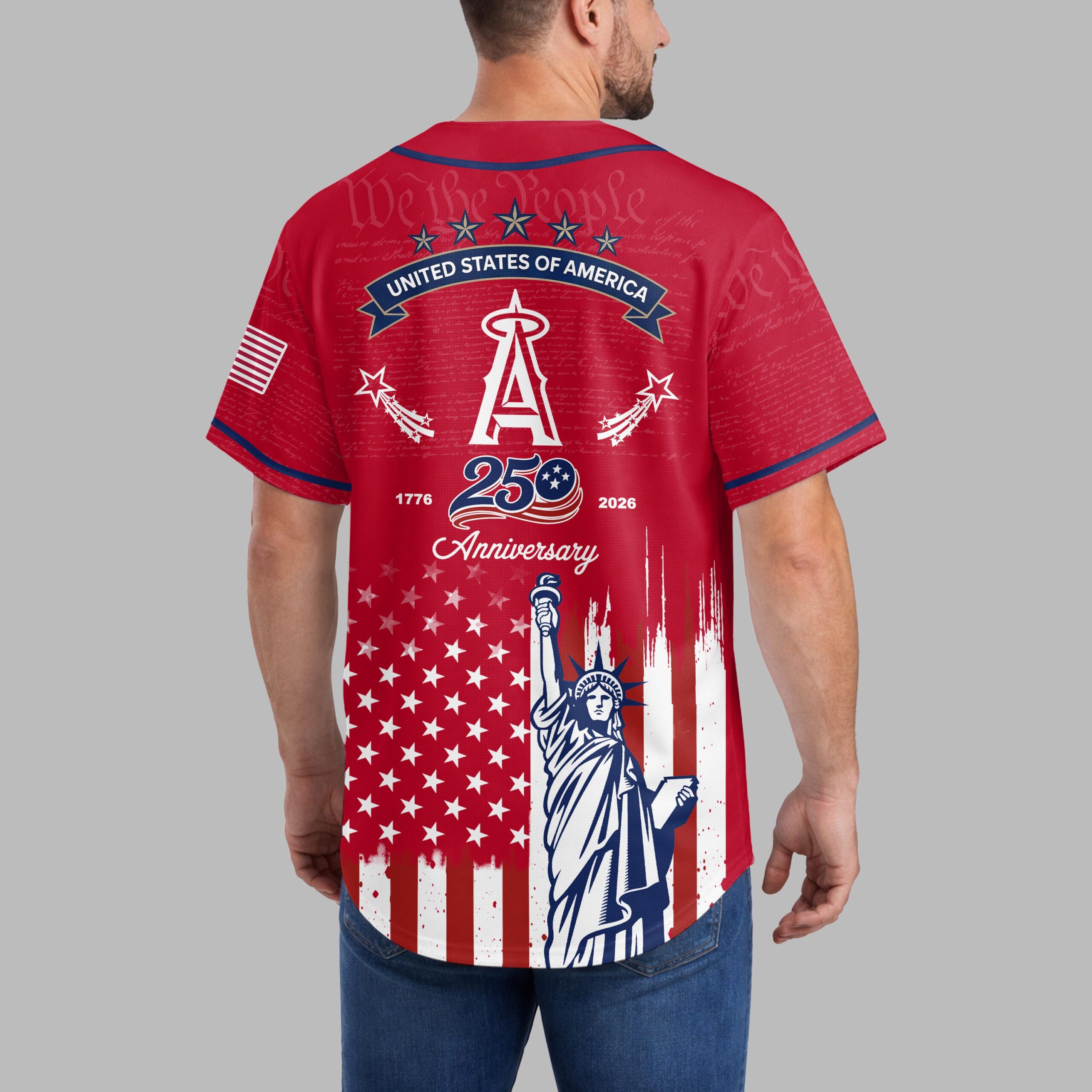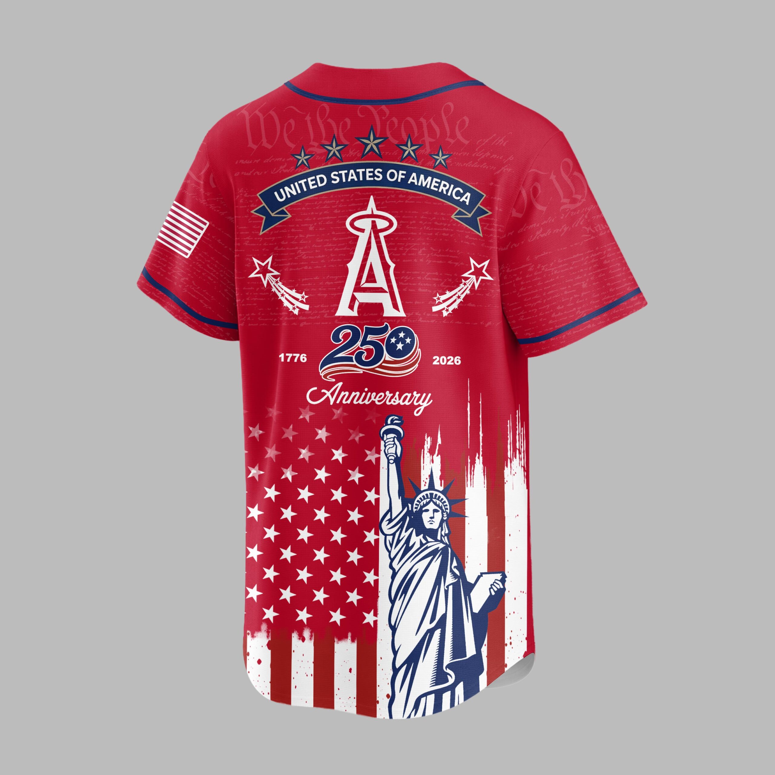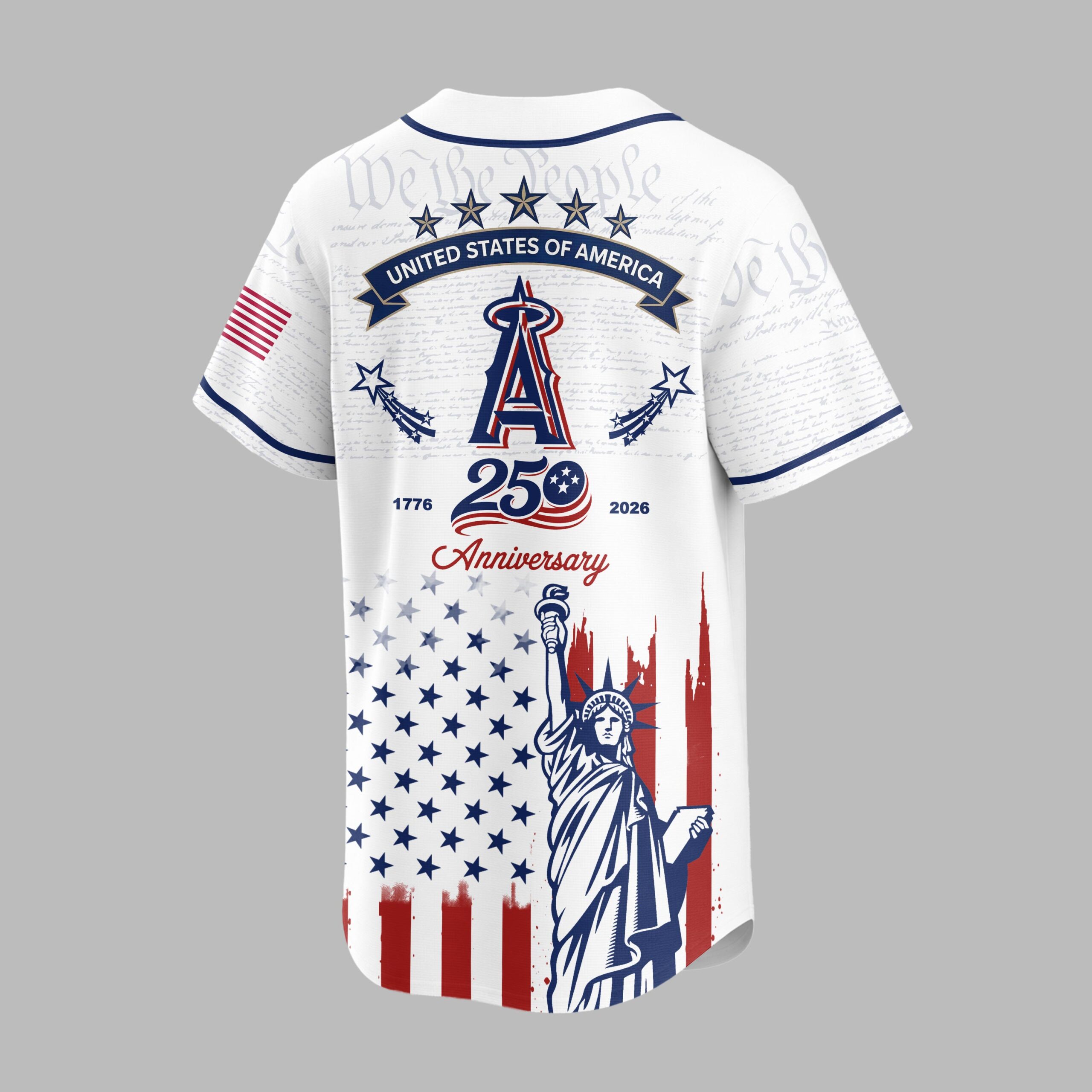 Celebrate your Angels fandom and American spirit with this striking patriotic baseball jersey! This design masterfully blends your team loyalty with a powerful tribute to the nation’s 250th anniversary, creating a truly special piece for any dedicated fan. The front proudly displays the iconic Angels script logo and the A emblem, set against a subtle background of We the People text. Below, a vibrant distressed American flag motif, complete with stars and bold red stripes, frames a majestic depiction of the Statue of Liberty. The back echoes this powerful imagery, featuring the STATES OF AMERICA banner, the A logo flanked by shooting stars, and a prominent 1776 250 2026 Anniversary commemorating a significant milestone. The full design embodies both team pride and national heritage. Perfect for game day, Fourth of July celebrations, Memorial Day barbecues, or simply showing off your patriotic spirit year-round. Wear it to the ballpark, family gatherings, or any event where you want to express your love for baseball and country.