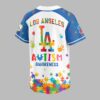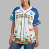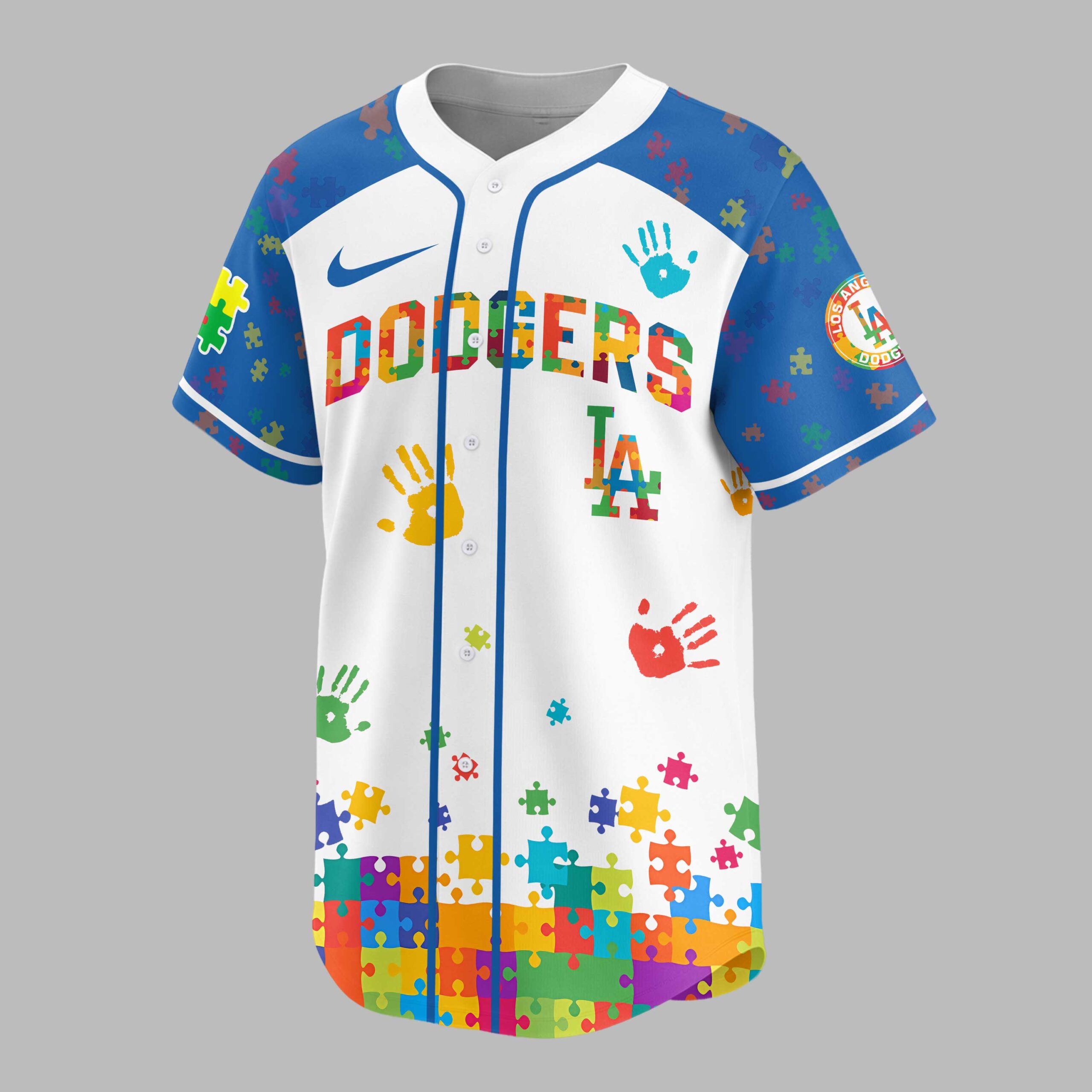 Unite your passion for the Los Angeles Dodgers with a powerful message of support! This vibrant Autism Awareness baseball jersey merges game day excitement with heartfelt inclusion, creating a truly unique statement for any dedicated fan. The front proudly displays DODGERS and the iconic LA logo, each letter adorned with a colorful puzzle piece pattern, symbolizing the diverse autism spectrum. Scattered handprints and individual puzzle pieces add dynamic flair. The back features LOS ANGELES, a bold LA logo, and AUTISM AWARENESS, all rendered in the same captivating, bright puzzle motif. Perfect for cheering at Dodger Stadium, joining awareness walks, or simply showing support daily. This jersey is more than fan gear; it’s a vibrant statement of solidarity and a powerful way to spread acceptance celebrating your team.