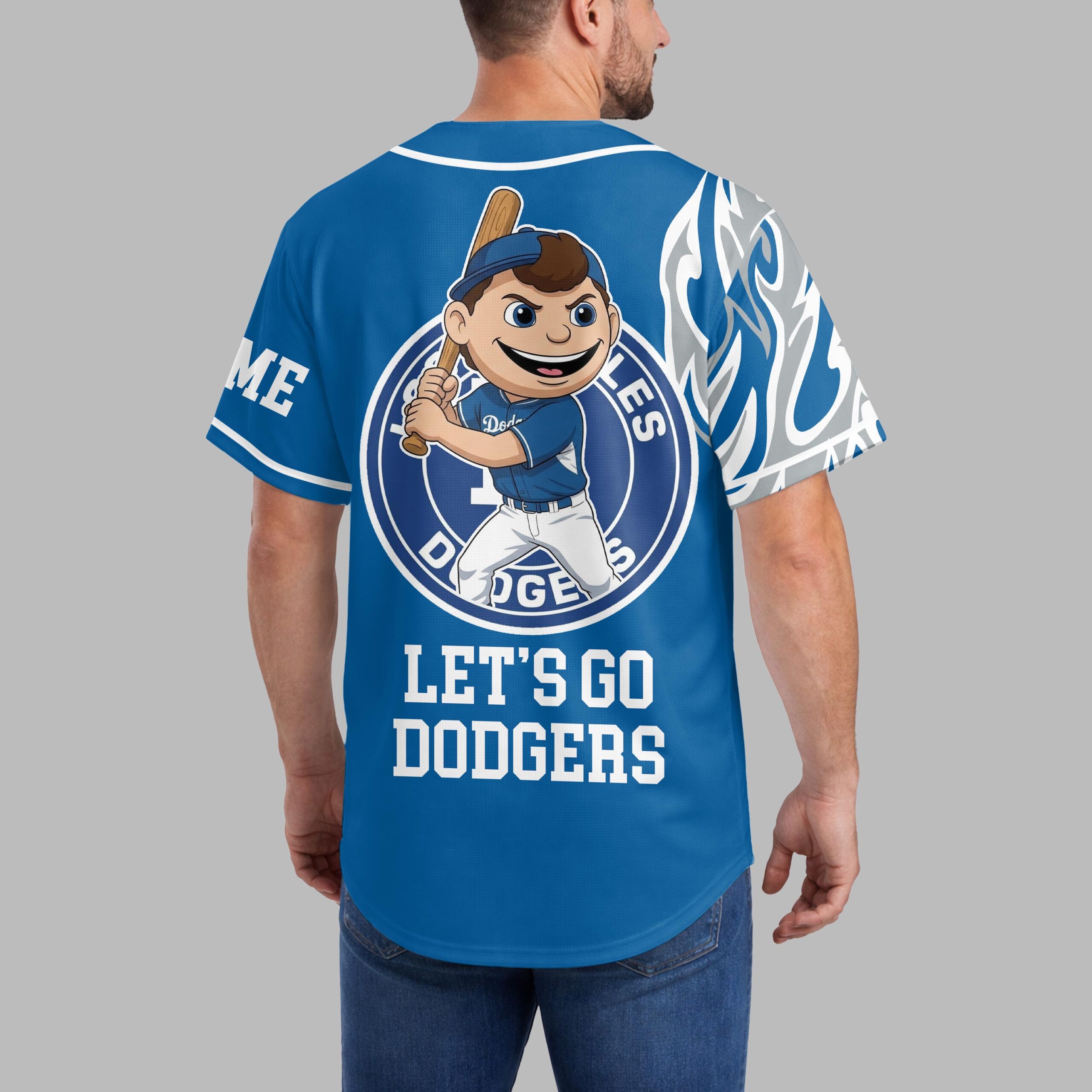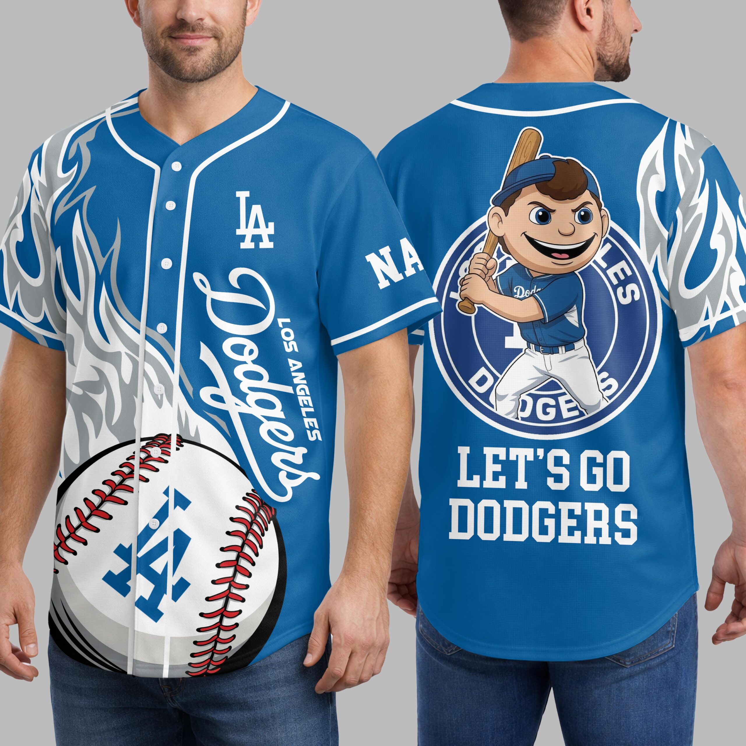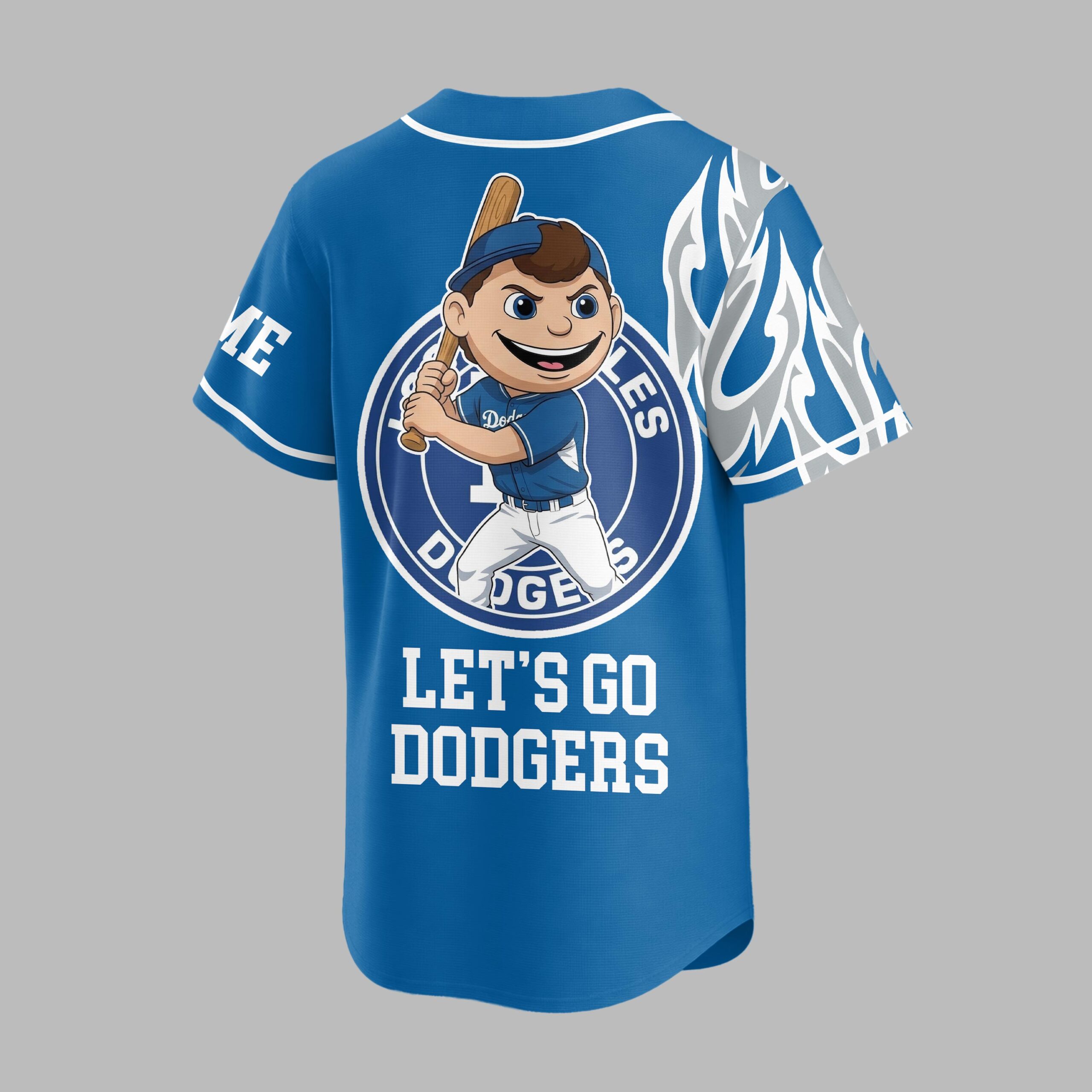 Show your unwavering support for the Los Angeles Dodgers with this vibrant baseball jersey! Blending classic team pride with a dynamic, flame-inspired design, it’s the perfect way to represent your favorite team at any game or event. The front proudly displays the iconic LA Dodgers script with Los Angeles and a bold 44 on a baseball graphic. White and grey flame patterns electrify the shoulders and sides. On the back, a cheerful baseball mascot is encircled by the team name, featuring a custom name area and the spirited call: LET’S GO DODGERS! Whether cheering from the stands, hosting a watch party, or sporting your loyalty daily, this jersey captures the excitement of baseball. It’s the ultimate statement of your enduring passion as a Los Angeles Dodgers fan.