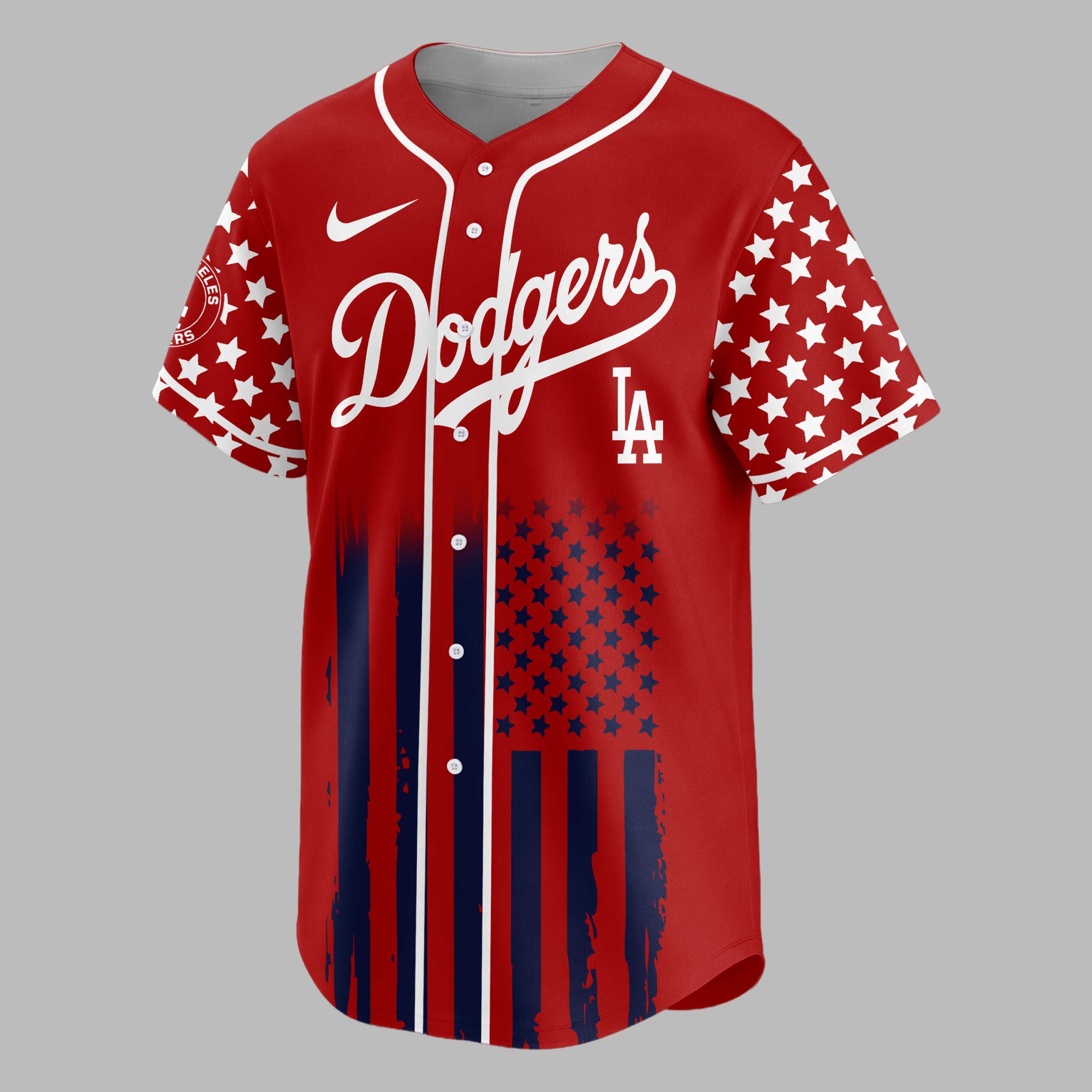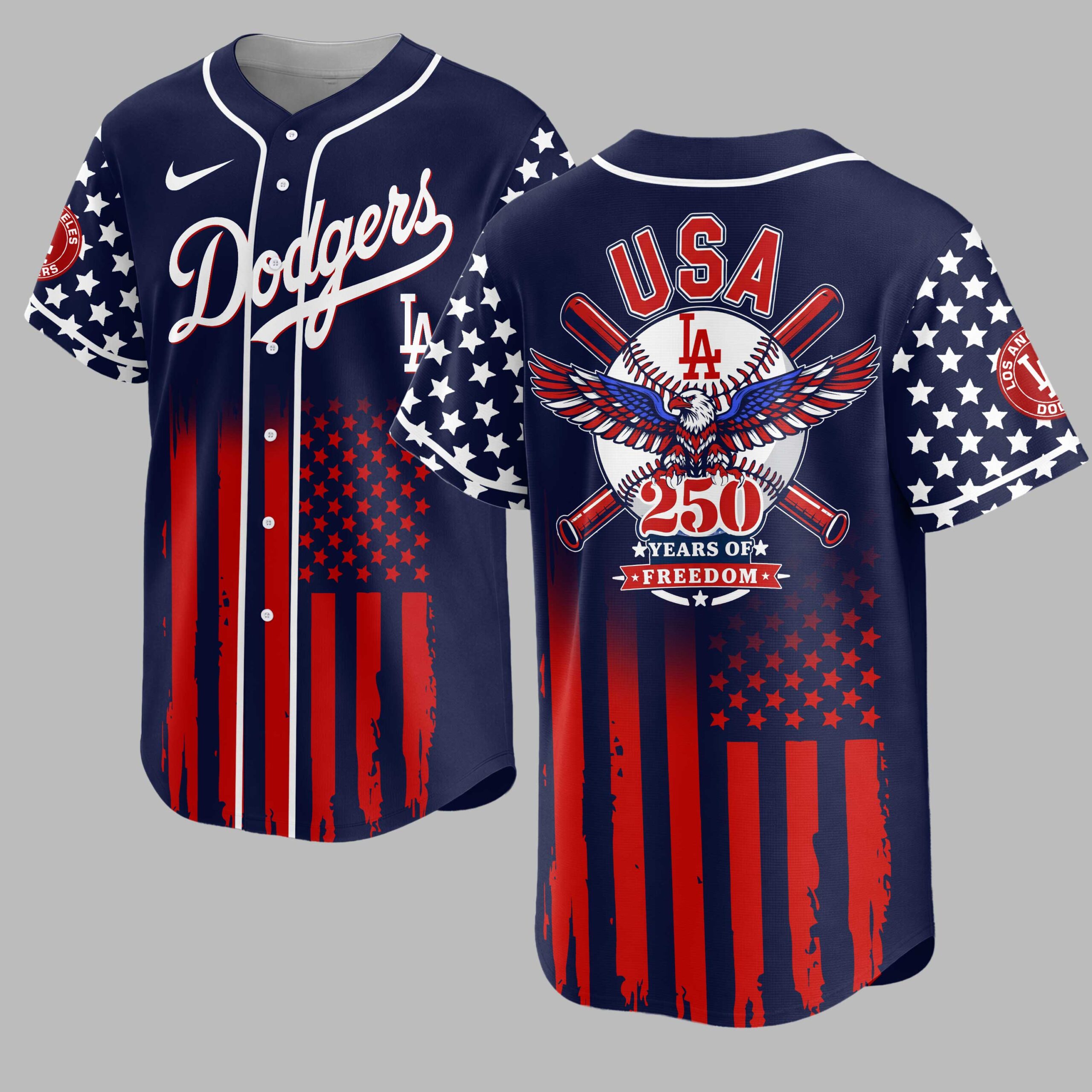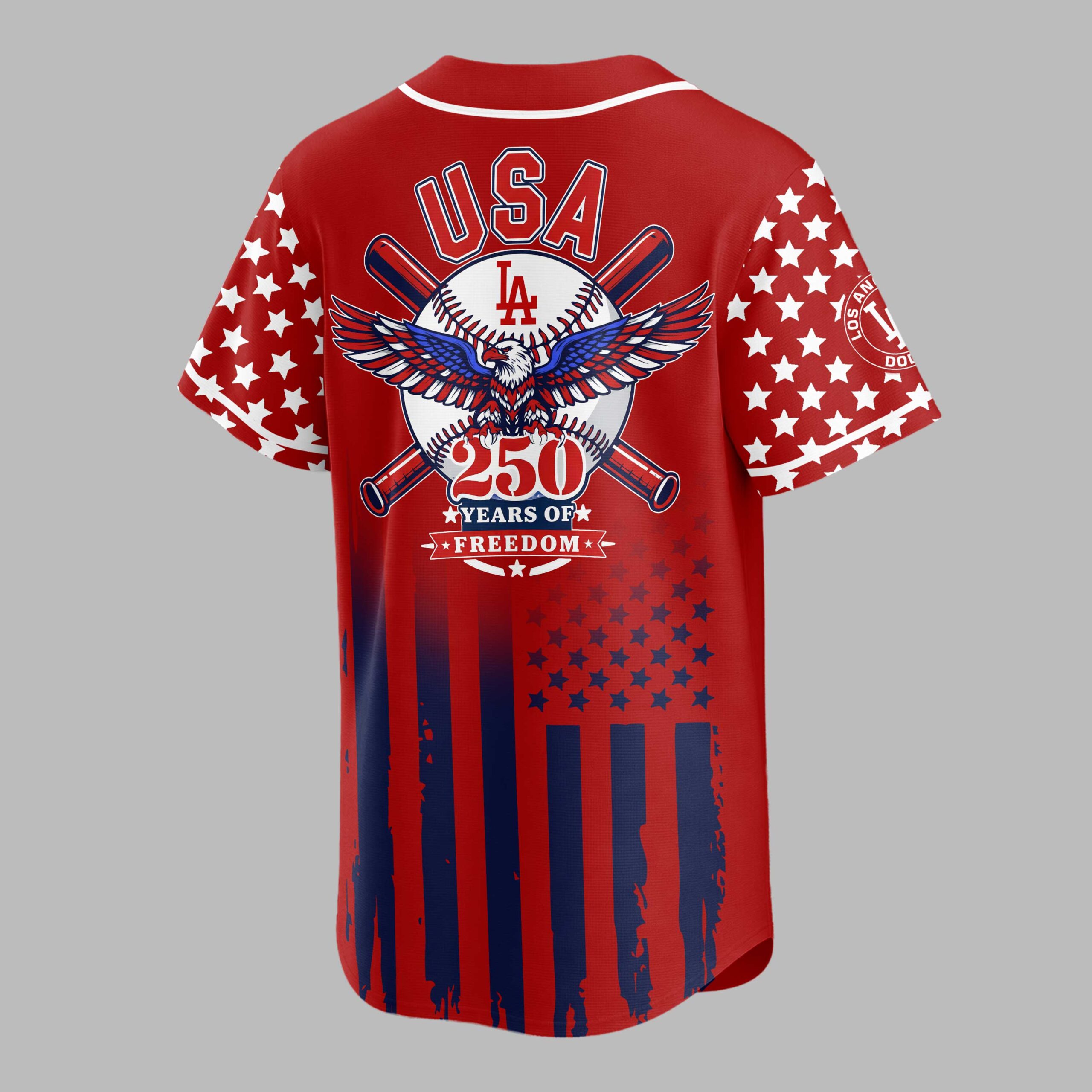 Celebrate Dodgers and American pride with this vibrant Patriotic Freedom Baseball Jersey! Marking 250 Years of Freedom, it blends team spirit with a bold national tribute. Honor your team and country in one striking design. The front features Dodgers script and LA logo over a distressed American flag of blue stripes, white stars on red. Sleeves carry this theme. The back showcases USA above a baseball, crossed bats, a majestic red, white, and blue bald eagle. A banner declares 250 YEARS OF FREEDOM, against a matching flag pattern. Ideal for game days, Fourth of July, Memorial Day, or patriotic events. Wear it to the ballpark or celebrations to proudly display Dodgers fandom and American spirit.