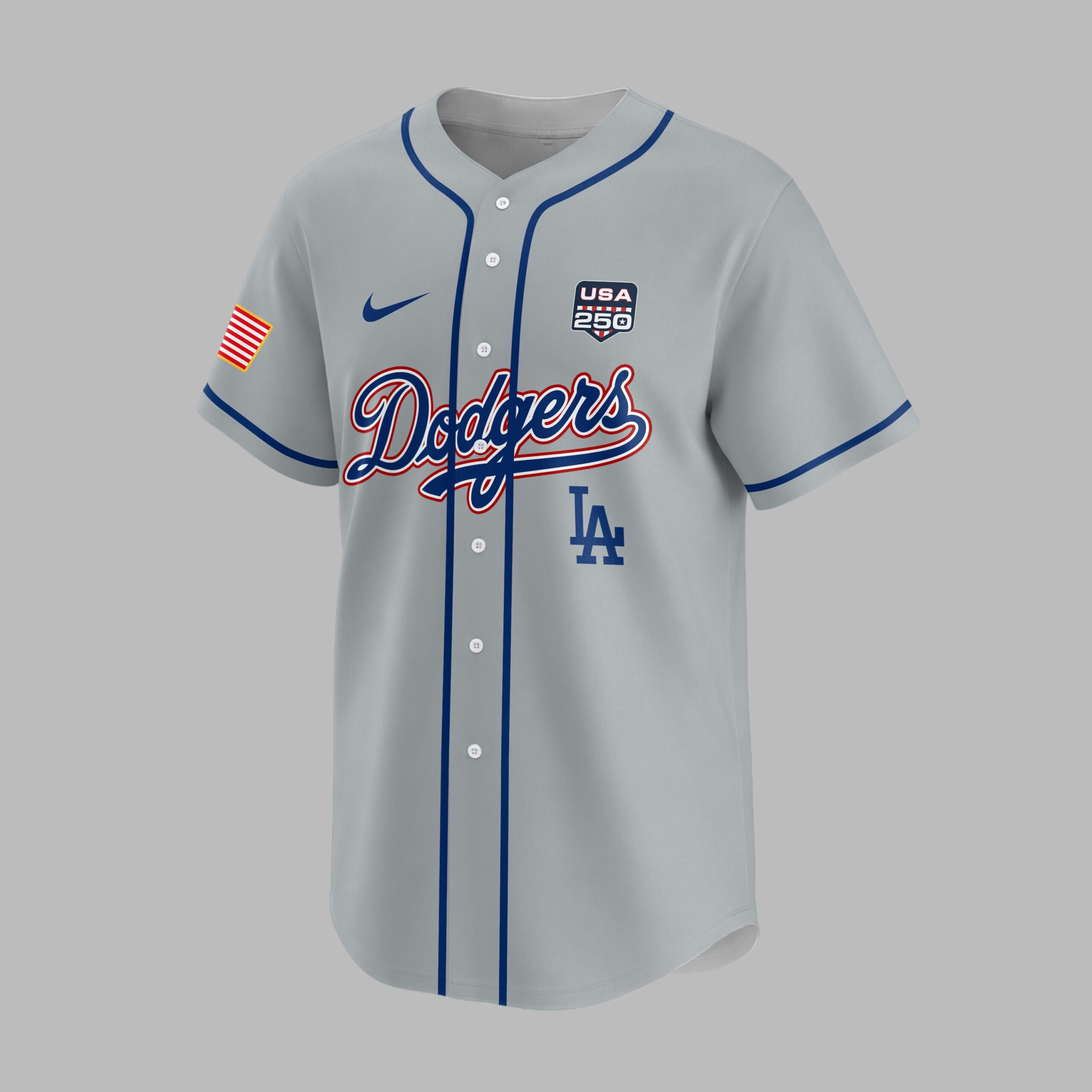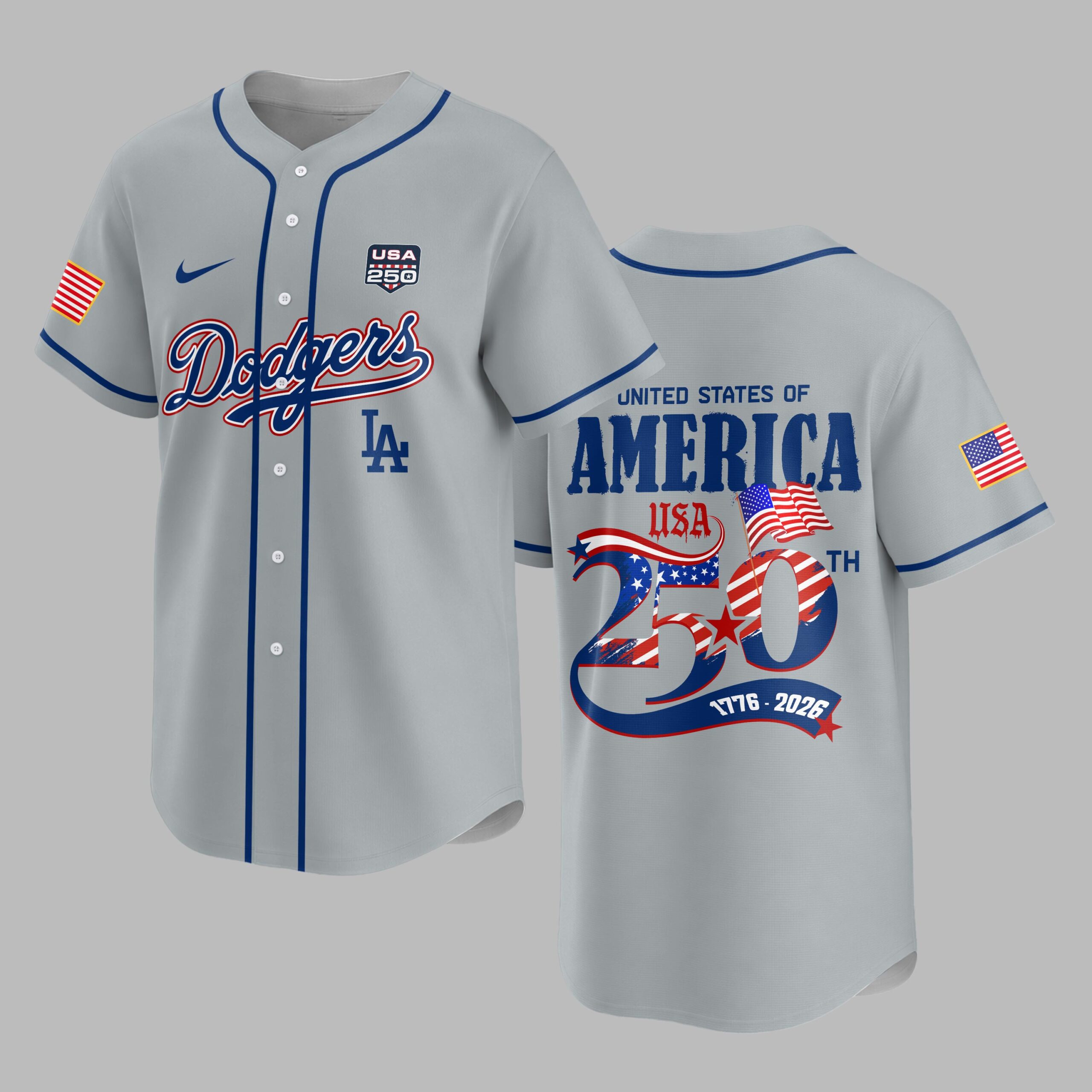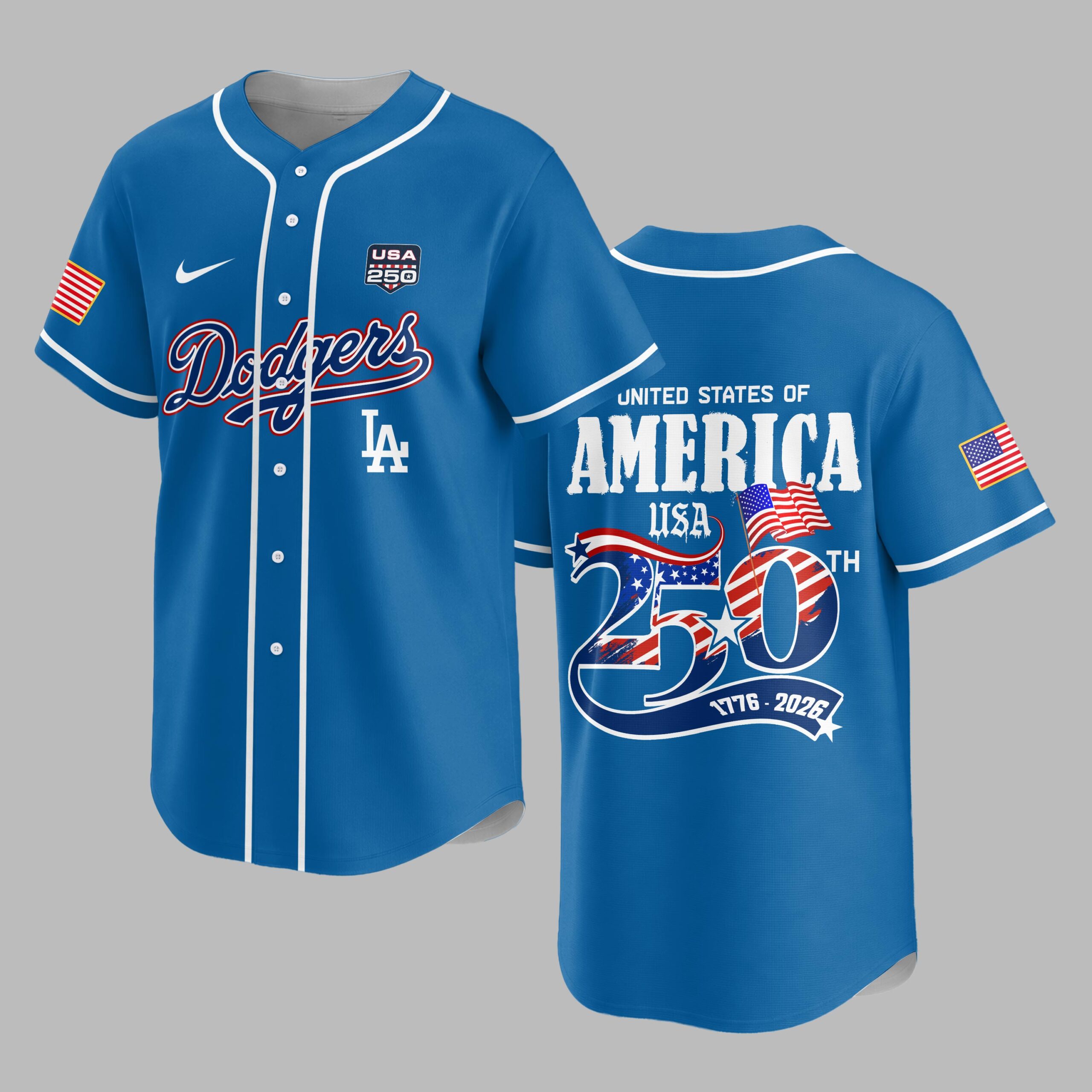 Show your unwavering Los Angeles Dodgers pride and deep American heritage with this special edition baseball jersey. Marking the USA’s 250th anniversary in 2026, this unique design perfectly blends your passion for the Boys in Blue with a powerful tribute to the United States and its rich history. The vibrant blue jersey proudly features the iconic Dodgers script and classic LA monogram on the front, with an American flag patch on the sleeve. The back unveils a striking patriotic display: UNITED STATES OF AMERICA above a dynamic USA 250TH graphic, intricately designed with waving flag patterns. A banner below highlights the 1776-2026 milestone. Perfect for cheering on the Dodgers, celebrating national holidays like the 4th of July, or simply showcasing your American spirit. Wear this commemorative jersey with pride to honor both your favorite team and your country.