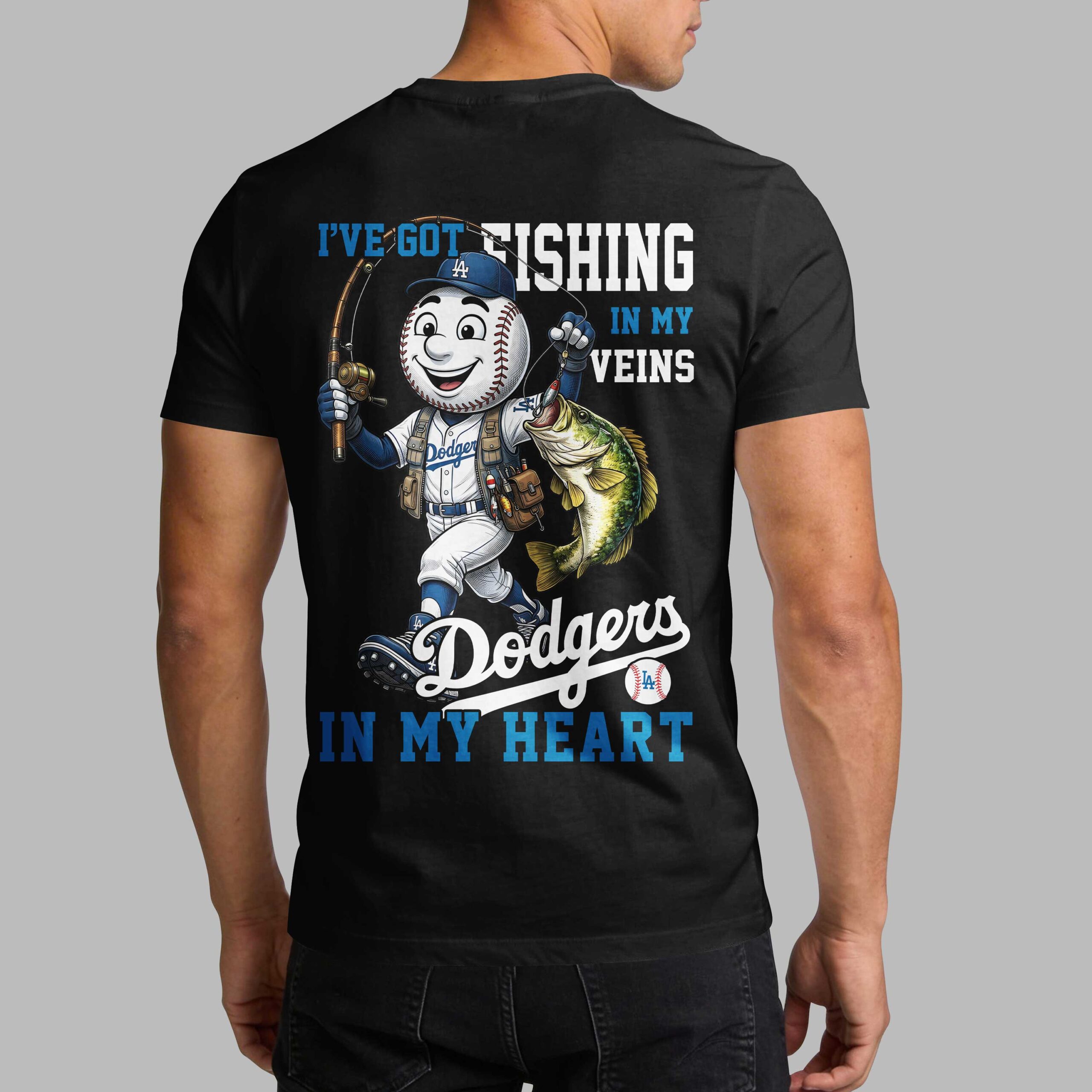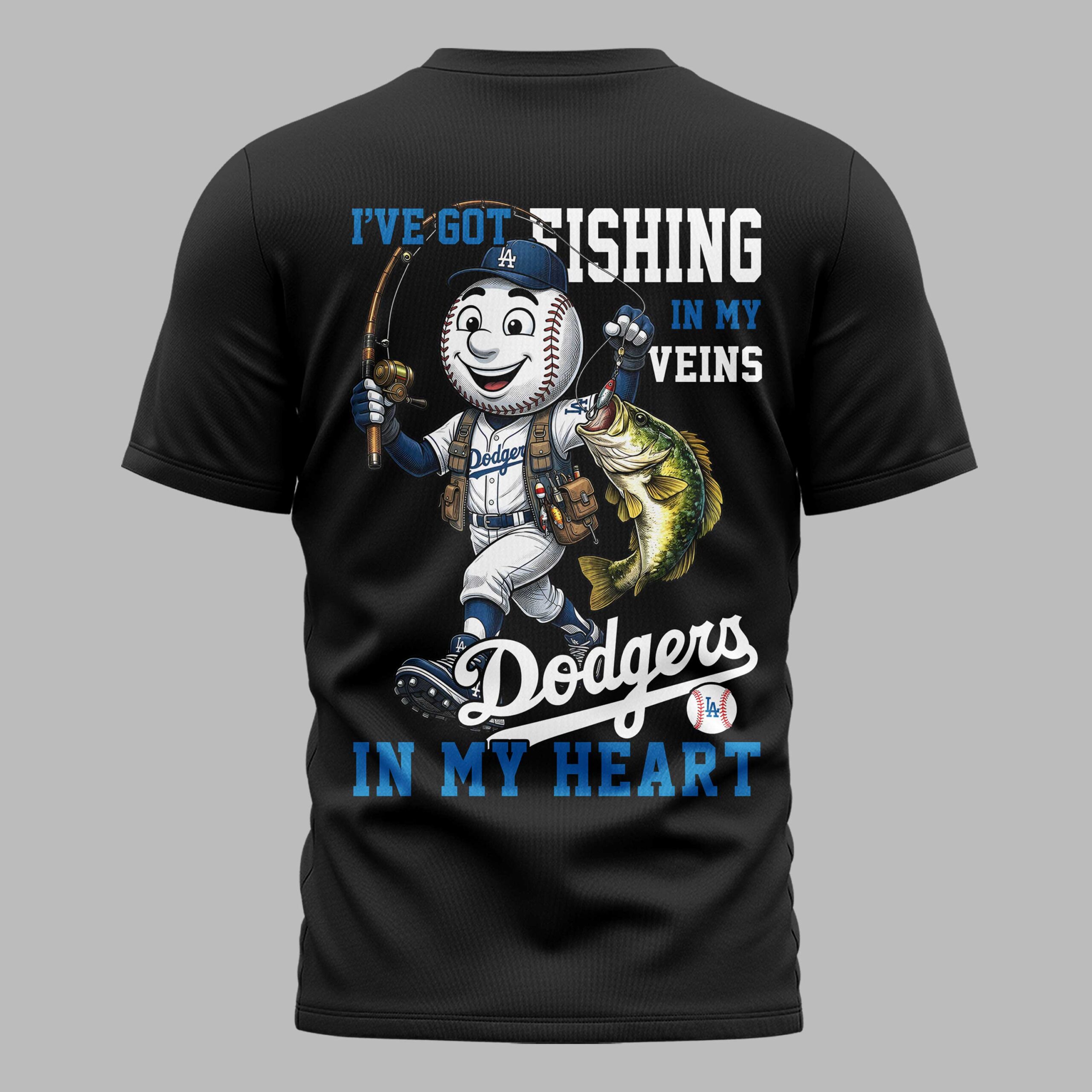 Show off your unique blend of passions with this spirited LA Dodgers fishing fan t-shirt! Perfect for the supporter who lives for both gameday excitement and peaceful days out on the water, this tee celebrates your love for the Dodgers and the thrill of fishing in one dynamic design. The front features the iconic LA Dodgers logo creatively integrated with baseball stitching that forms a fishing line and hook, capturing your dual interests. Turn around to reveal a playful baseball character, decked out in a Dodgers uniform and cap, proudly holding a fishing rod and a freshly caught bass. Bold text declares, I’VE GOT FISHING IN MY VEINS and Dodgers IN MY HEART, making your allegiances perfectly clear. Whether you’re heading to Dodger Stadium, casting a line at your favorite spot, or simply enjoying a casual day out, this shirt is the ultimate way to express your devotion. It’s ideal for weekend wear, fan gatherings, or as a fun conversation starter wherever you go.