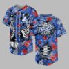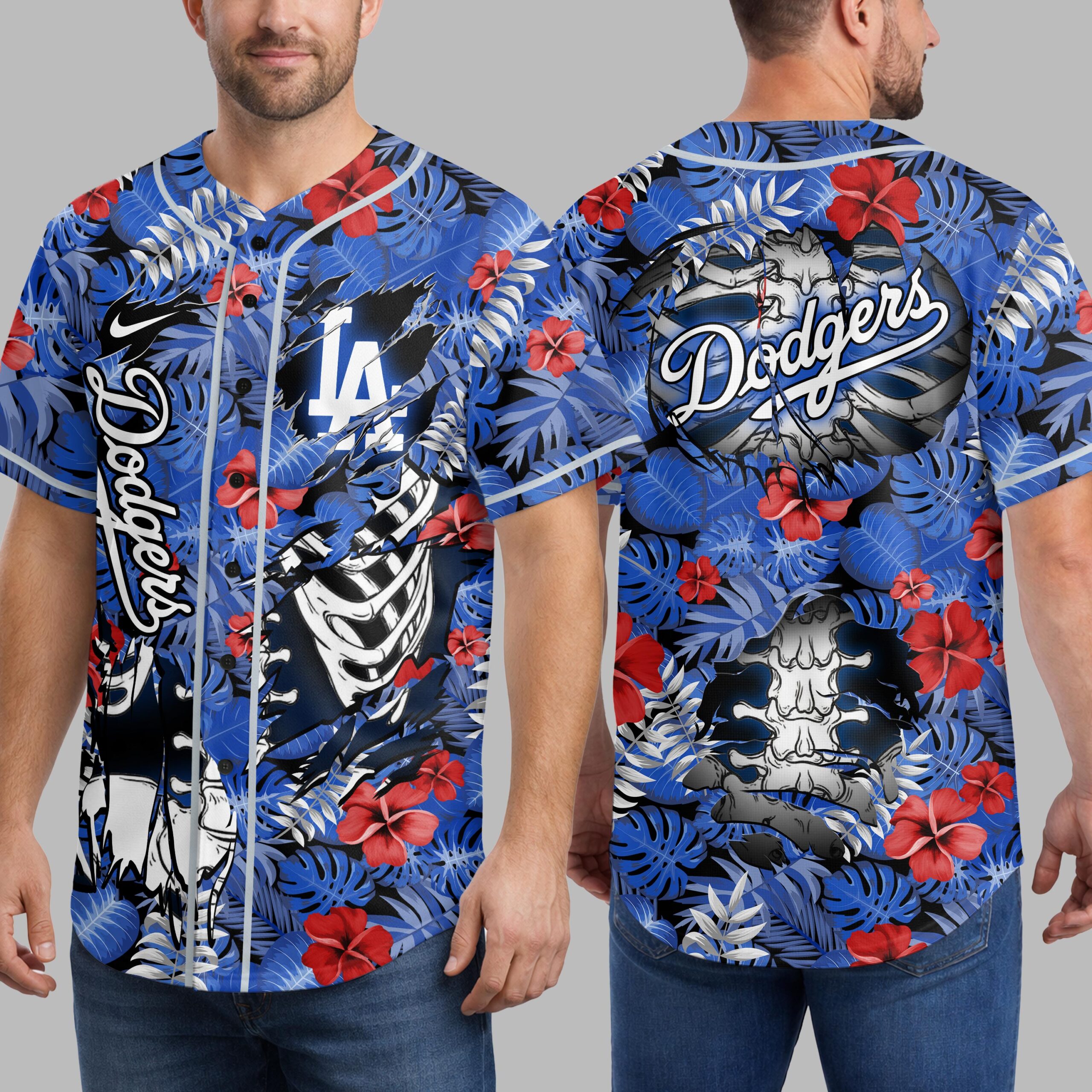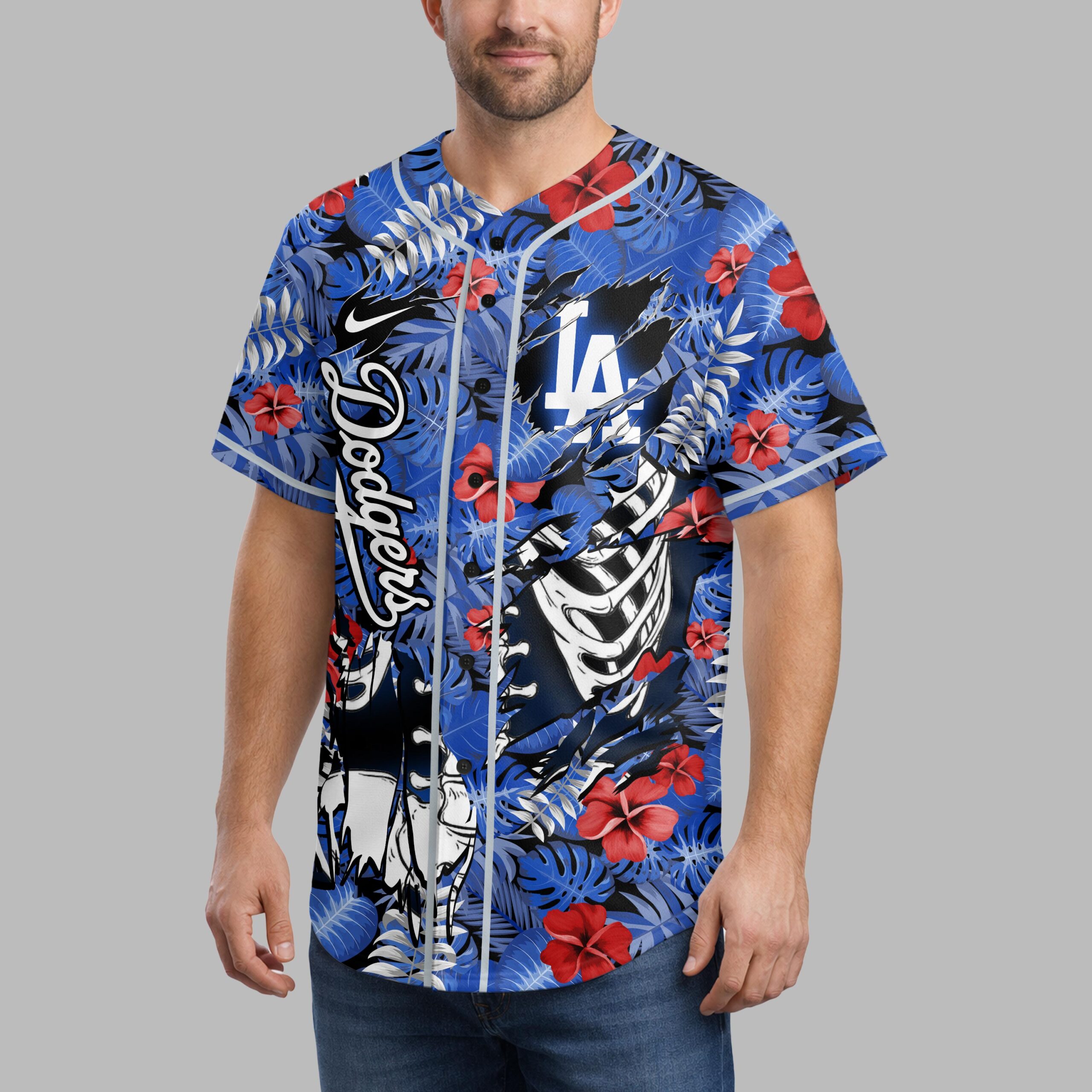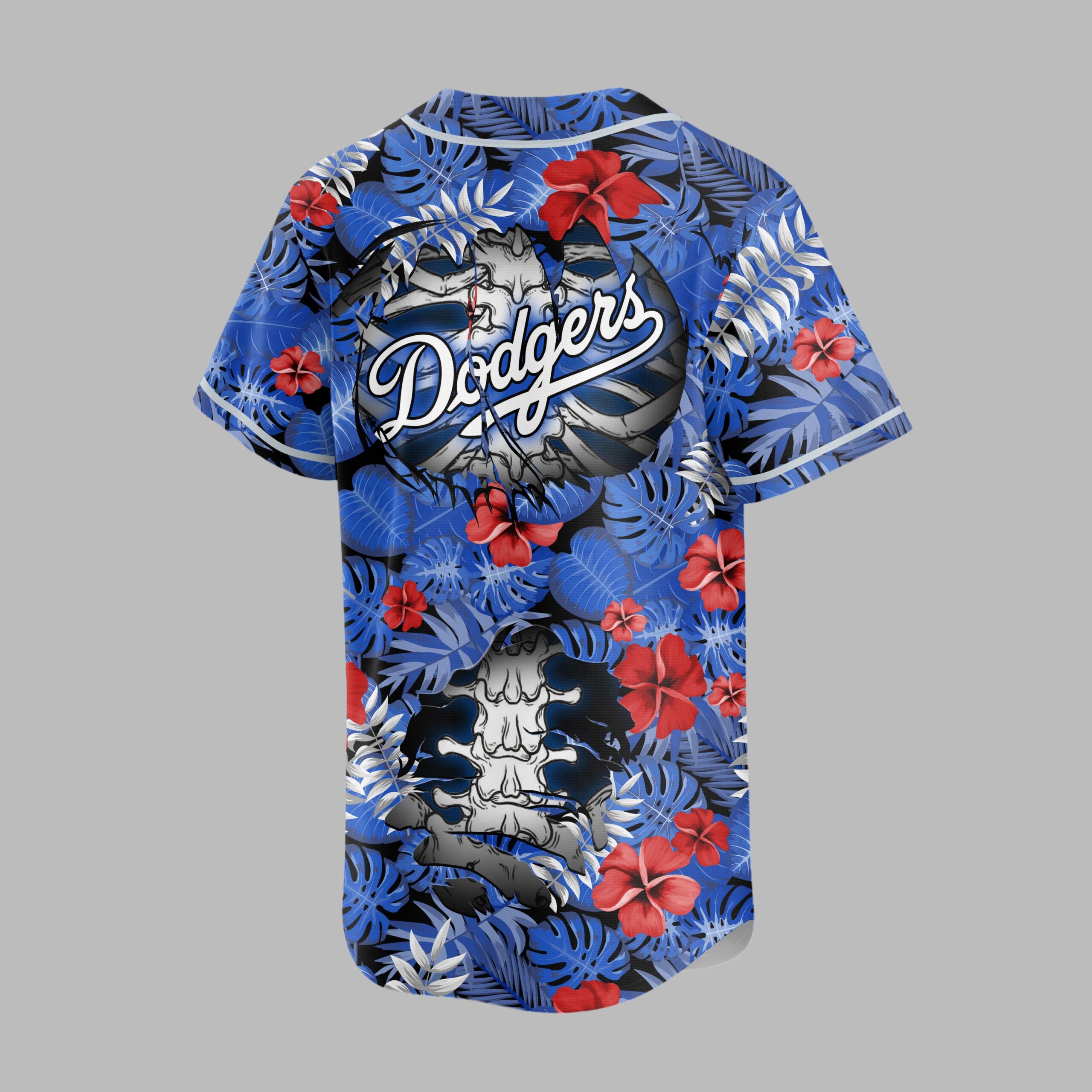 Show your unwavering support for the Los Angeles Dodgers with a shirt that’s anything but ordinary! This vibrant baseball jersey masterfully blends classic team pride with an unexpected, edgy tropical twist, perfect for fans who love to stand out. Embrace the unique fusion of your favorite team spirit and a cool, laid-back vibe. The front of this eye-catching design features the iconic LA logo alongside a vertical Dodgers script, all set against a rich blue backdrop of lush tropical leaves and bright red hibiscus flowers. A striking white skeleton rib cage subtly emerges from the pattern, adding a bold, distinctive statement. The back continues this dynamic theme, showcasing a prominent Dodgers wordmark positioned over a detailed skeleton skull and spine, all surrounded by the same intricate tropical foliage. This spirited jersey is perfect for game day at Dodger Stadium, a lively summer BBQ, or your next sun-soaked vacation. It’s more than just fan gear; it’s a statement piece for every devoted Dodgers supporter looking to celebrate their team with ultimate style and a touch of the extraordinary.