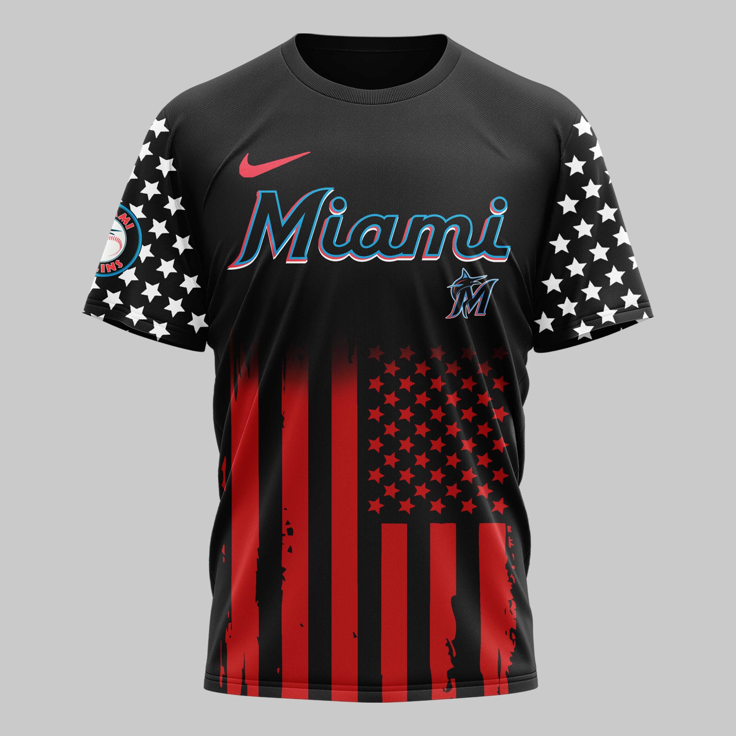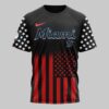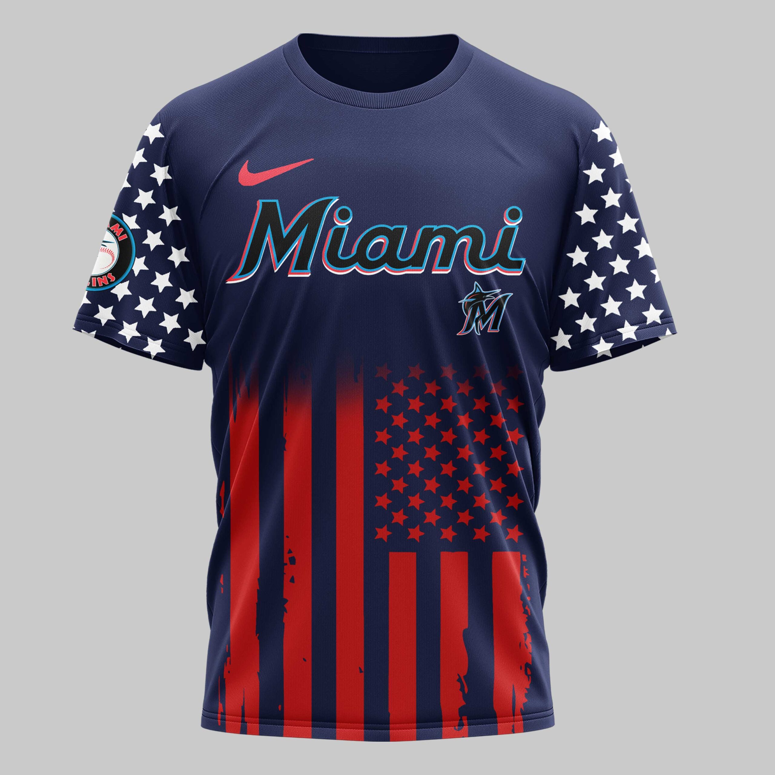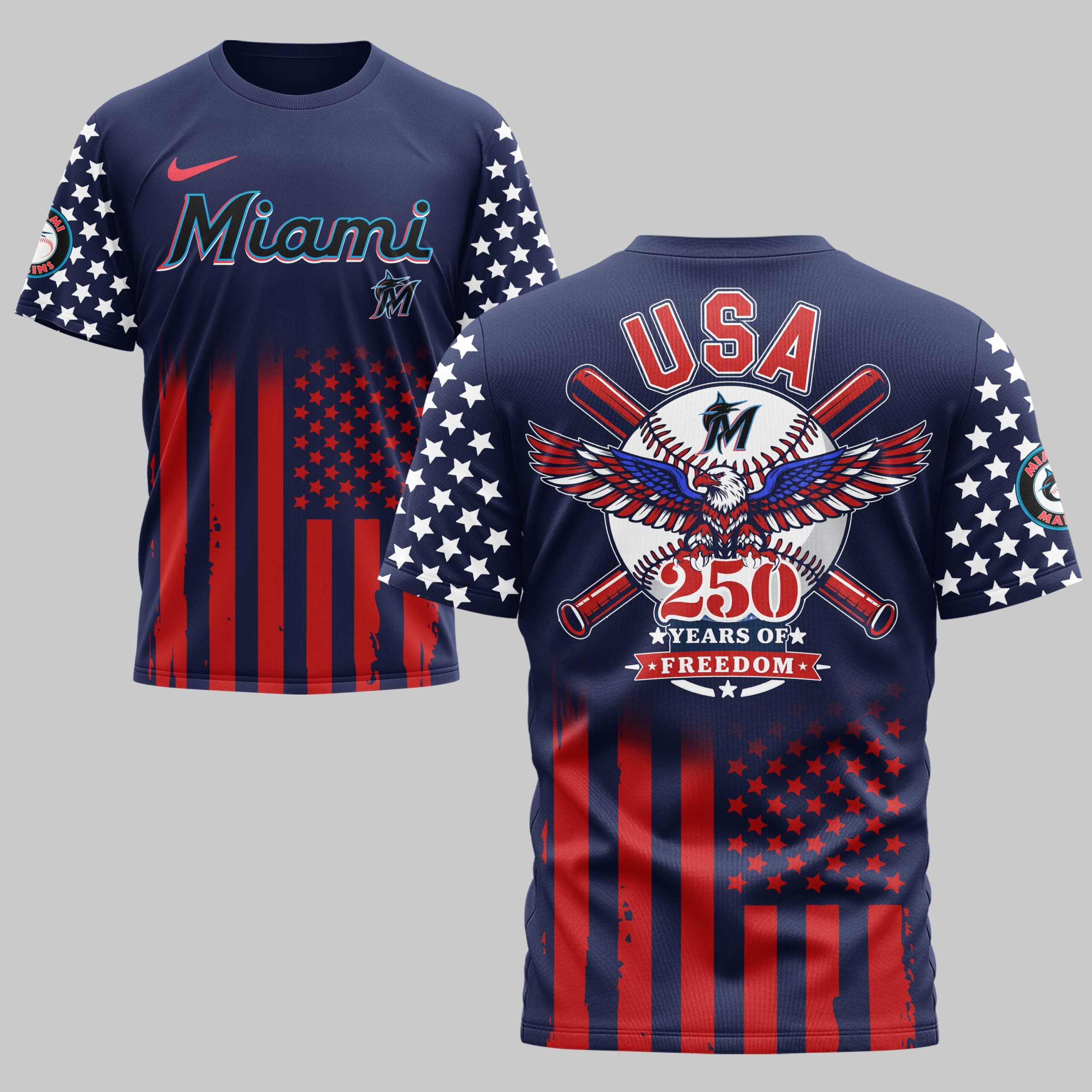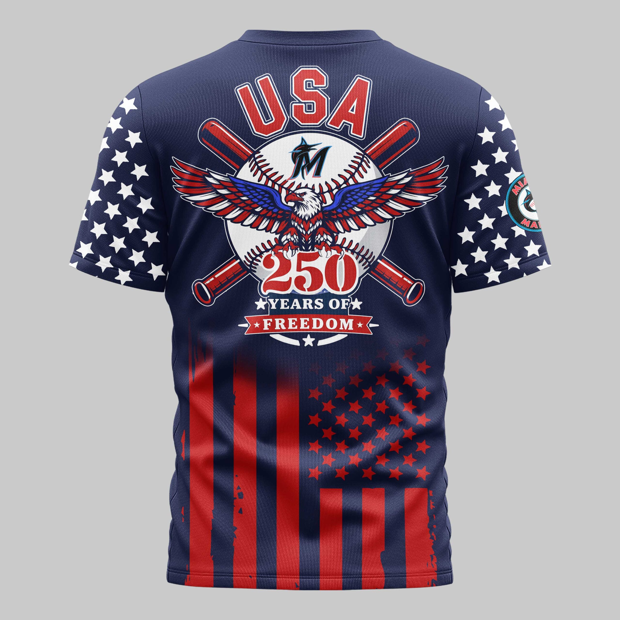 Show off your dual passion for the Miami Marlins and the red, white, and blue with this striking fan T-shirt. Designed for the most dedicated supporters, this piece celebrates America’s 250th anniversary of freedom while keeping your team loyalty front and center. It’s a bold statement of pride that blends baseball tradition with a powerful patriotic spirit. The front features the iconic Miami wordmark and Marlins logo set against a dynamic, distressed American flag motif that flows into a star-patterned sleeve design. On the back, an impressive graphic takes center stage, showcasing a majestic bald eagle over a baseball and crossed bats, framed by USA lettering and the commemorative 250 Years of Freedom banner. Whether you’re heading to the ballpark, hosting an Independence Day cookout, or just showing your colors around town, this shirt is the perfect choice. It’s built for game days and celebrations alike, ensuring you stand out as a true fan.