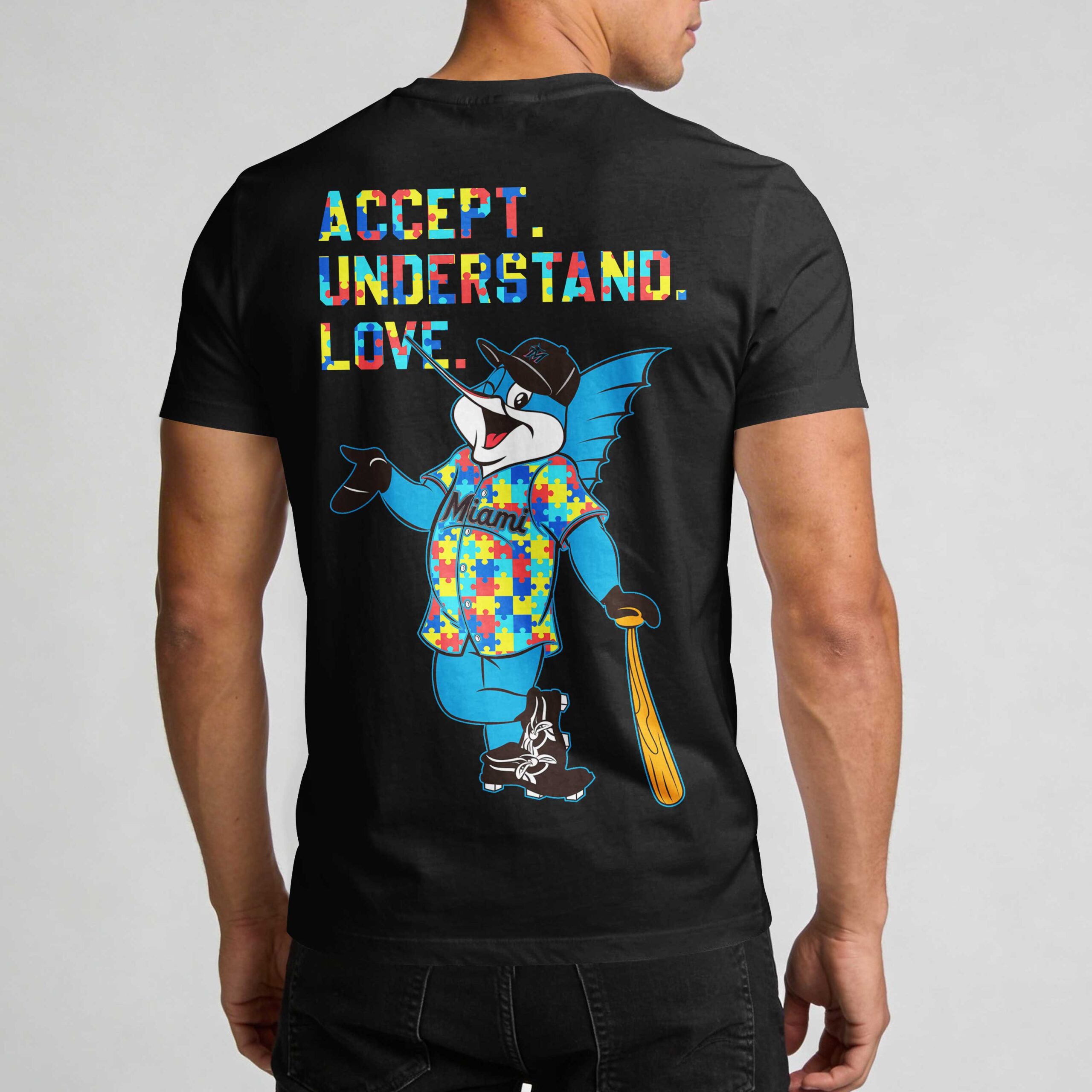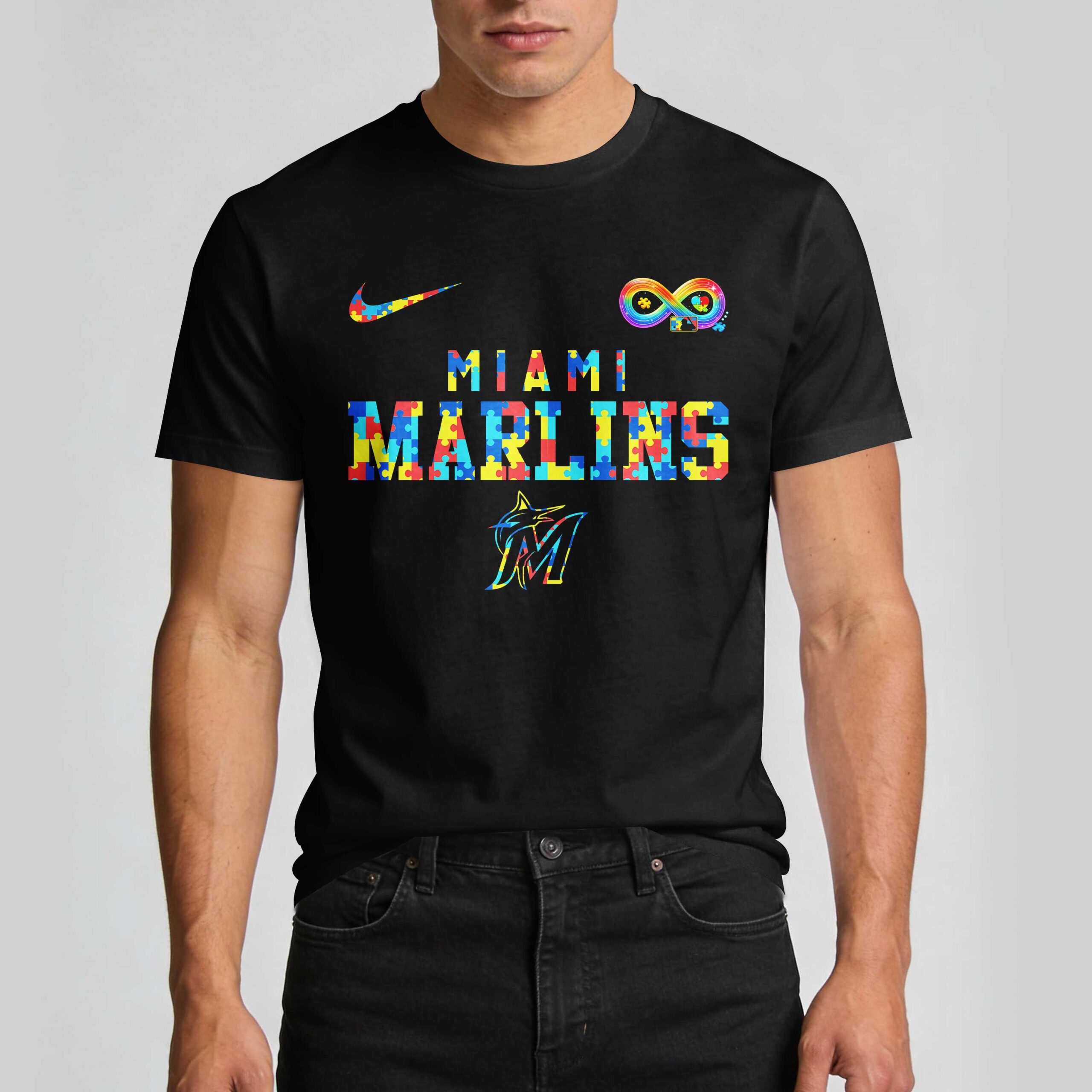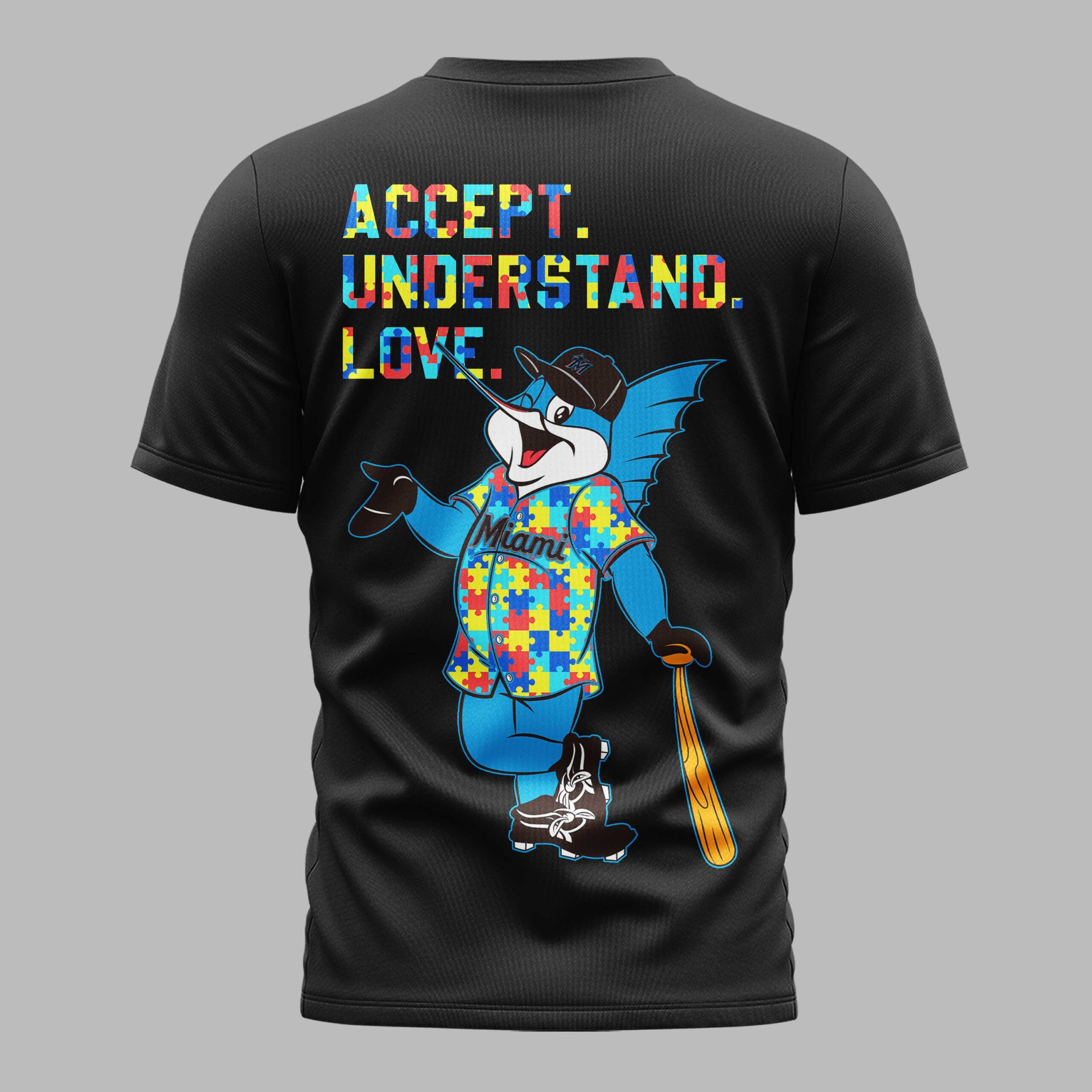 Champion your Miami Marlins and support a vital cause with this inspiring fan tee. This design seamlessly blends team pride with a powerful commitment to Autism awareness. Celebrate baseball spirit and community, proudly advocating for acceptance and understanding. The front features MIAMI MARLINS in vibrant, puzzle-piece patterned letters, matched by a colorful Nike swoosh and an infinity symbol representing neurodiversity. The classic Marlins M logo completes the design. On the back, ACCEPT. UNDERSTAND. LOVE. shines in the same puzzle-piece style, beneath a friendly marlin mascot sporting a puzzle-piece shirt and a bat. Ideal for game days, awareness events, or daily wear, this shirt makes a strong statement. It’s perfect for showcasing your Marlins pride and dedication to a cause close to your heart. Express your values in style, on and off the field.
