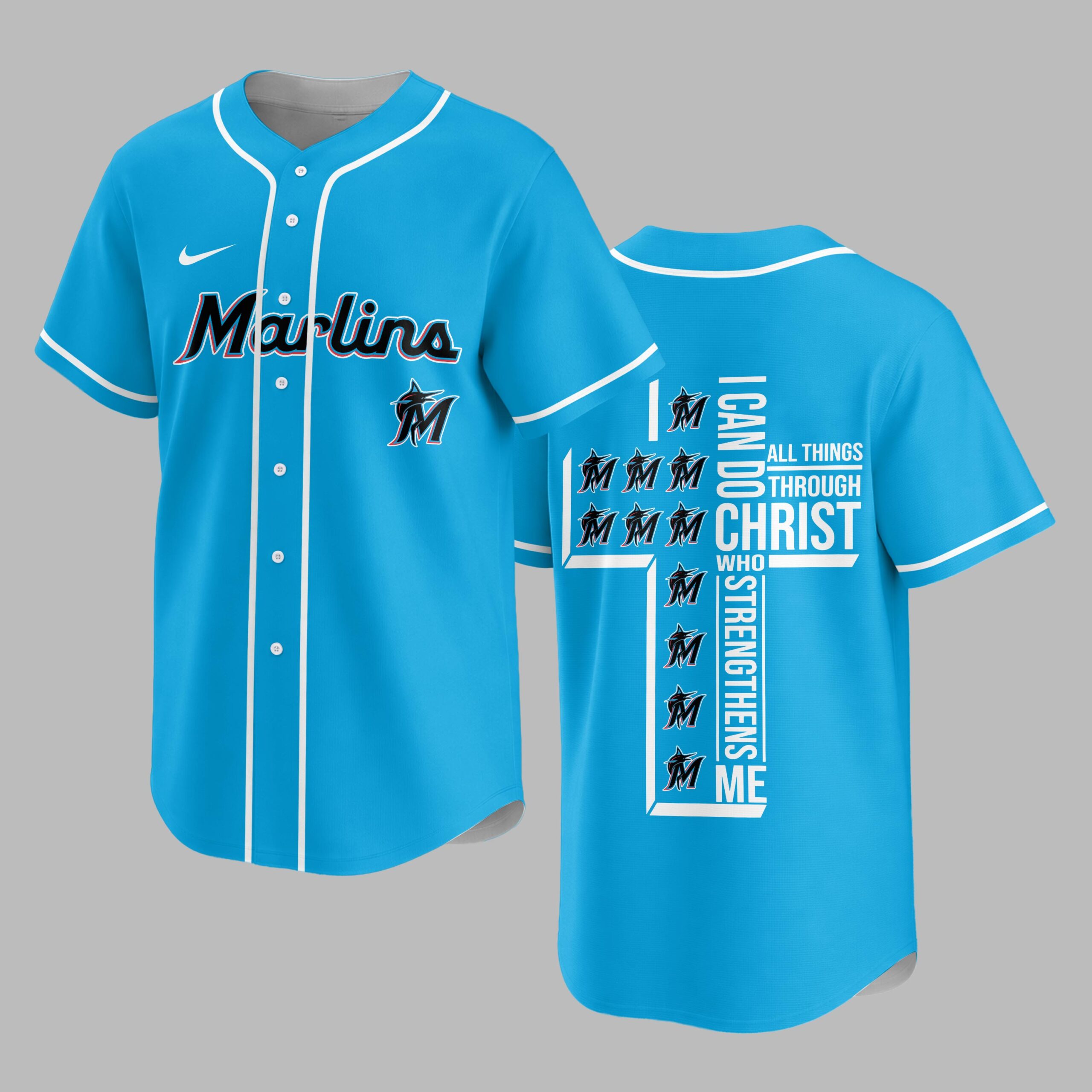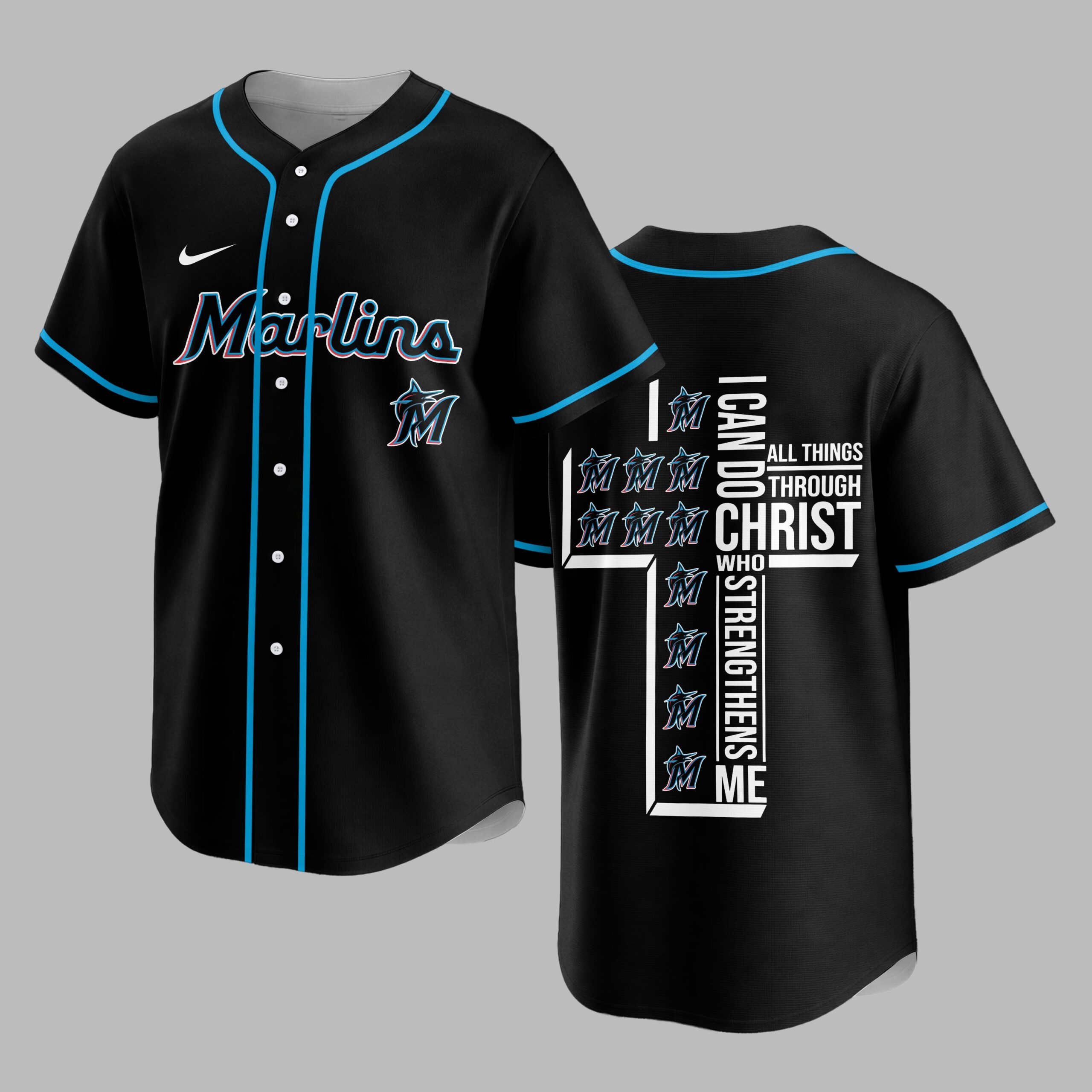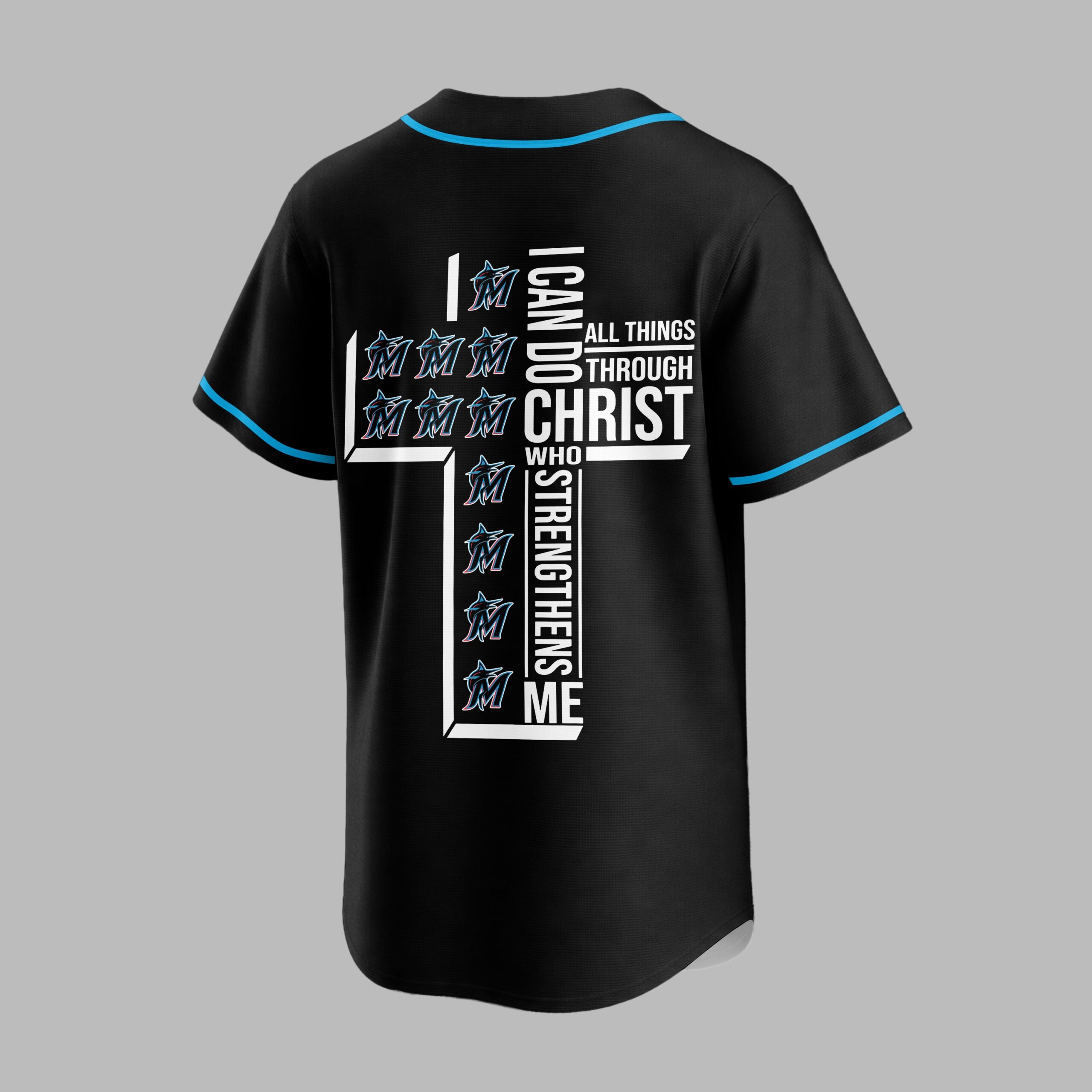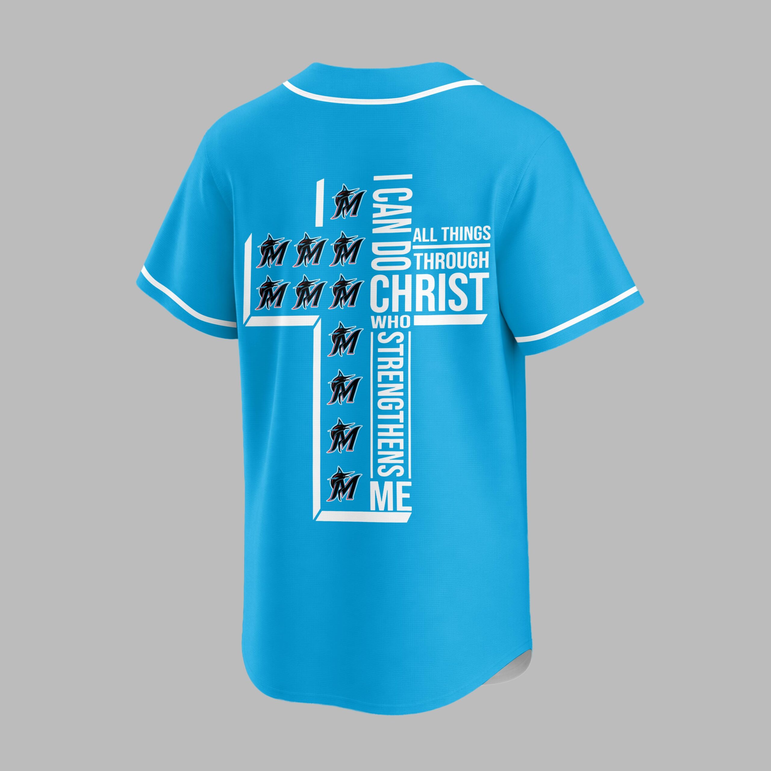 Show your unwavering support for the Marlins and wear your faith with pride in this unique baseball jersey. For fans who embody both team spirit and strong beliefs, it blends game day excitement with a powerful message of strength. The front prominently features the iconic ‘Marlins’ script and dynamic ‘M’ marlin logo, all accented with sleek light blue piping. The back showcases a truly inspiring design: a bold cross formed by the powerful scripture ‘I CAN DO ALL THINGS THROUGH CHRIST WHO STRENGTHENS ME,’ cleverly integrated with repeating Marlins ‘M’ logos. Perfect for cheering on your team at the ballpark, watch parties, or as an everyday statement of devotion. This jersey expresses your love for baseball and spiritual strength, a meaningful addition to any fan’s wardrobe.