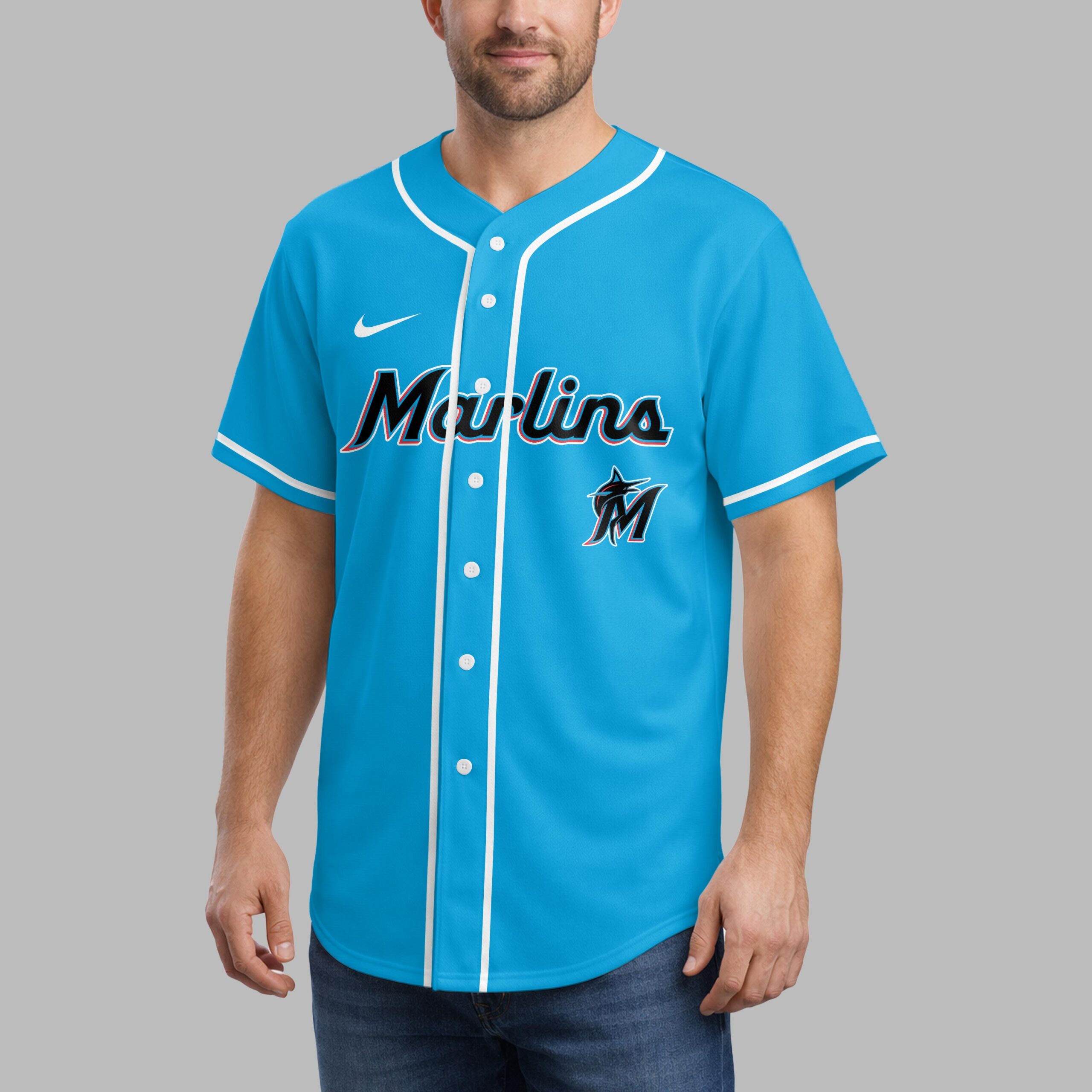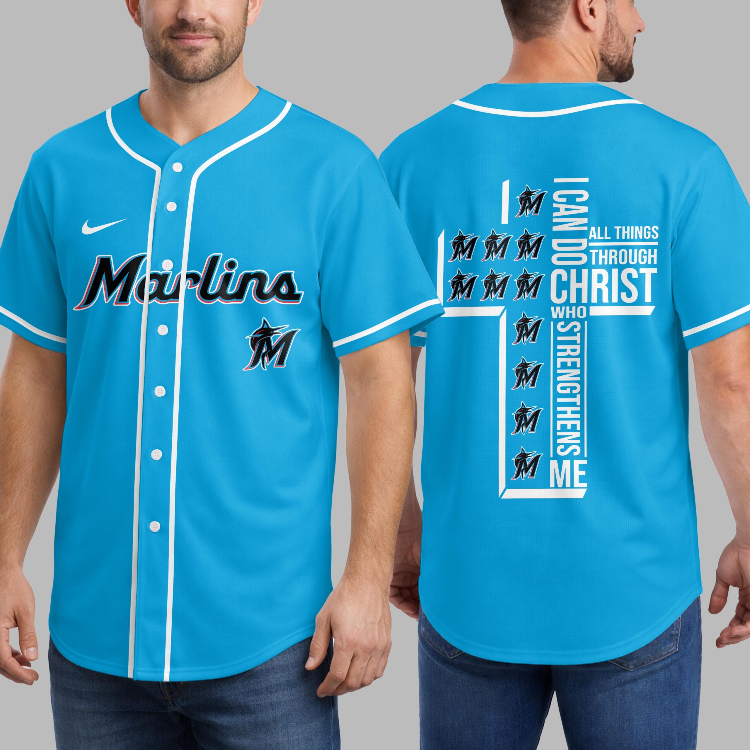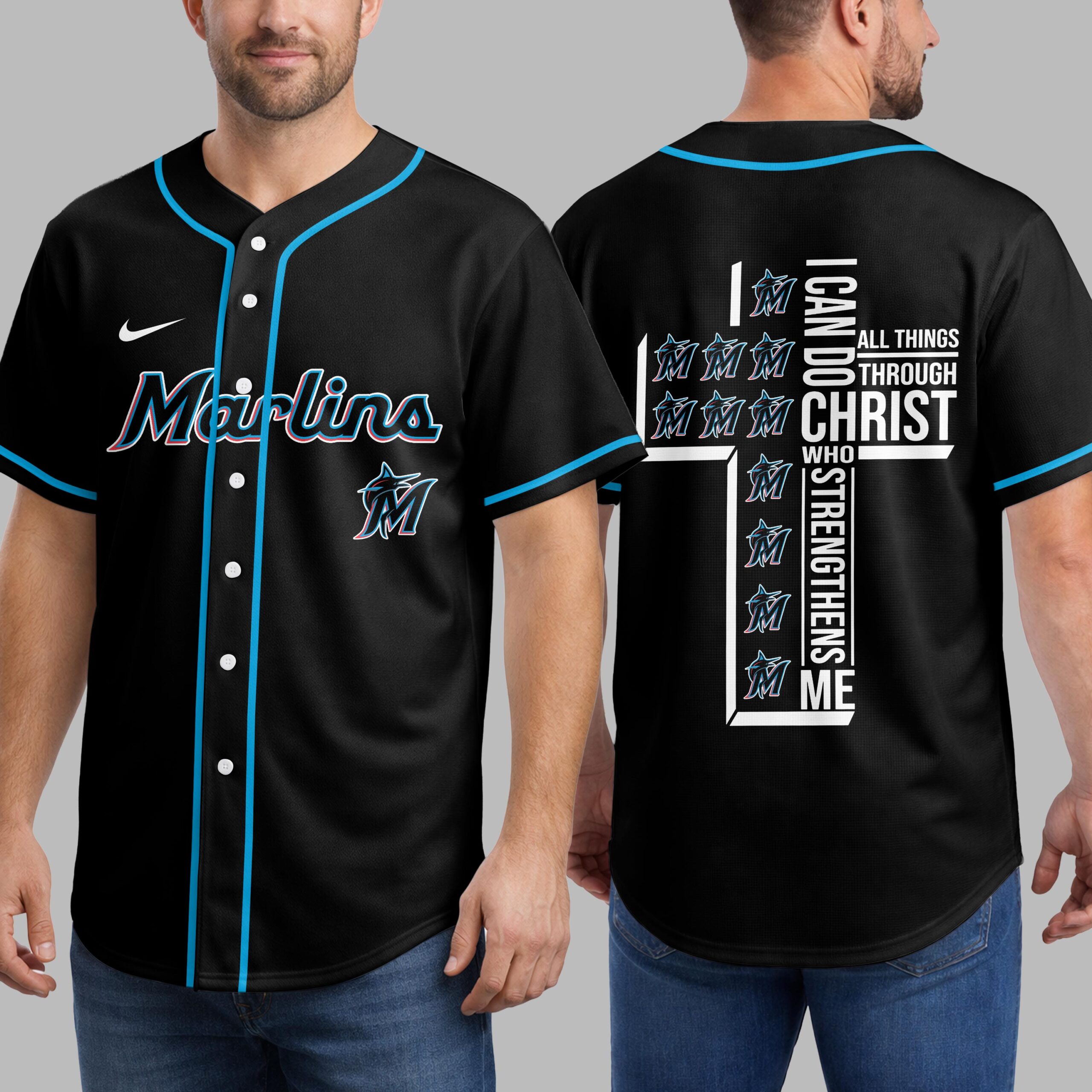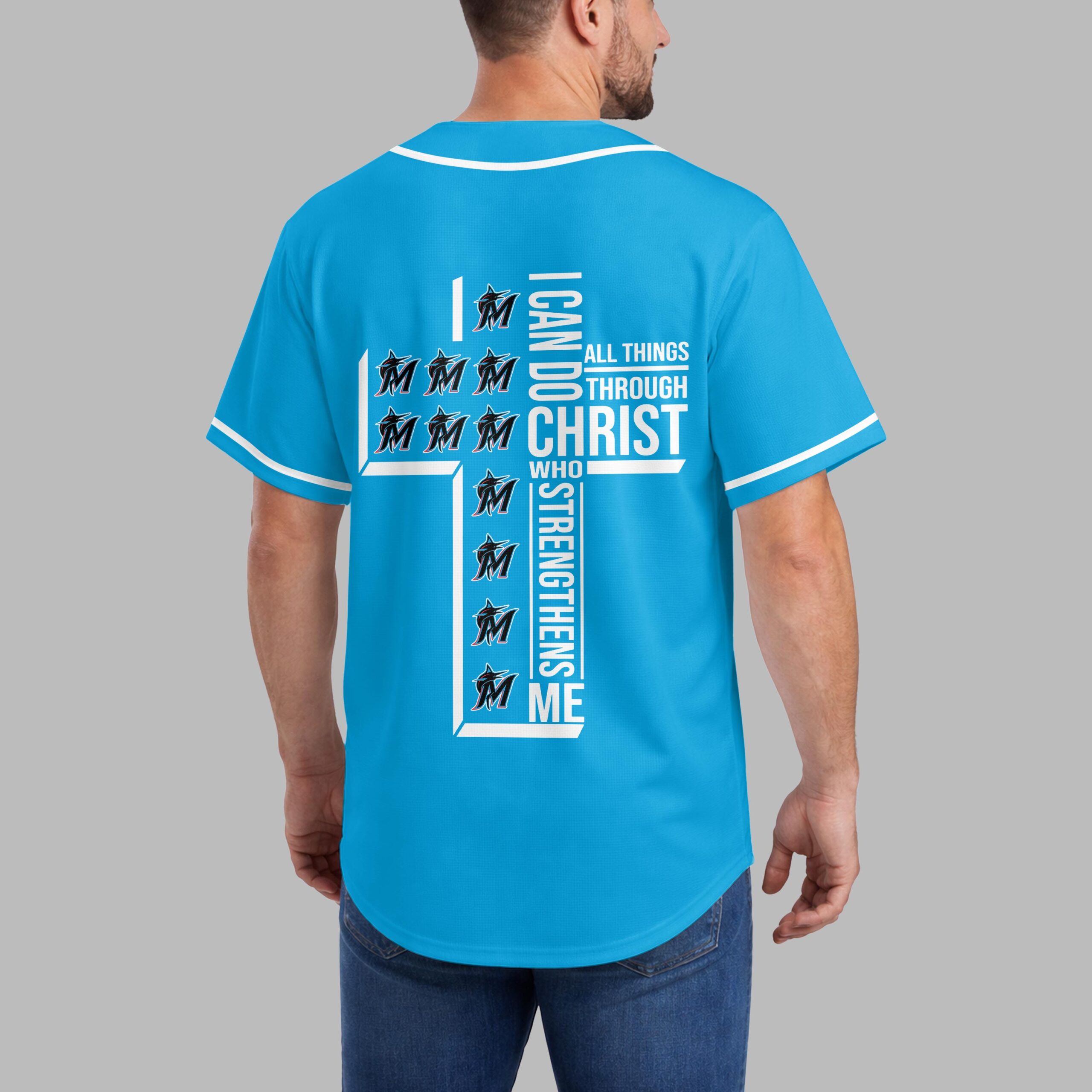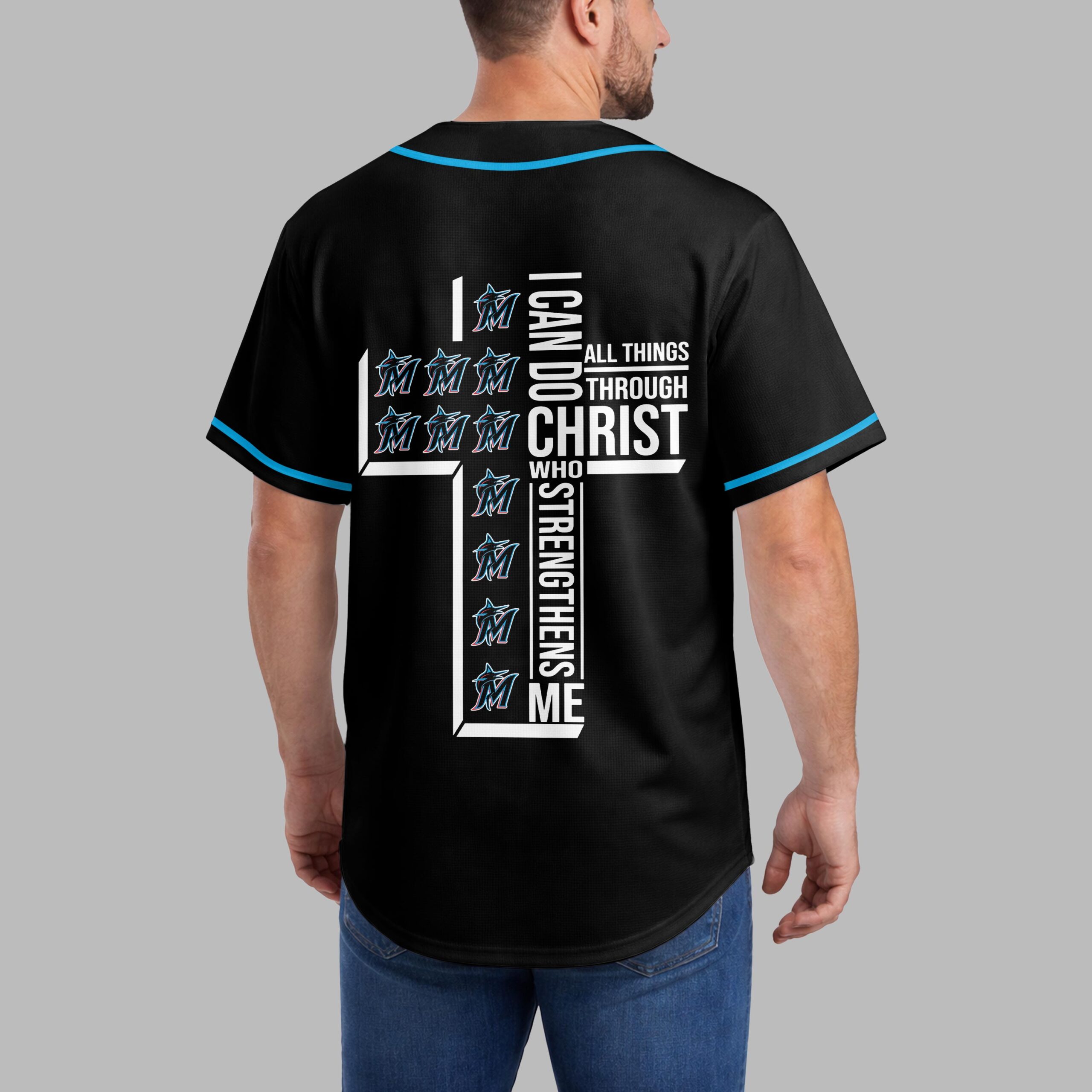 Show your unwavering support for the Marlins and wear your faith with pride in this unique baseball jersey. For fans who embody both team spirit and strong beliefs, it blends game day excitement with a powerful message of strength. The front prominently features the iconic ‘Marlins’ script and dynamic ‘M’ marlin logo, all accented with sleek light blue piping. The back showcases a truly inspiring design: a bold cross formed by the powerful scripture ‘I CAN DO ALL THINGS THROUGH CHRIST WHO STRENGTHENS ME,’ cleverly integrated with repeating Marlins ‘M’ logos. Perfect for cheering on your team at the ballpark, watch parties, or as an everyday statement of devotion. This jersey expresses your love for baseball and spiritual strength, a meaningful addition to any fan’s wardrobe.