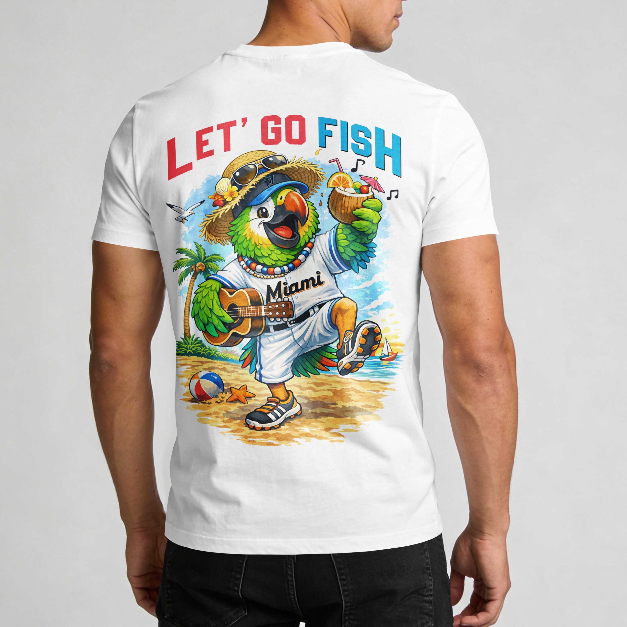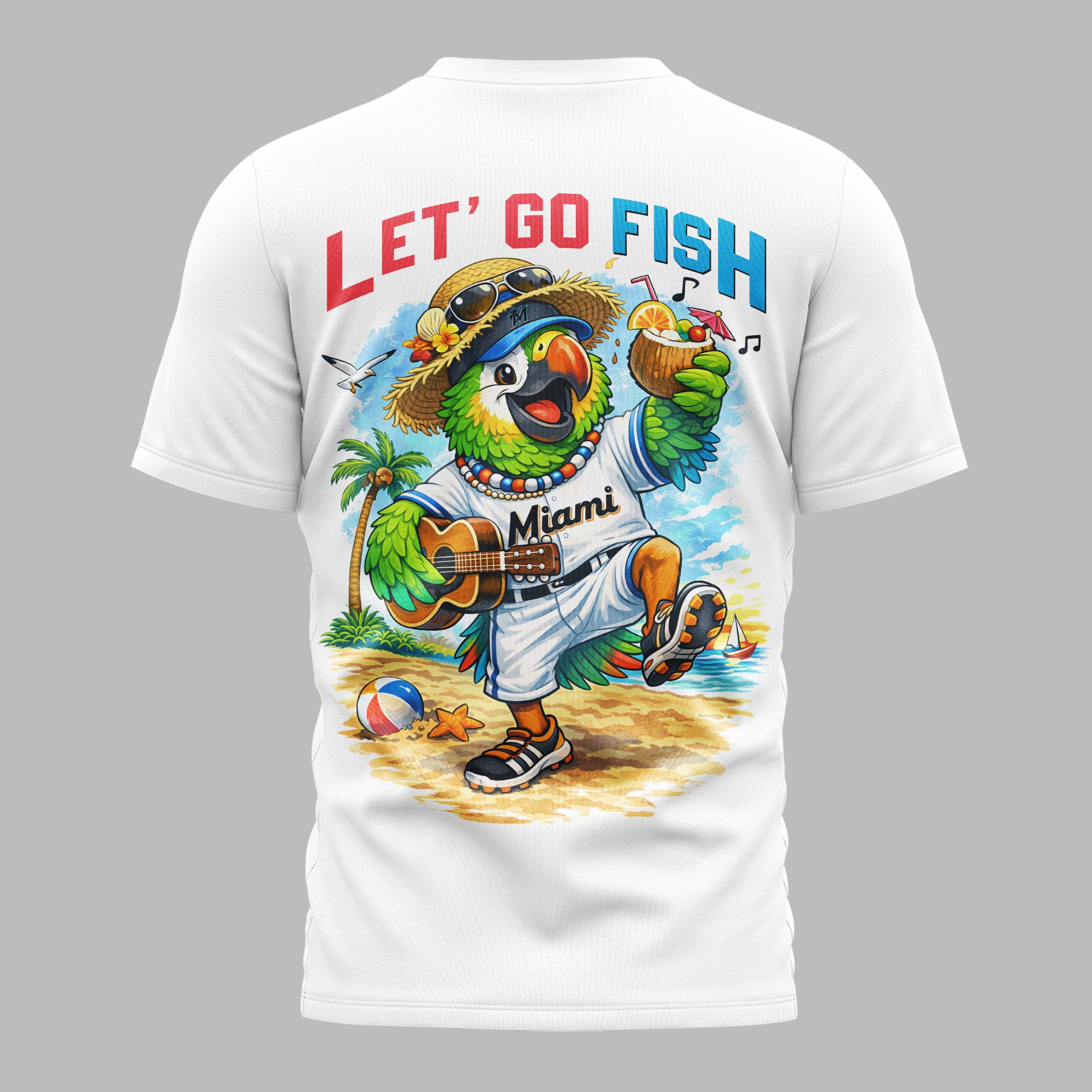 Show off your Miami Marlins pride with a design that captures the energetic spirit of the 305. This shirt celebrates your team loyalty with a vibrant, festive theme that is perfect for any dedicated fan looking to stand out. It blends the excitement of professional baseball with a celebratory atmosphere, making it a must-have for your summer rotation. The front features bold MIAMI MARLINS lettering paired with a tropical circular crest. On the back, the design truly comes to life with a colorful parrot mascot dressed in full team gear, strumming a ukulele on a sunny beach. Accompanied by the phrase LET’ GO FISH, the graphic includes fun details like a straw hat, a coconut drink, and a tropical seaside backdrop that perfectly represents the Miami lifestyle. Wear this to the ballpark for a home game, to an Independence Day celebration, or during any casual outing where you want to represent your team with style. It’s the ultimate choice for every Marlins fan.