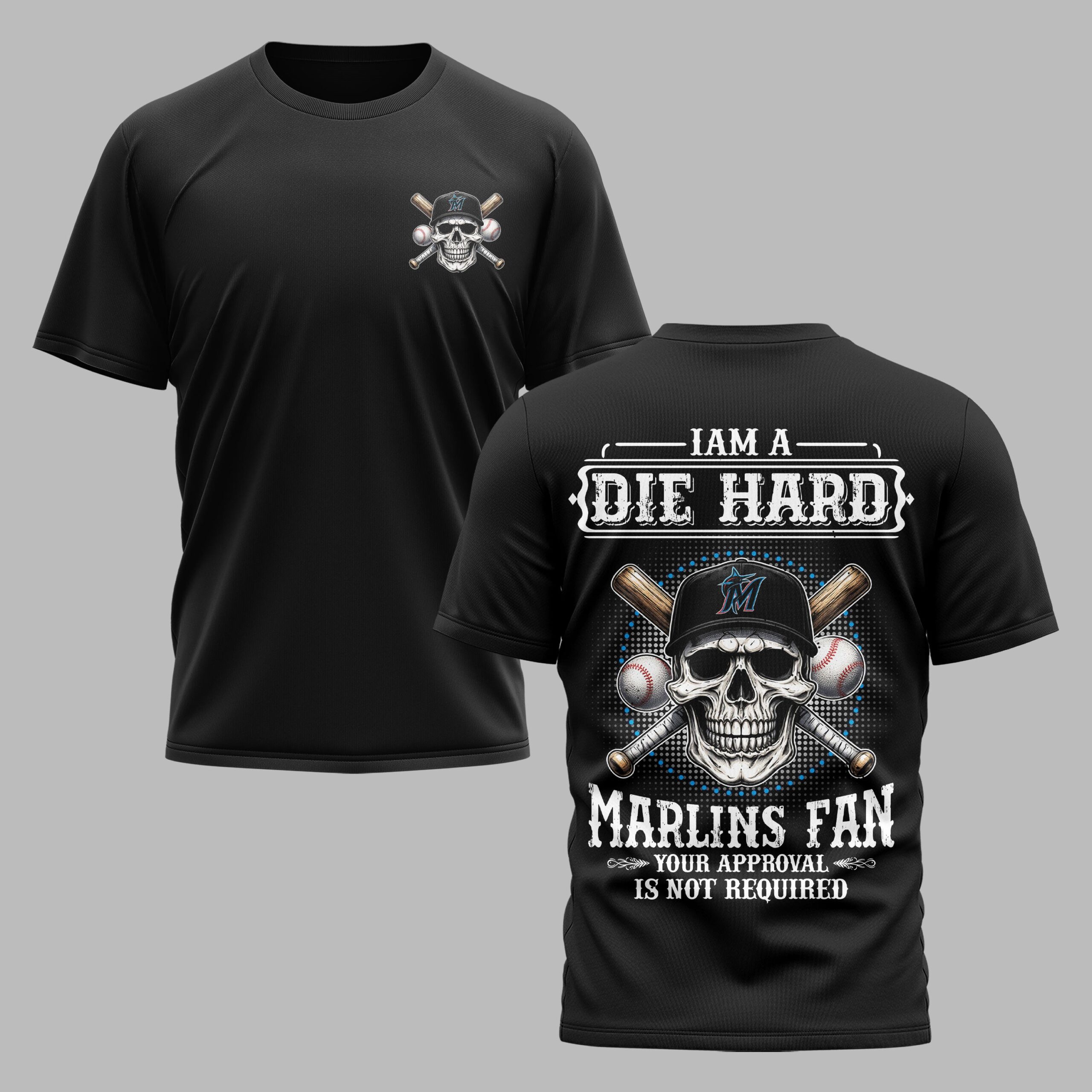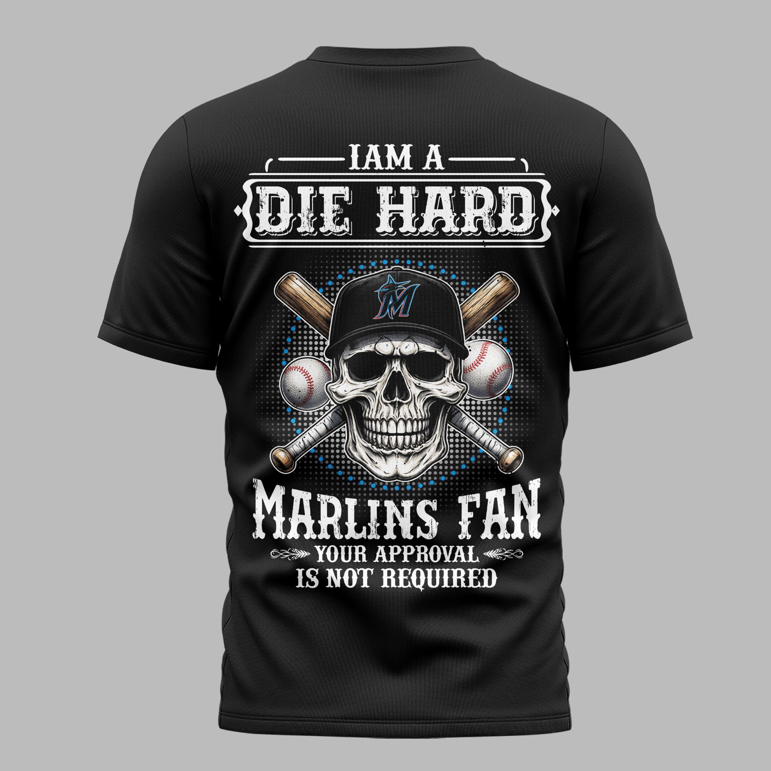 Declare your unwavering allegiance to the Miami Marlins with this powerful and edgy baseball fan tee. Designed for those who live and breathe the game, this shirt makes a bold statement about where your loyalty truly lies. The front boasts a fierce skull wearing a Marlins cap, crossed bats, and baseballs. The back amplifies this with a larger graphic, emphatically declaring I AM A {DIE HARD} MARLINS FAN and the defiant YOUR APPROVAL IS NOT REQUIRED, all set against a cool, dotted background. Perfect for cheering from the stands, hosting a game day party, or simply showing off your team pride. This tee is your ultimate gear for any true Marlins fan ready to boldly represent their team, anytime, anywhere.