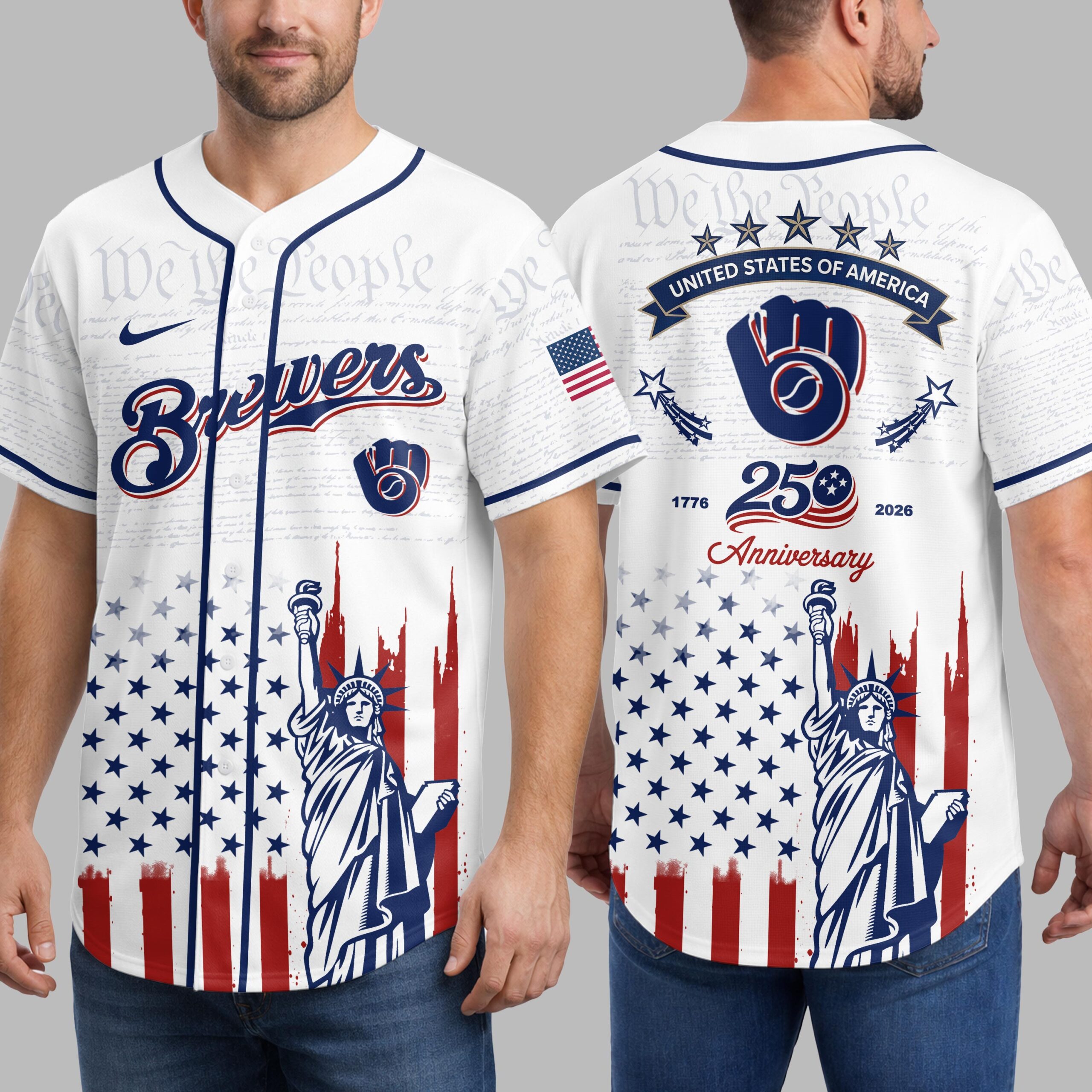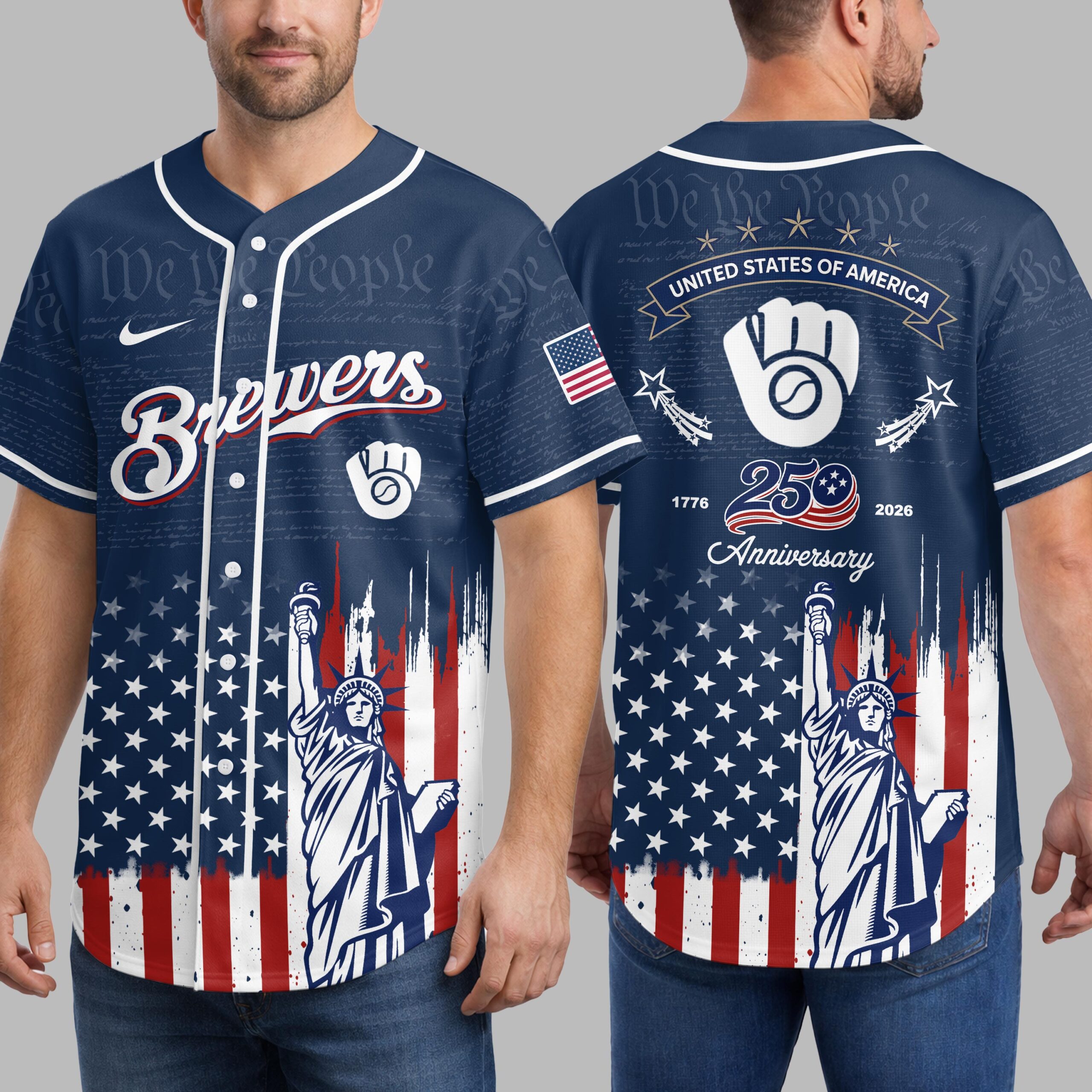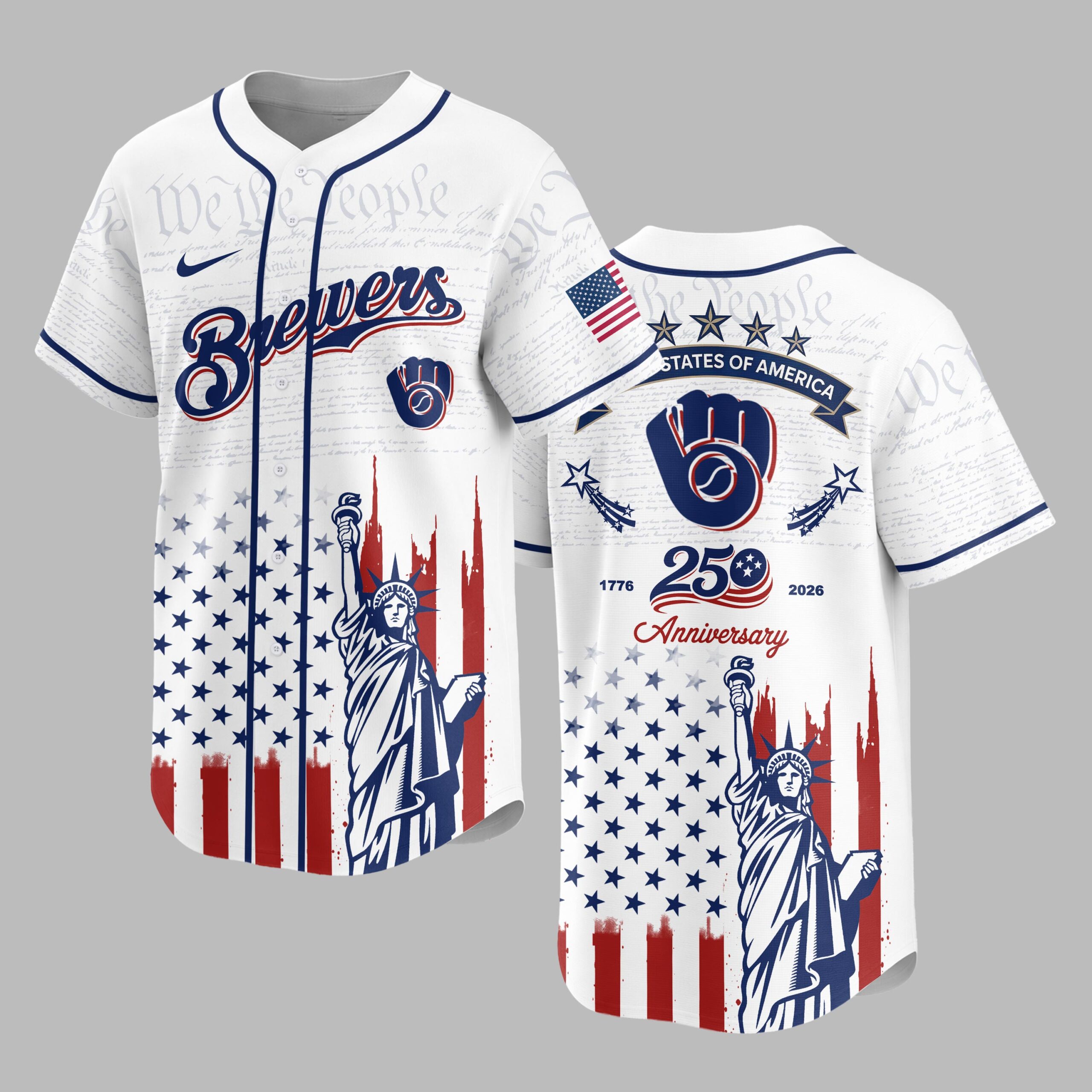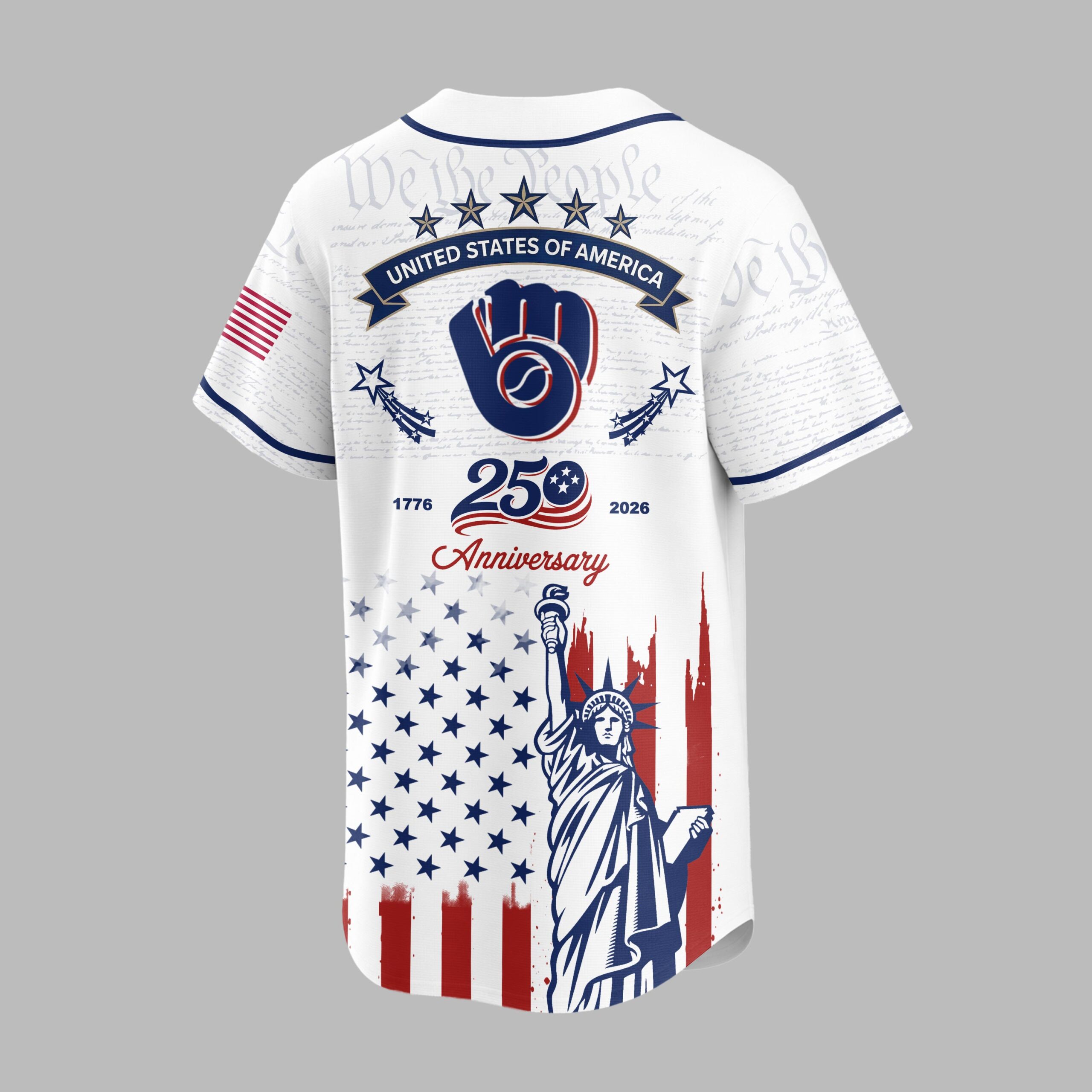 Unite your passion for baseball and country with this Milwaukee Brewers Patriotic 250th Anniversary Baseball Jersey! This unique design proudly blends your devotion to the Brewers with a vibrant celebration of American heritage. It’s the ultimate fan gear for showcasing both team spirit and national pride. The front features the classic Brewers script and Ball and Glove logo, subtly laid over We the People text. Below, a distressed American flag design flows into the Statue of Liberty. The back adds STATES OF AMERICA, shooting stars, and a 1776 250 Anniversary 2026 graphic, completing this powerful patriotic display. Ideal for gamedays, Fourth of July events, or anytime you want to display American and Brewers pride. This jersey lets you wear your passion and patriotism.