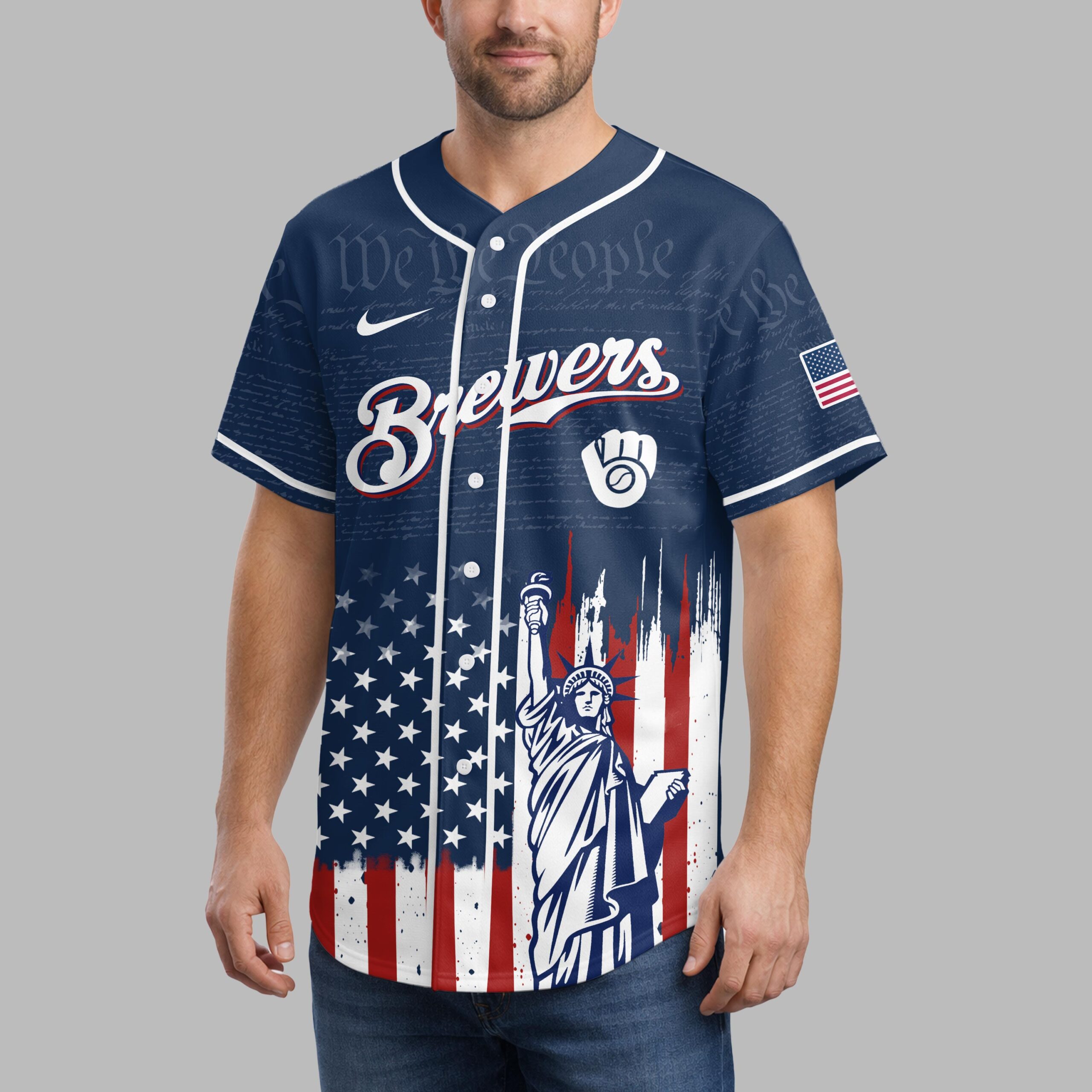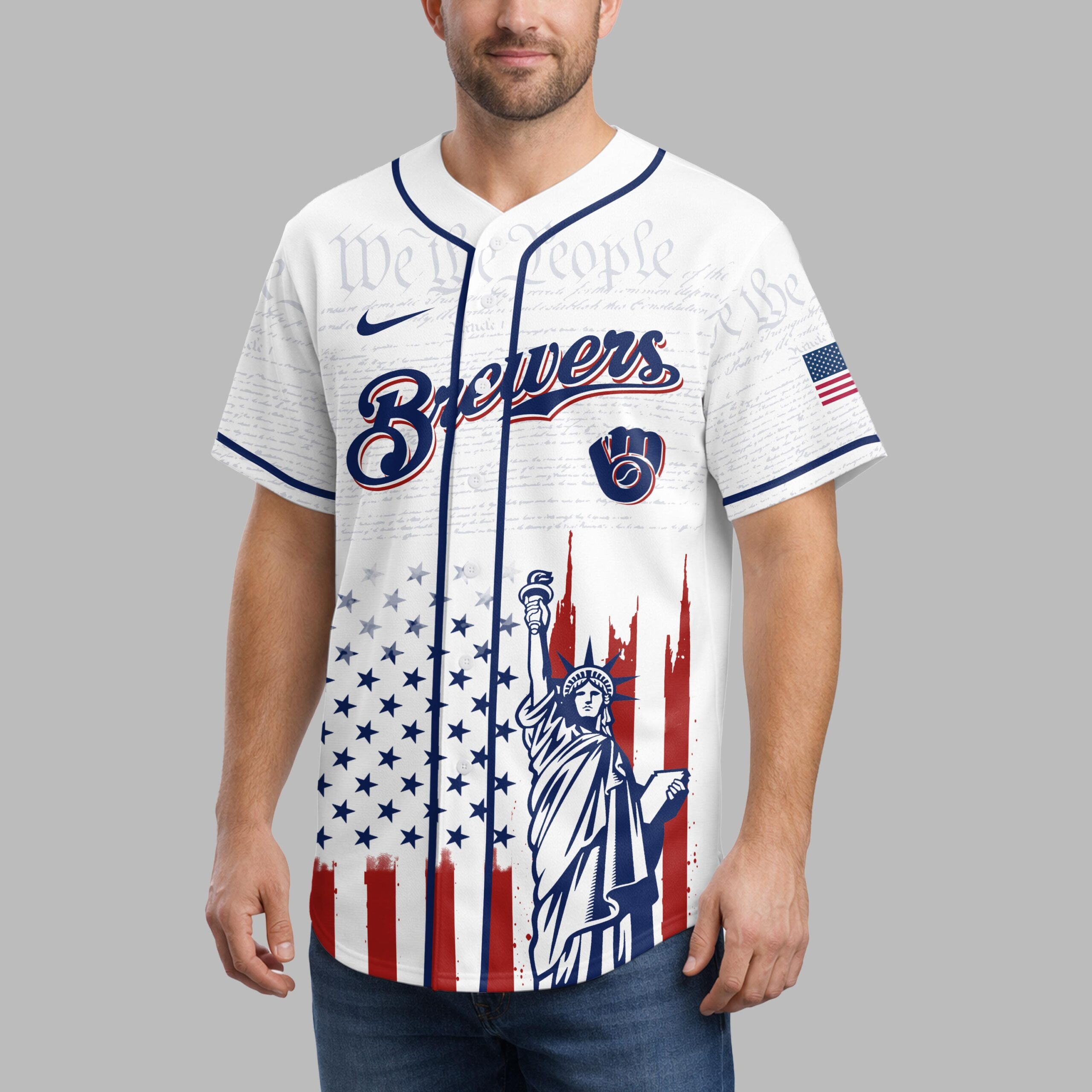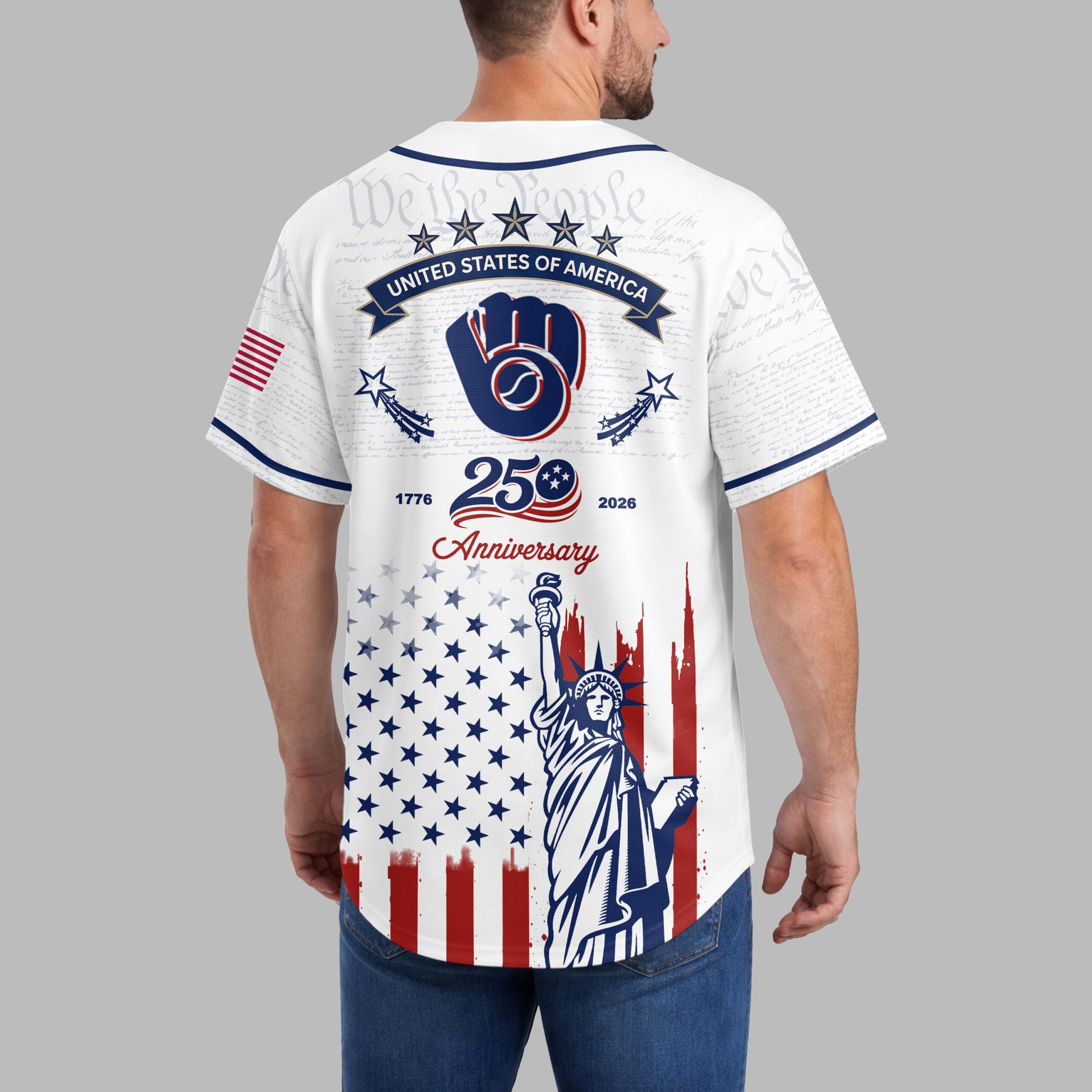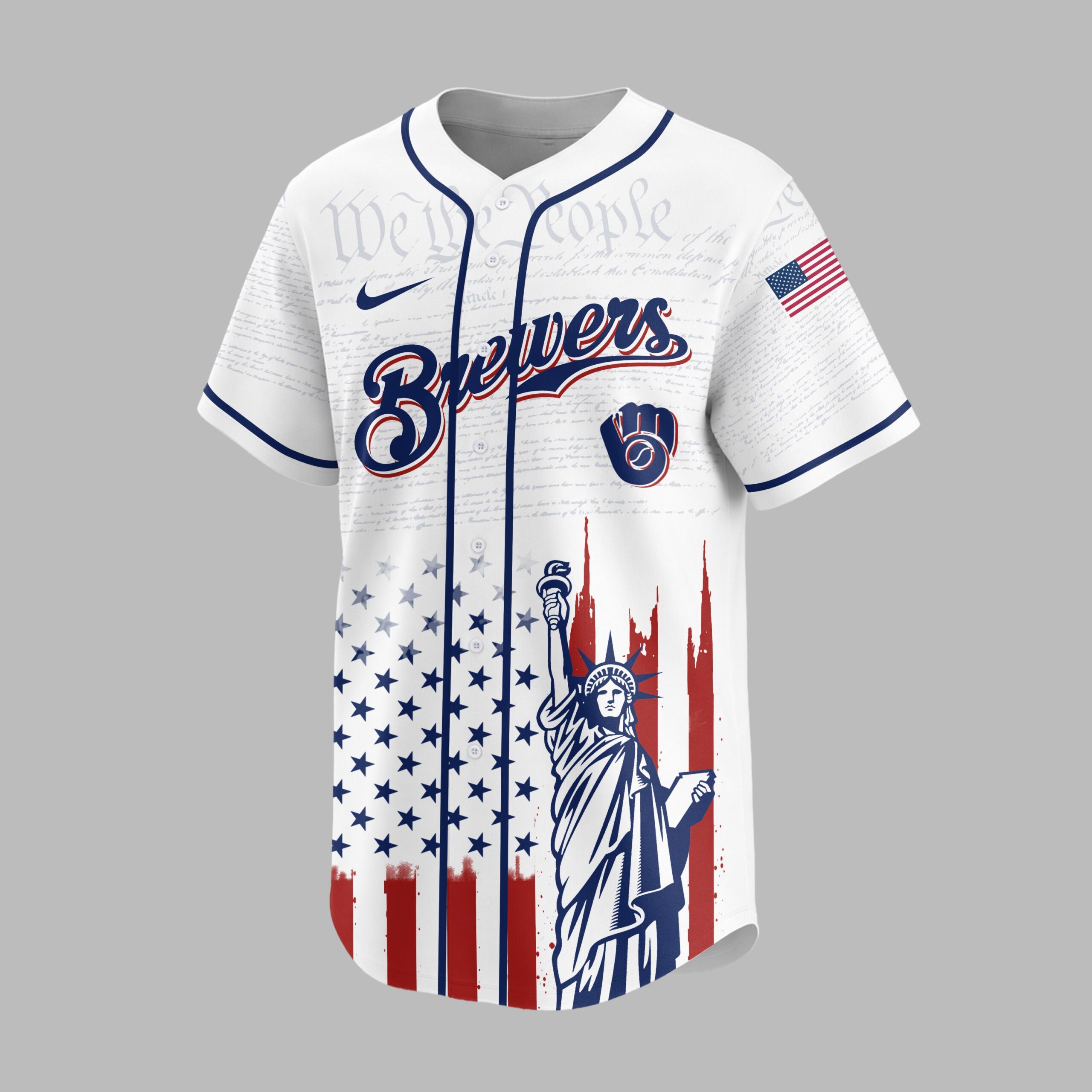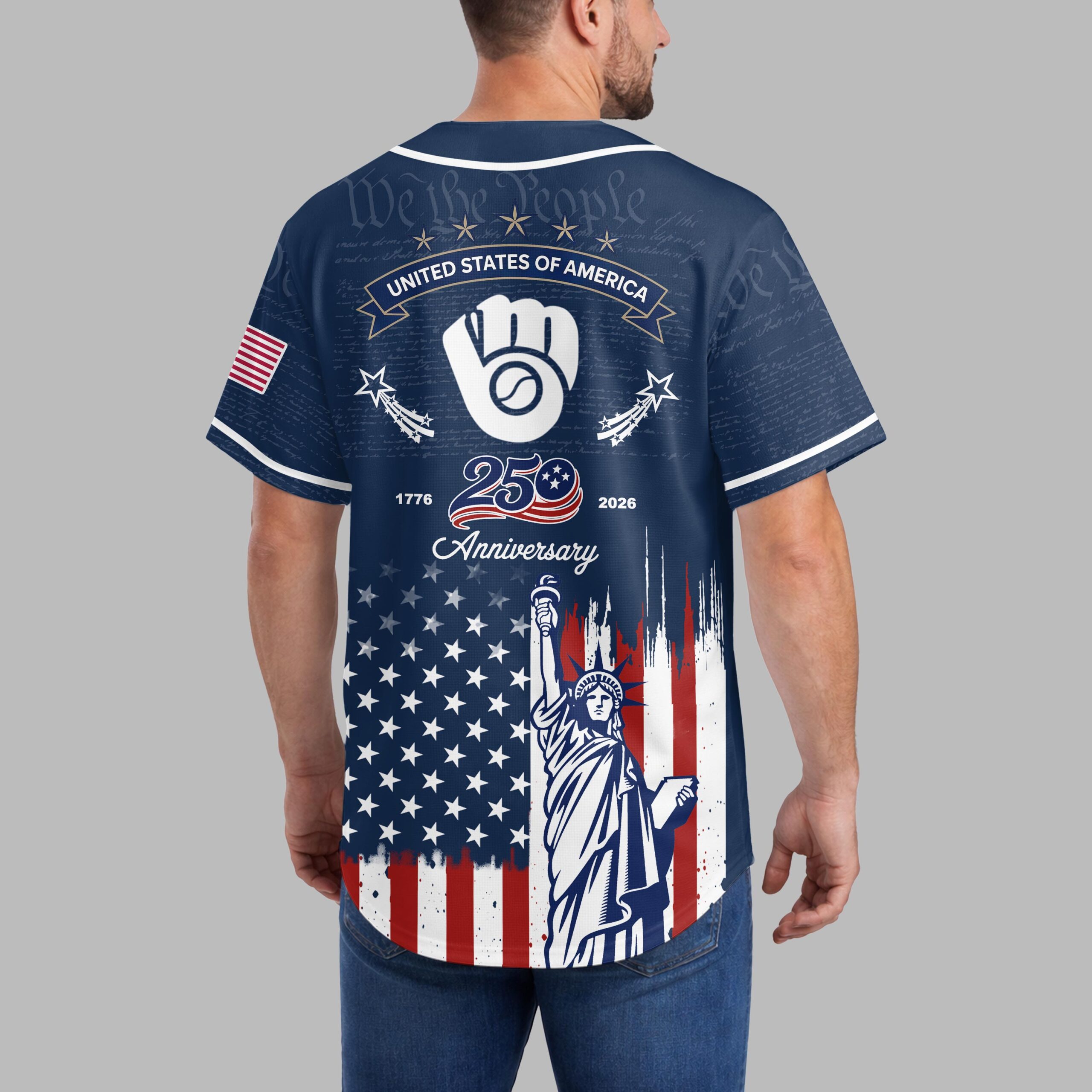 Unite your passion for baseball and country with this Milwaukee Brewers Patriotic 250th Anniversary Baseball Jersey! This unique design proudly blends your devotion to the Brewers with a vibrant celebration of American heritage. It’s the ultimate fan gear for showcasing both team spirit and national pride. The front features the classic Brewers script and Ball and Glove logo, subtly laid over We the People text. Below, a distressed American flag design flows into the Statue of Liberty. The back adds STATES OF AMERICA, shooting stars, and a 1776 250 Anniversary 2026 graphic, completing this powerful patriotic display. Ideal for gamedays, Fourth of July events, or anytime you want to display American and Brewers pride. This jersey lets you wear your passion and patriotism.