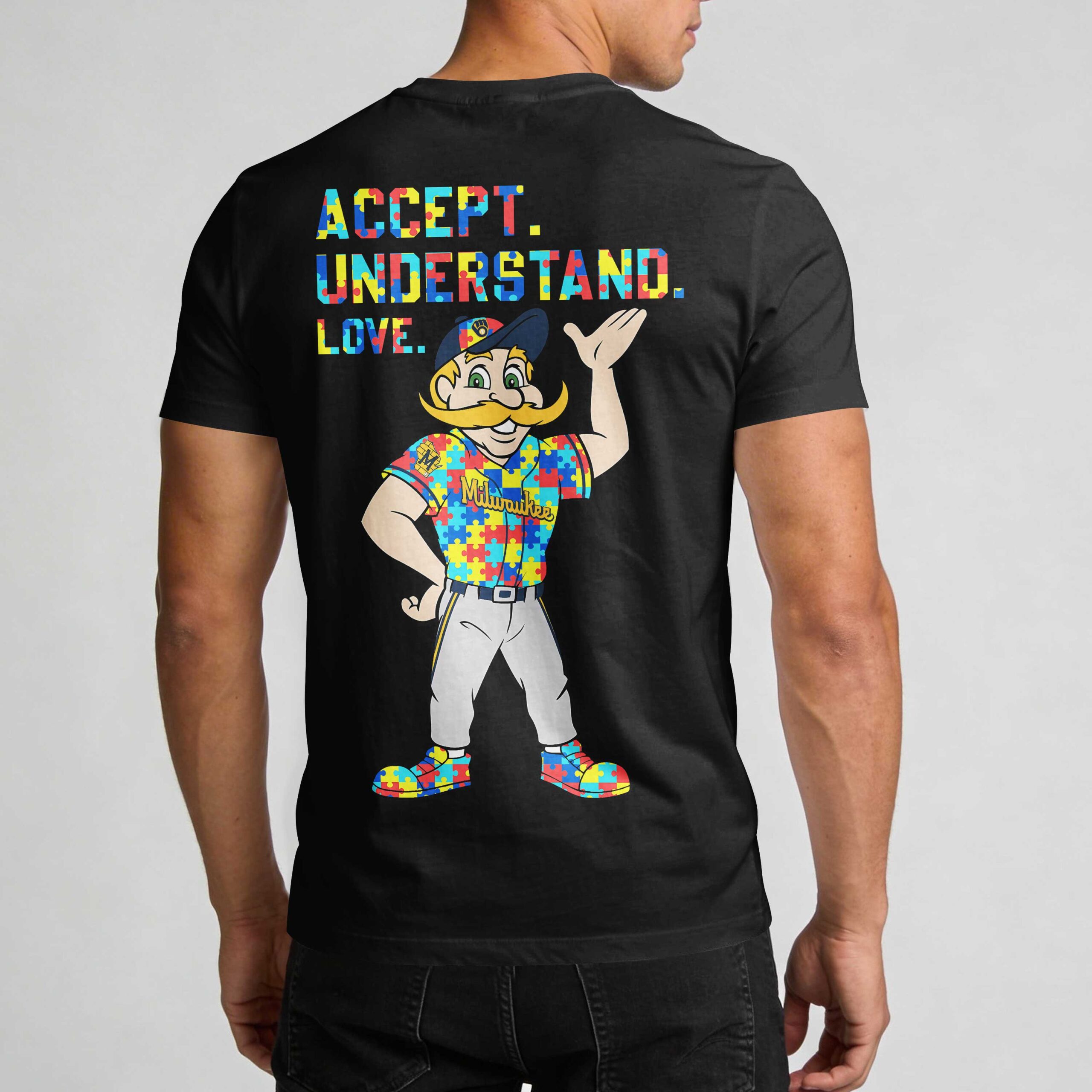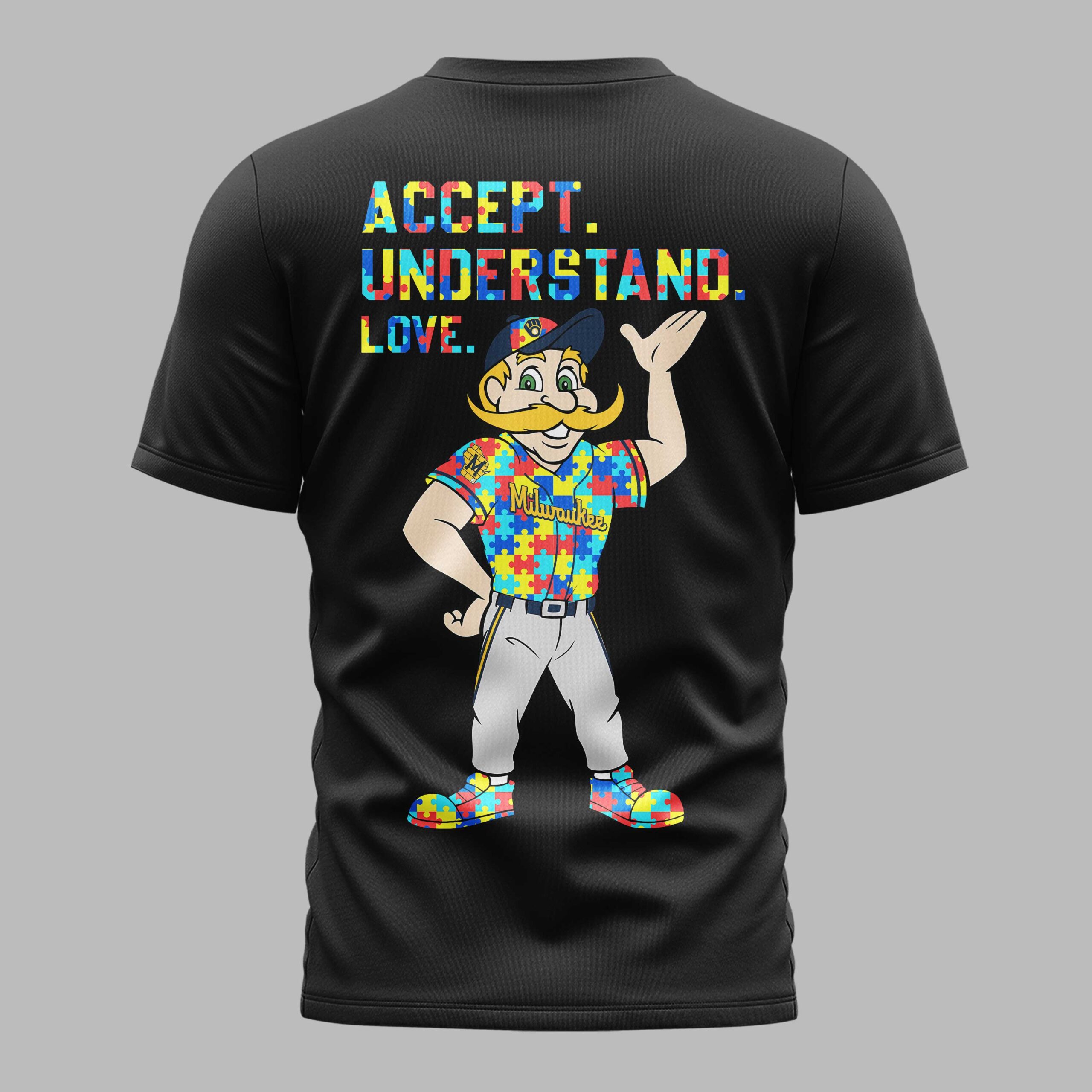 Show your unwavering Milwaukee Brewers pride with this unique fan t-shirt! It’s the perfect way to display your loyalty while also supporting a meaningful message, making a powerful statement wherever you go. The front proudly features the iconic ‘MILWAUKEE BREWERS’ name and the classic ‘M’ and ‘B’ glove logo, all vibrantly rendered in a colorful puzzle piece pattern. A matching Nike swoosh and a rainbow infinity symbol near the collar complete this distinctive look. On the back, the message ‘ACCEPT. UNDERSTAND. LOVE.’ stands out, accompanied by a spirited Bernie Brewer mascot, whose uniform also sports the signature puzzle piece design, symbolizing unity and acceptance. This eye-catching shirt is ideal for game days at the ballpark, watch parties, or simply making a statement as part of your everyday fan wear. Gear up and celebrate your Brewers with spirit and heart.