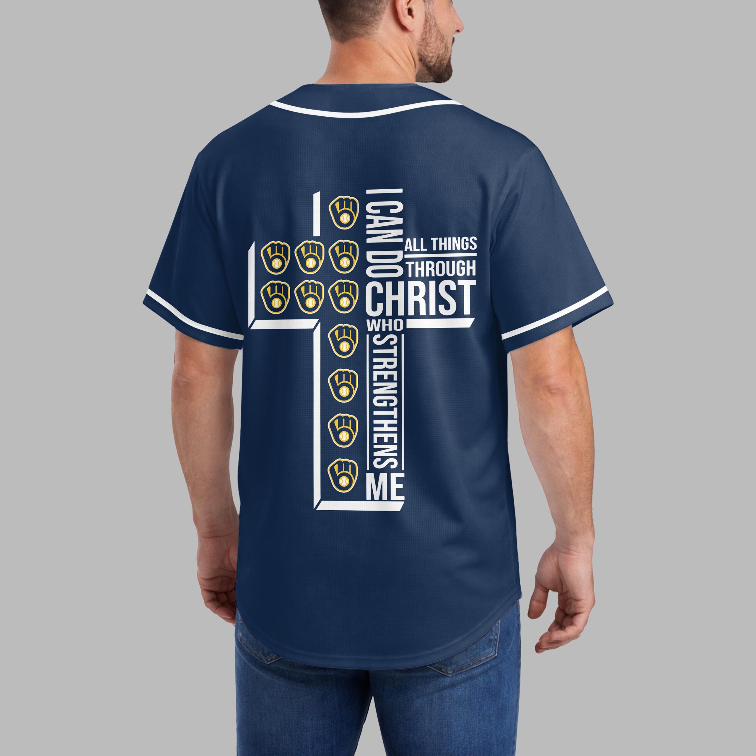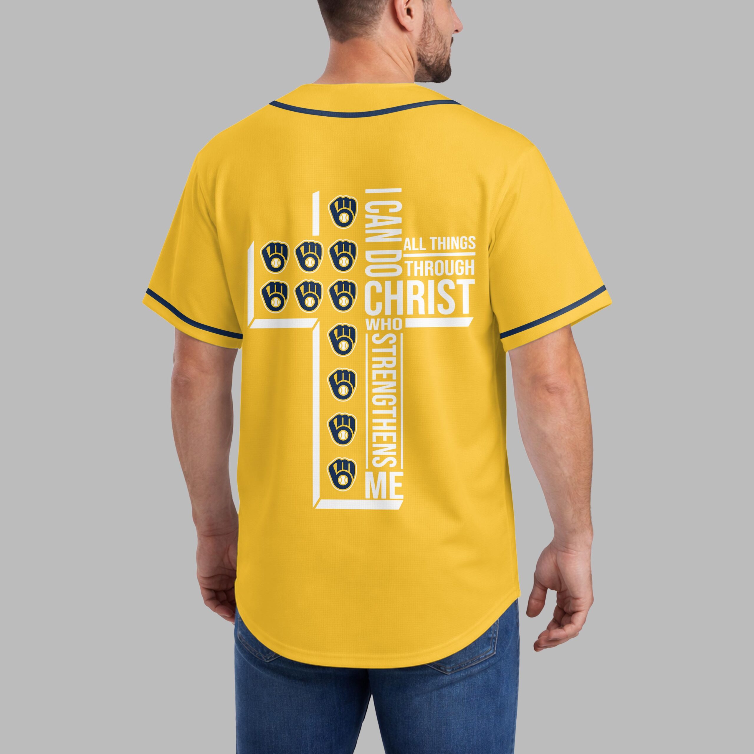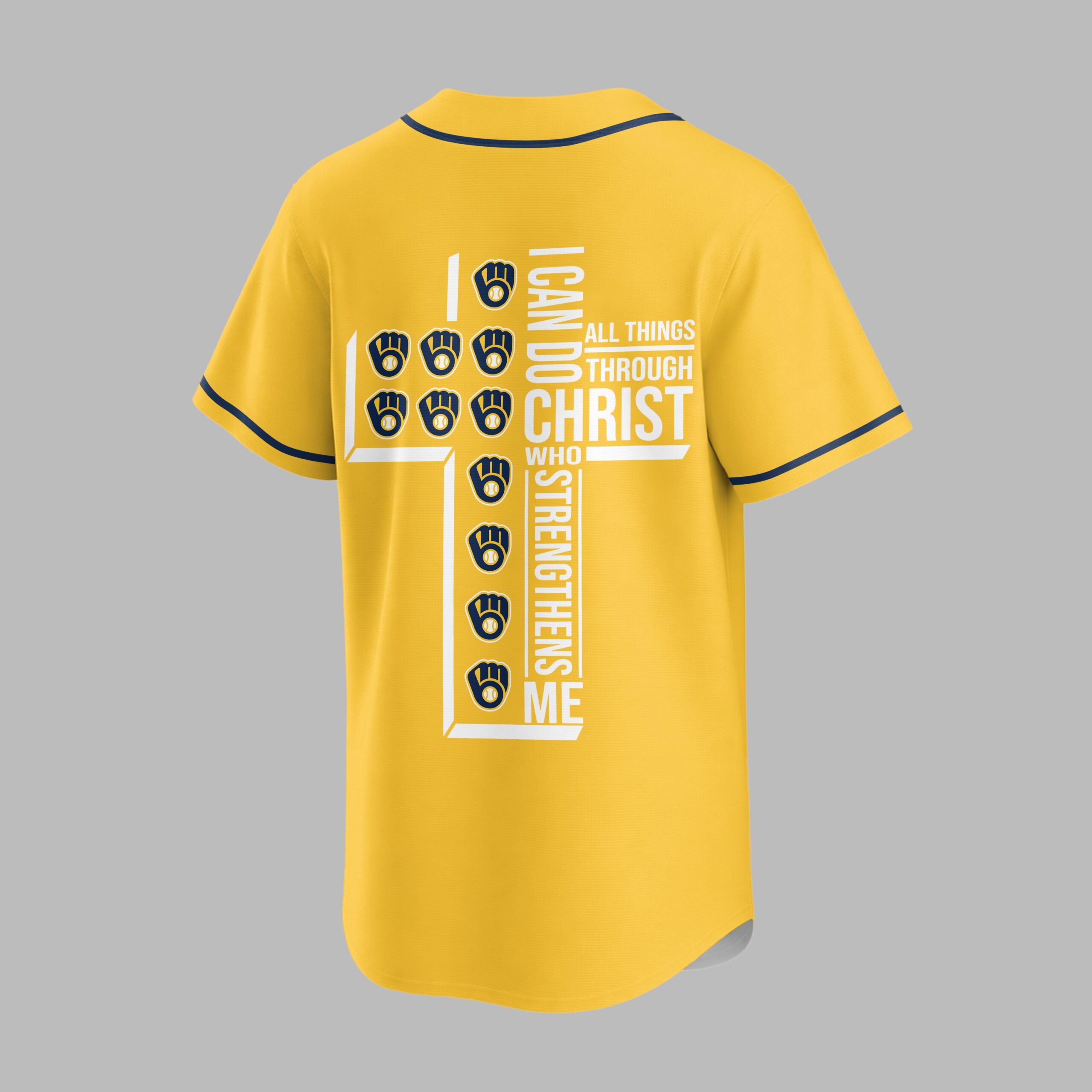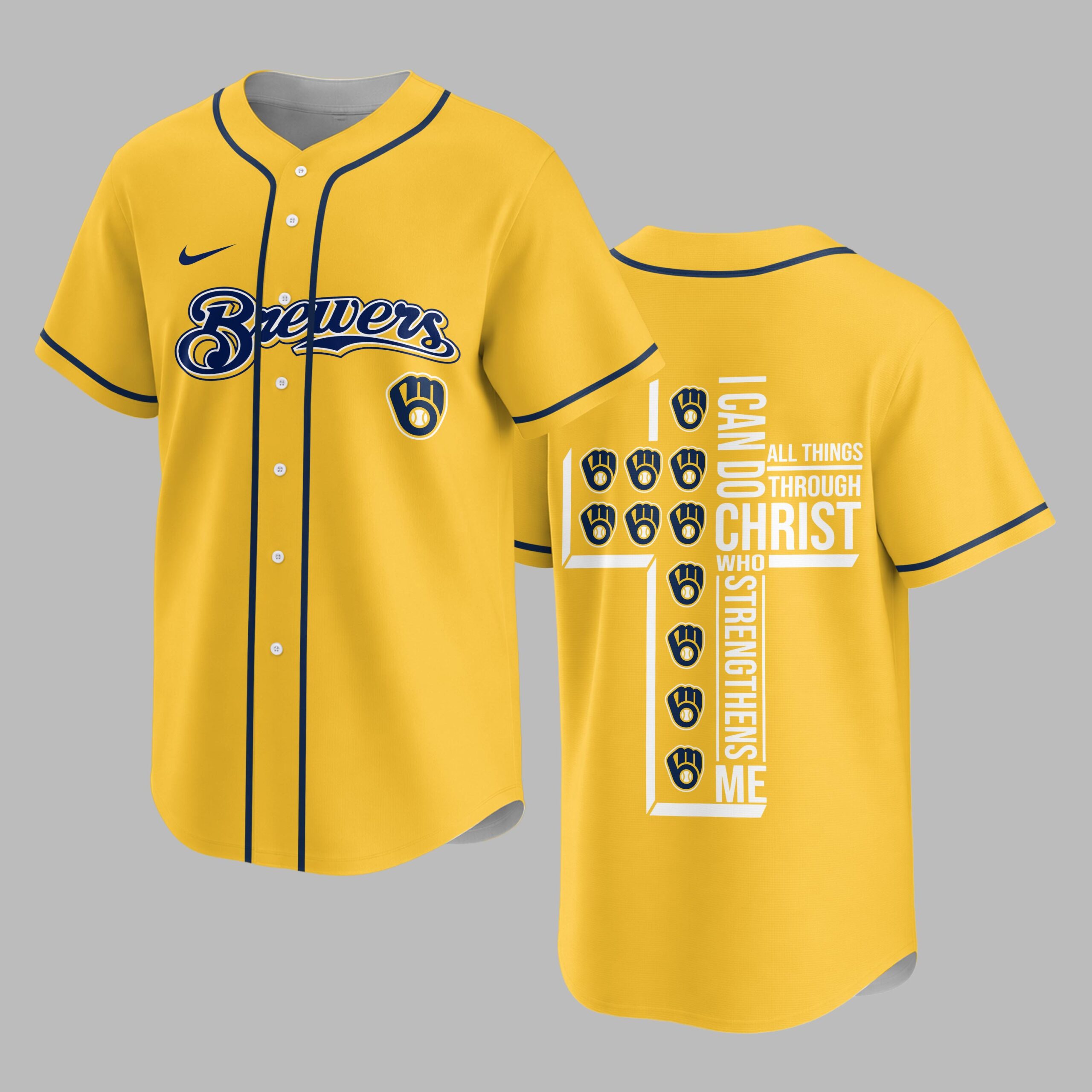 Showcase your unwavering team spirit and profound faith with this unique Milwaukee Brewers jersey. It’s the perfect way to celebrate your favorite baseball team while carrying an empowering message close to your heart, blending your love for the game with spiritual strength. The front proudly displays the iconic Brewers script in vibrant yellow and navy, along with the classic M glove logo. The back features a powerful design: the scripture I CAN DO ALL THINGS THROUGH CHRIST WHO STRENGTHENS ME is boldly arranged to form a cross, accented with multiple baseball glove and ball emblems, beautifully merging your passion for baseball and faith. This jersey is ideal for game days at the ballpark, watching from home, or any casual outing where you want to express both your Brewers pride and your personal conviction. It’s a compelling statement piece, perfect for connecting with fellow fans and believers alike.
