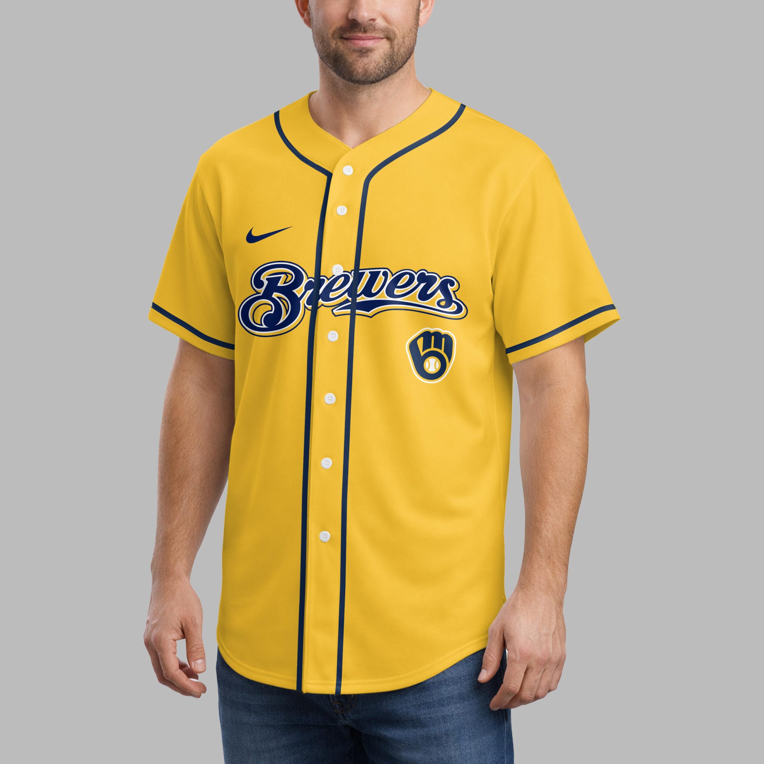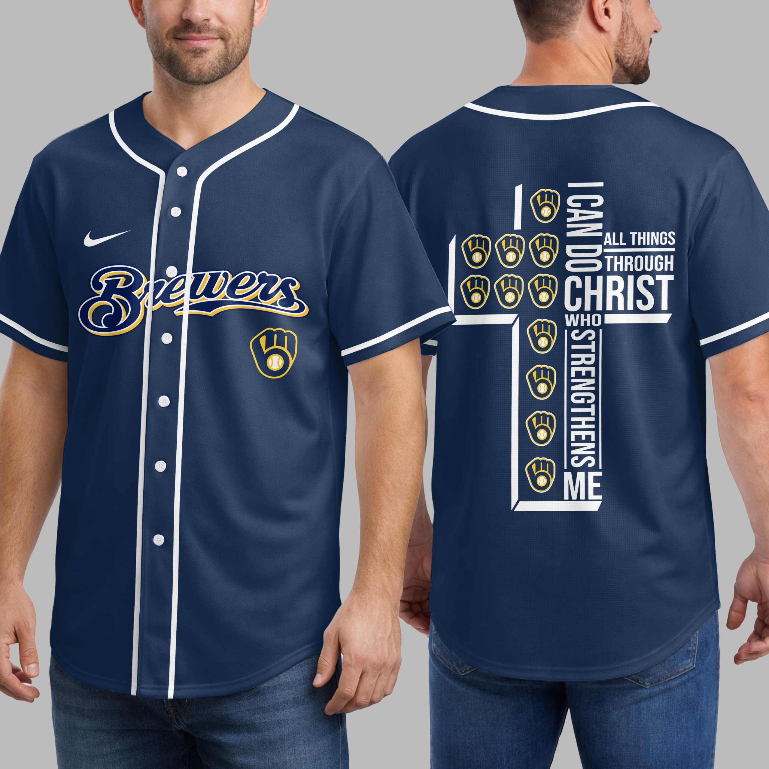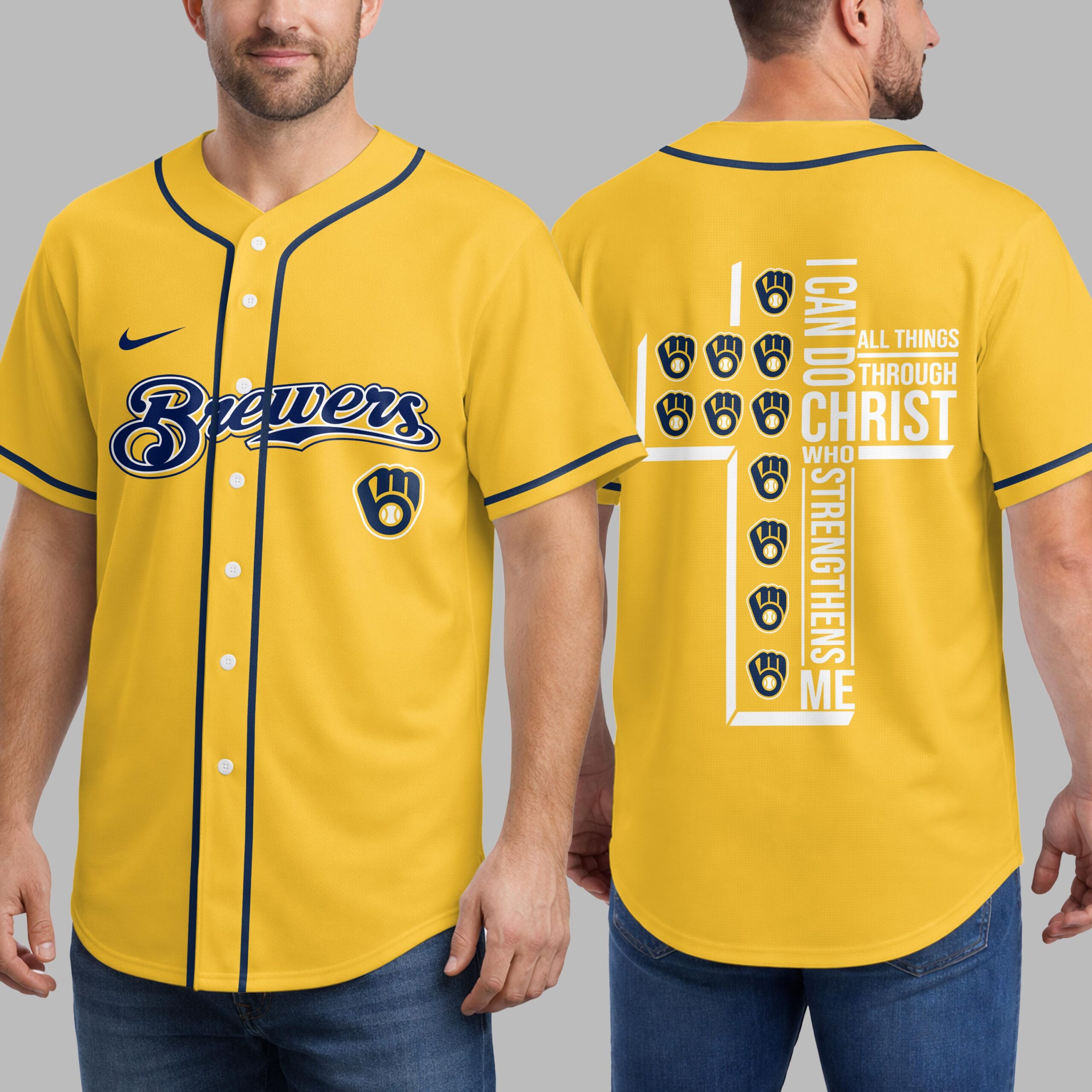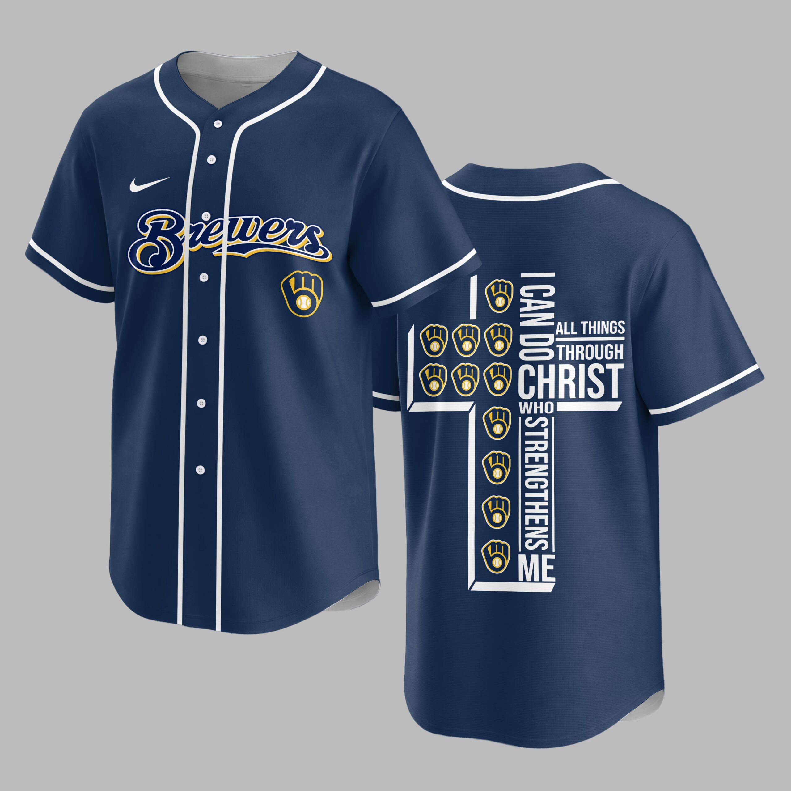 Showcase your unwavering team spirit and profound faith with this unique Milwaukee Brewers jersey. It’s the perfect way to celebrate your favorite baseball team while carrying an empowering message close to your heart, blending your love for the game with spiritual strength. The front proudly displays the iconic Brewers script in vibrant yellow and navy, along with the classic M glove logo. The back features a powerful design: the scripture I CAN DO ALL THINGS THROUGH CHRIST WHO STRENGTHENS ME is boldly arranged to form a cross, accented with multiple baseball glove and ball emblems, beautifully merging your passion for baseball and faith. This jersey is ideal for game days at the ballpark, watching from home, or any casual outing where you want to express both your Brewers pride and your personal conviction. It’s a compelling statement piece, perfect for connecting with fellow fans and believers alike.