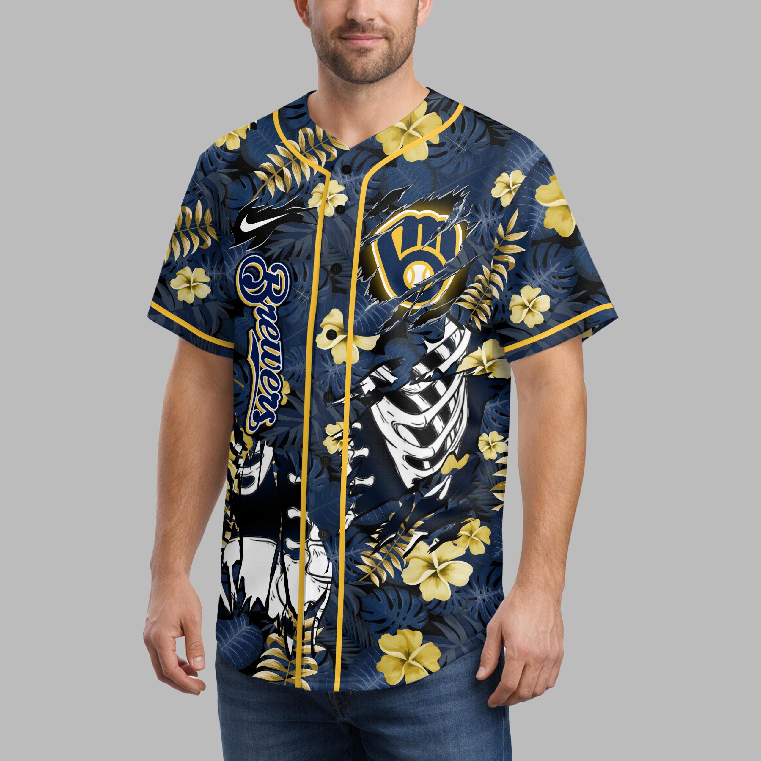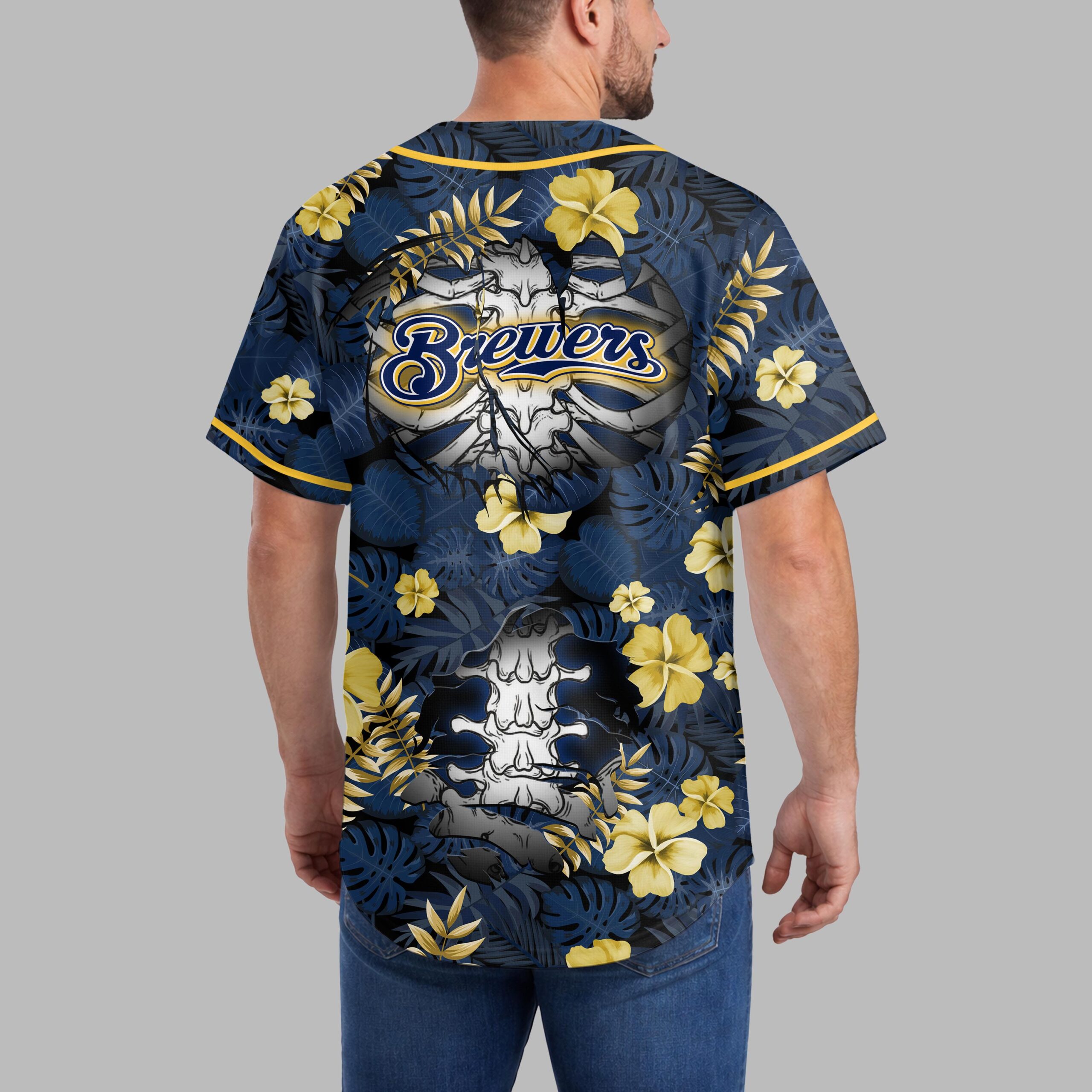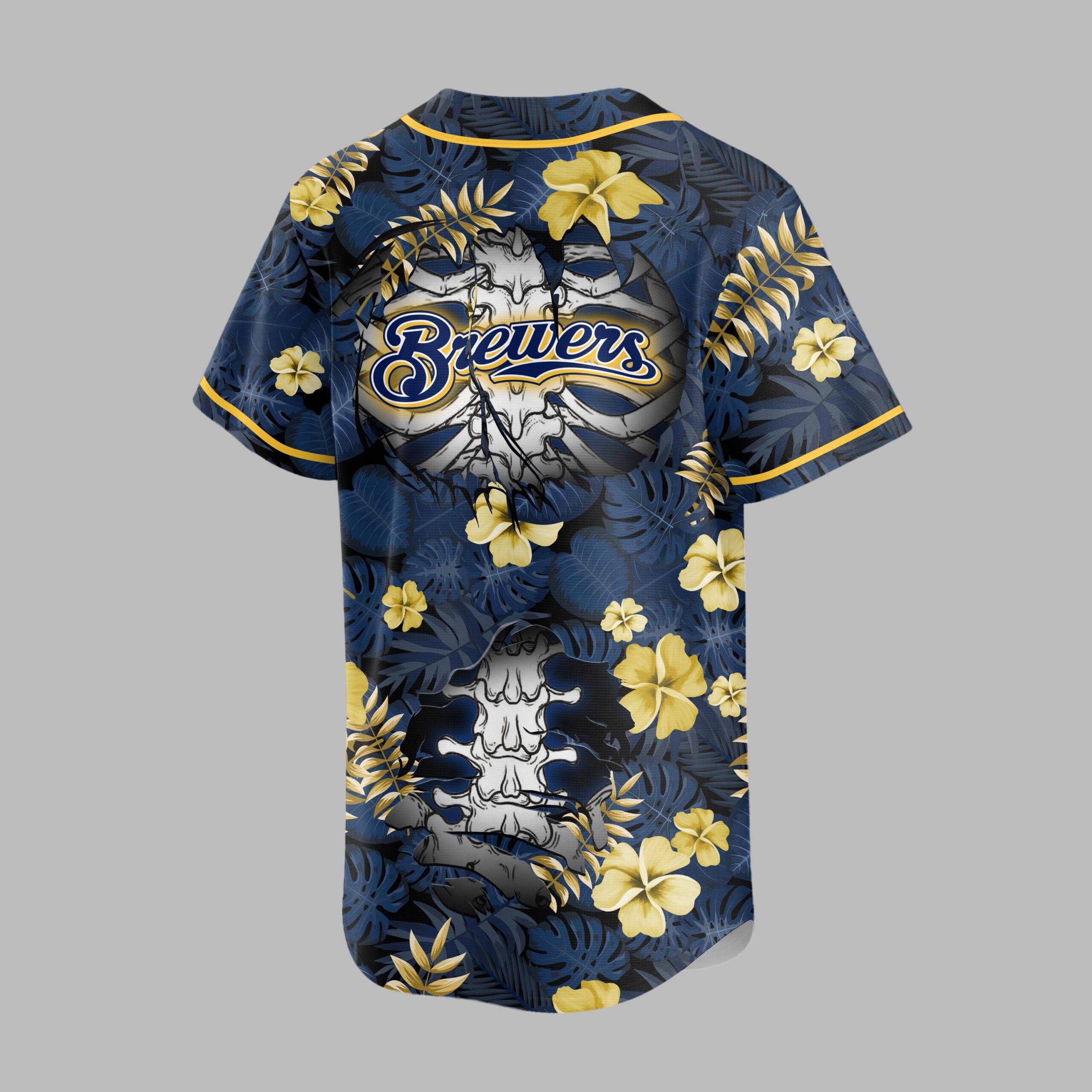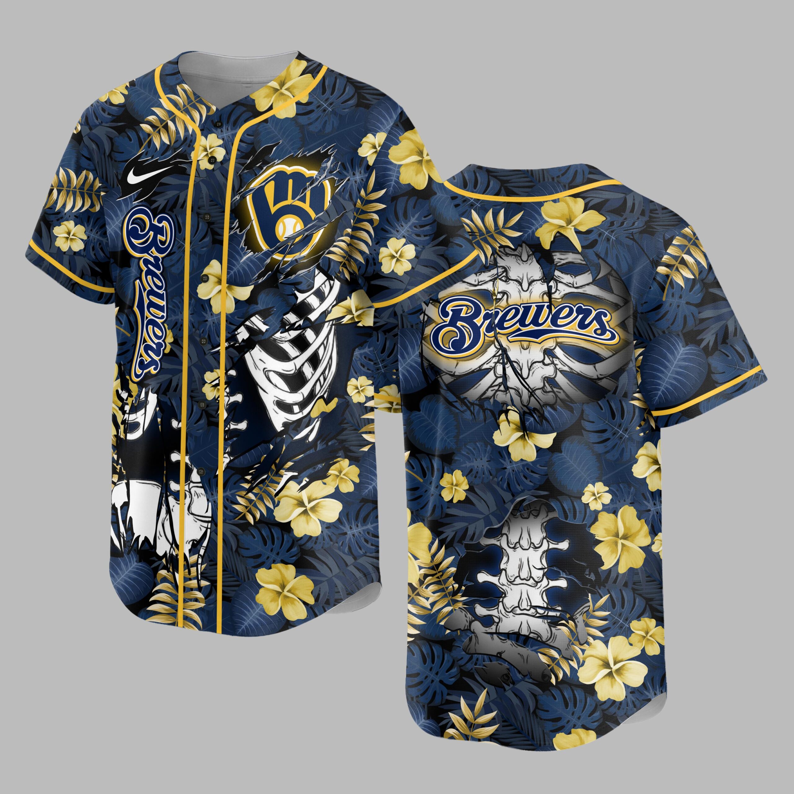 Unleash your unique fan spirit with this Milwaukee Brewers tropical jersey! Merging vibrant team pride with a laid-back island vibe, it offers an eye-catching way to celebrate your favorite team. This unforgettable shirt is perfect for making a bold statement. The jersey features a rich navy backdrop adorned with blue and gold tropical leaves and yellow hibiscus flowers. The front proudly showcases the Brewers name and the M logo. An edgy skeletal ribcage design dramatically tears through the pattern. The back maintains this distinctive theme with the Brewers name and an intricate spinal column detail. Ideal for game days at the ballpark, summer gatherings, or a tropical escape, this jersey combines comfort with undeniable fan appeal. Show off your loyalty in style, whether in the stands or enjoying a casual day. It’s the ultimate way to celebrate your Brewers pride.