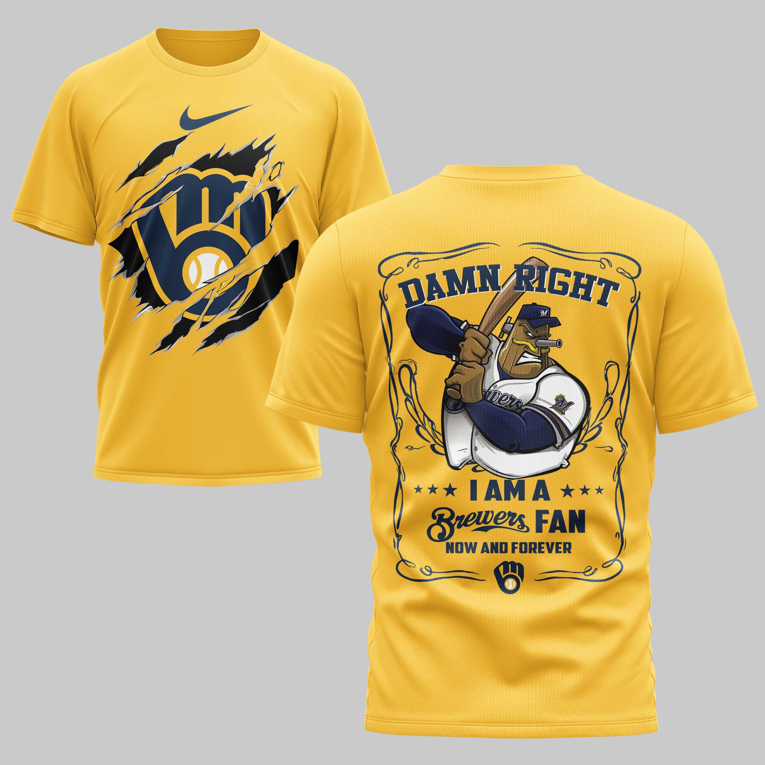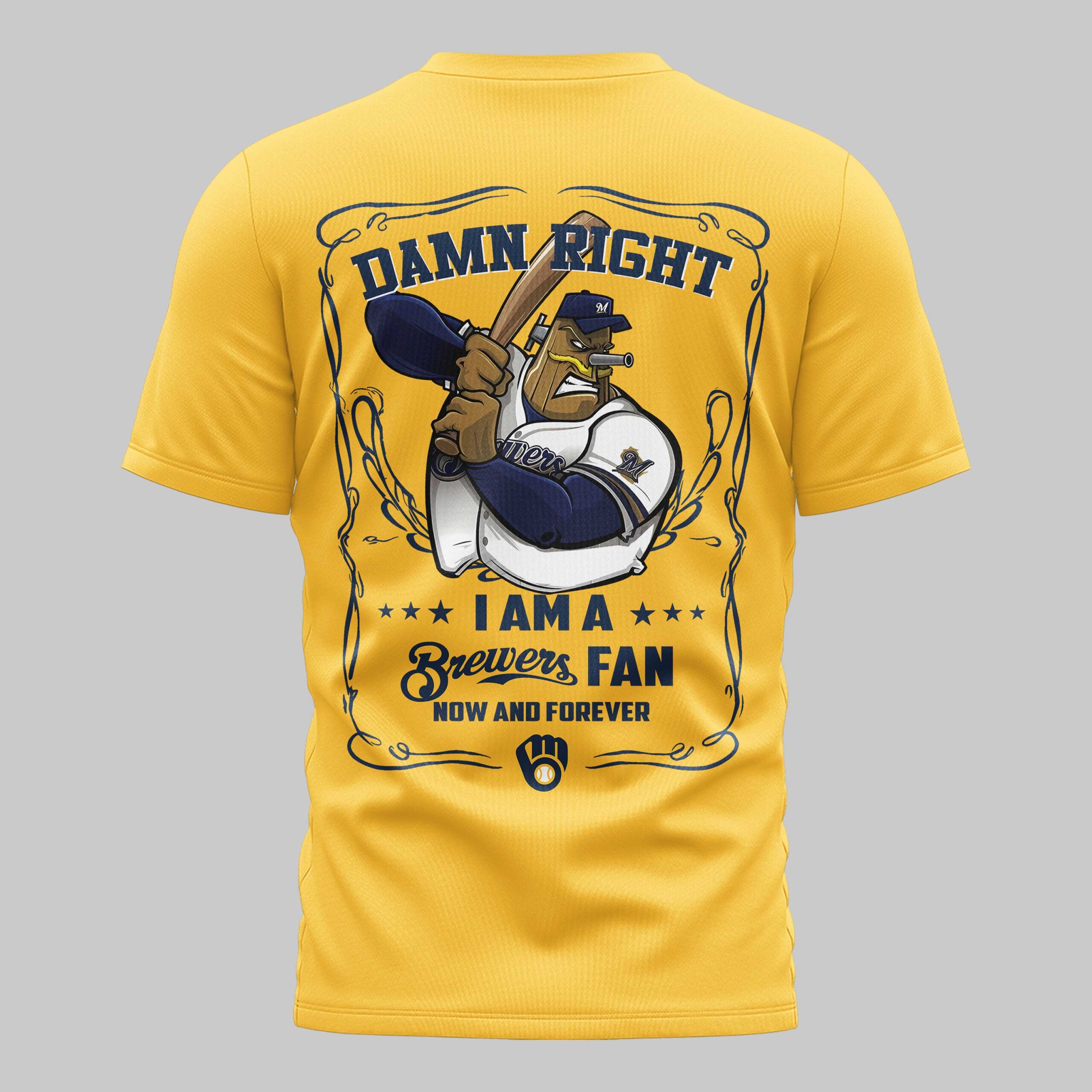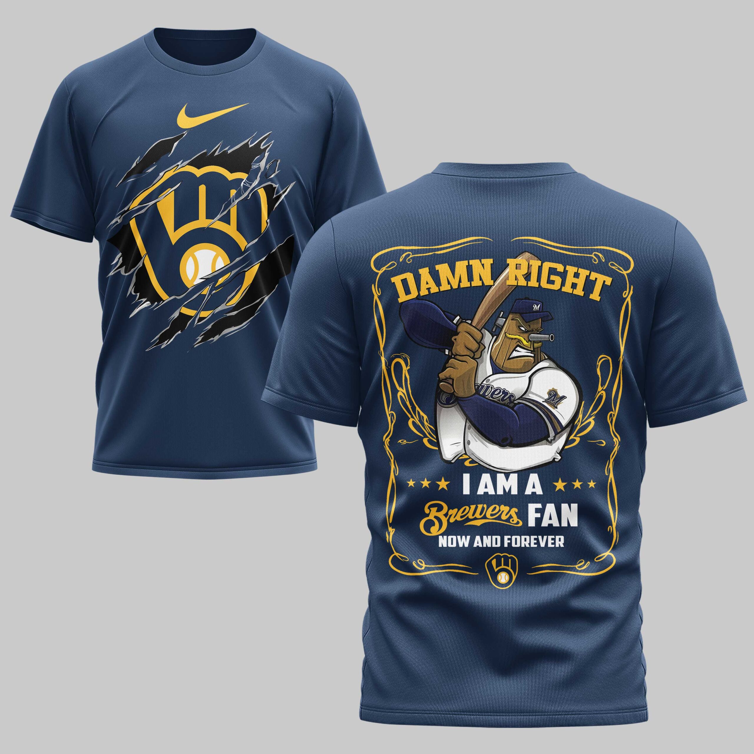 Showcase your unwavering loyalty to the Milwaukee Brewers with this bold and spirited fan tee! Perfect for the dedicated supporter, this shirt proudly declares your allegiance to your favorite baseball team, letting everyone know where your heart truly lies on game day and beyond. The front of the shirt features a dynamic ripped effect, revealing the iconic yellow and black Milwaukee Brewers MB logo, complete with a classic baseball. The back makes an even stronger statement, with a fierce, bat-wielding character in a Brewers uniform and cap, framed by elegant scrollwork. Above, the declaration DAMN RIGHT sets the tone, followed by I AM A *** Brewers FAN NOW AND FOREVER, leaving no doubt about your commitment. This vibrant tee is ideal for cheering from the stands at American Family Field, gathering with fellow fans at a watch party, or simply showing off your team spirit around town. It’s the ultimate way to celebrate every home run, every win, and every unforgettable moment with your beloved Brewers!