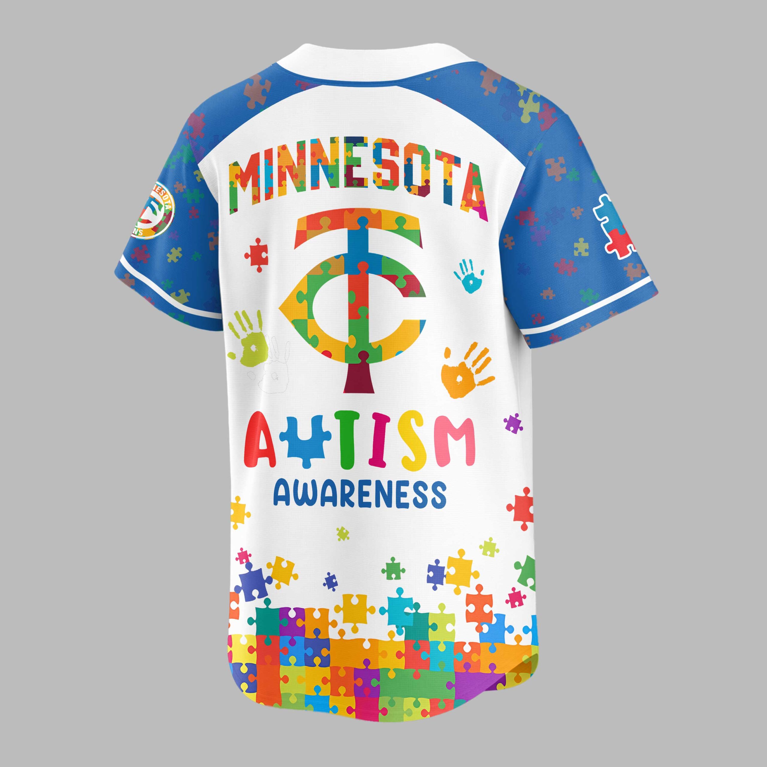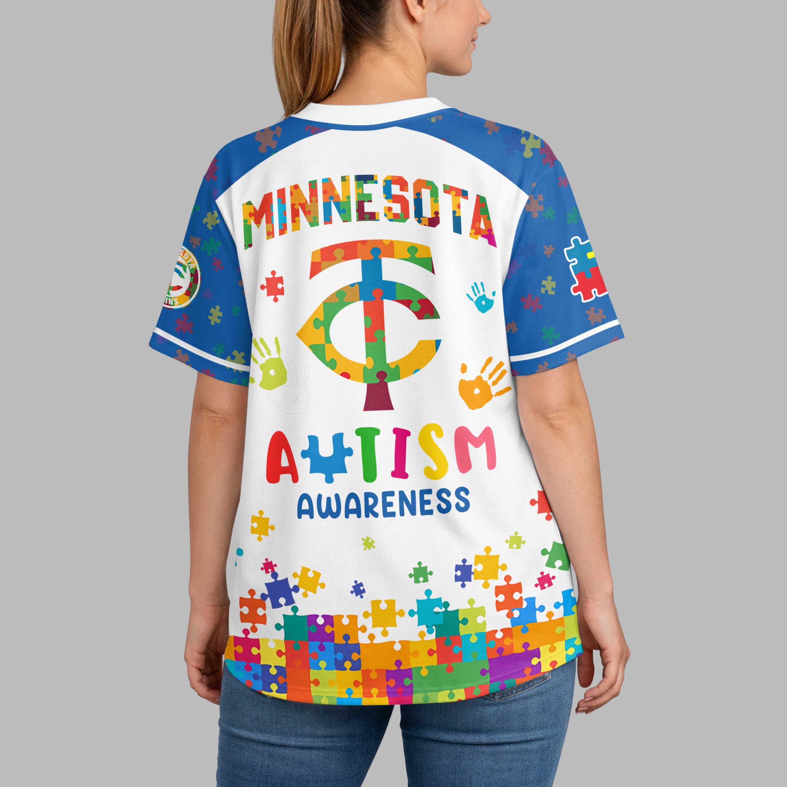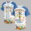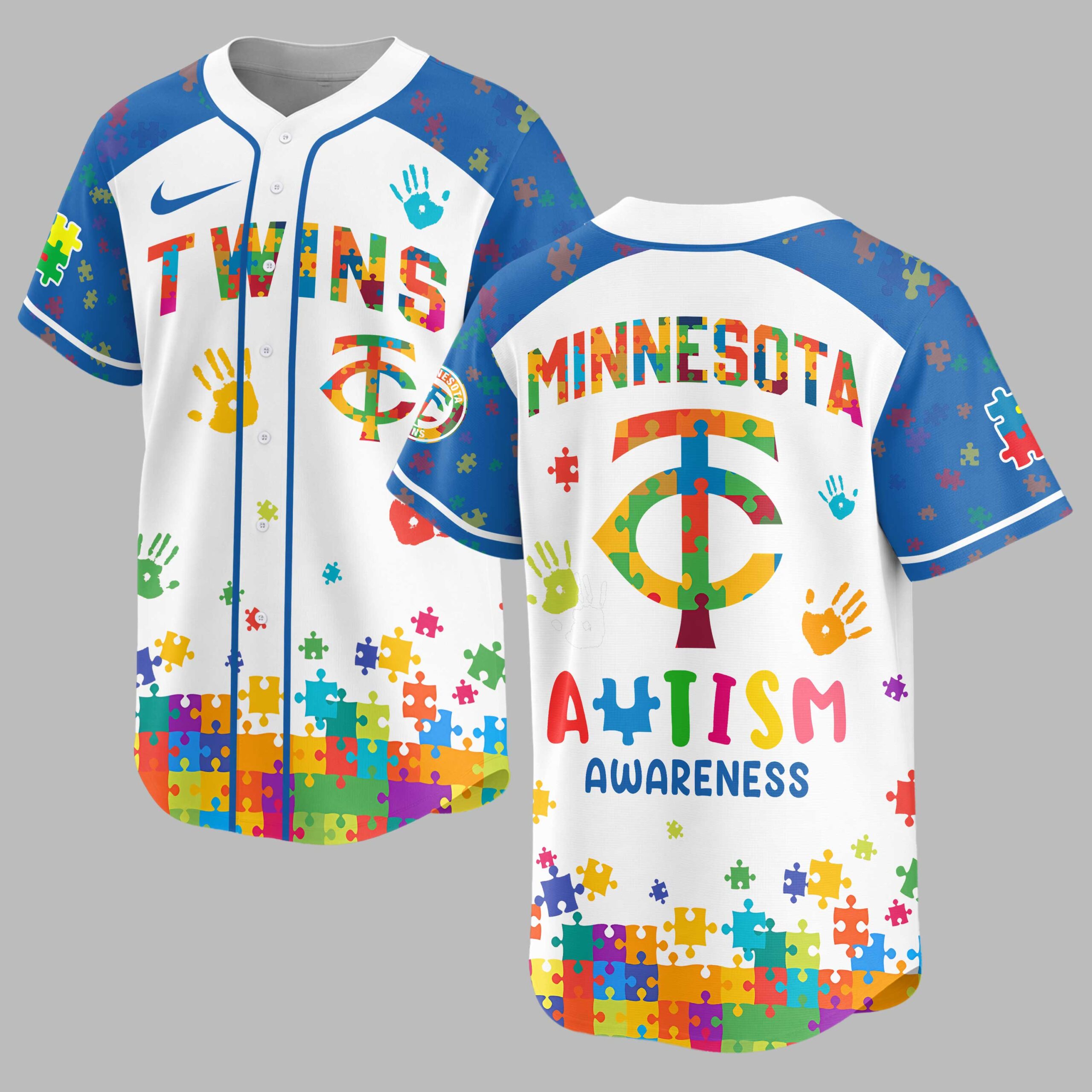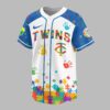 Celebrate team spirit and show your support for a vital cause with our vibrant Minnesota Twins Autism Awareness Baseball Jersey! This unique shirt beautifully blends your love for the Twins with a powerful message of inclusion and understanding. It’s the perfect way to stand out and make a meaningful statement. The front proudly displays ‘TWINS’ and the iconic Minnesota Twins logo, both dynamically rendered in a mosaic of colorful puzzle pieces—the universal symbol for Autism awareness. Bright, scattered handprints and additional puzzle pieces add to the spirited design. On the back, ‘MINNESOTA’ arches above the puzzle-piece Twins logo, with ‘AUTISM AWARENESS’ boldly underneath. The sleeves and lower hem are adorned with a charming pattern of interconnected puzzle pieces, creating a cohesive and eye-catching look. Whether you’re cheering from the stands at Target Field, attending an Autism awareness walk, or simply enjoying a casual day out, this jersey is designed to be worn with pride. It’s more than just game day apparel; it’s a symbol of unity, support, and hope for the Autism community. Wear it to show your heart and your Twins pride!