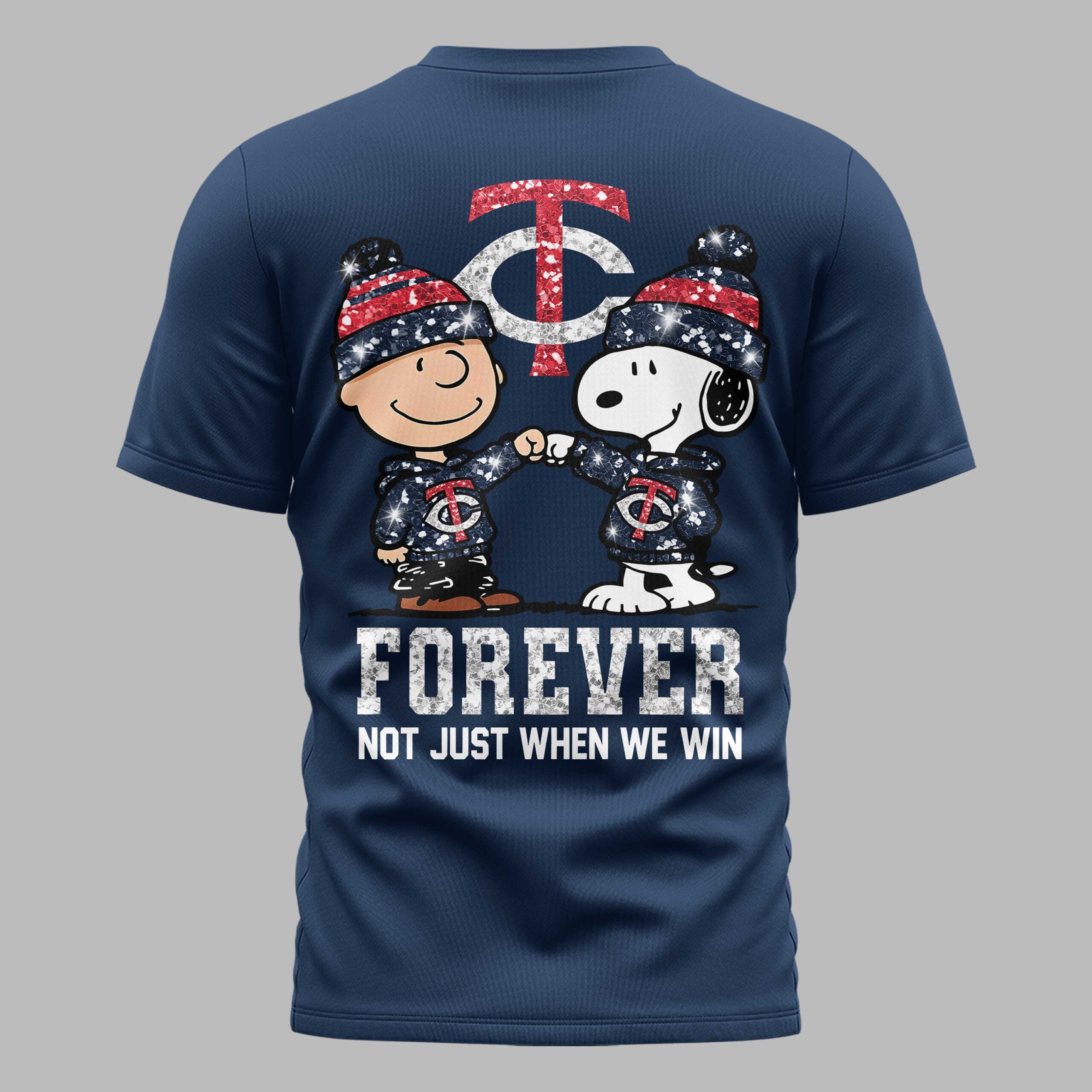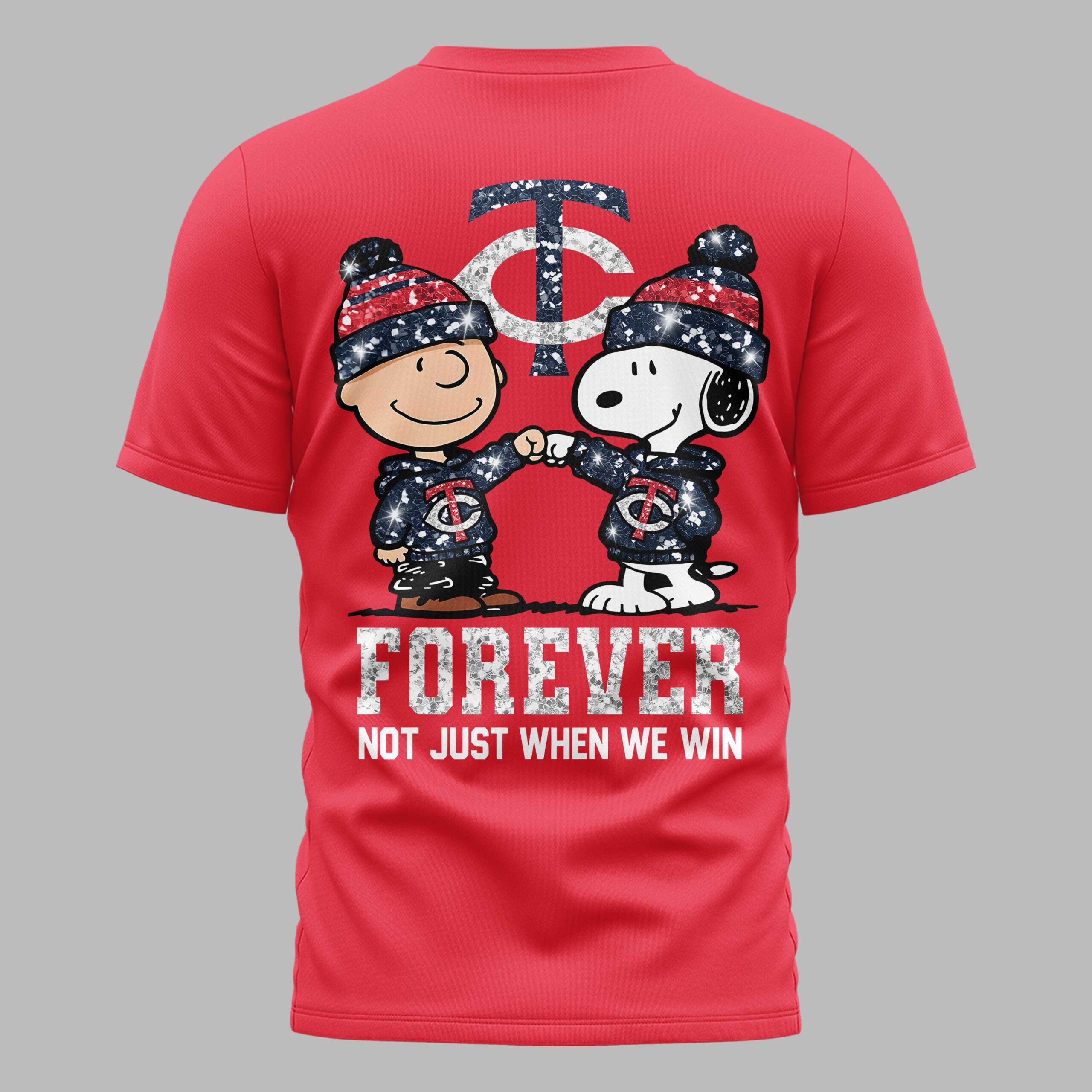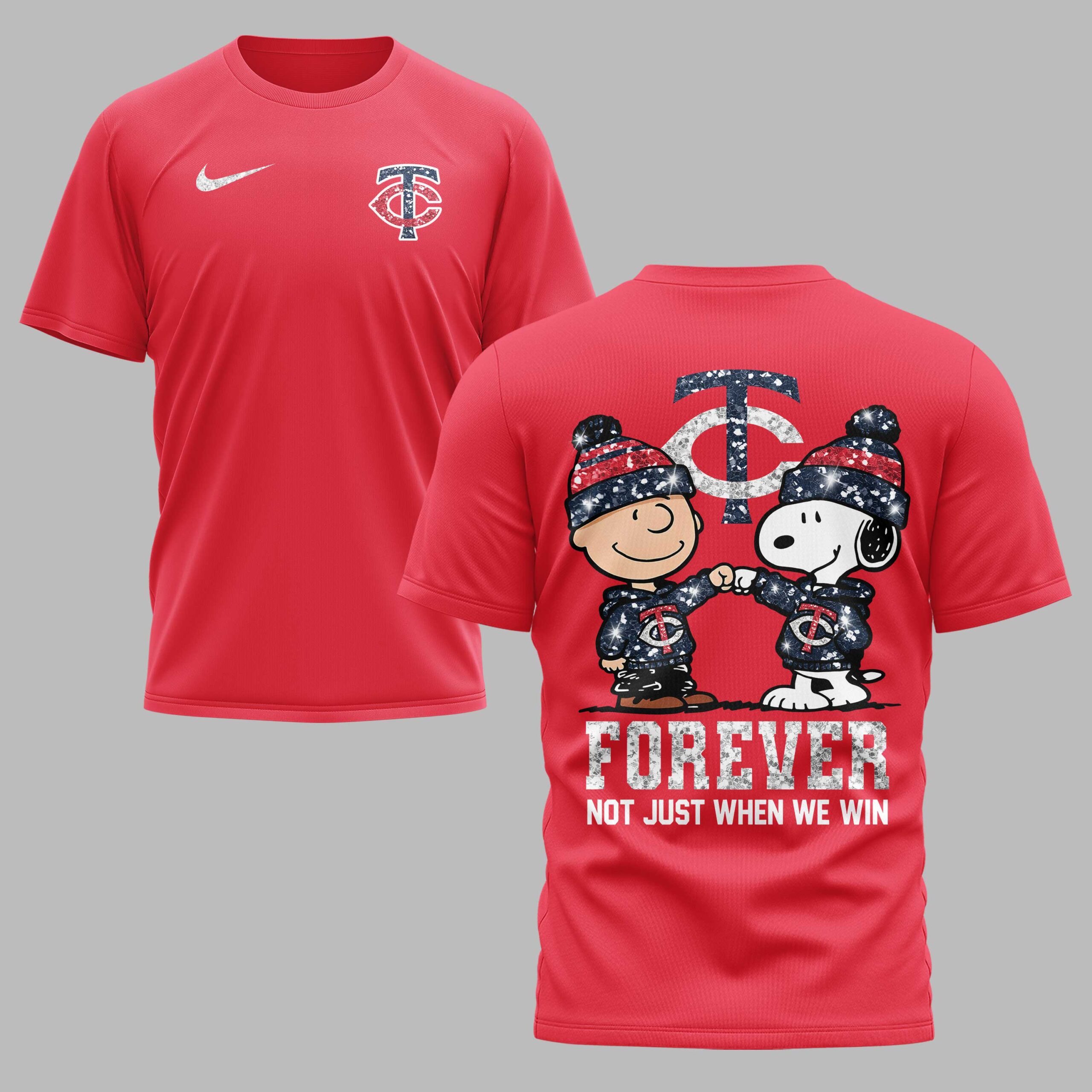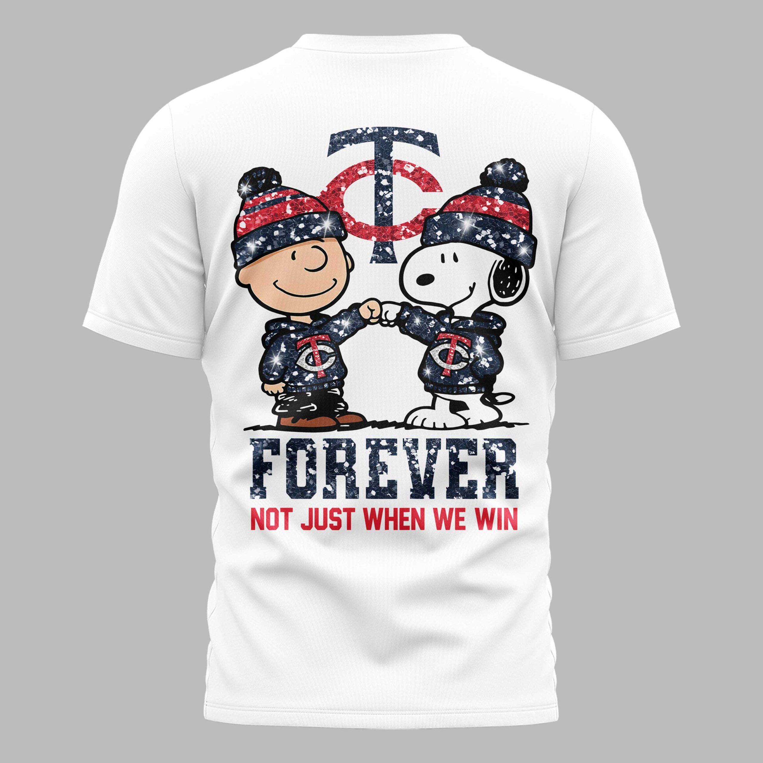 Show your Minnesota Twins devotion with this spirited fan T-shirt, starring Charlie Brown and Snoopy! This design perfectly captures true team loyalty, proving your support shines through every season. It’s the ultimate way for dedicated fans to express their passion with a fun, nostalgic touch. The front features a distressed TC Twins logo and a Nike swoosh. The back makes a bold statement: Charlie Brown and Snoopy, in glitter-accented Twins hoodies and hats, share a loyal fist bump. A large TC logo sits above, and FOREVER NOT JUST WHEN WE WIN below declares your deep commitment. Perfect for game days, watch parties, or casual outings, this T-shirt lets you express your Twins spirit comfortably. Wear it proudly to any event or occasion, celebrating your team and everlasting loyalty!