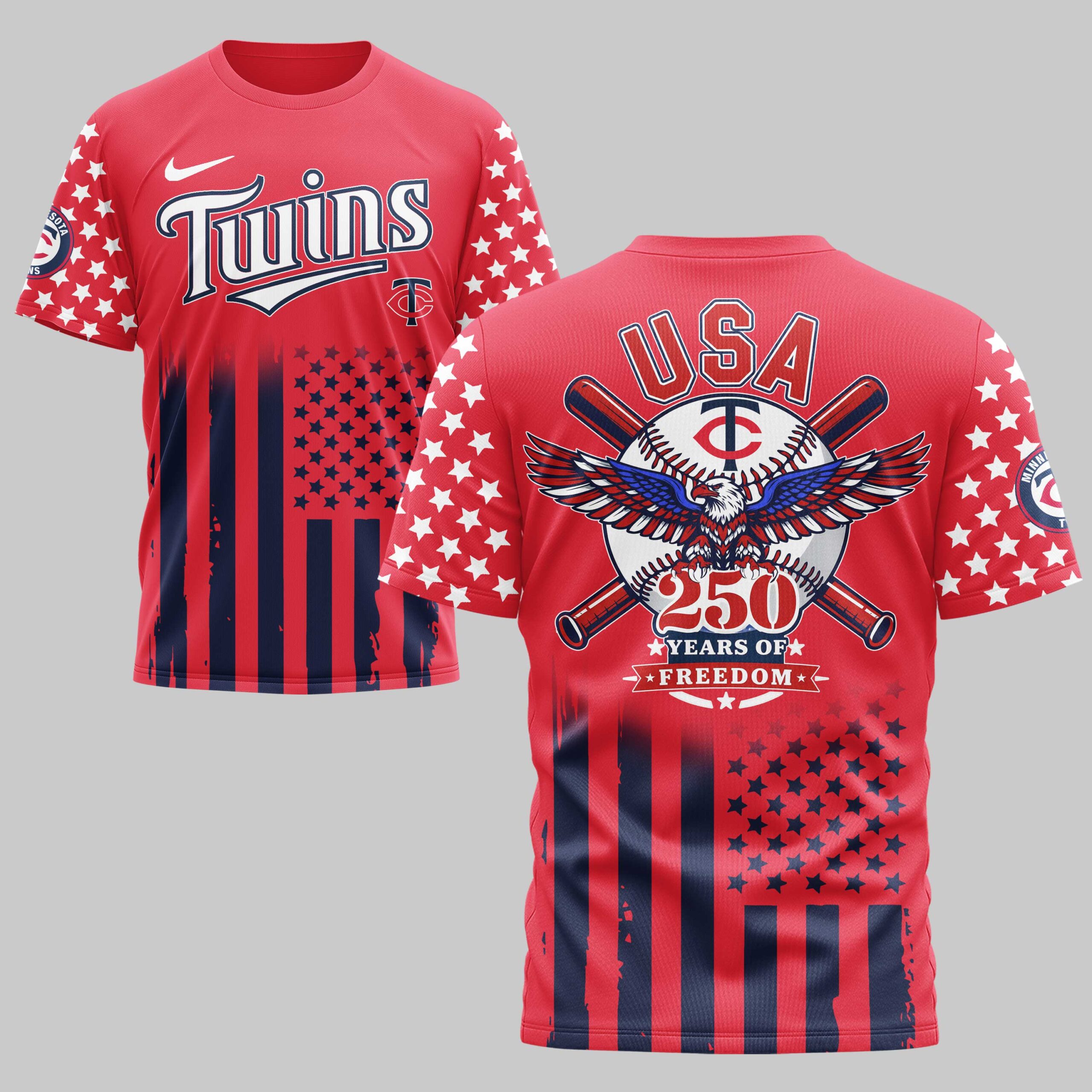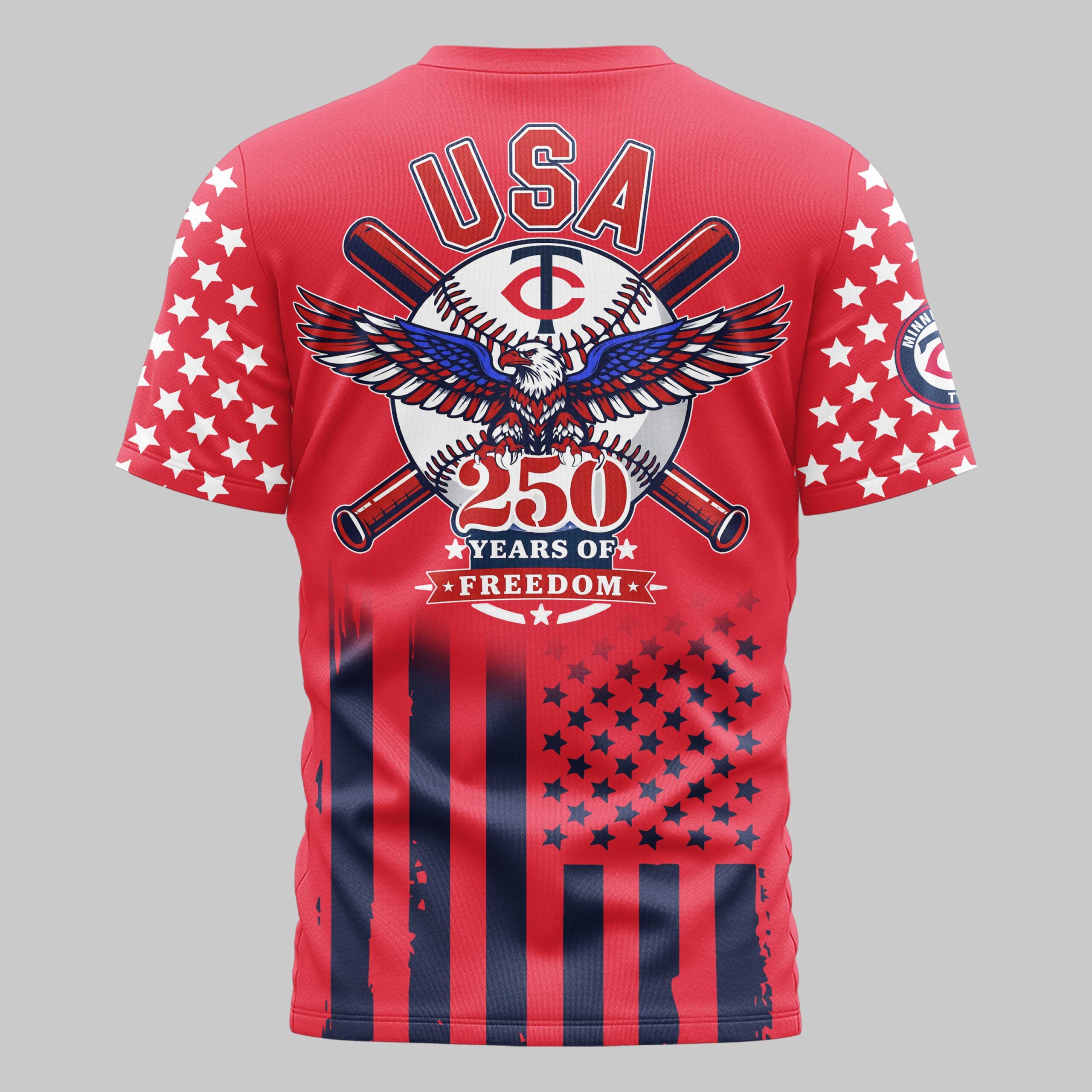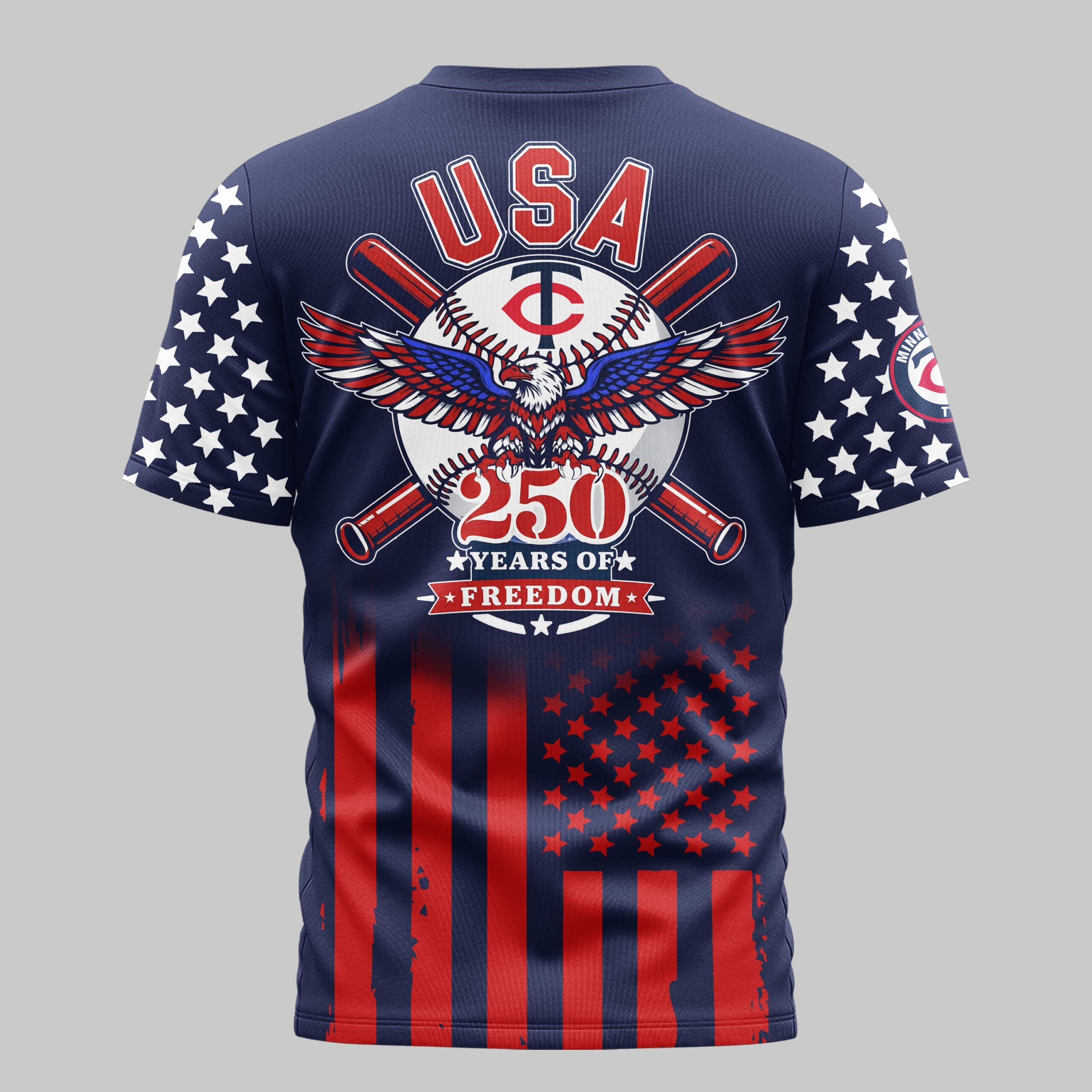 Show your Minnesota Twins pride and celebrate a historic milestone with this Minnesota Twins USA 250 Independence Baseball Fan T-Shirt. This striking piece of fan gear perfectly blends your passion for baseball with a deep sense of national pride, making it a standout addition to any fan’s wardrobe. The front of the shirt features the iconic Twins script logo and the classic TC emblem over a bold stars-and-stripes design. On the back, a powerful graphic showcases USA above a majestic eagle clutching a baseball, framed by crossed bats. Commemorating 250 Years of Freedom, the design is completed with star-patterned sleeves and vertical red and blue stripes along the bottom for a full patriotic effect. Whether you are heading to Target Field for game day, hosting an Independence Day barbecue, or attending a local celebration, this tee is the ultimate way to display your loyalty. Honor the Twins and the nation in style this season.