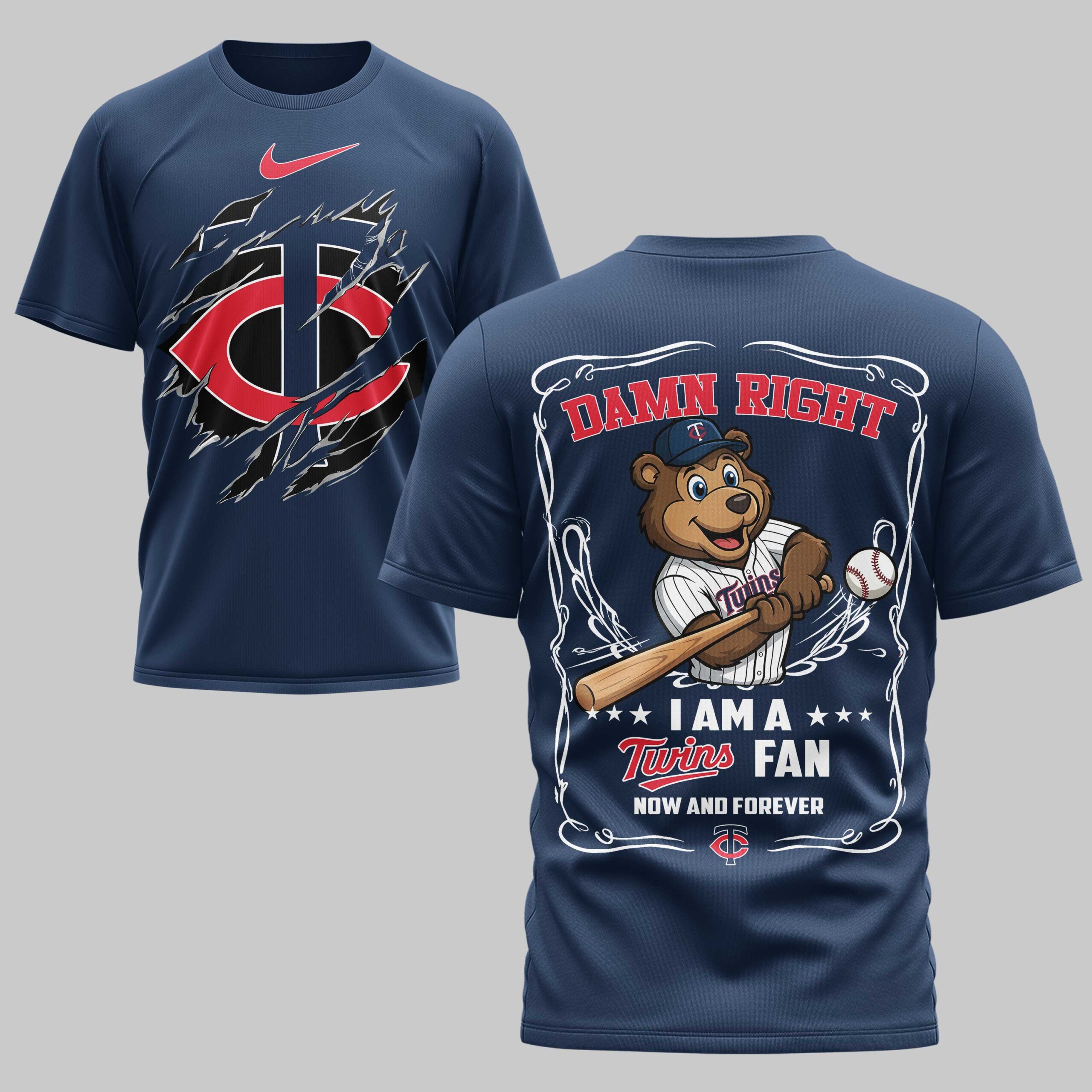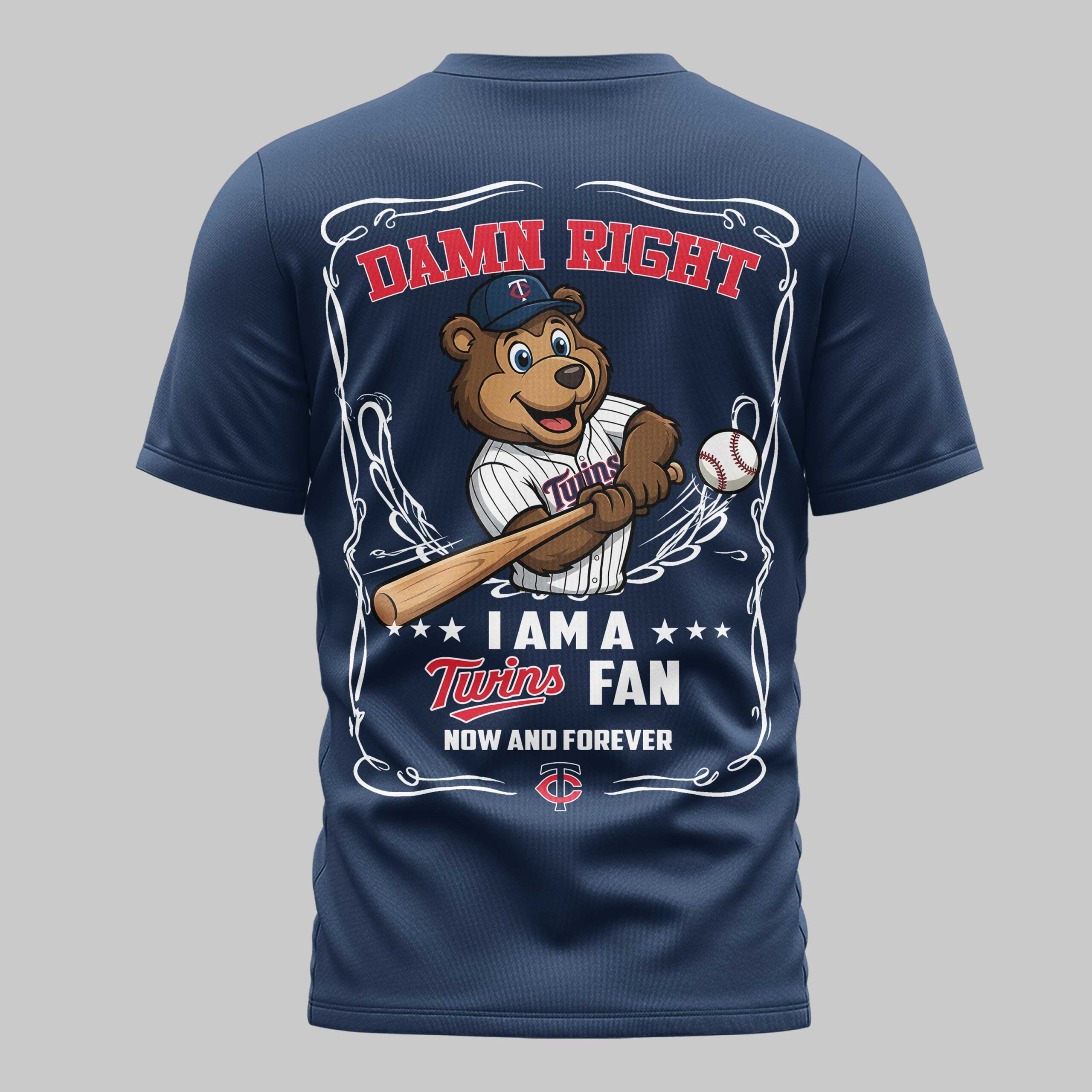 Unleash your team spirit with this vibrant Minnesota Twins fan shirt! This tee is a bold declaration of loyalty for any dedicated supporter who lives and breathes Twins baseball. Celebrate every moment and proudly display your Now and Forever pride. The front of this striking red shirt features a dynamic, ripped effect, powerfully revealing the iconic Twins TC logo beneath, embodying fierce fan dedication. On the back, a spirited bear mascot in a Twins uniform is captured mid-swing with a baseball, surrounded by the unmistakable statement: DAMN RIGHT I AM A Twins FAN NOW AND FOREVER. Whether cheering from the stands, gathering for a watch party, or just showcasing allegiance, this shirt is a must-have for every Twins enthusiast. Wear your passion with pride; let everyone know your heart belongs to Minnesota baseball.