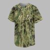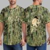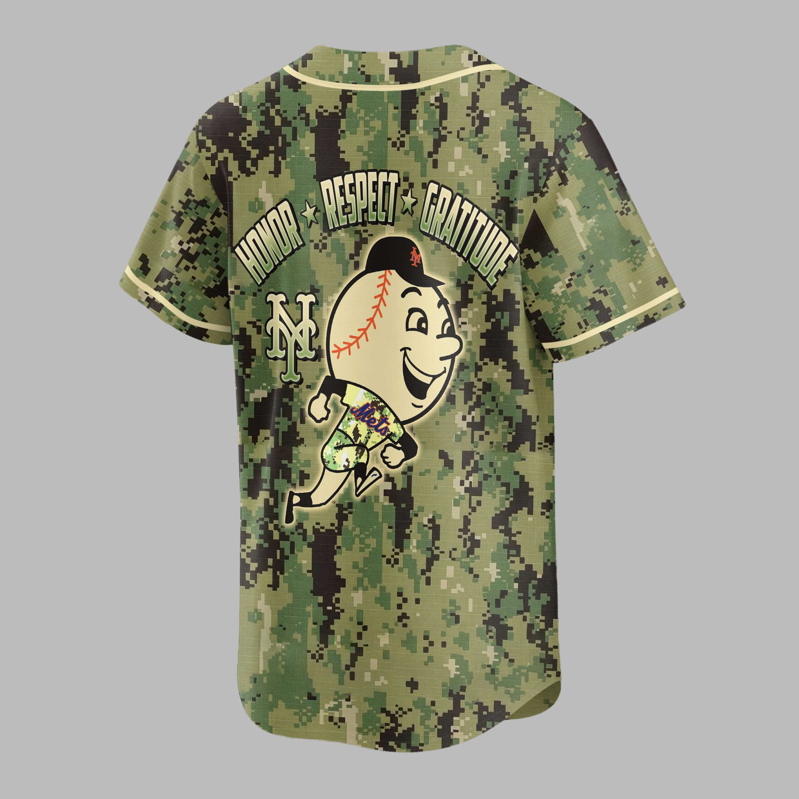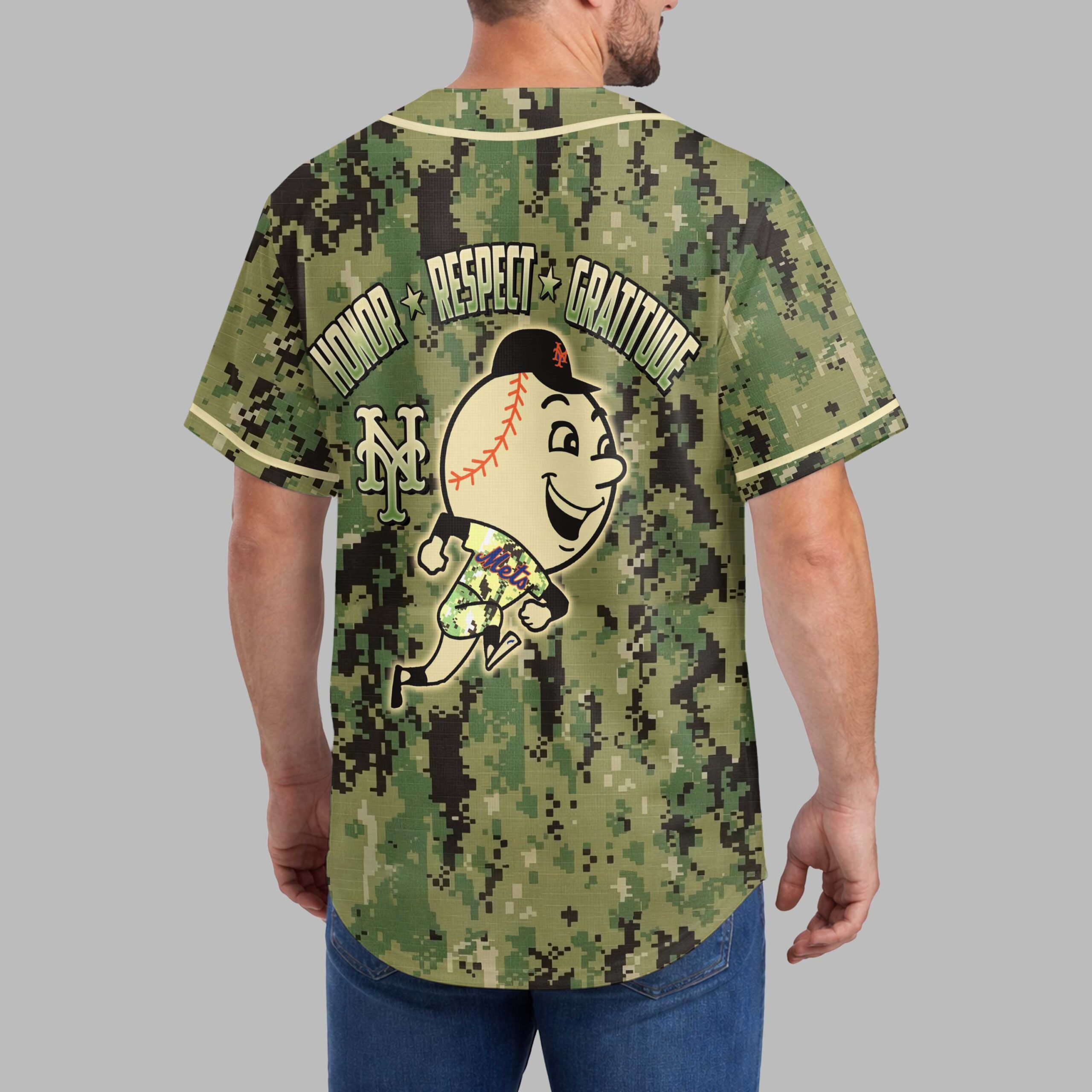 Show your unwavering support for the New York Mets and a powerful message of appreciation with this striking camouflage baseball jersey. Blending team spirit with a tribute to honorable values, this unique design lets you celebrate your favorite team and meaningful principles. The jersey features a distinctive digital camouflage pattern in greens, browns, and black, accented with cream piping. The front proudly displays Mets in a lively script and the iconic Nike swoosh. The back boldly proclaims HONOR * RESPECT * GRATITUDE above a dynamic baseball character in a Mets uniform, symbolizing dedication and spirit. Perfect for game days at Citi Field, patriotic celebrations, or casual wear, this jersey lets you showcase Mets pride and a powerful statement. Ideal for watch parties, social gatherings, or simply expressing a unique and impactful style.