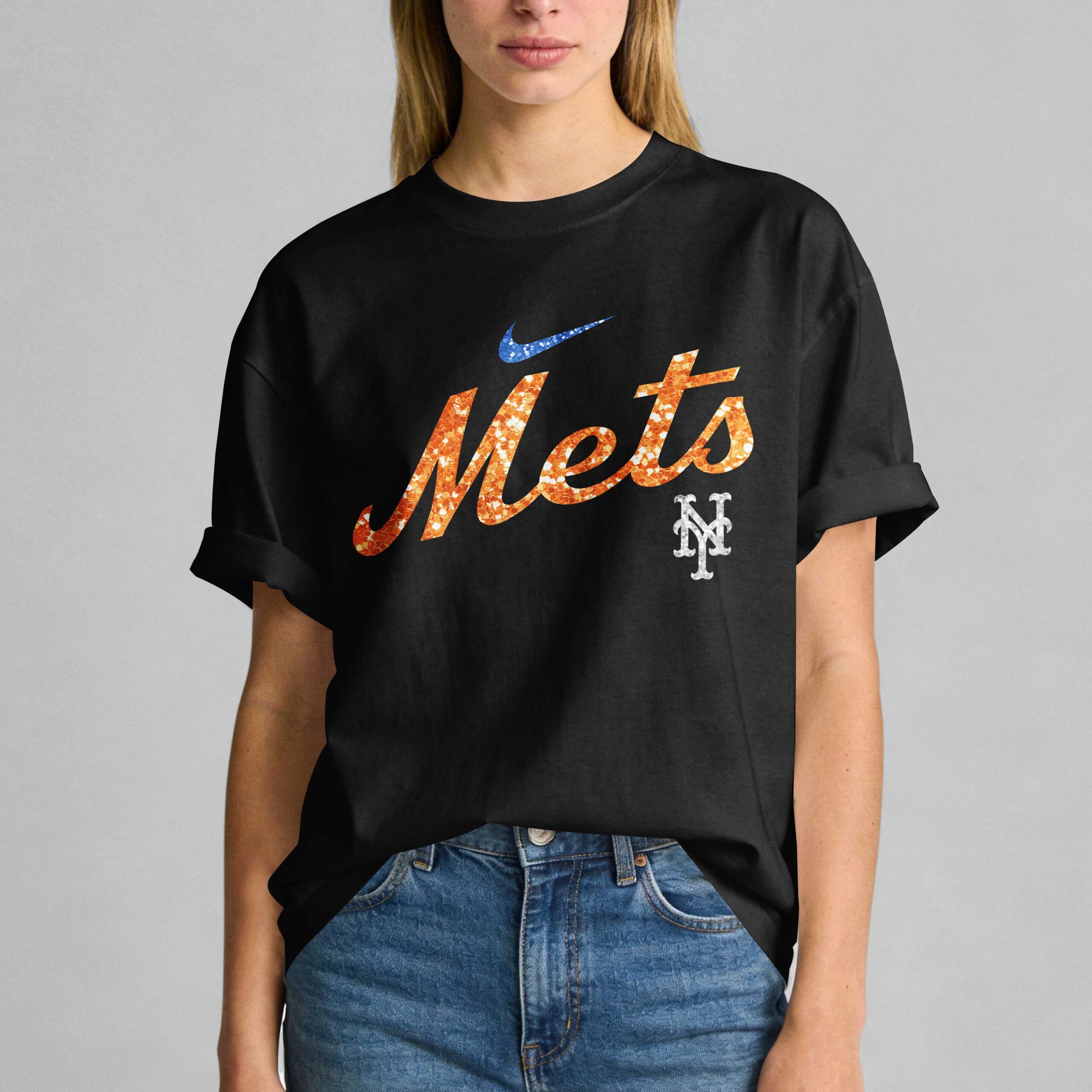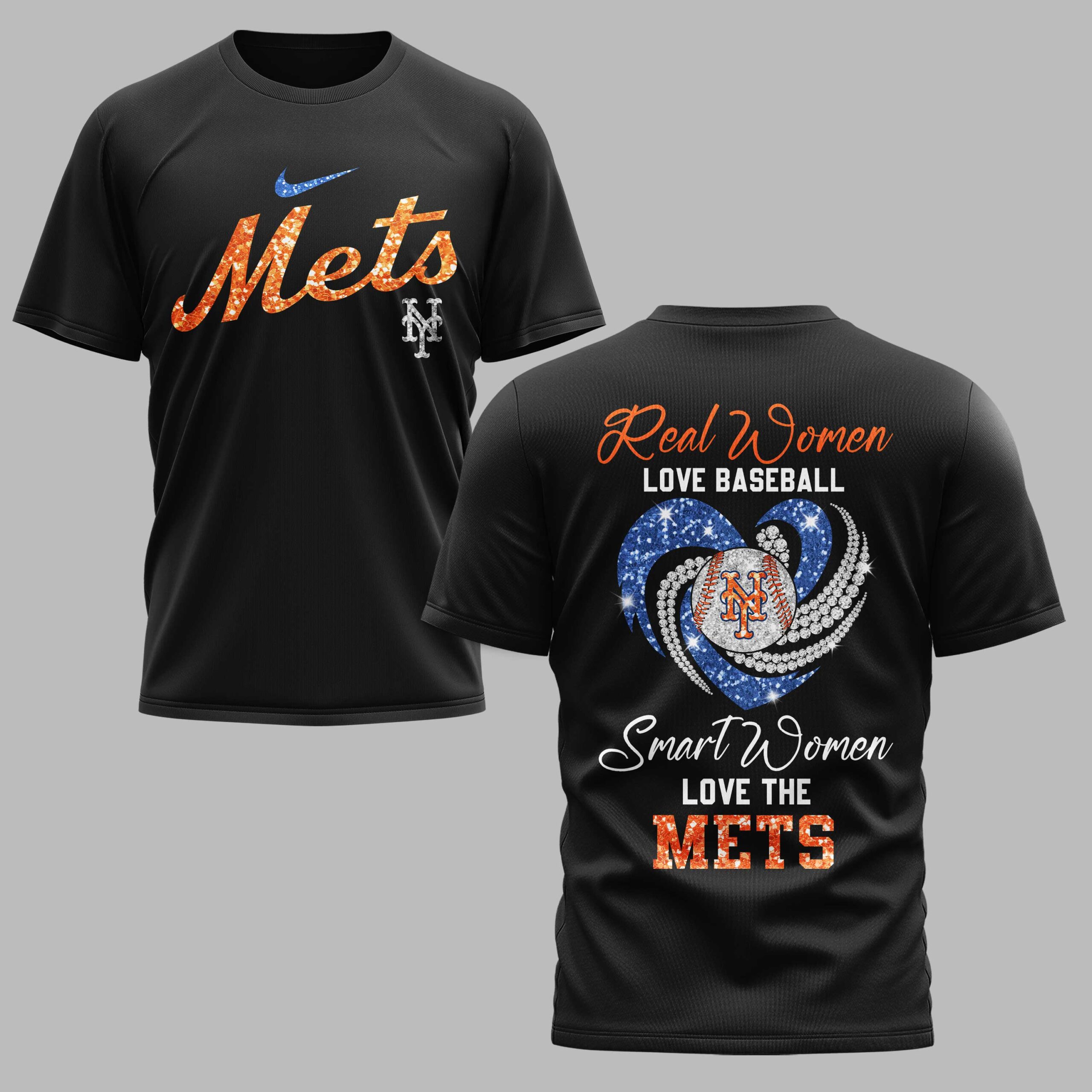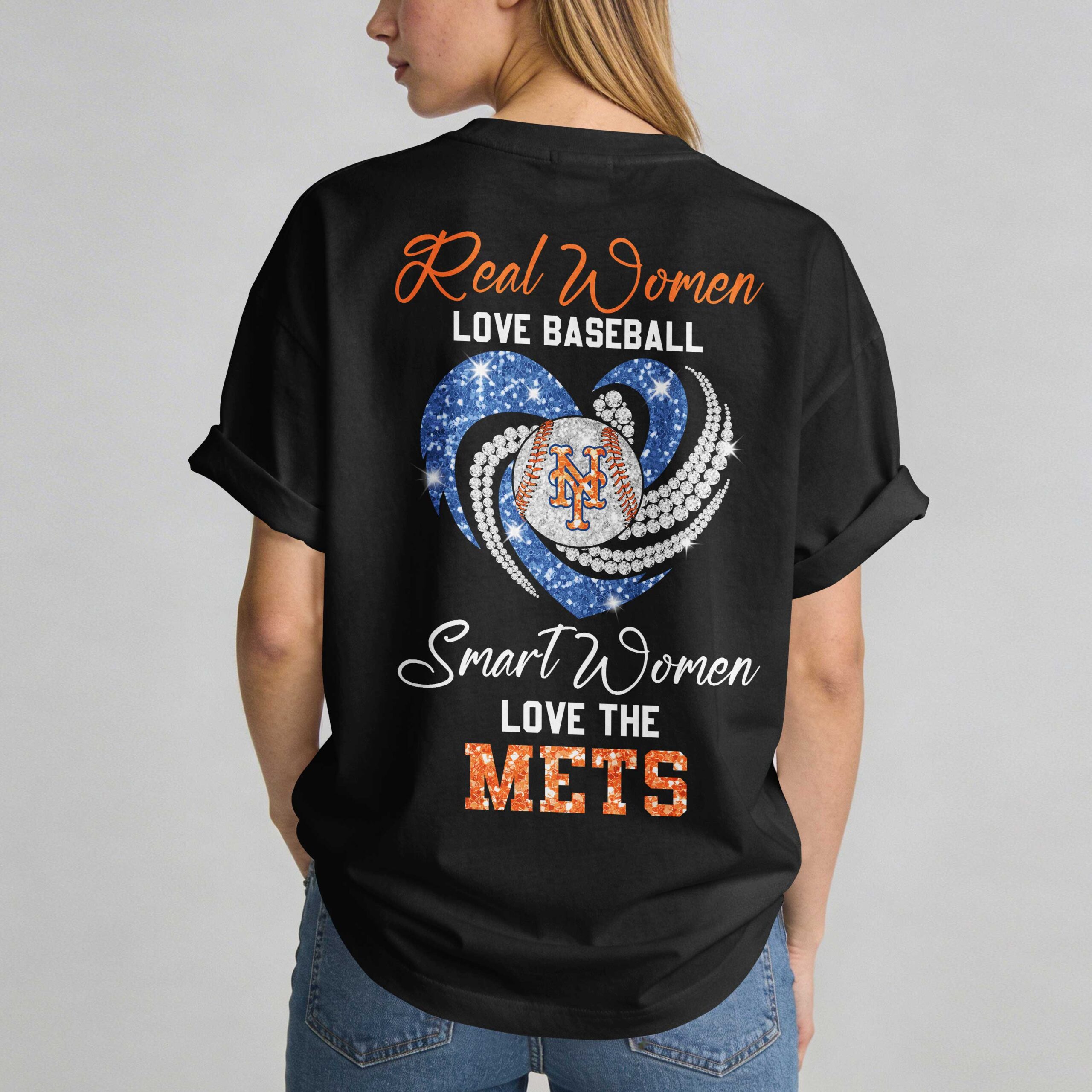 Display your New York Mets pride with this dazzling tee, crafted for the ultimate female fan! Celebrate your love for baseball and your favorite team, radiating vibrant energy for game day and beyond. The front features a sparkling orange Mets script, highlighted by a blue checkmark and the classic NY logo. The back boldly declares, Real Women LOVE BASEBALL, and Smart Women LOVE THE METS. This powerful message surrounds a magnificent heart of blue glitter and white rhinestones, centered by a detailed baseball with the iconic Mets NY logo. Perfect for cheering at Citi Field, hosting watch parties, or simply showing off your fandom. This tee lets you proudly display your devotion, adding sparkle and spirit to your Mets collection.