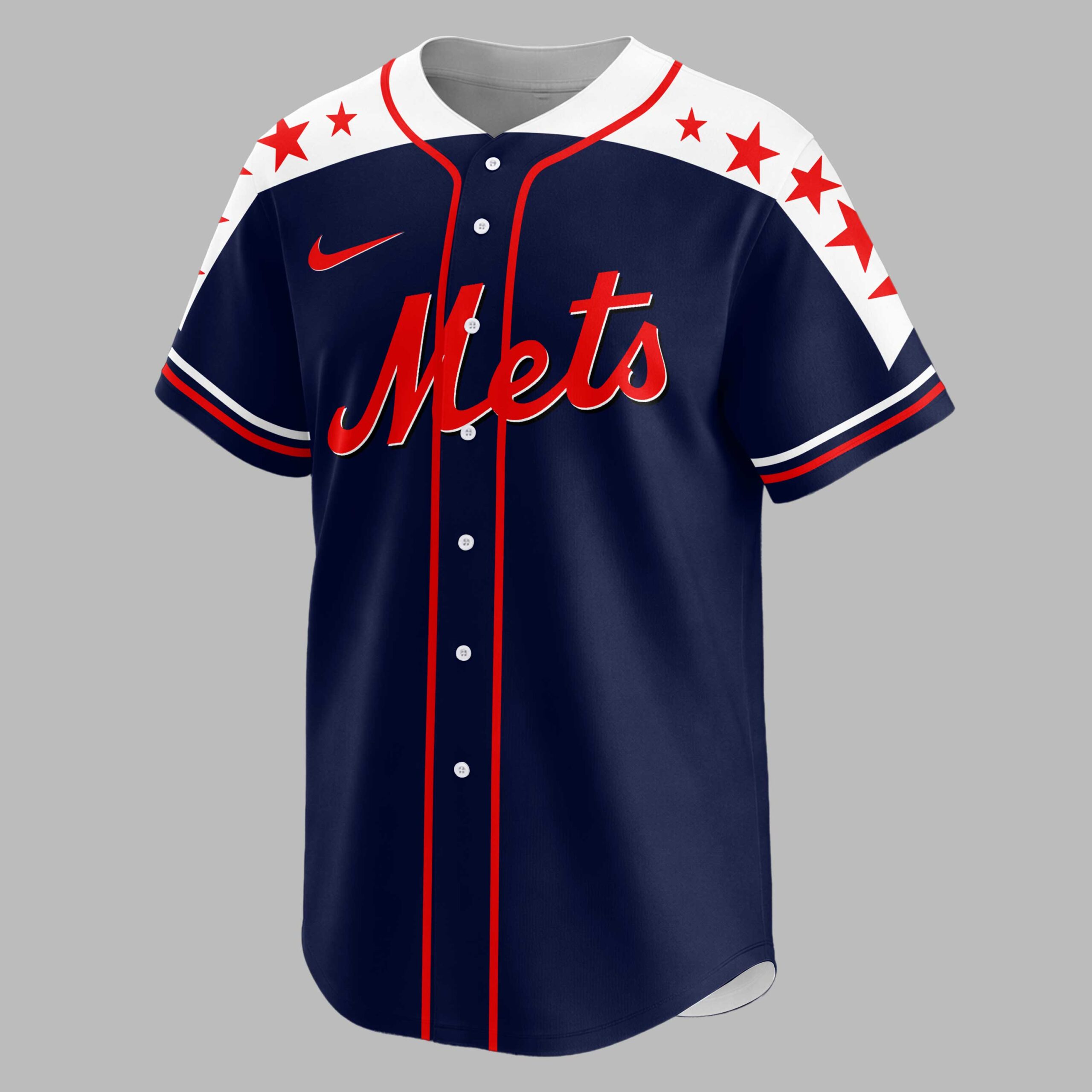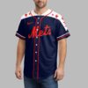 Show your unwavering New York Mets pride and American spirit with this vibrant baseball jersey! Designed for the ultimate fan, this shirt perfectly blends your love for the Mets with a bold, patriotic declaration. It’s more than just game day apparel; it’s a statement of loyalty to your team and your country. The front proudly displays ‘Mets’ in classic red script across a deep navy background, complemented by crisp white shoulders adorned with bright red stars and sporty red and white sleeve stripes. Turn around to reveal a powerful back design: a majestic bald eagle, wings outstretched in a striking American flag motif, grasping a baseball bat and ball. Below the eagle, a distressed American flag map of the USA boldly proclaims ‘Mets Country,’ crowned by the iconic ‘NY’ logo above. Perfect for cheering on the Mets at Citi Field, celebrating national holidays like the Fourth of July, or simply showcasing your team and country pride around town. This unique jersey is ideal for baseball games, watch parties, barbecues, or any event where you want to stand out as a dedicated Mets fan with true American grit.
