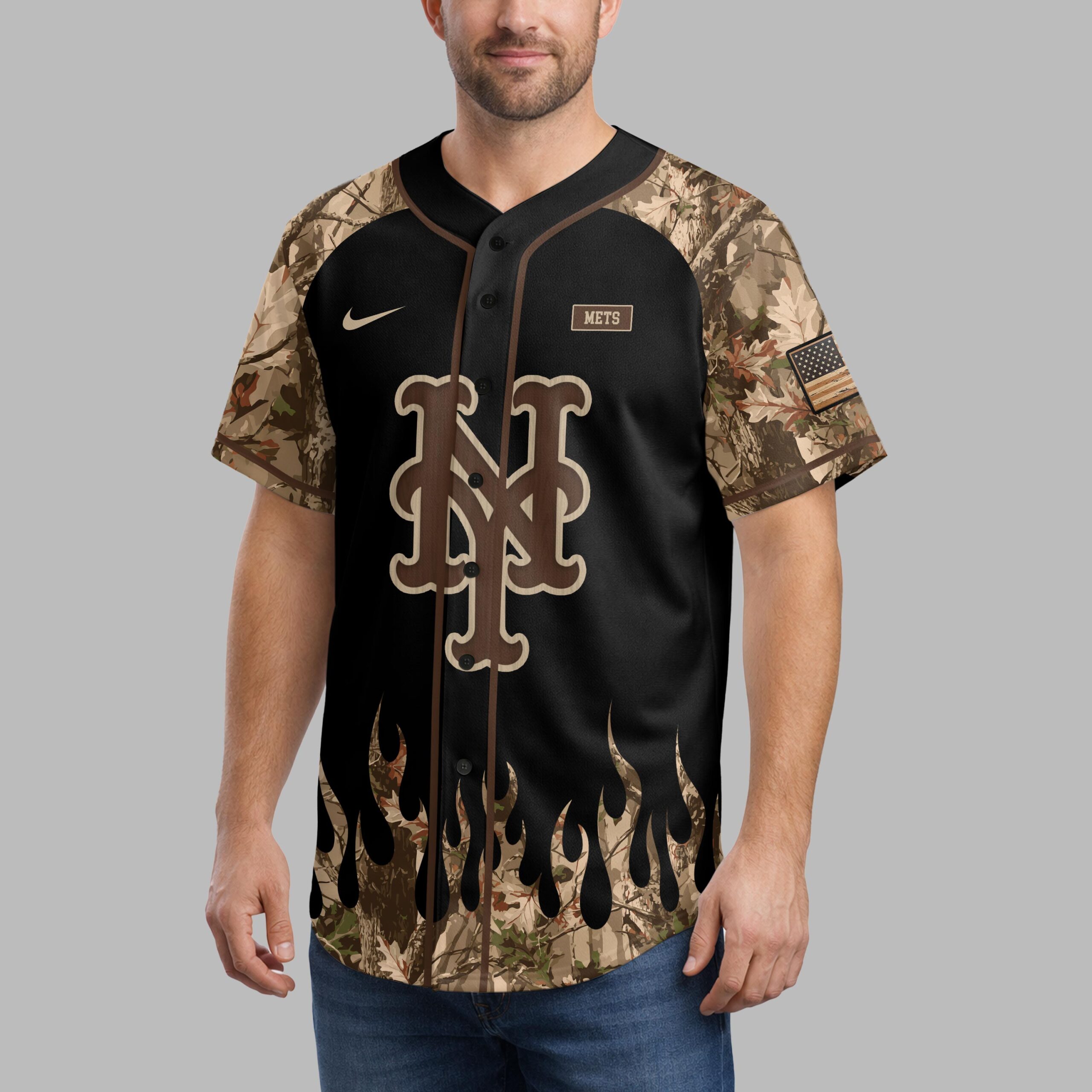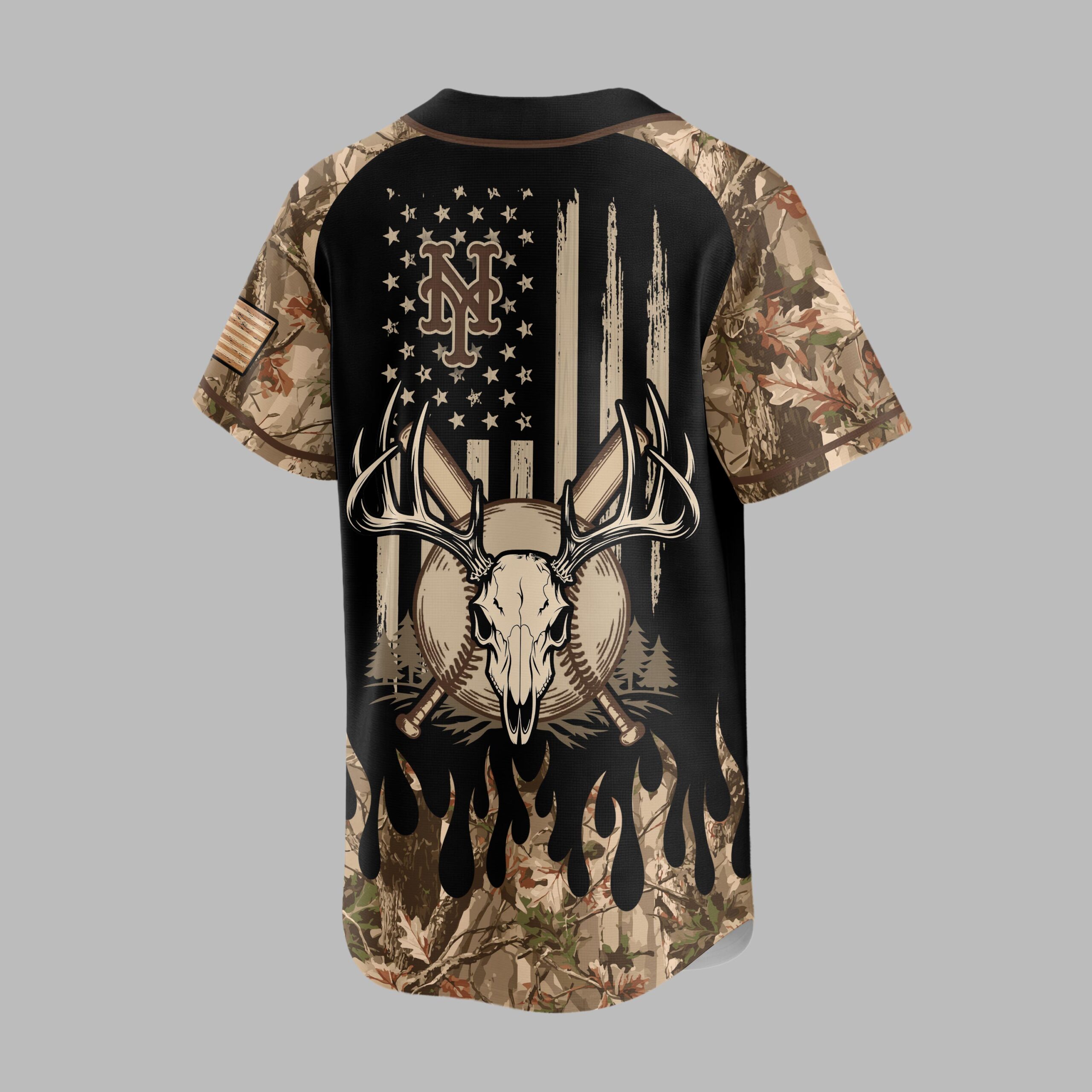 Showcase your unique blend of team spirit, patriotic pride, and love for the great outdoors with this striking NY Mets baseball jersey. This design perfectly captures the heart of a true fan who appreciates both the thrill of the game and the call of the wild, making a bold statement wherever you go. The front of the jersey features a classic black base with the iconic NY logo prominently displayed in a rich brown. Camouflage sleeves add a rugged touch, complemented by a dynamic, flame-like camouflage pattern sweeping across the lower hem. On the back, a powerful distressed American flag design serves as the backdrop for an impressive deer skull with majestic antlers, flanked by crossed baseball bats and subtle pine tree silhouettes, all anchored by the signature NY logo. Whether you’re cheering at the ballpark, enjoying a weekend adventure, celebrating patriotic holidays, or simply expressing your distinctive style, this jersey is an absolute game-changer. It’s the ideal way to honor your team, your country, and your passion for hunting all in one standout piece.