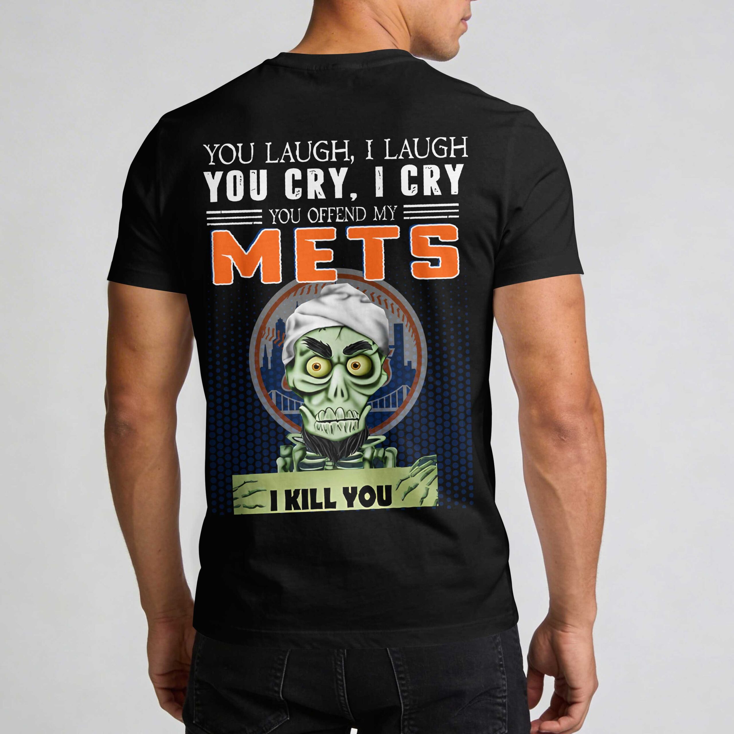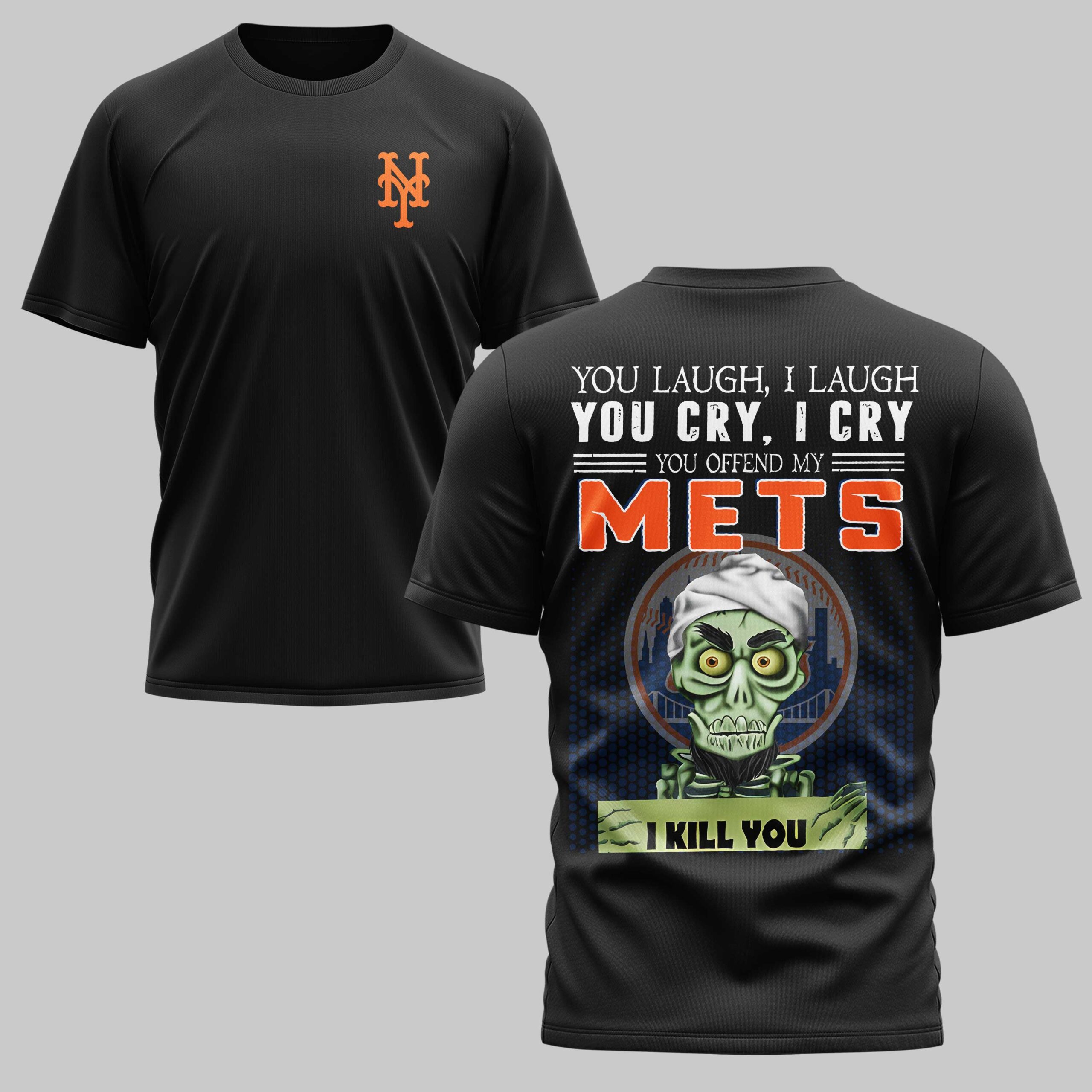 Show off your unwavering loyalty to the New York Mets with a design that speaks to the die-hard fan’s soul. This shirt is a bold statement of team spirit, perfect for those who live and breathe New York baseball. It is the ultimate way to represent your squad with a mix of pride and humor. The front features the classic orange NY logo on the chest for a clean, professional look. The back showcases a high-energy graphic with the message You Offend My Mets alongside the team name in big, bold orange letters. Complete with a spirited character holding the humorous I Kill You sign against a backdrop of the iconic skyline logo, this design ensures everyone knows your allegiance. Wear it to the ballpark, game-day watch parties, or even Independence Day celebrations to show your colors. This shirt is perfect for any occasion where your Mets pride needs to be front and center.