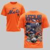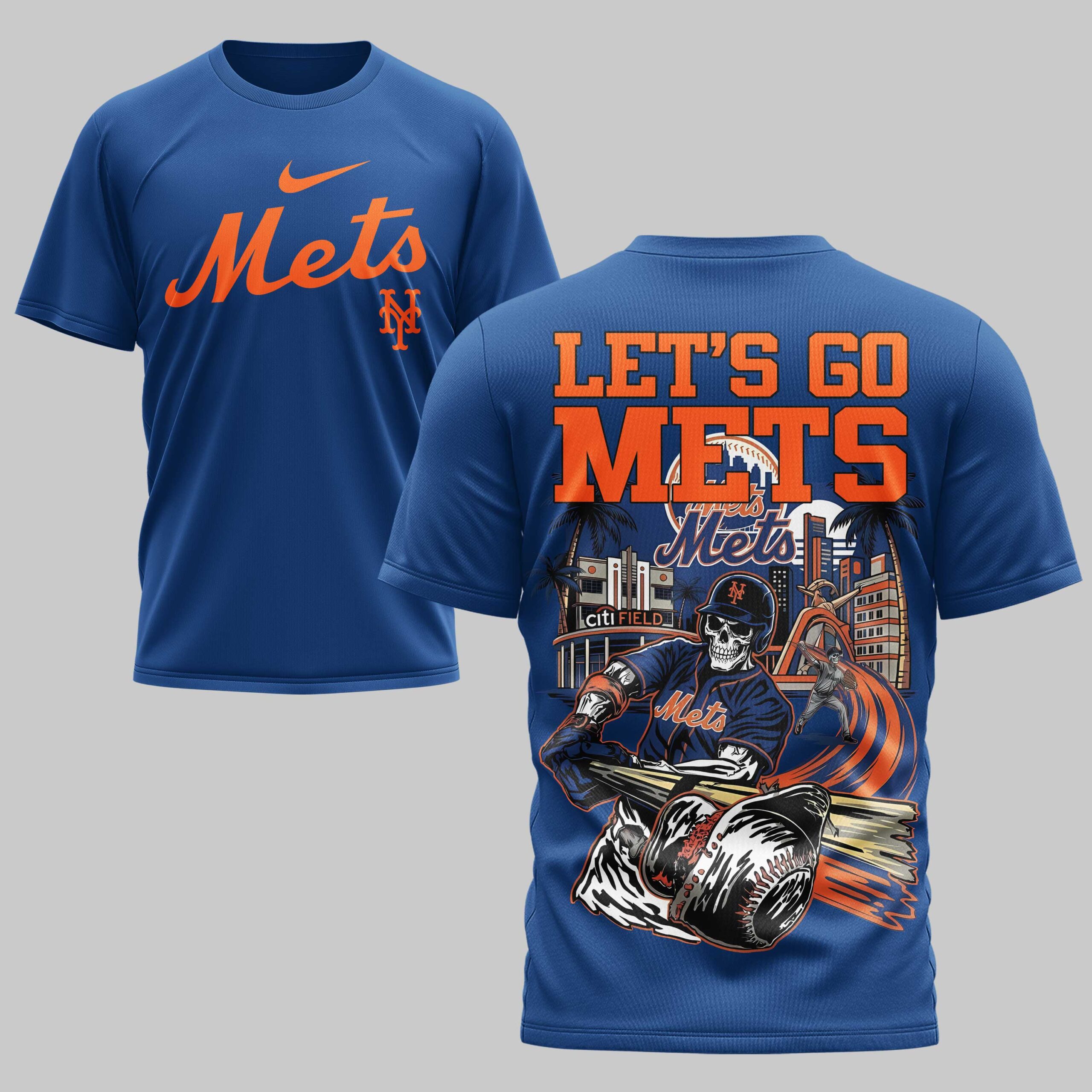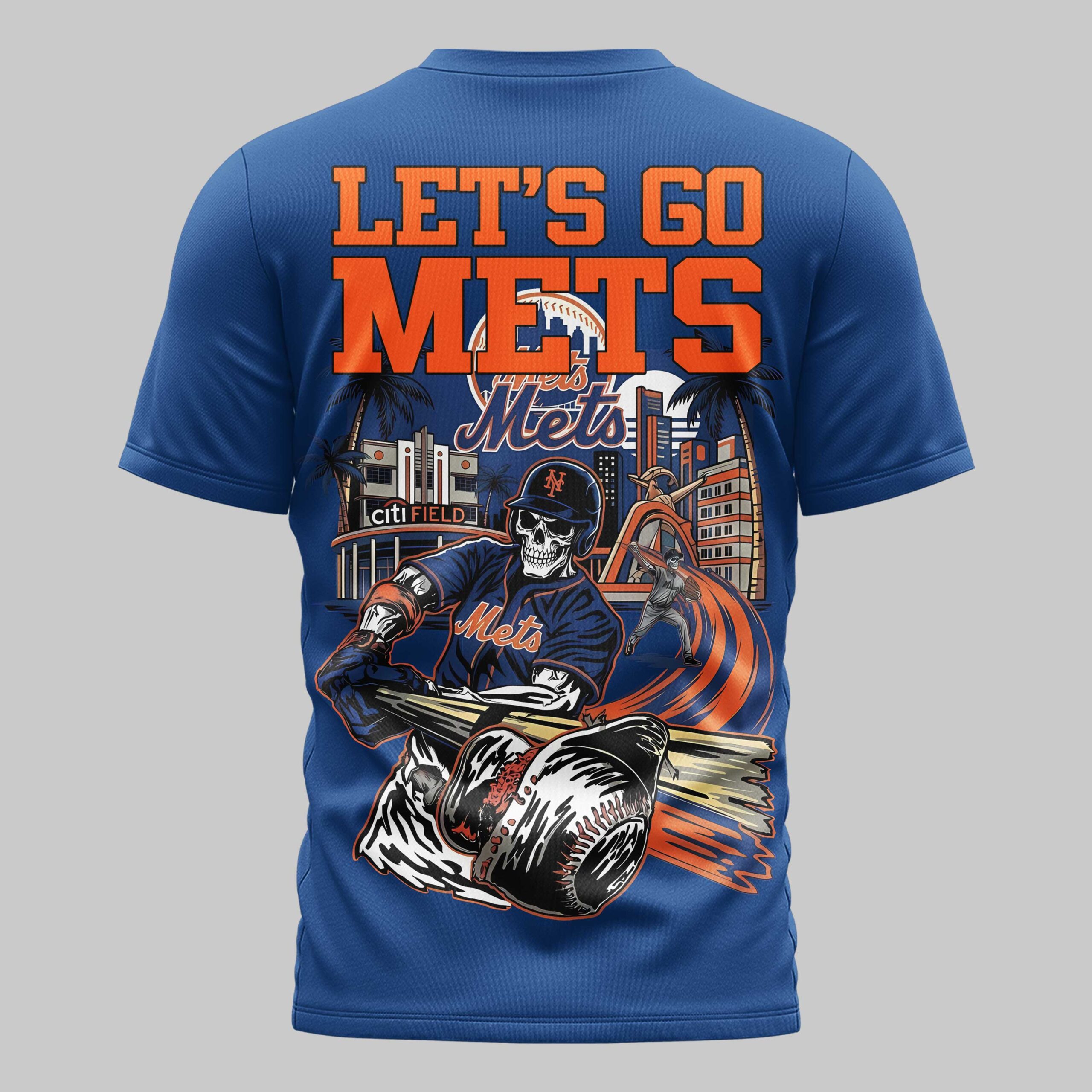 Unleash your unwavering New York Mets pride with this dynamic fan tee! Designed for the ultimate supporter, this shirt captures the fierce energy and dedicated spirit of Mets baseball, making it a powerful statement of your loyalty to the team. The front proudly displays the classic blue Mets script alongside the iconic M logo. Turn heads with the back, featuring an electrifying graphic of a skeletal batter in a full Mets uniform, ready to deliver a winning hit. This detailed illustration is set against a vibrant backdrop of the New York cityscape, complete with palm trees, the unmistakable Citi Field stadium, and bold LET’S GO METS lettering that leaves no doubt about your team. This thrilling shirt is perfect for rocking at Citi Field on game day, while watching with friends, or simply as a bold declaration of your Mets devotion during the season and beyond.
