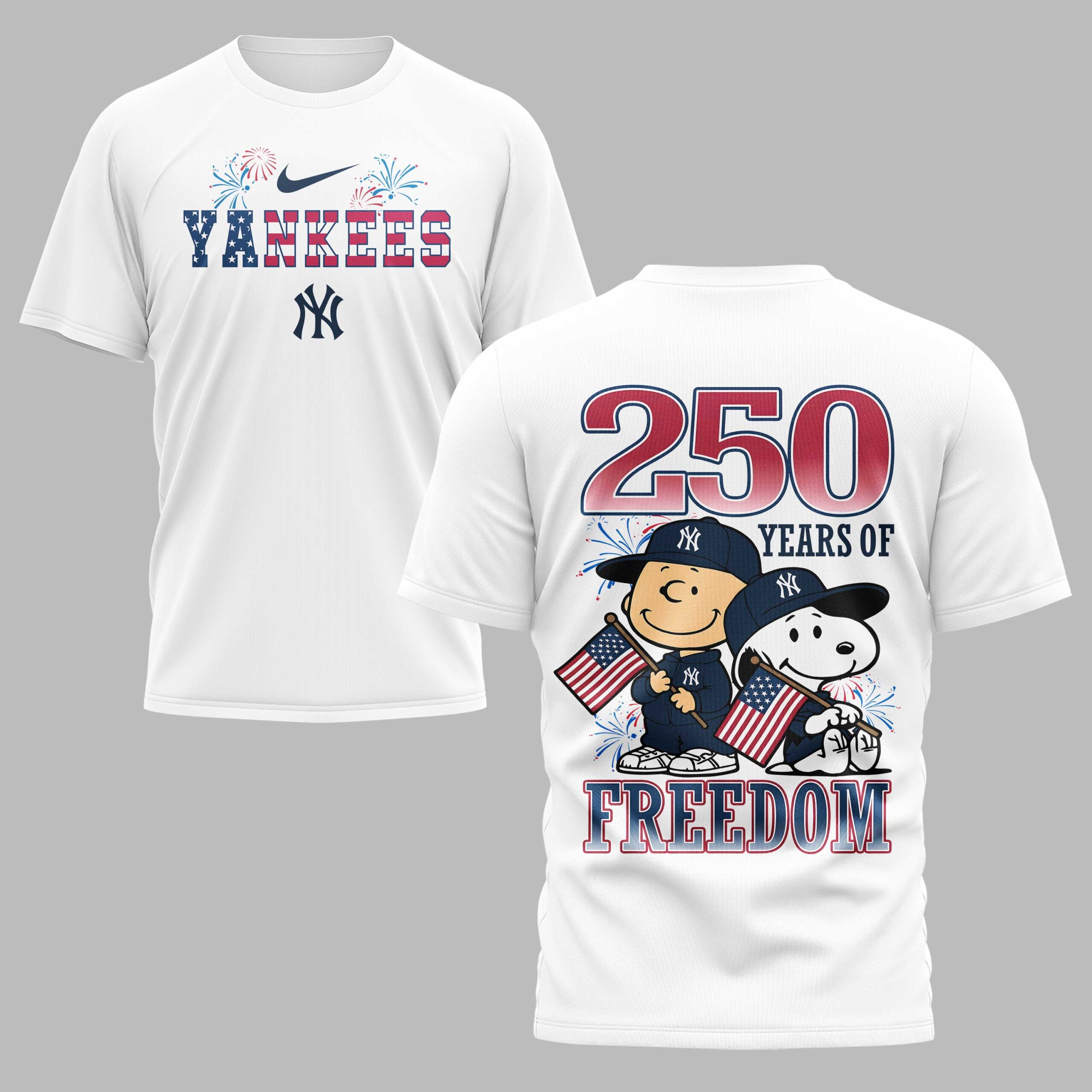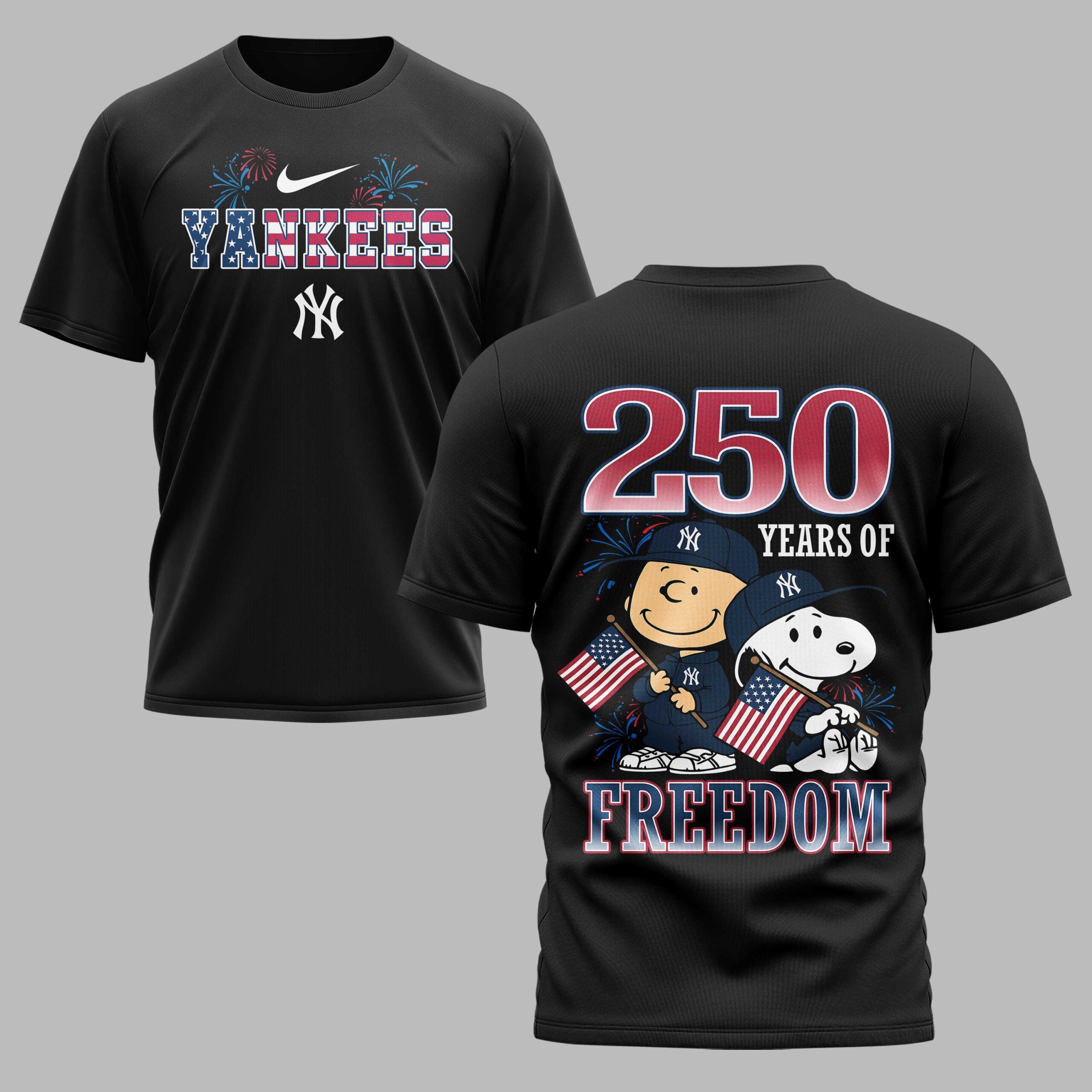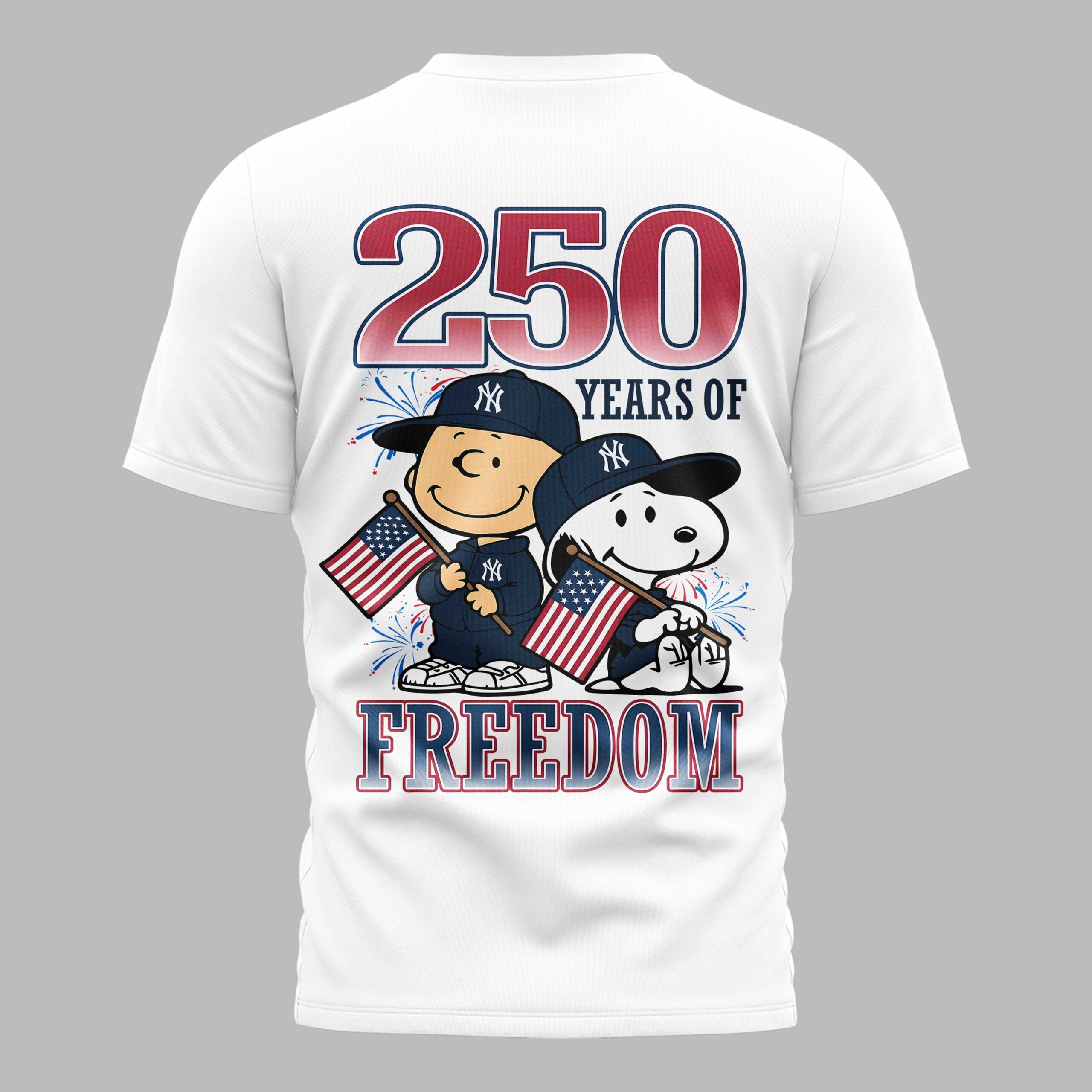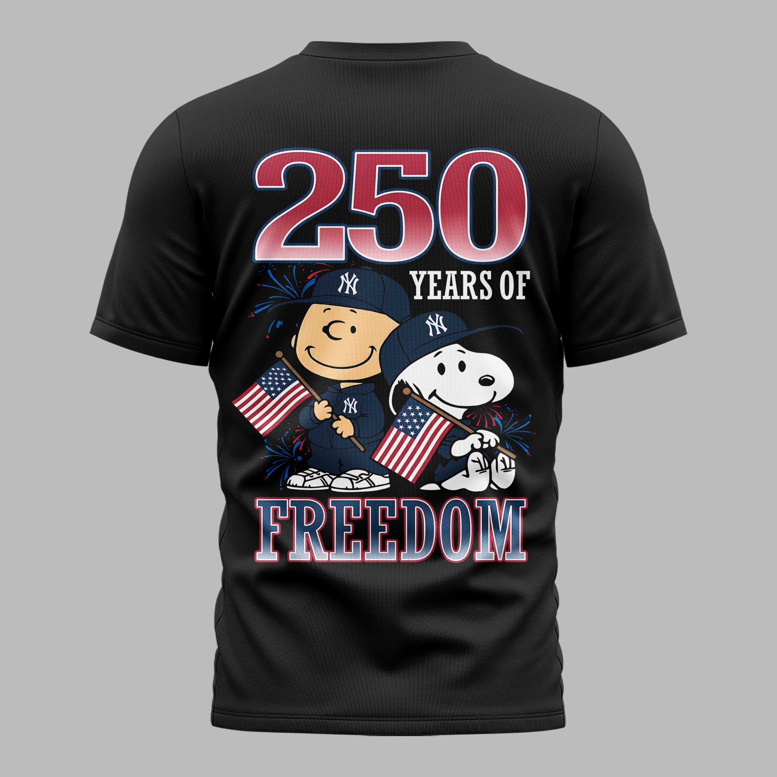 Show your New York Yankees pride and American spirit with this unique patriotic tee! It blends iconic team spirit with a heartfelt tribute to 250 years of freedom, featuring beloved Peanuts characters for a touch of nostalgic charm. The front displays ‘YANKEES’ in a bold American flag design, accented by fireworks and the classic ‘NY’ logo. On the back, Charlie Brown and Snoopy joyfully wave American flags, surrounded by fireworks and the powerful message ‘250 YEARS OF FREEDOM’ alongside the team’s emblem. A perfect fusion of fandom and national pride. Ideal for game days, Fourth of July festivities, or Memorial Day events. Wear it to the ballpark, family gatherings, or any casual outing to cheer on your team and celebrate freedom.