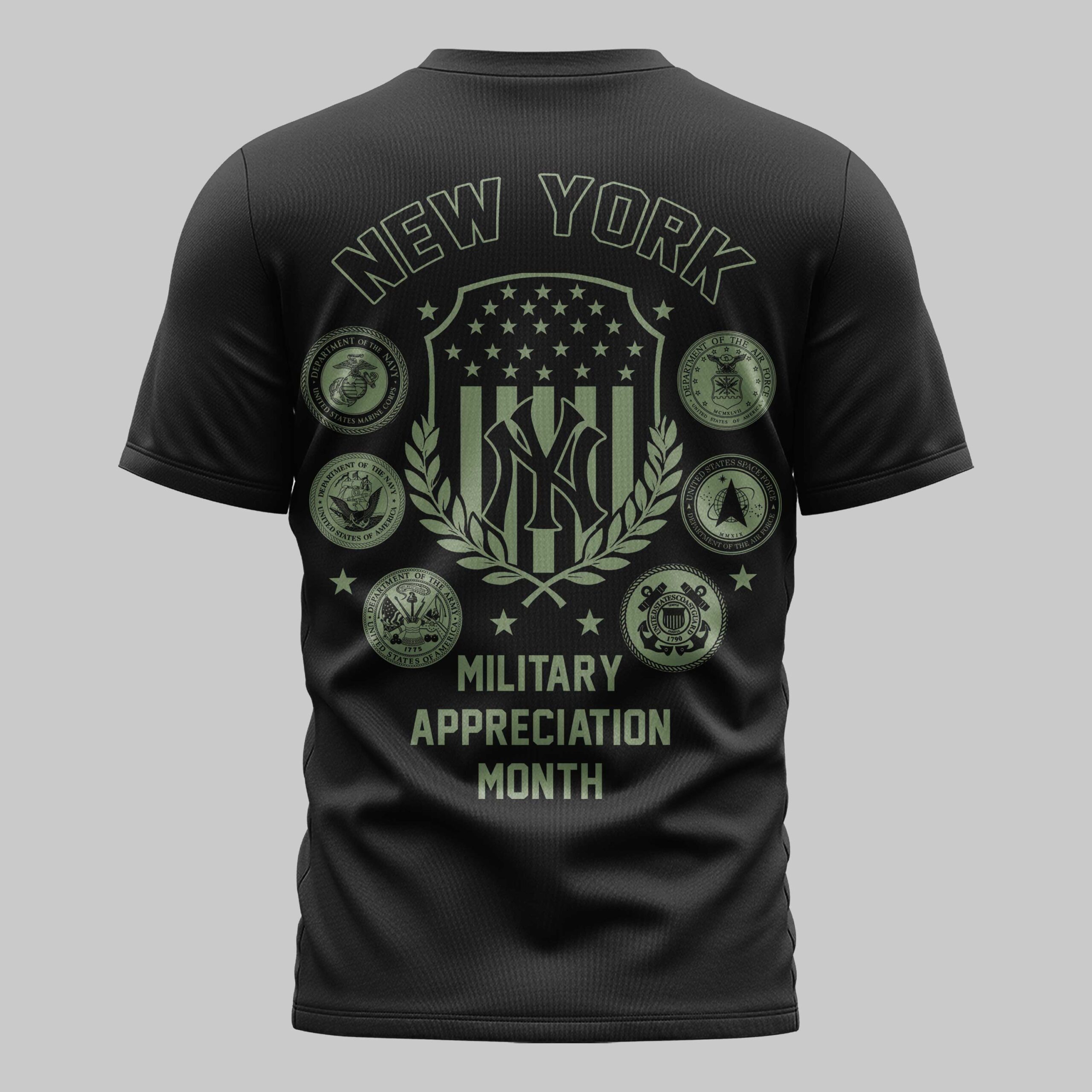 Celebrate your unwavering loyalty to the Bronx Bombers while honoring our nation’s heroes. This New York Yankees tee perfectly blends big-league pride with a deep respect for those who serve. It’s a powerful tribute to the spirit of the game and the country, designed for fans who stand tall for their team and their nation. The front showcases the iconic Yankees script and interlocking NY logo in a tactical olive green. The back features a bold NEW YORK arch above a patriotic shield and the official seals of the U.S. military branches. With Military Appreciation Month prominently displayed, this design makes a clear statement of gratitude and team spirit. Perfect for game days at the ballpark, patriotic festivities, or everyday wear, this shirt is a must-have. Represent New York with pride and honor those who protect our freedom every time you gear up.