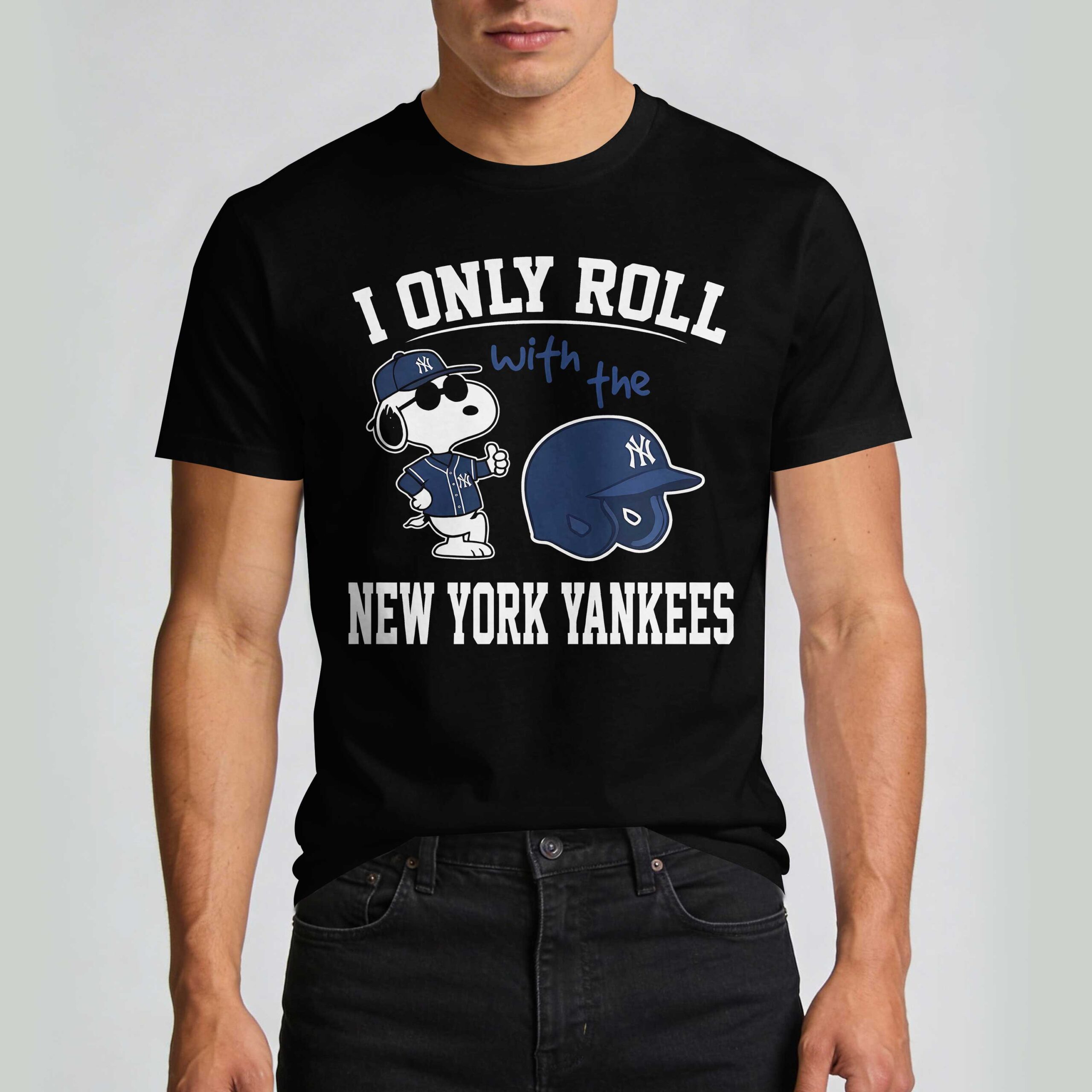 Show your ultimate New York Yankees pride with this exclusive Snoopy fan tee! This shirt perfectly blends the classic charm of Snoopy with your unwavering loyalty to the Bronx Bombers. It’s more than just apparel; it’s a fun, clear declaration of who you truly roll with. The front of this striking black tee features everyone’s favorite beagle, Snoopy, looking cool in sunglasses and a Yankees jersey, giving a confident thumbs-up. Beside him, a classic Yankees batting helmet adds to the spirited design. Bold white text proudly proclaims, I ONLY ROLL with the NEW YORK YANKEES, making your allegiance unmistakable. This must-have tee is perfect for cheering at the stadium, hosting watch parties, or simply showcasing your team pride around town. Celebrate every home run and victory for the New York Yankees with Snoopy by your side.