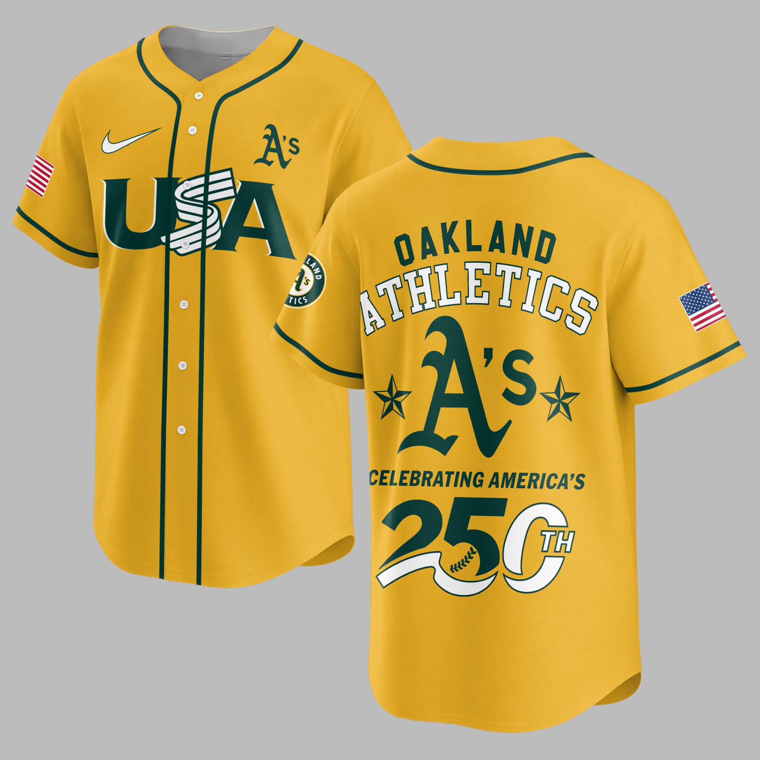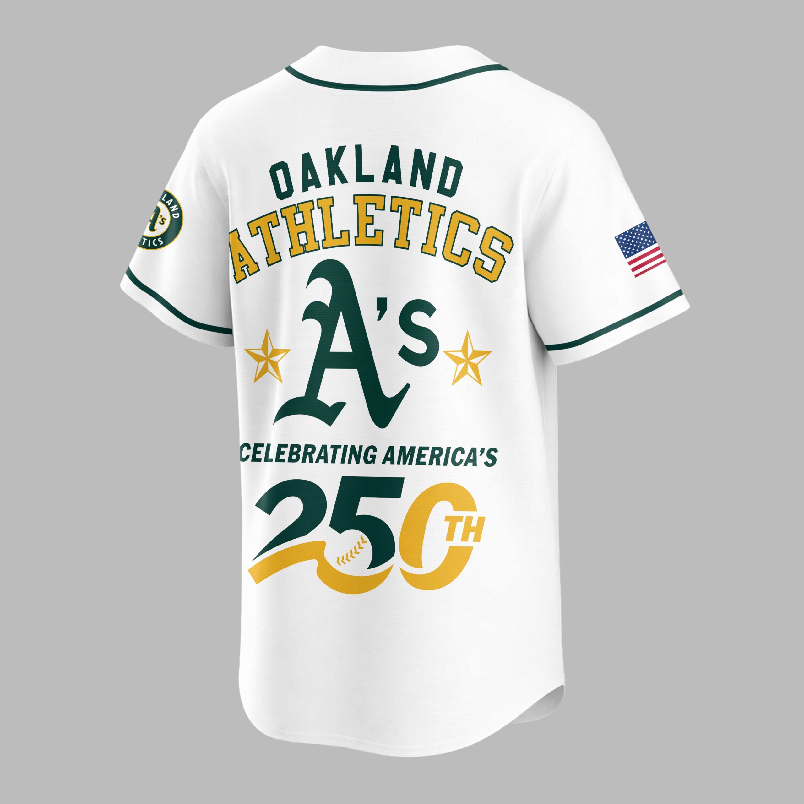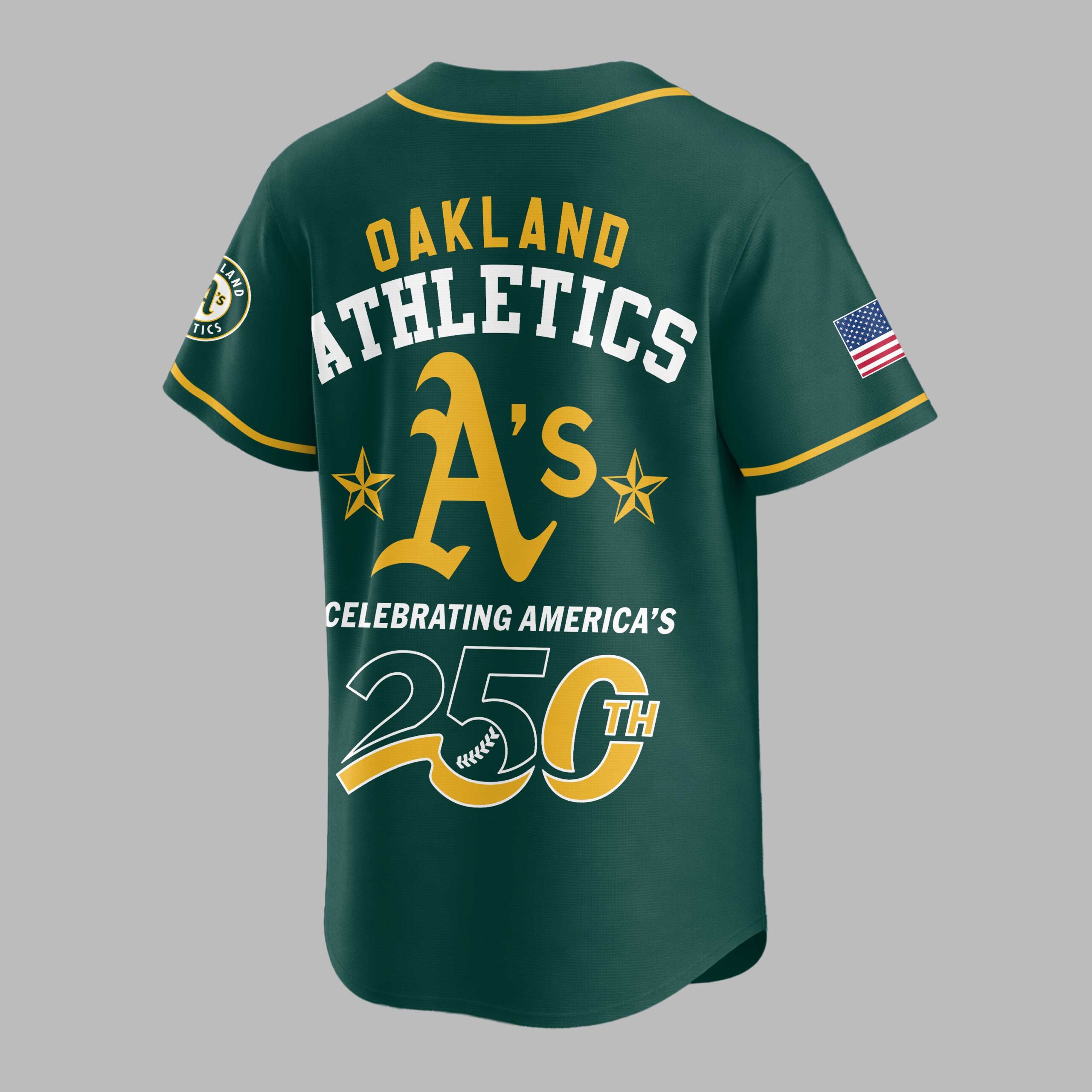 Show your dual pride for the Oakland Athletics and the USA with this vibrant, commemorative baseball jersey! Celebrating America’s monumental 250th anniversary, this gold and green design lets you display your team loyalty and national spirit powerfully. The front features a bold USA beneath the iconic A’s logo, with an American flag on the left sleeve and team patch on the right. The back proudly displays OAKLAND ATHLETICS above a large A’s emblem, flanked by stars, and CELEBRATING AMERICA’S 250TH below. Perfect for game days, patriotic celebrations, or casual wear, this jersey is a standout tribute. Wear it to rally for the A’s, honor American history, and showcase your spirited passion. It’s the ultimate fan gear for a momentous occasion.