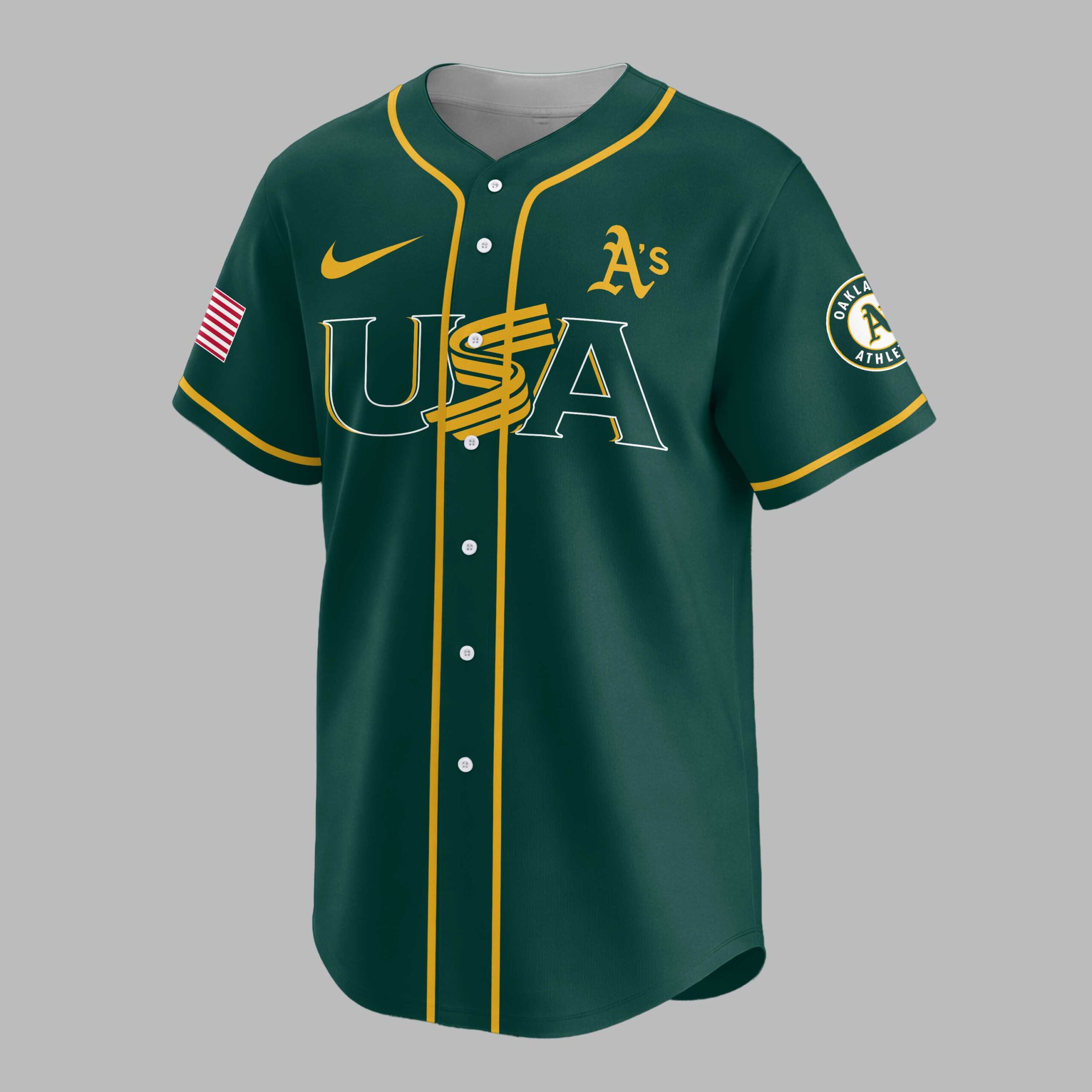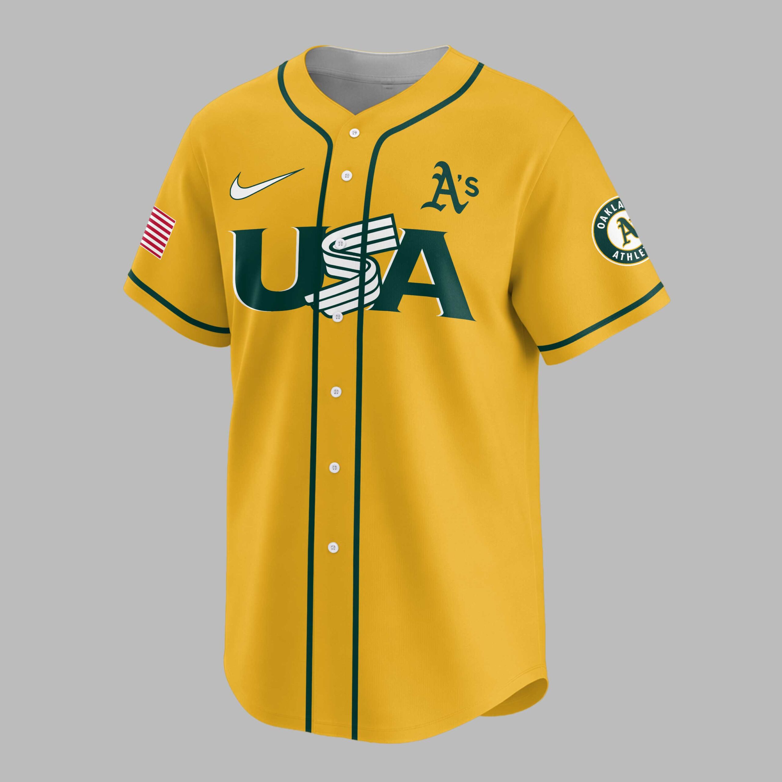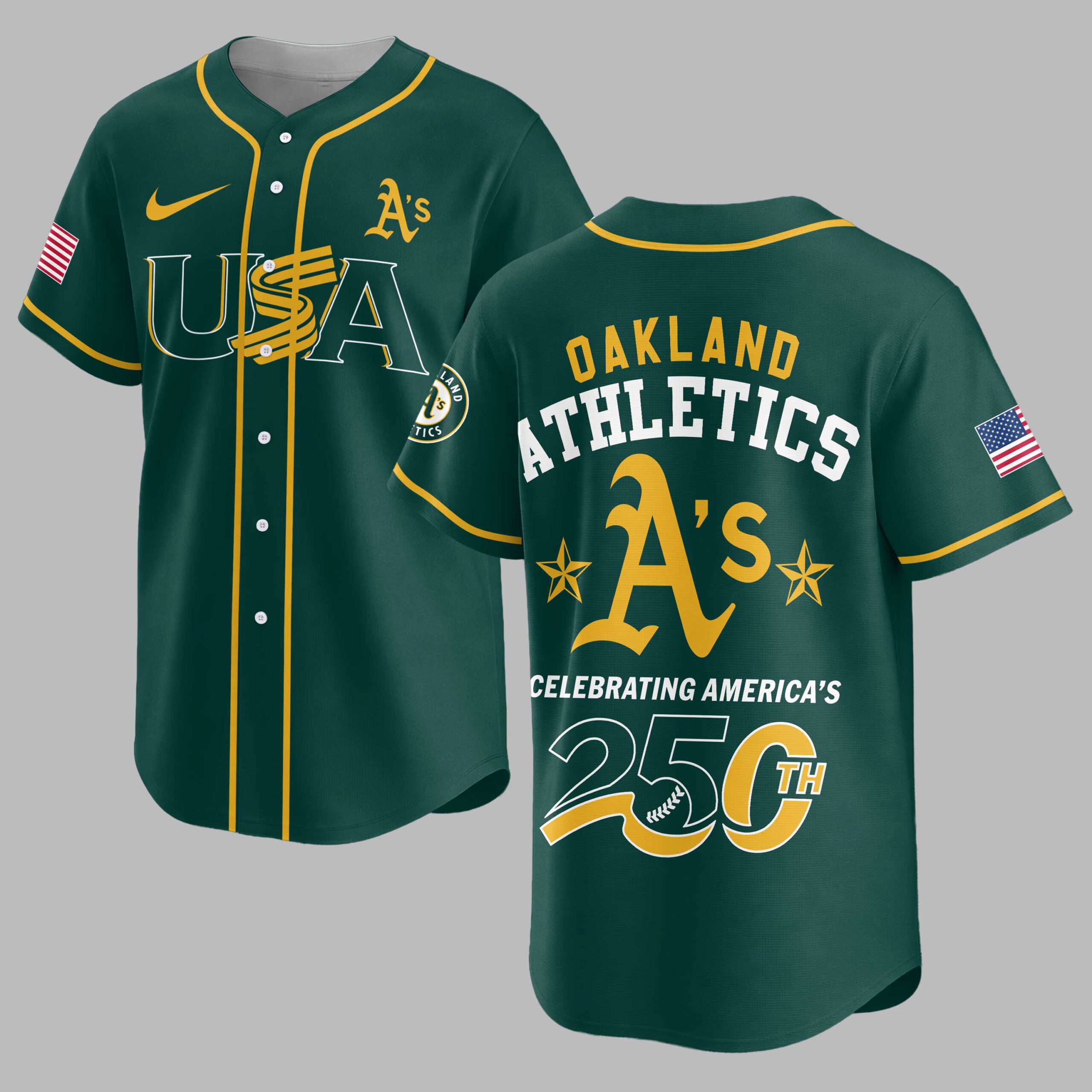 Show your dual pride for the Oakland Athletics and the USA with this vibrant, commemorative baseball jersey! Celebrating America’s monumental 250th anniversary, this gold and green design lets you display your team loyalty and national spirit powerfully. The front features a bold USA beneath the iconic A’s logo, with an American flag on the left sleeve and team patch on the right. The back proudly displays OAKLAND ATHLETICS above a large A’s emblem, flanked by stars, and CELEBRATING AMERICA’S 250TH below. Perfect for game days, patriotic celebrations, or casual wear, this jersey is a standout tribute. Wear it to rally for the A’s, honor American history, and showcase your spirited passion. It’s the ultimate fan gear for a momentous occasion.
