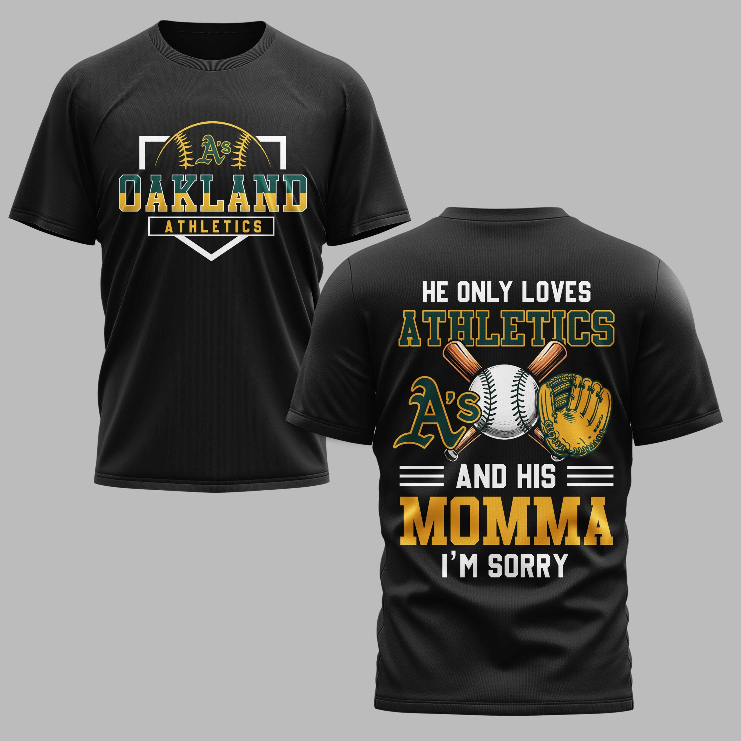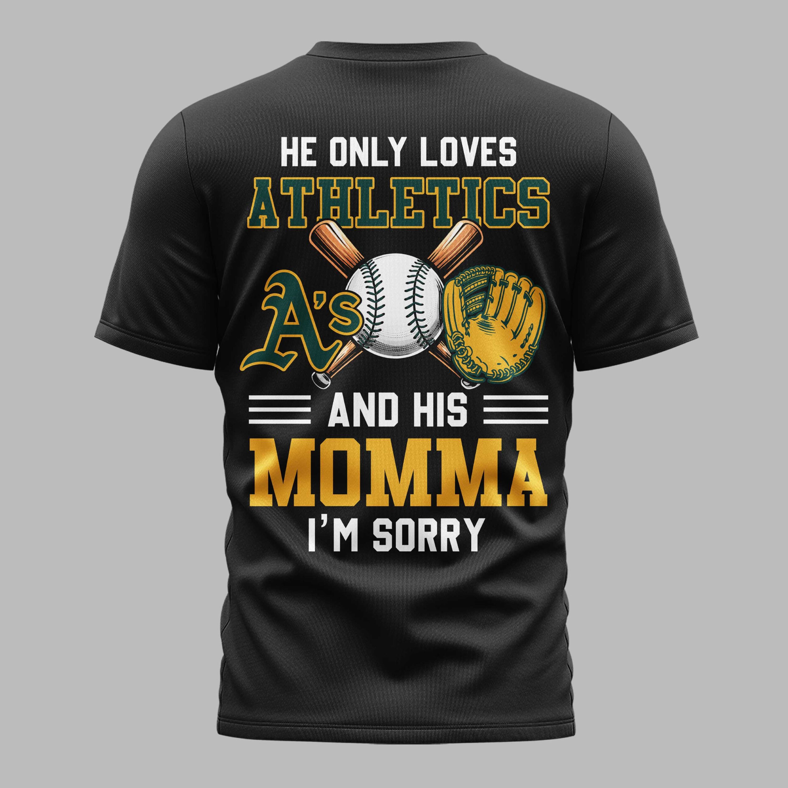 Show off your Oakland Athletics pride with a touch of humor! This tee is perfect for any dedicated A’s fan who holds their team and their momma closest to their heart. Celebrate these ultimate allegiances with a shirt sure to bring smiles and nods from fellow supporters. The front proudly displays the iconic A’s logo within a classic baseball design, highlighted by OAKLAND ATHLETICS text. The back boldly declares, HE ONLY LOVES ATHLETICS AND HIS MOMMA I’M SORRY, featuring another A’s logo, a baseball, bats, and a glove, creating a playfully spirited statement. Wear this spirited shirt to the ballpark, a watch party, or simply out and about to showcase your dual loves. It’s an ideal gift for Mother’s Day, birthdays, or any occasion celebrating a true A’s enthusiast and their beloved mom. A home run in fan apparel!