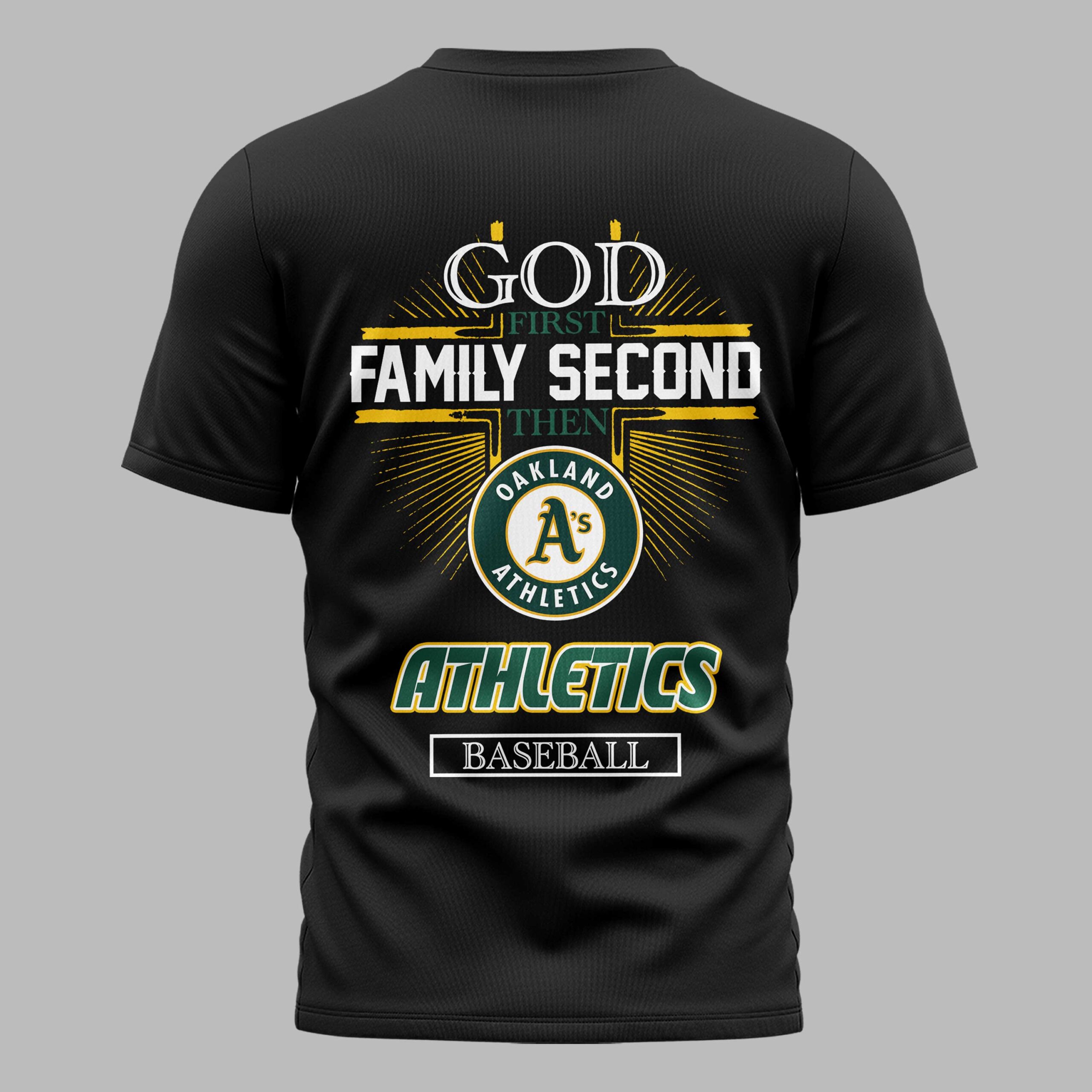 Declare your ultimate loyalties with this powerful Oakland Athletics baseball tee, designed for the fan who holds faith and family as paramount. It’s more than just team gear; it’s a bold statement of the values that drive you, perfectly blending your devotion to the A’s with your core beliefs. The front of the shirt proudly features the iconic Oakland A’s logo, encircled by classic baseball stitching and clearly stating OAKLAND ATHLETICS. The back delivers an impactful message: GOD FIRST THEN FAMILY SECOND, prominently displayed above the A’s emblem, which radiates with sunbursts, all topped off with ATHLETICS BASEBALL. This shirt is ideal for showing your pride at the ballpark, during family outings, or as a meaningful everyday expression. Wear it to every game, gathering, or casual day out to showcase your unwavering spirit for the Oakland Athletics alongside your steadfast commitment to God and family.