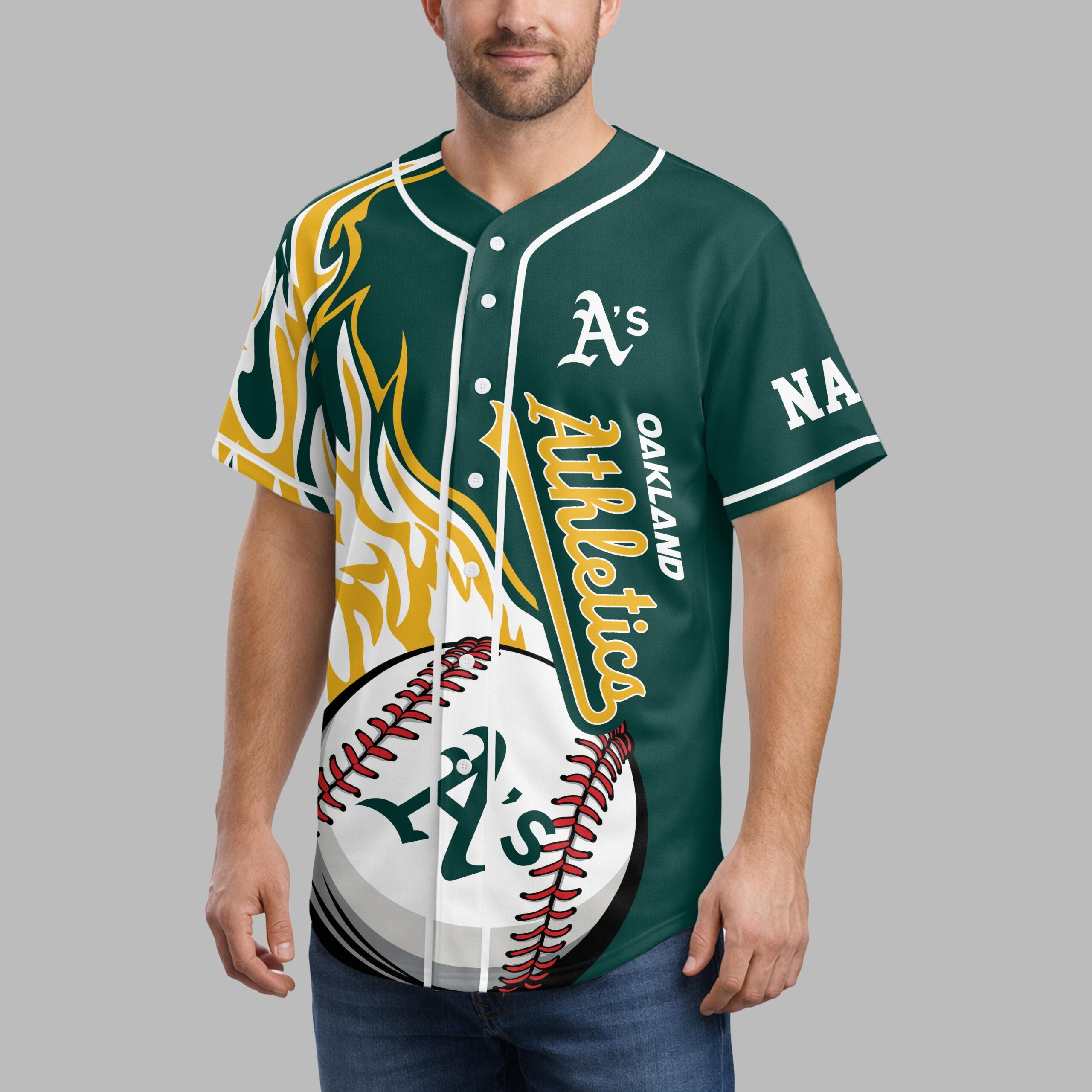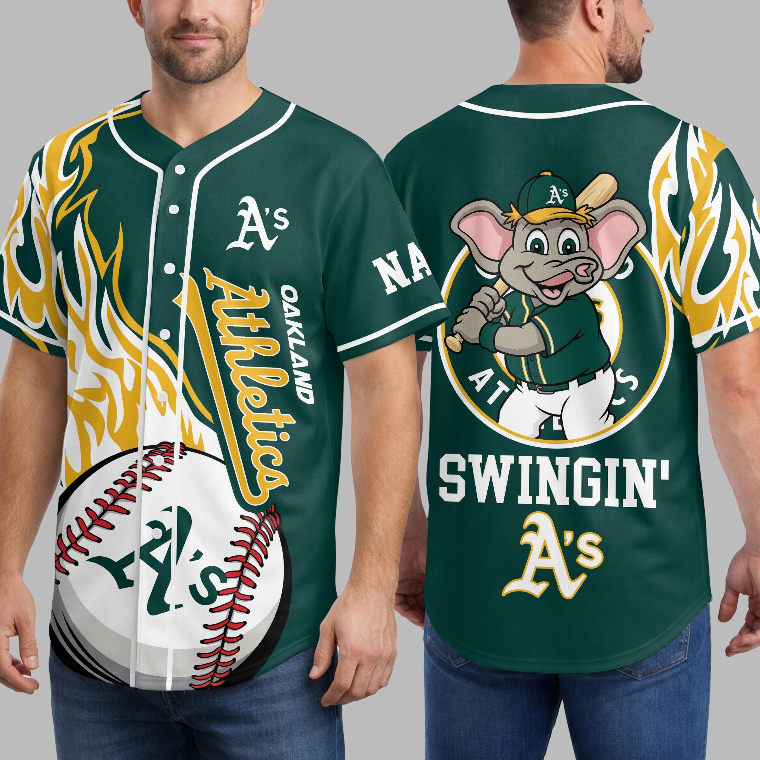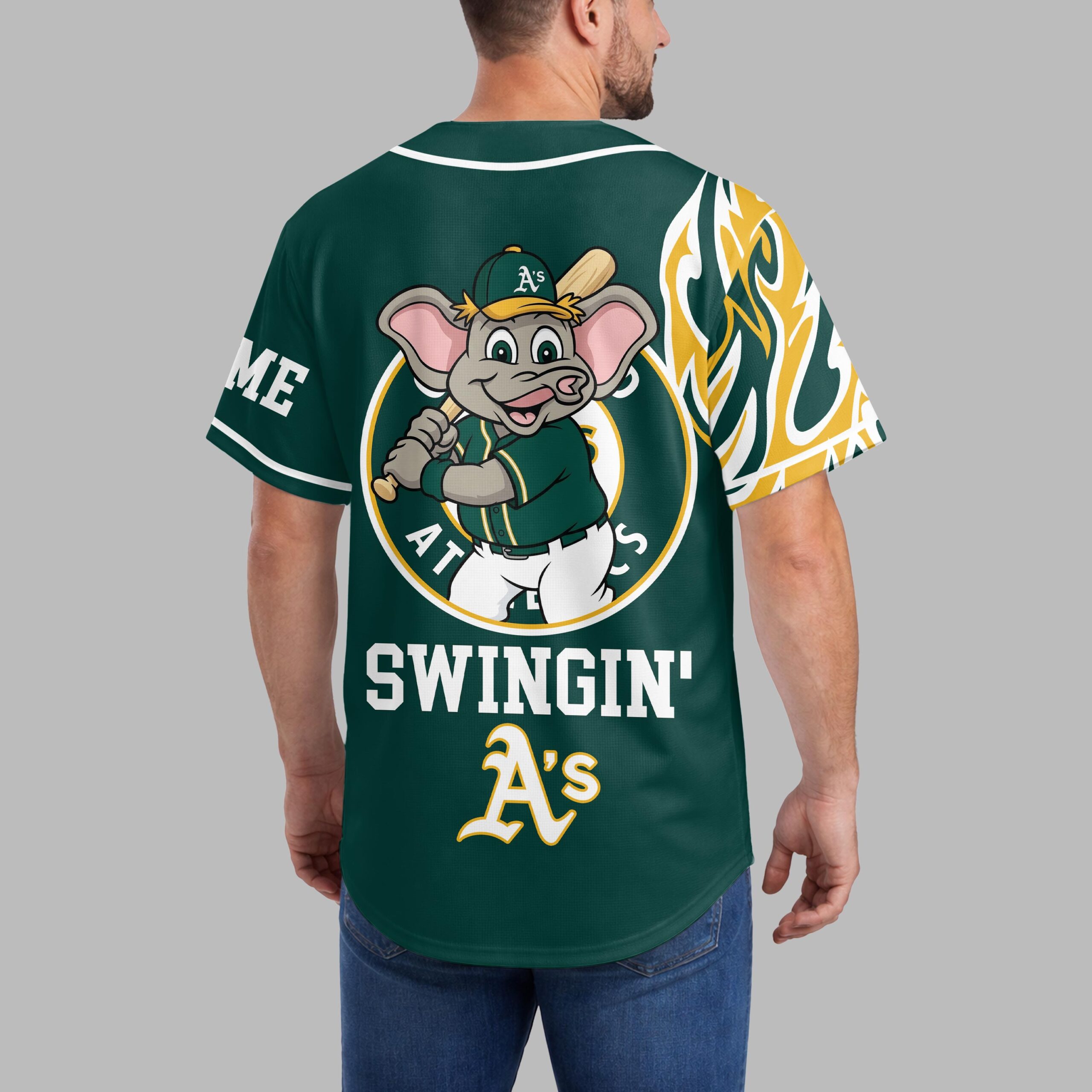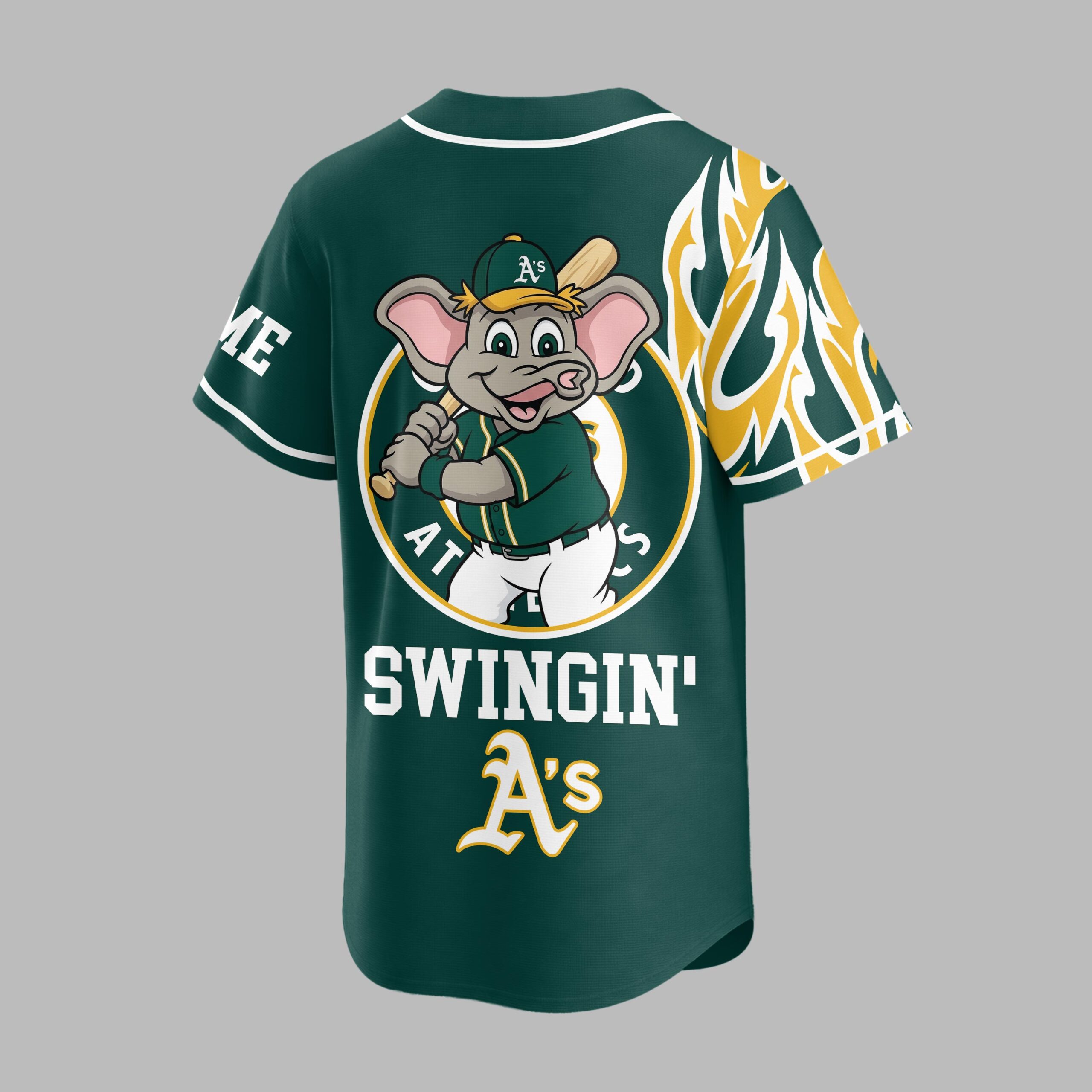 Ignite your passion for Oakland baseball with this dynamic Athletics fan jersey! Designed for the ultimate supporter, this shirt captures the vibrant energy and playful spirit of game day. It’s the perfect way to showcase your loyalty and stand out in the crowd, celebrating every swing and every win with unparalleled team pride. The front of this eye-catching jersey features the iconic A’s logo and Athletics in a classic script, complemented by bold yellow and white flame graphics roaring up the sides. A striking baseball graphic with an A’s emblem adds a true diamond feel. Turn around to reveal a fun cartoon elephant mascot ready to swing, encircled by the team’s initial, alongside the lively phrase SWINGIN’ A’s and a customizable name area, making it uniquely yours. Whether you’re cheering from the stands, watching with friends at a sports bar, or simply enjoying a casual day out, this jersey is your go-to gear. It’s ideal for game days, tailgates, or any occasion where you want to flaunt your Oakland Athletics spirit with a blend of classic style and spirited fun.
